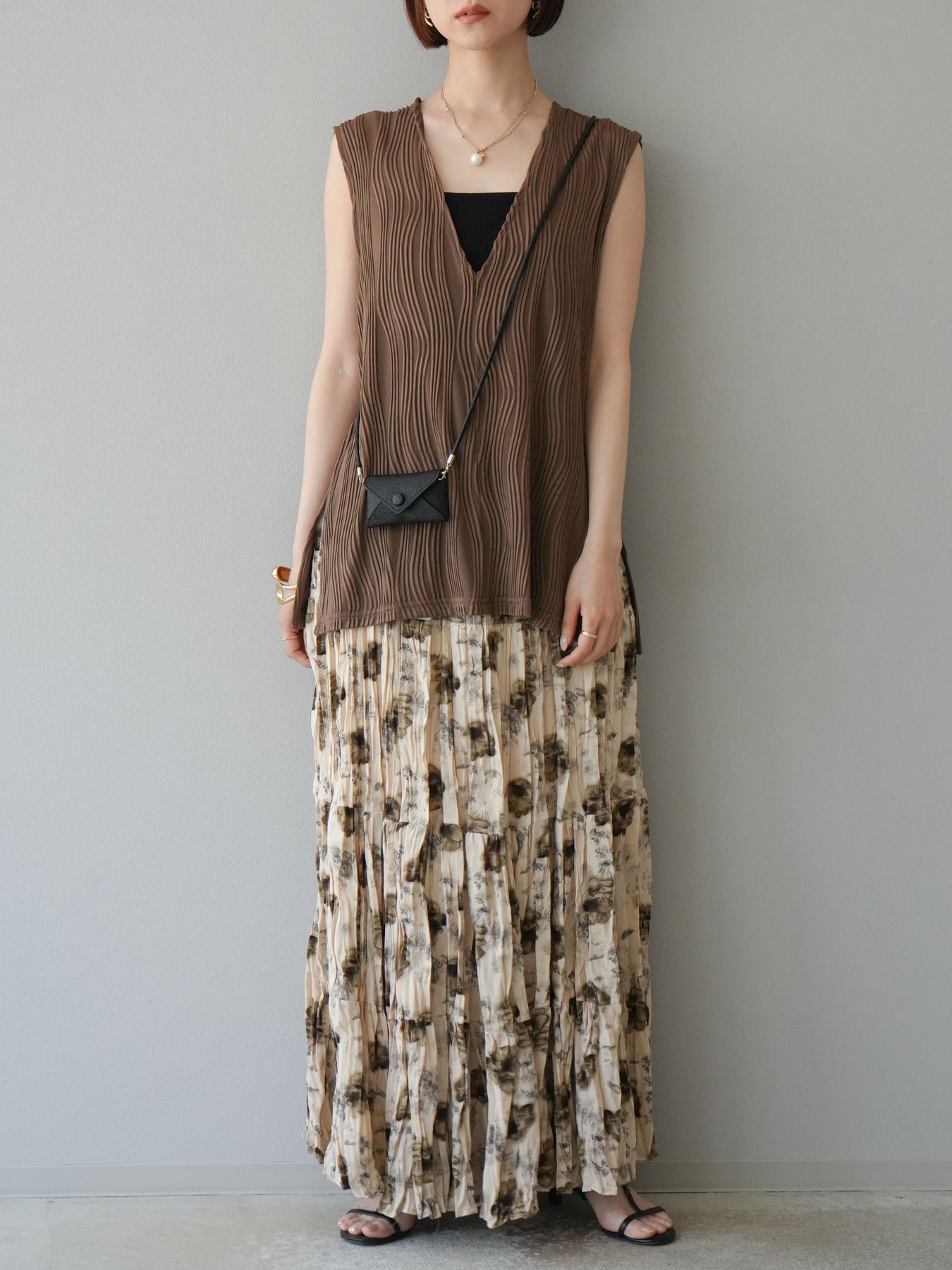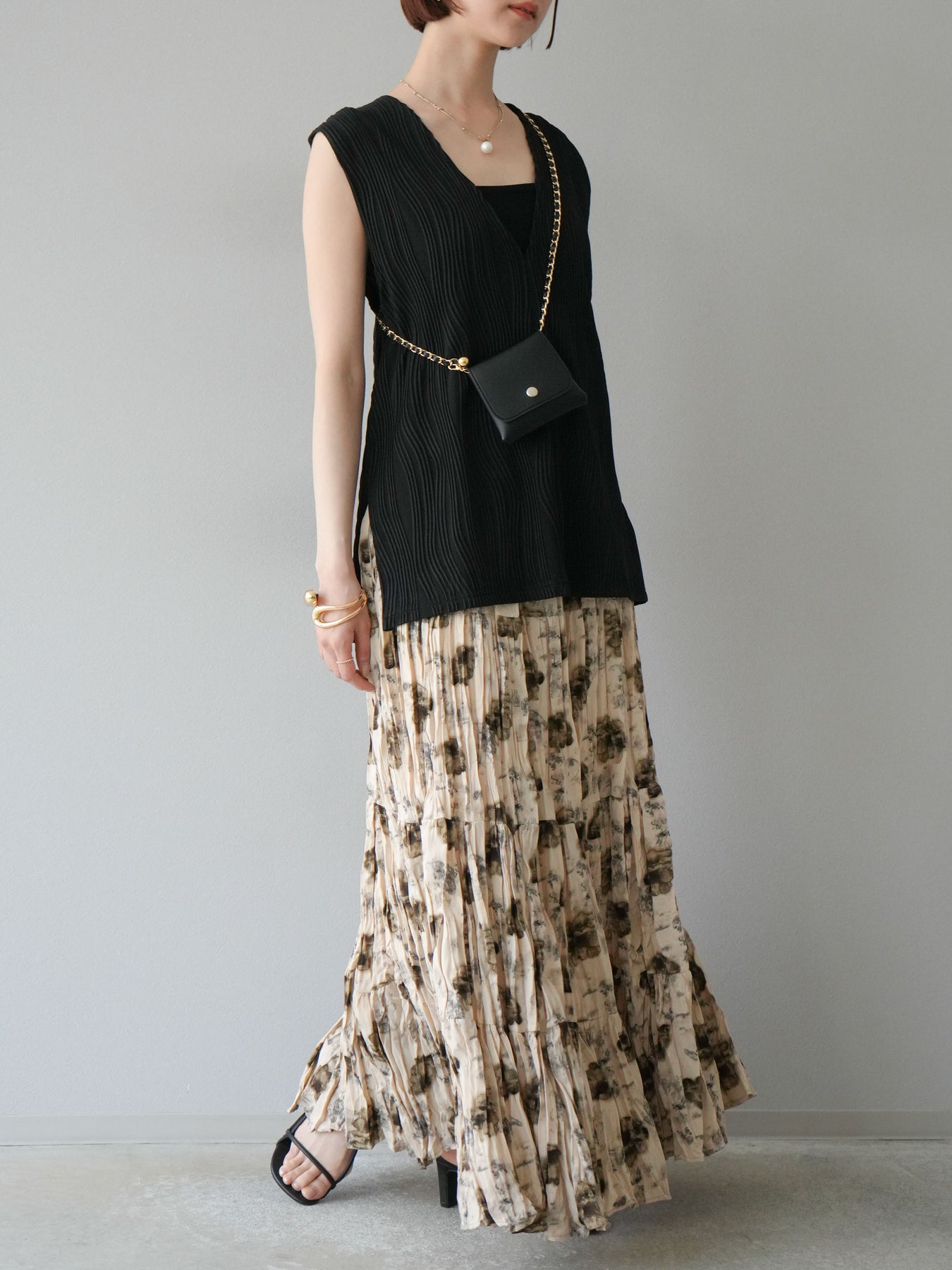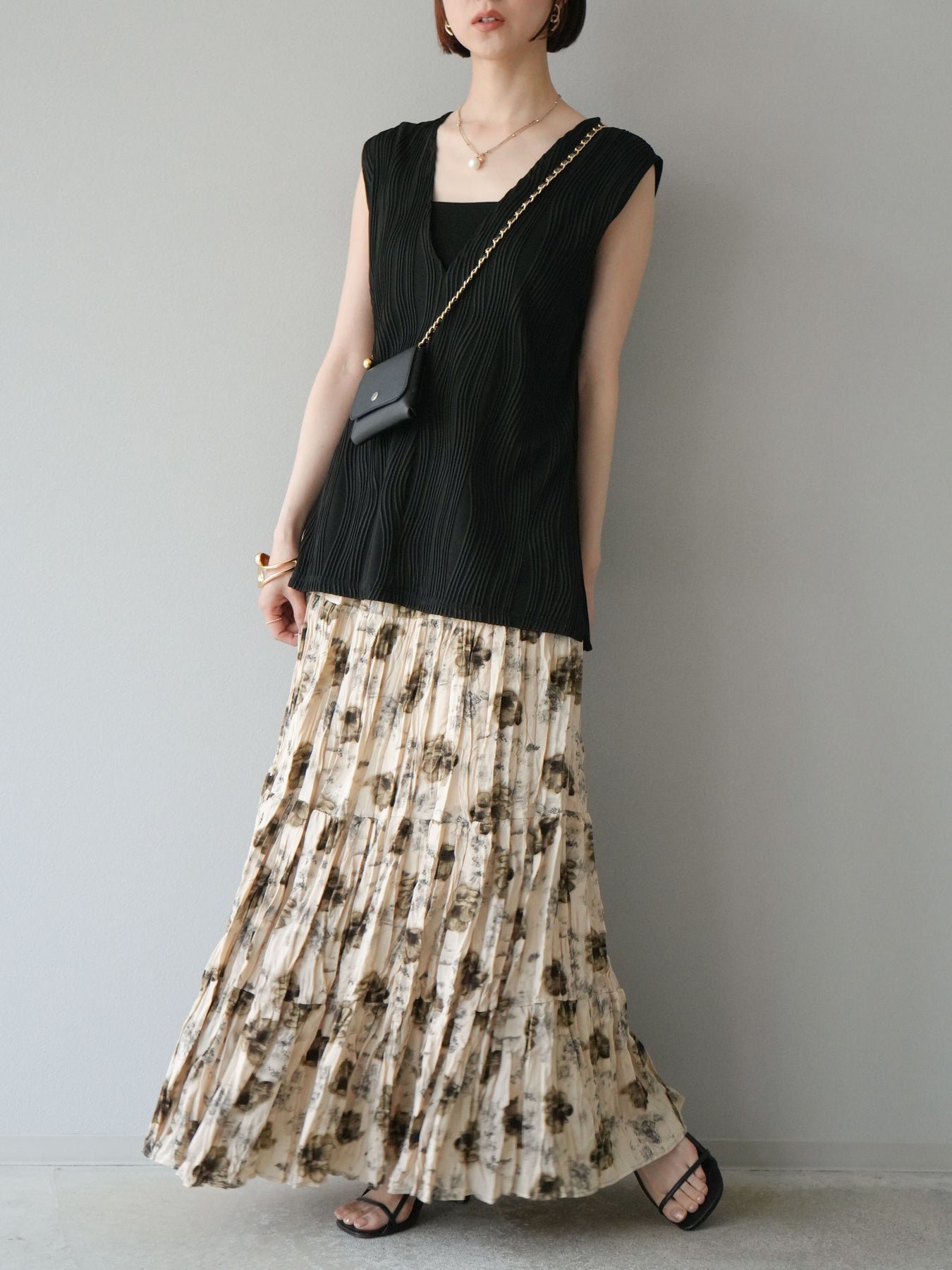 立体感のあるワッシャー加工が施された軽やかな素材に、華やかで印象的なフラワープリントをのせたロングスカート。動くたびにふんわり揺れるシルエットと繊細なプリーツが、女性らしさを引き立ててくれる1枚です。ウエストはゴム仕様でストレスフリーな穿き心地ながら、しっかりと腰位置で決まる設計になっており、トップスインも美しく決まります。Tシャツやタンクトップと合わせてカジュアルにも、ブラウスと合わせてフェミニンにも活躍する万能スカートです。 ※ボトムス、キャミソール(インナー)以外の商品は一律でインナーは付属していません。