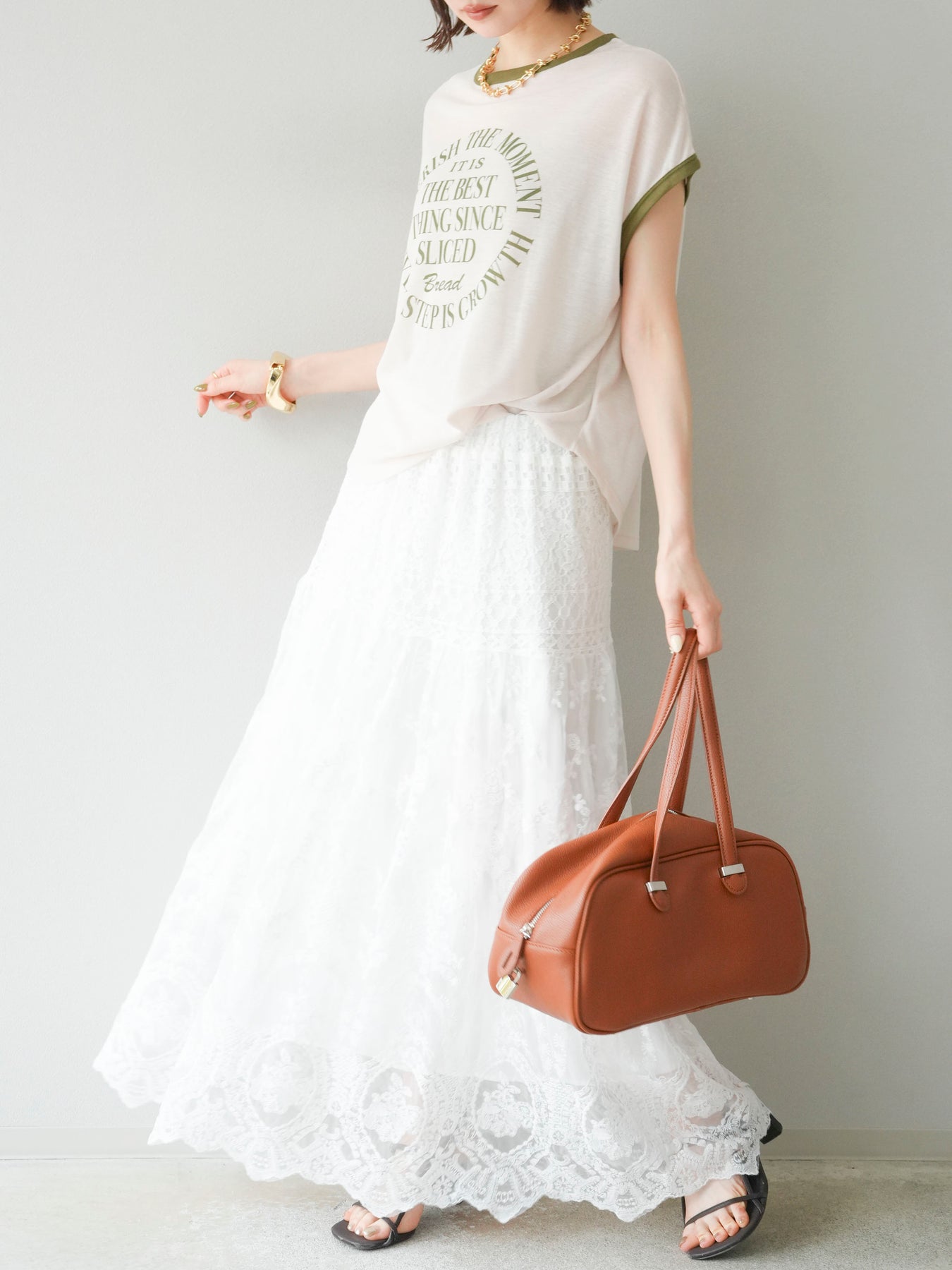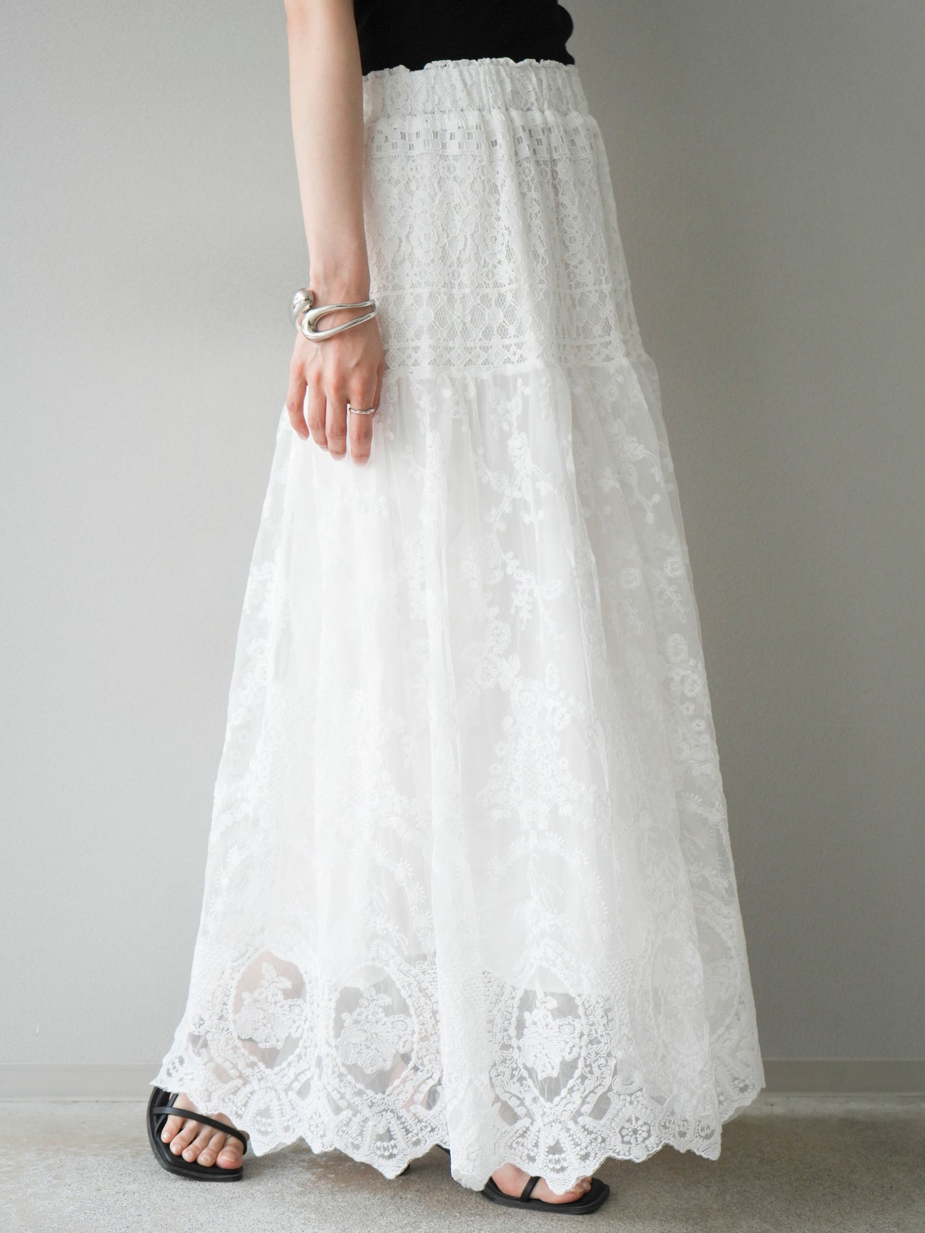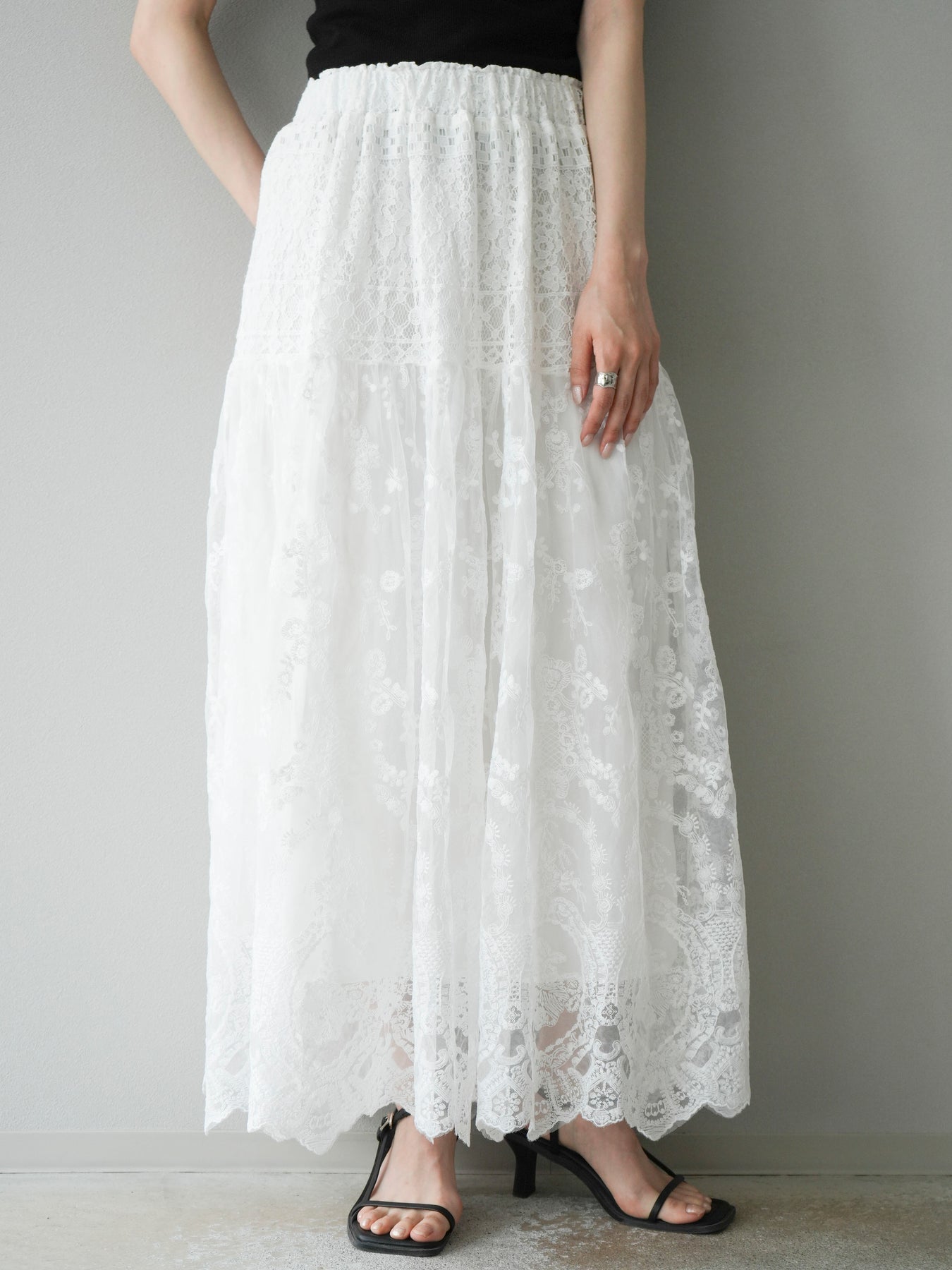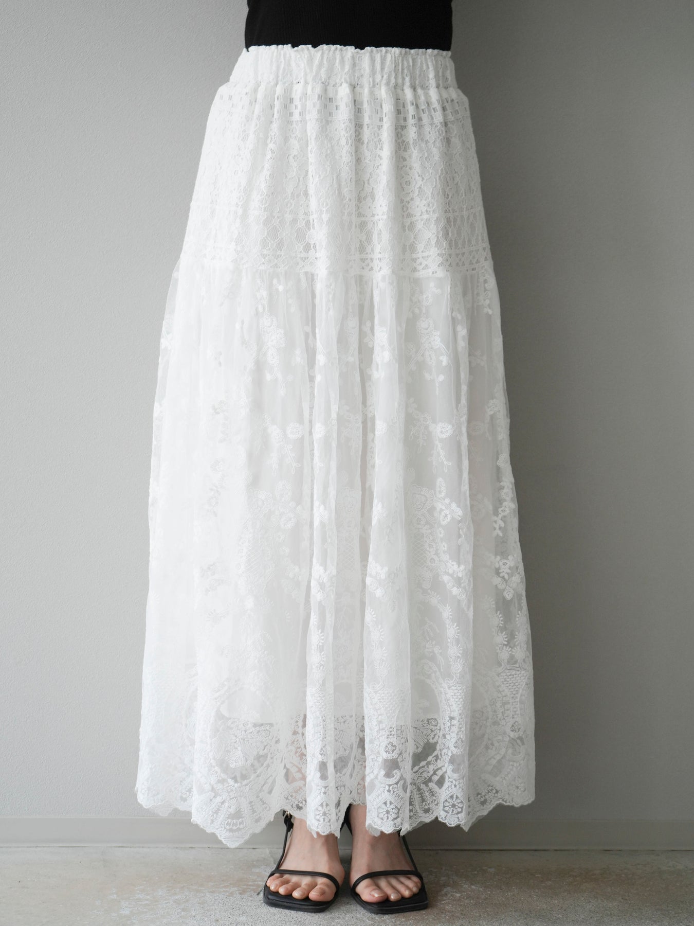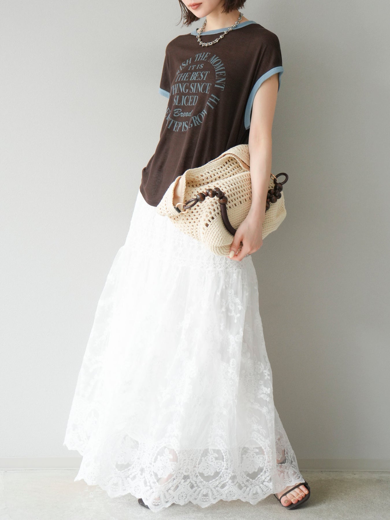 華やかで繊細なレースが贅沢に施された、エレガントな印象のフレアスカート。 裾にかけて広がるボリューム感と透け感が、歩くたびにふんわりと揺れて軽やかな女性らしさを演出します。 上品なレース柄と程よい光沢感がありながらも、ウエストゴム仕様で着心地はリラクシー。 裏地付きで安心して着用でき、Tシャツやシンプルなトップスと合わせるだけでスタイリングが完成します。 カジュアルな抜け感にも、きれいめなドレッシーさにも対応できる万能な一枚。 デイリーからオケージョンまで、幅広く活躍する主役級スカートです。