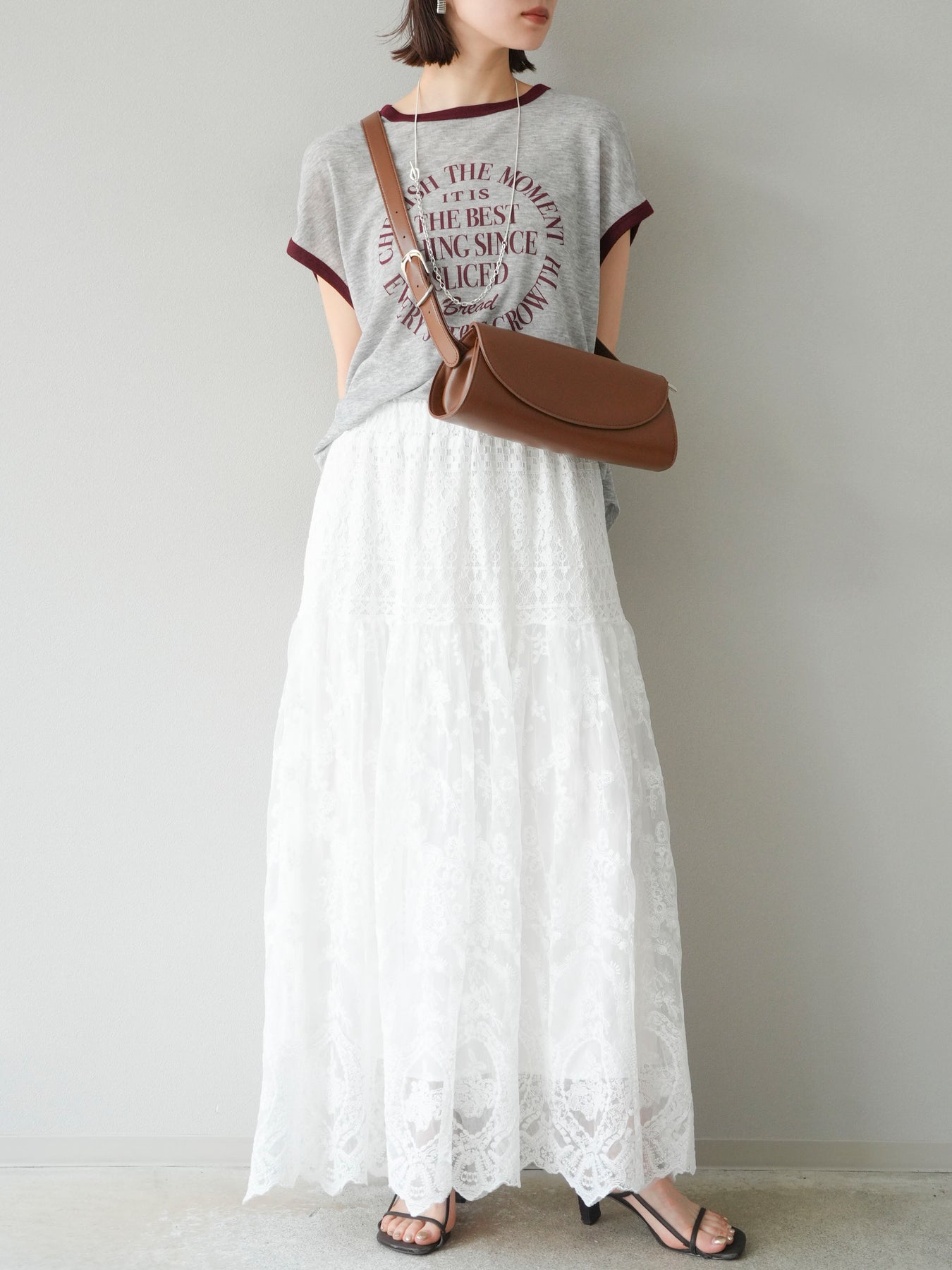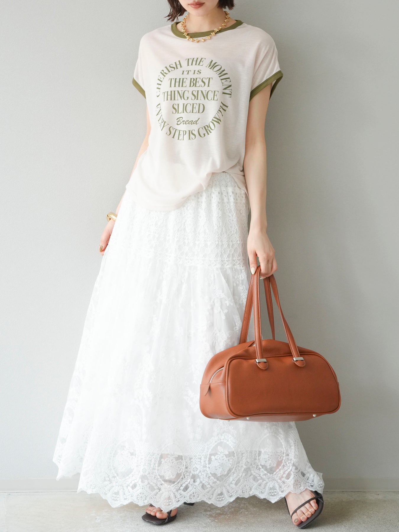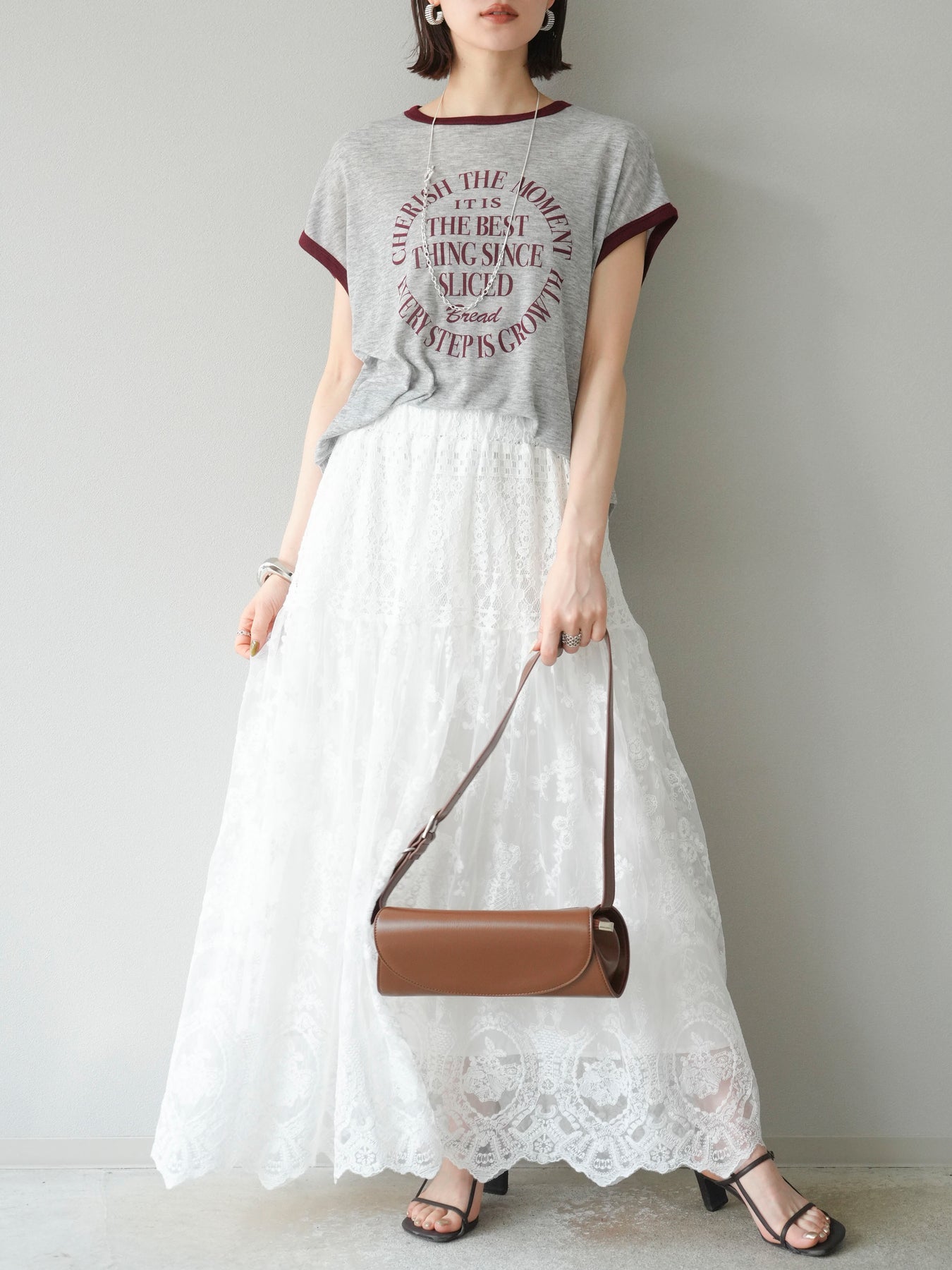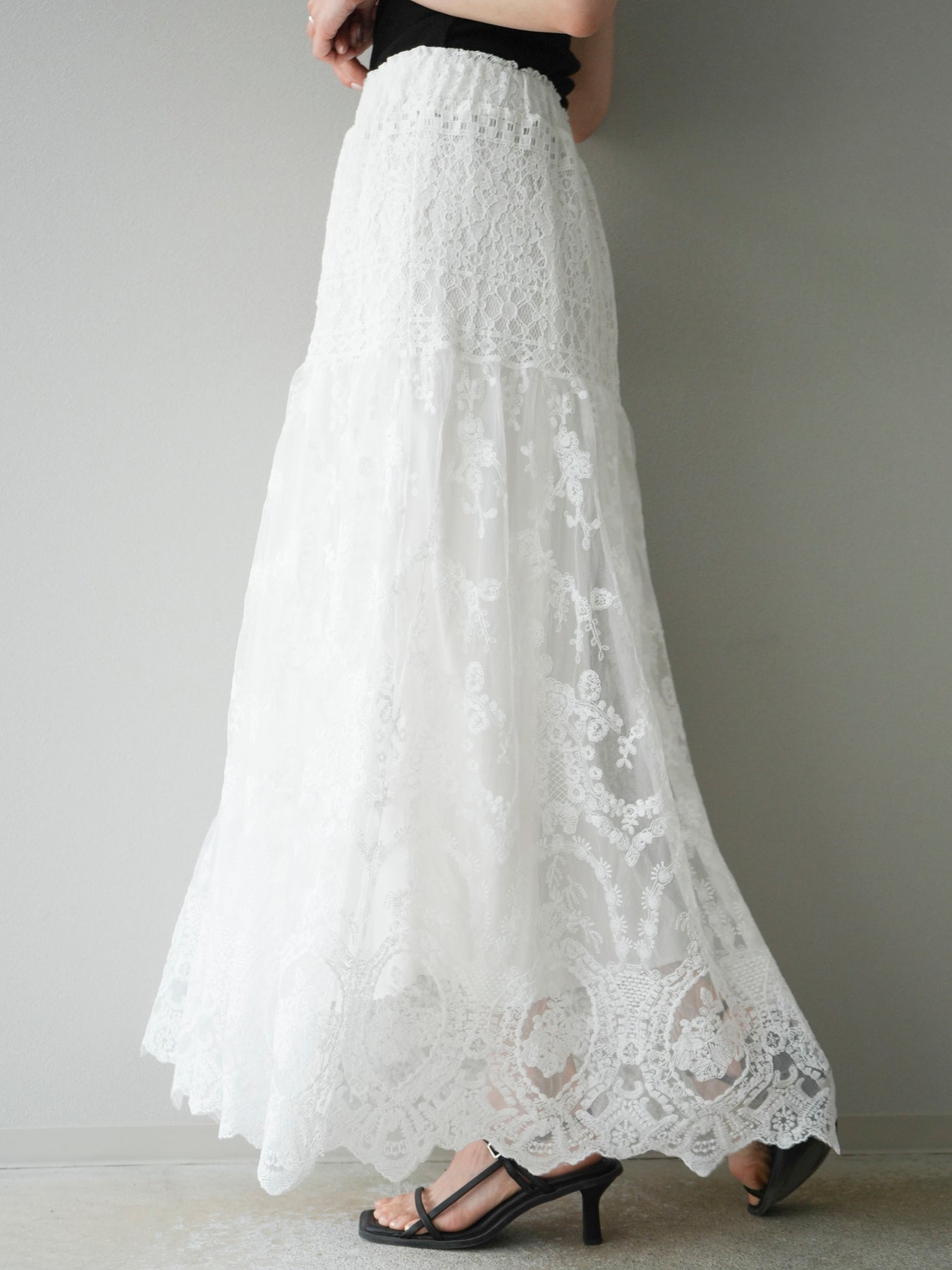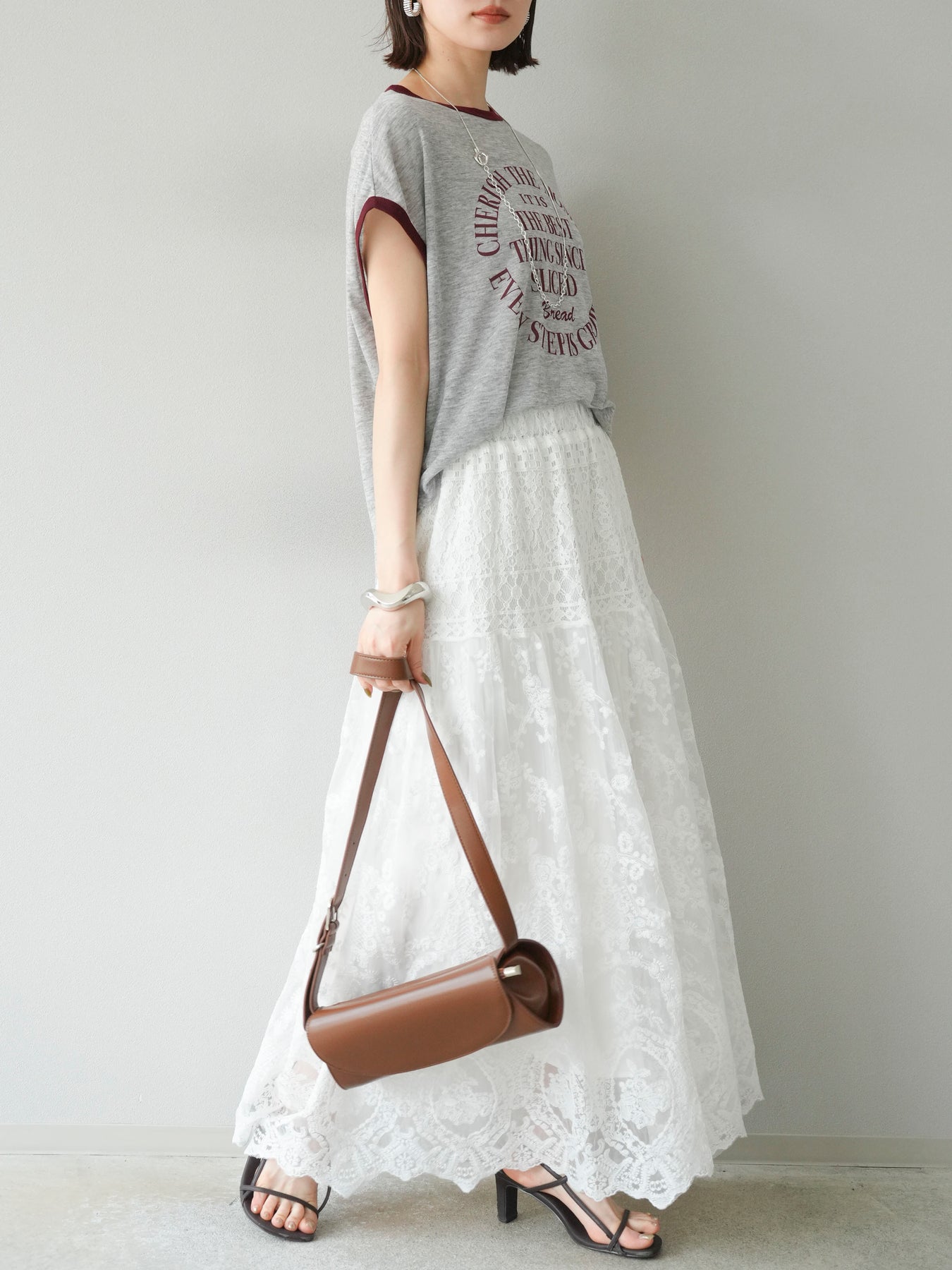 華やかで繊細なレースが贅沢に施された、エレガントな印象のフレアスカート。 裾にかけて広がるボリューム感と透け感が、歩くたびにふんわりと揺れて軽やかな女性らしさを演出します。 上品なレース柄と程よい光沢感がありながらも、ウエストゴム仕様で着心地はリラクシー。 裏地付きで安心して着用でき、Tシャツやシンプルなトップスと合わせるだけでスタイリングが完成します。 カジュアルな抜け感にも、きれいめなドレッシーさにも対応できる万能な一枚。 デイリーからオケージョンまで、幅広く活躍する主役級スカートです。