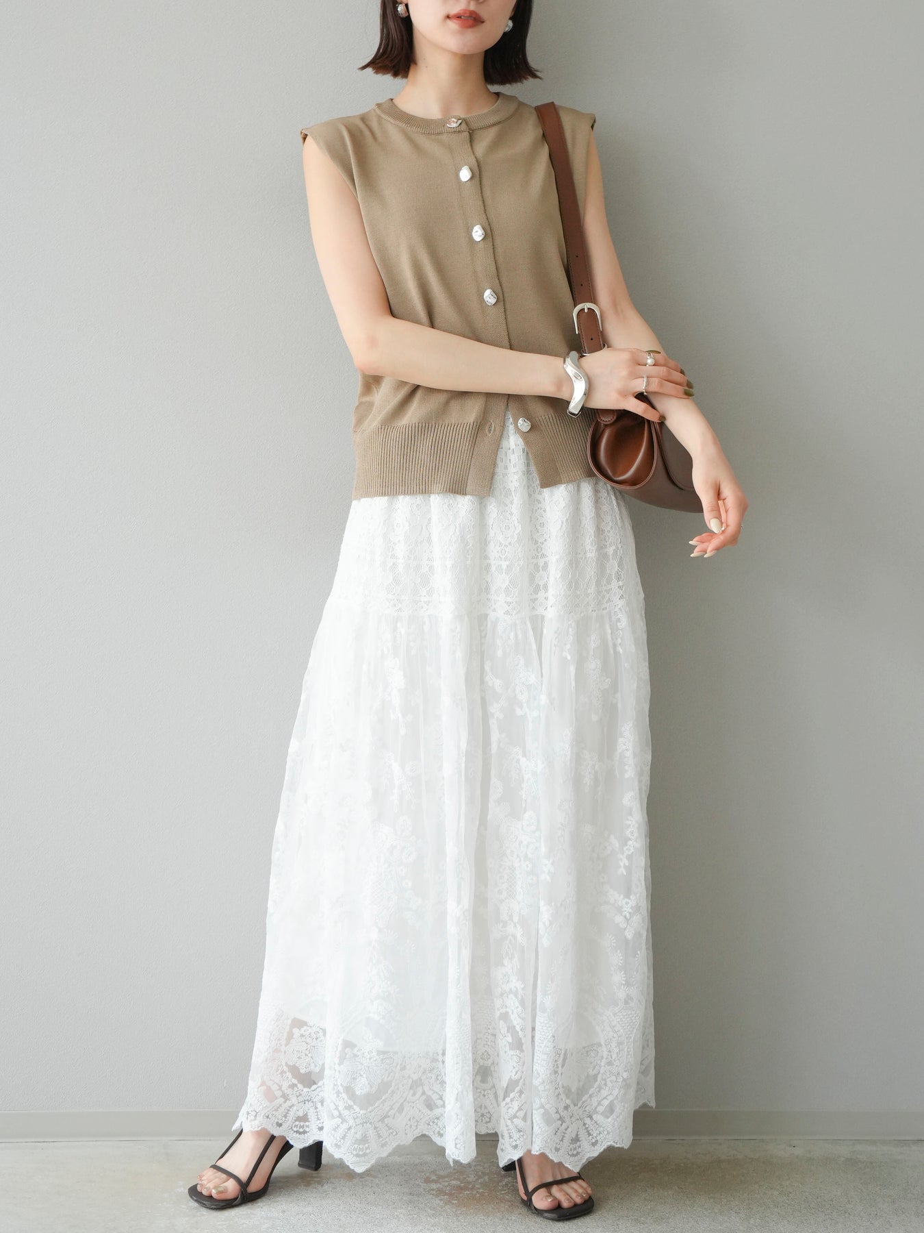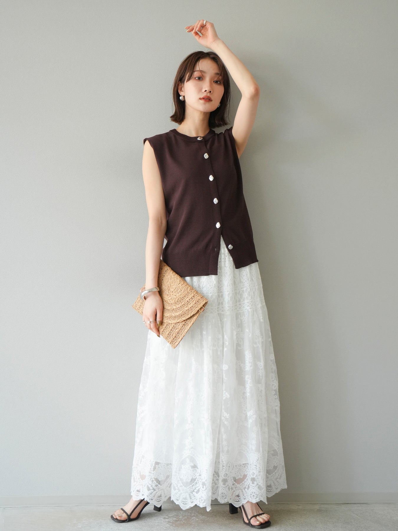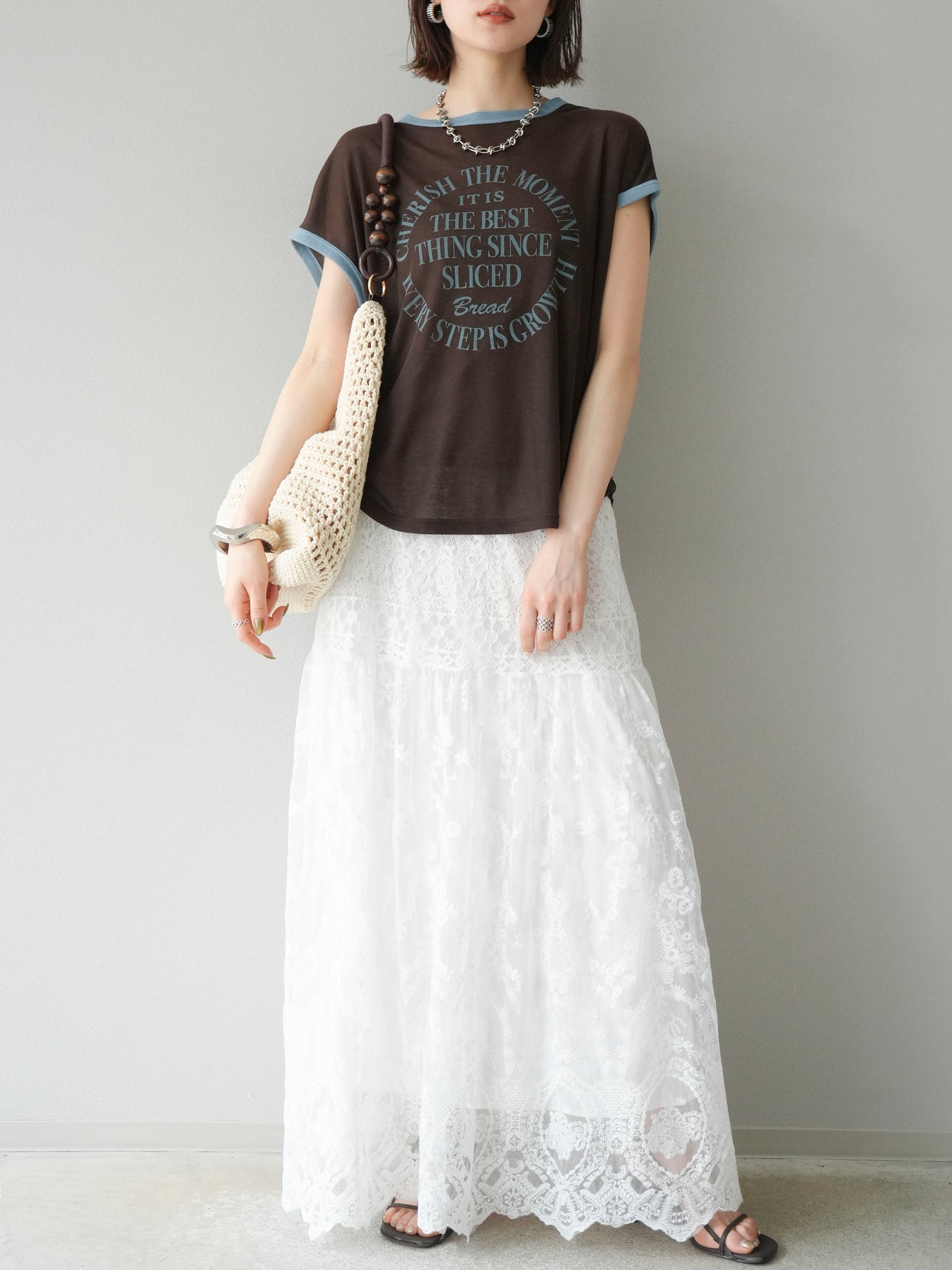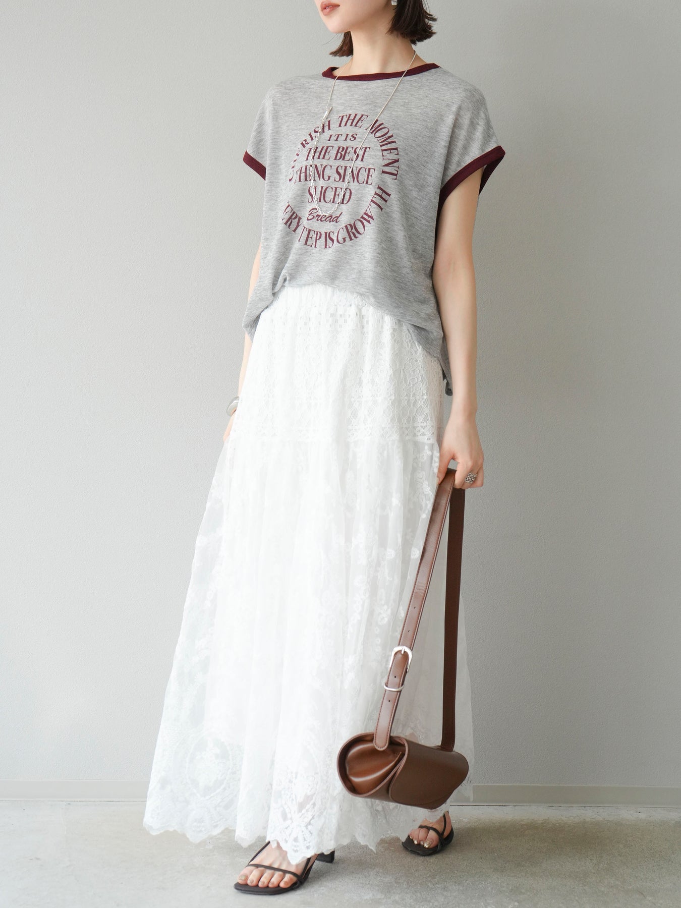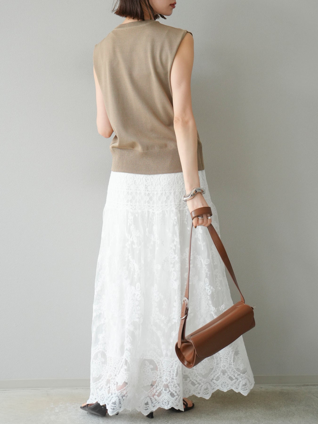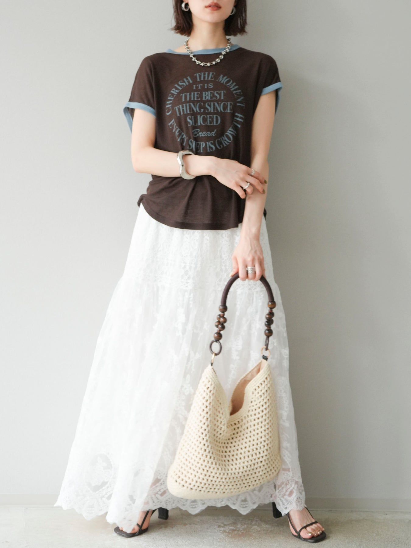華やかで繊細なレースが贅沢に施された、エレガントな印象のフレアスカート。 裾にかけて広がるボリューム感と透け感が、歩くたびにふんわりと揺れて軽やかな女性らしさを演出します。 上品なレース柄と程よい光沢感がありながらも、ウエストゴム仕様で着心地はリラクシー。 裏地付きで安心して着用でき、Tシャツやシンプルなトップスと合わせるだけでスタイリングが完成します。 カジュアルな抜け感にも、きれいめなドレッシーさにも対応できる万能な一枚。 デイリーからオケージョンまで、幅広く活躍する主役級スカートです。