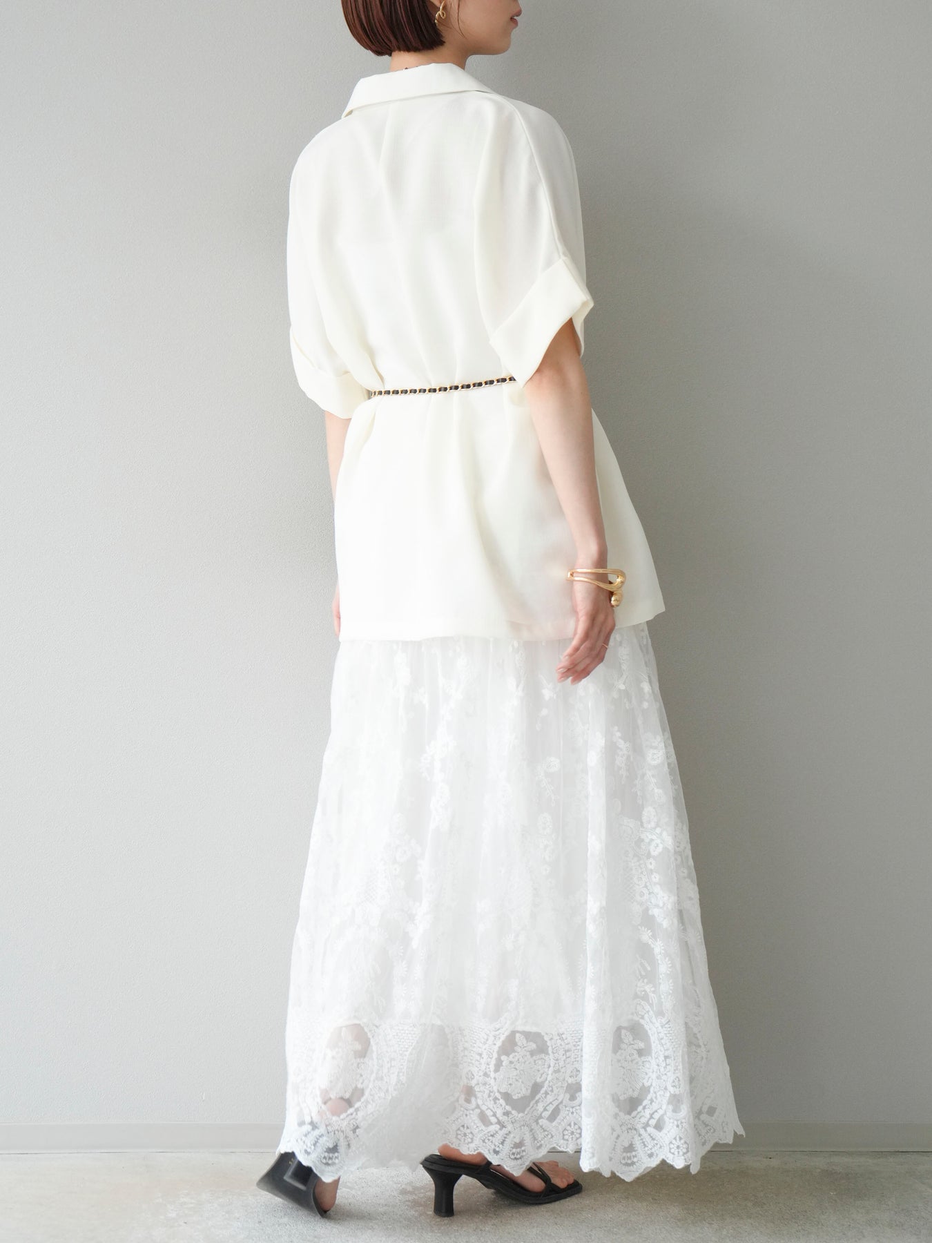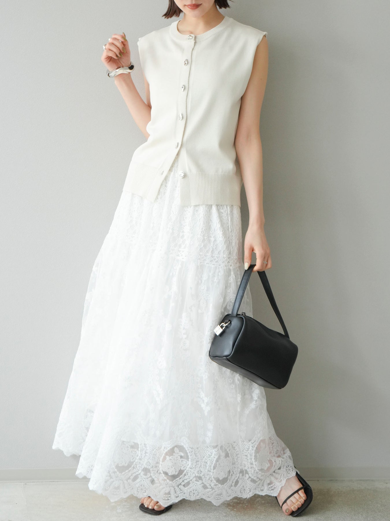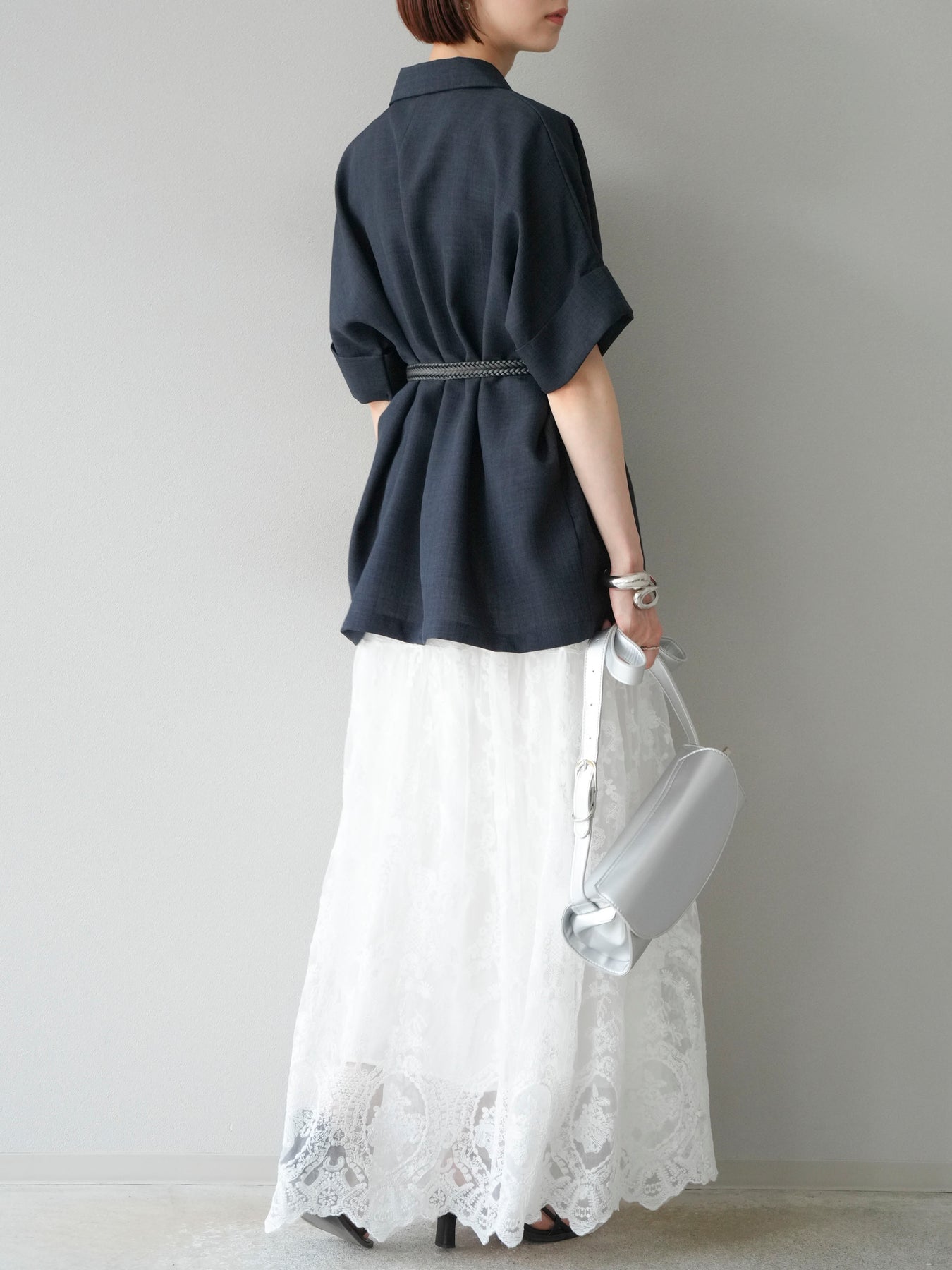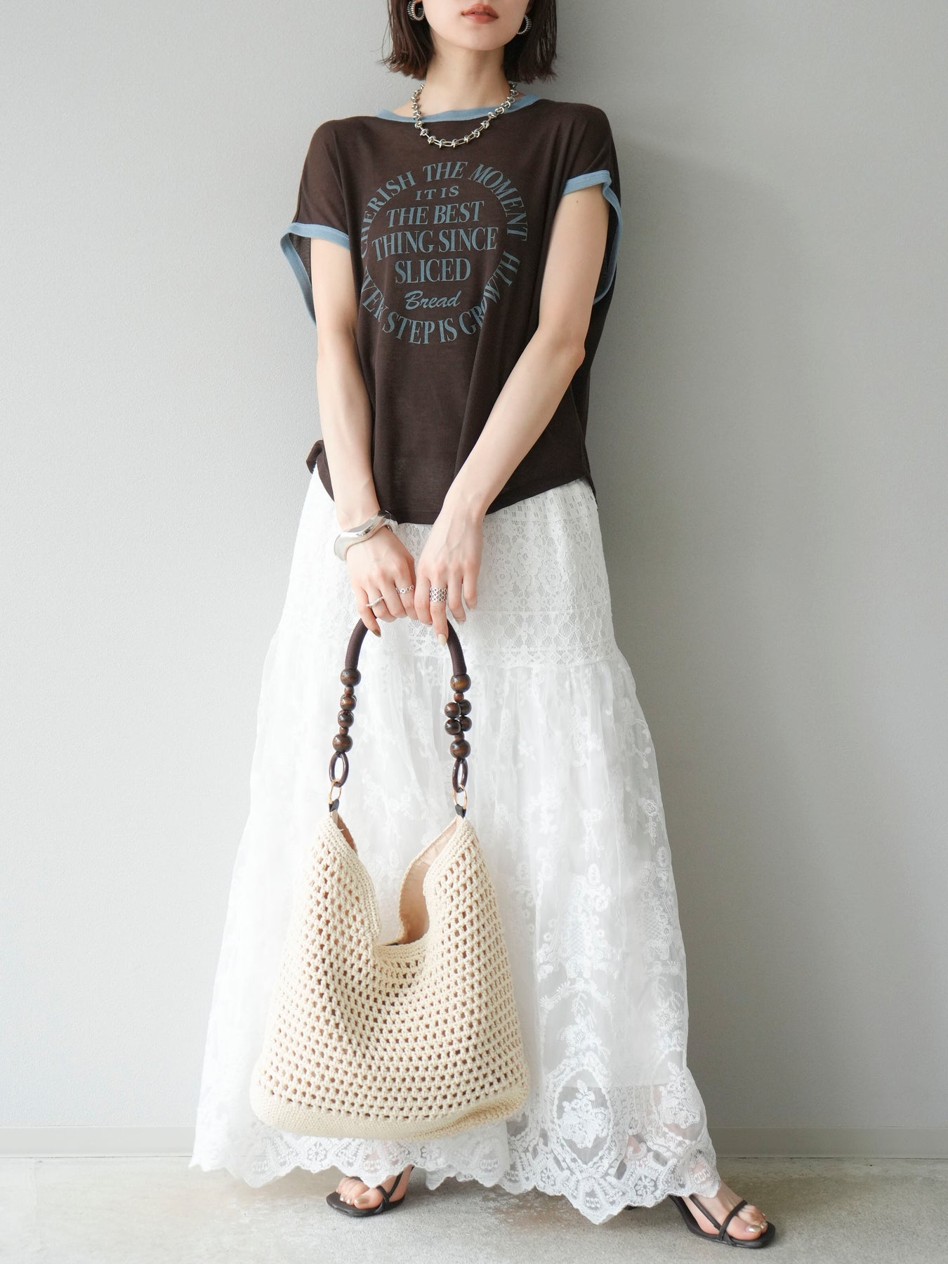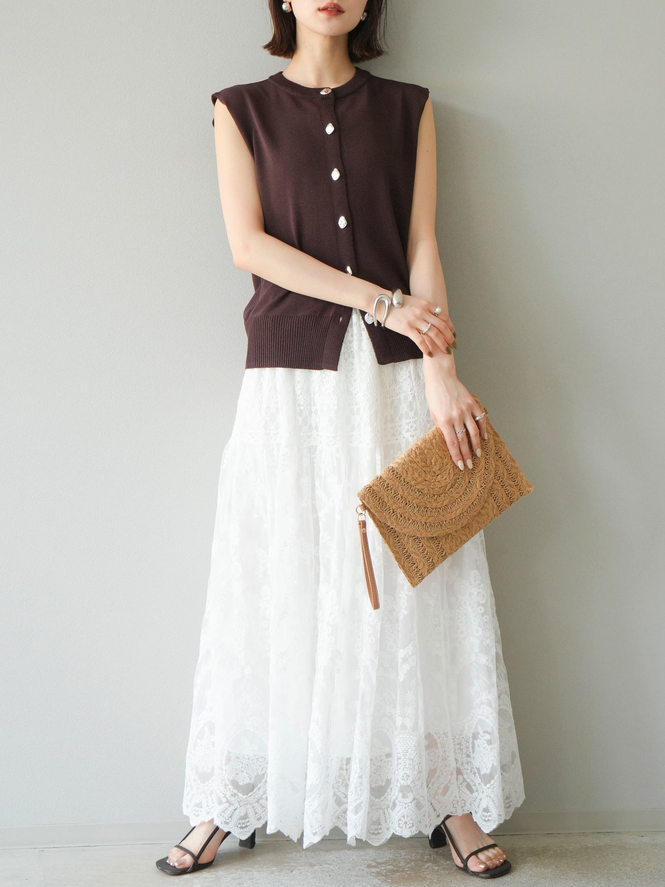 華やかで繊細なレースが贅沢に施された、エレガントな印象のフレアスカート。 裾にかけて広がるボリューム感と透け感が、歩くたびにふんわりと揺れて軽やかな女性らしさを演出します。 上品なレース柄と程よい光沢感がありながらも、ウエストゴム仕様で着心地はリラクシー。 裏地付きで安心して着用でき、Tシャツやシンプルなトップスと合わせるだけでスタイリングが完成します。 カジュアルな抜け感にも、きれいめなドレッシーさにも対応できる万能な一枚。 デイリーからオケージョンまで、幅広く活躍する主役級スカートです。