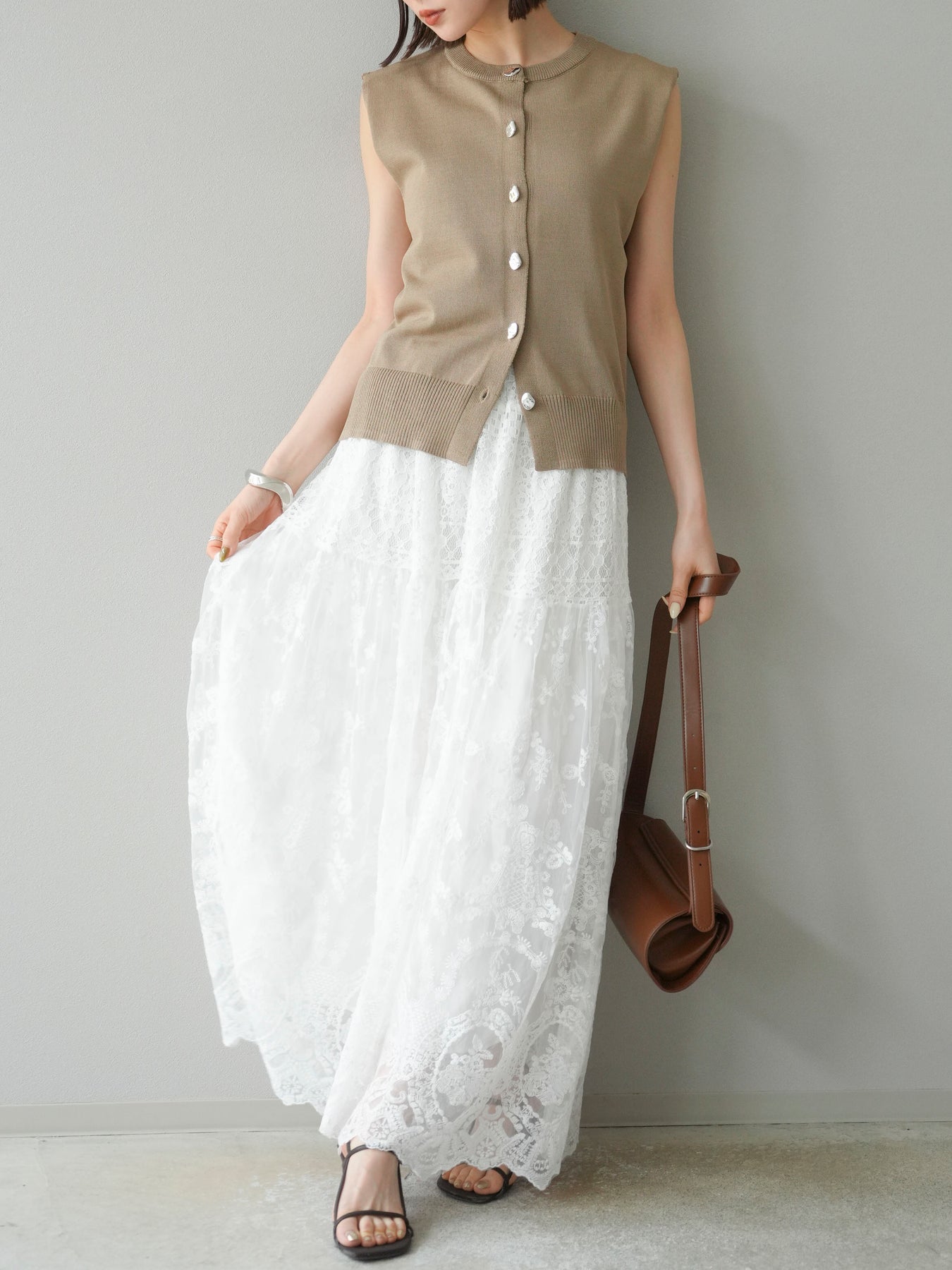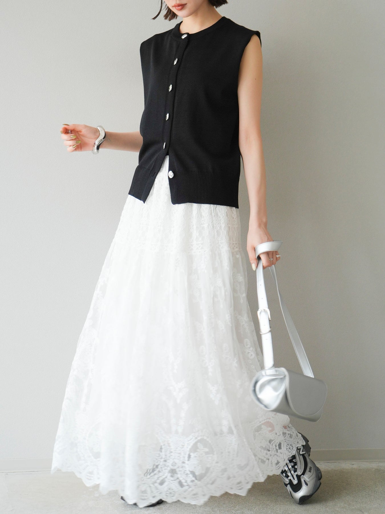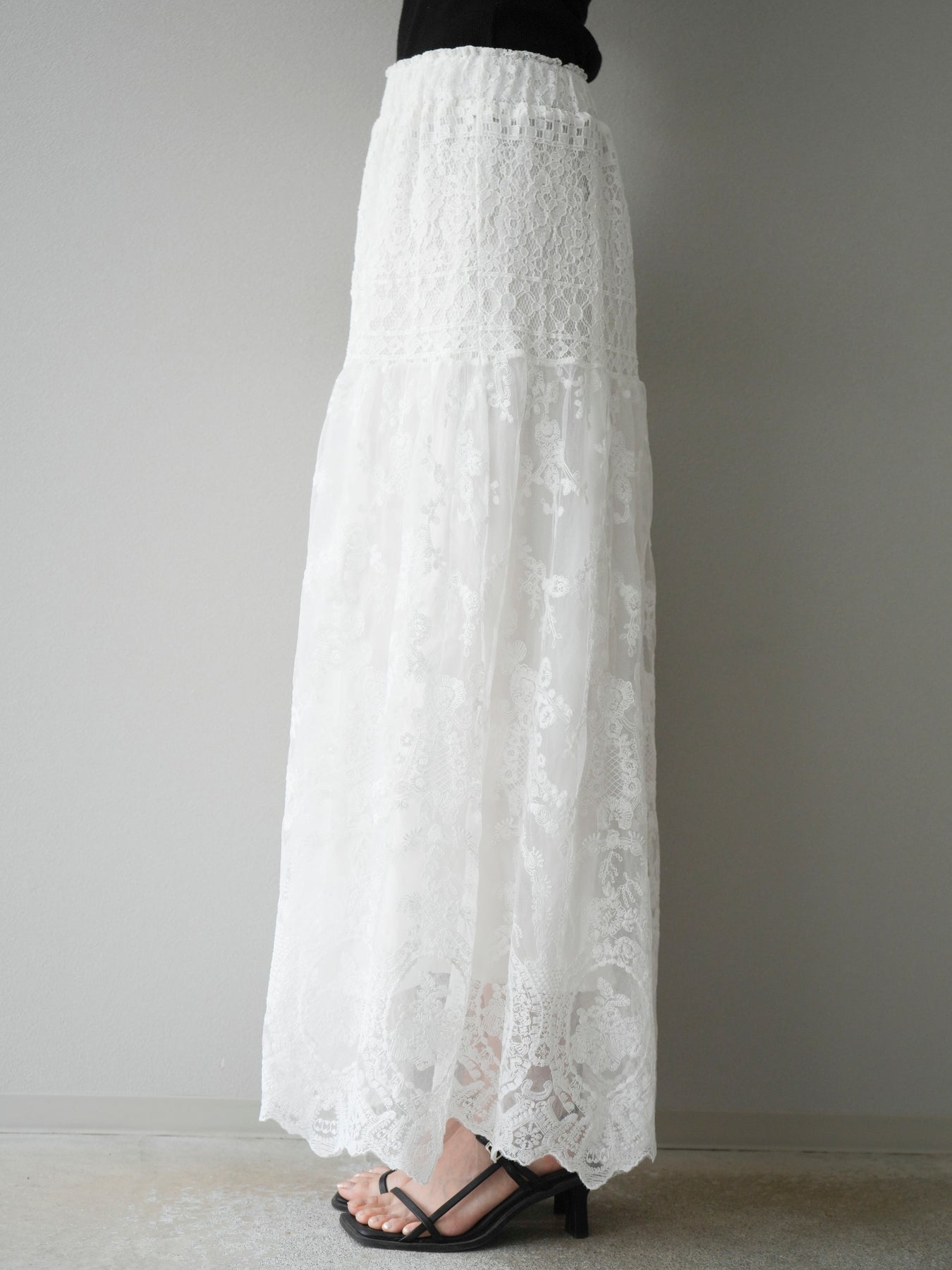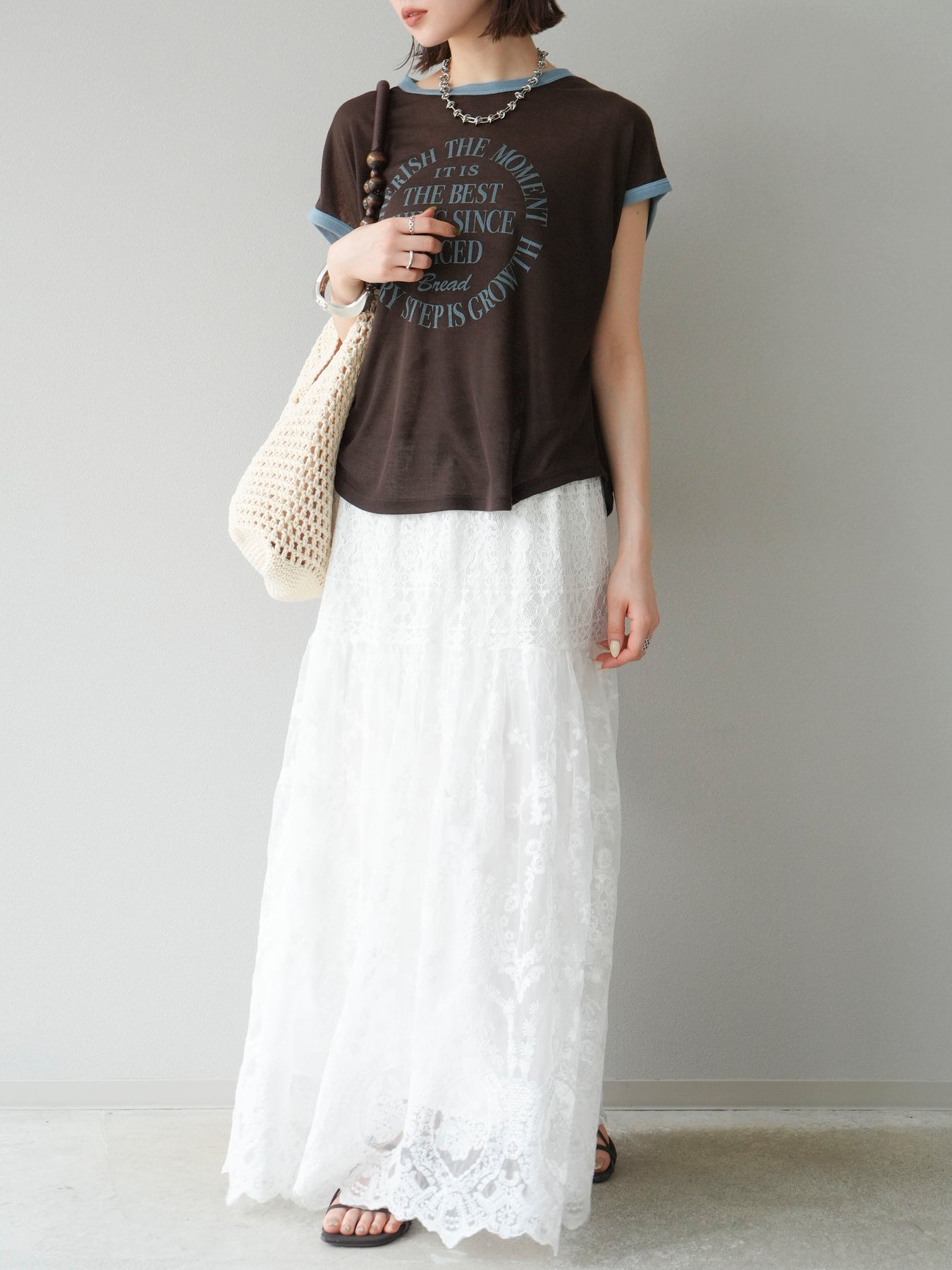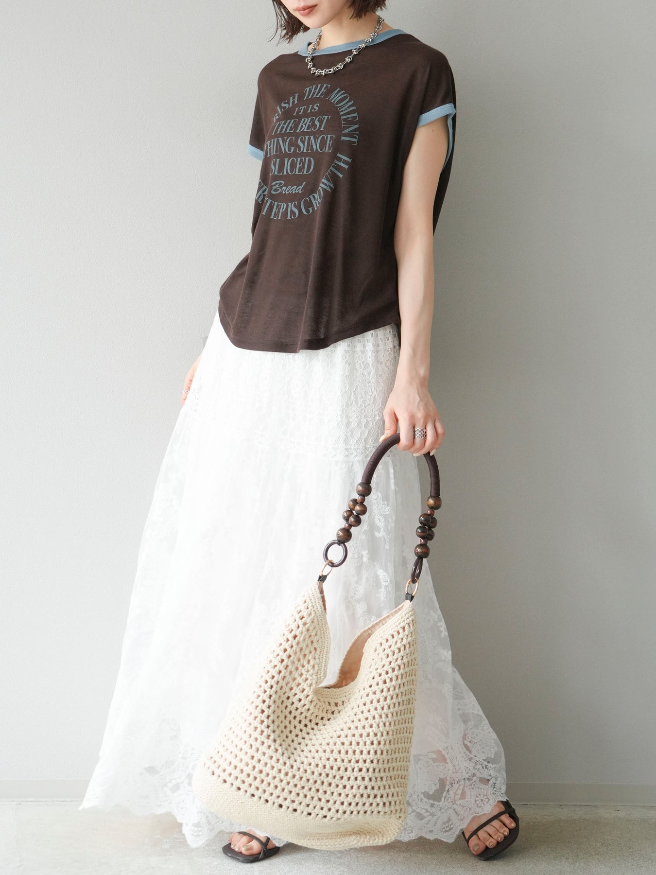 華やかで繊細なレースが贅沢に施された、エレガントな印象のフレアスカート。 裾にかけて広がるボリューム感と透け感が、歩くたびにふんわりと揺れて軽やかな女性らしさを演出します。 上品なレース柄と程よい光沢感がありながらも、ウエストゴム仕様で着心地はリラクシー。 裏地付きで安心して着用でき、Tシャツやシンプルなトップスと合わせるだけでスタイリングが完成します。 カジュアルな抜け感にも、きれいめなドレッシーさにも対応できる万能な一枚。 デイリーからオケージョンまで、幅広く活躍する主役級スカートです。