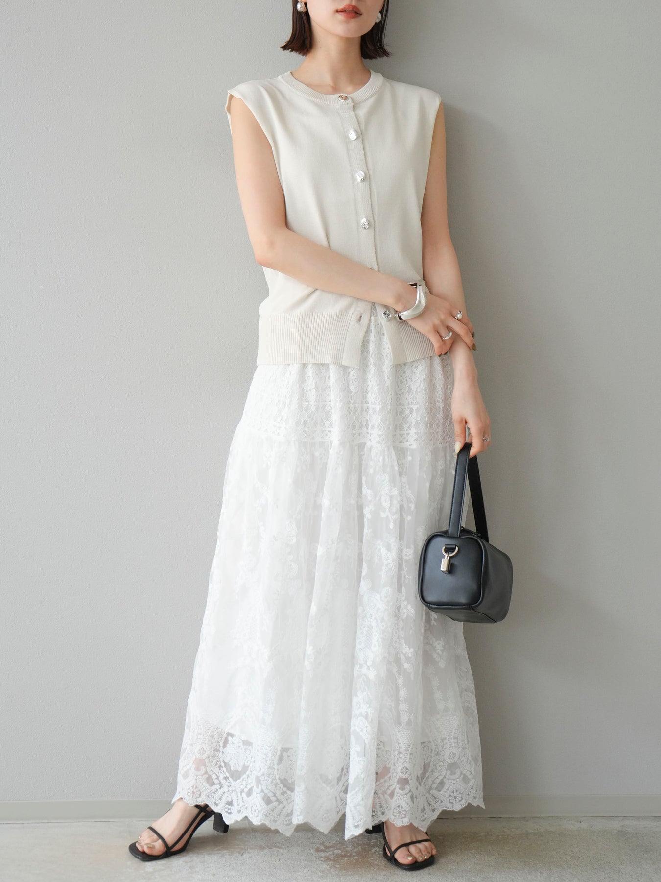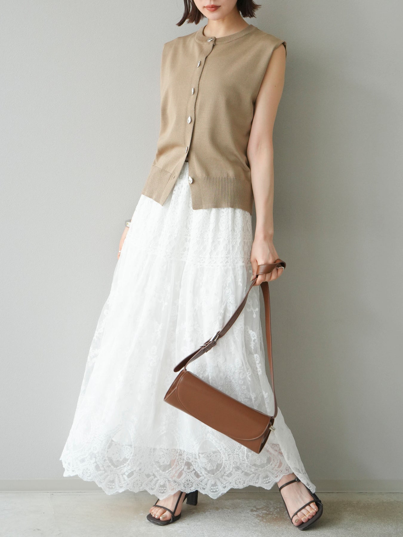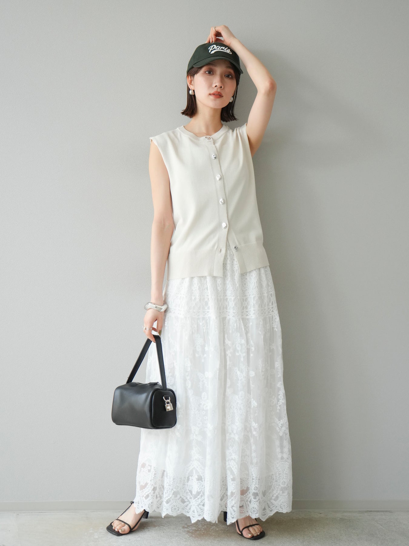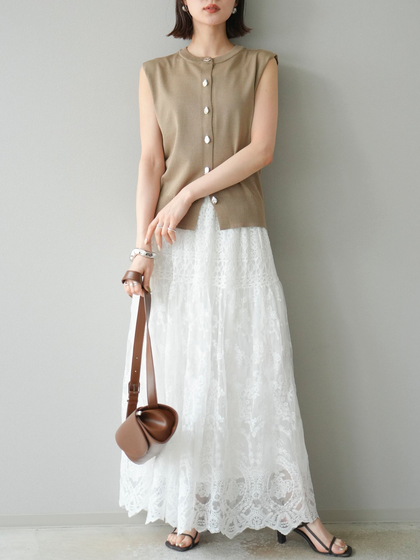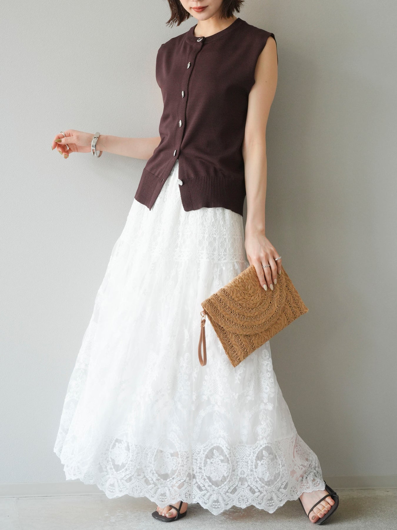 華やかで繊細なレースが贅沢に施された、エレガントな印象のフレアスカート。 裾にかけて広がるボリューム感と透け感が、歩くたびにふんわりと揺れて軽やかな女性らしさを演出します。 上品なレース柄と程よい光沢感がありながらも、ウエストゴム仕様で着心地はリラクシー。 裏地付きで安心して着用でき、Tシャツやシンプルなトップスと合わせるだけでスタイリングが完成します。 カジュアルな抜け感にも、きれいめなドレッシーさにも対応できる万能な一枚。 デイリーからオケージョンまで、幅広く活躍する主役級スカートです。