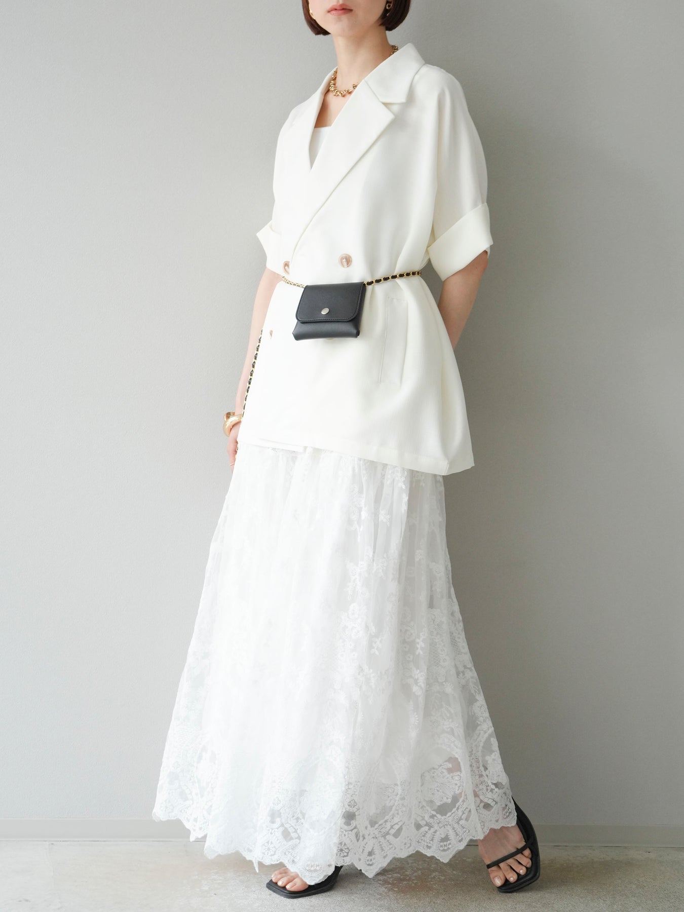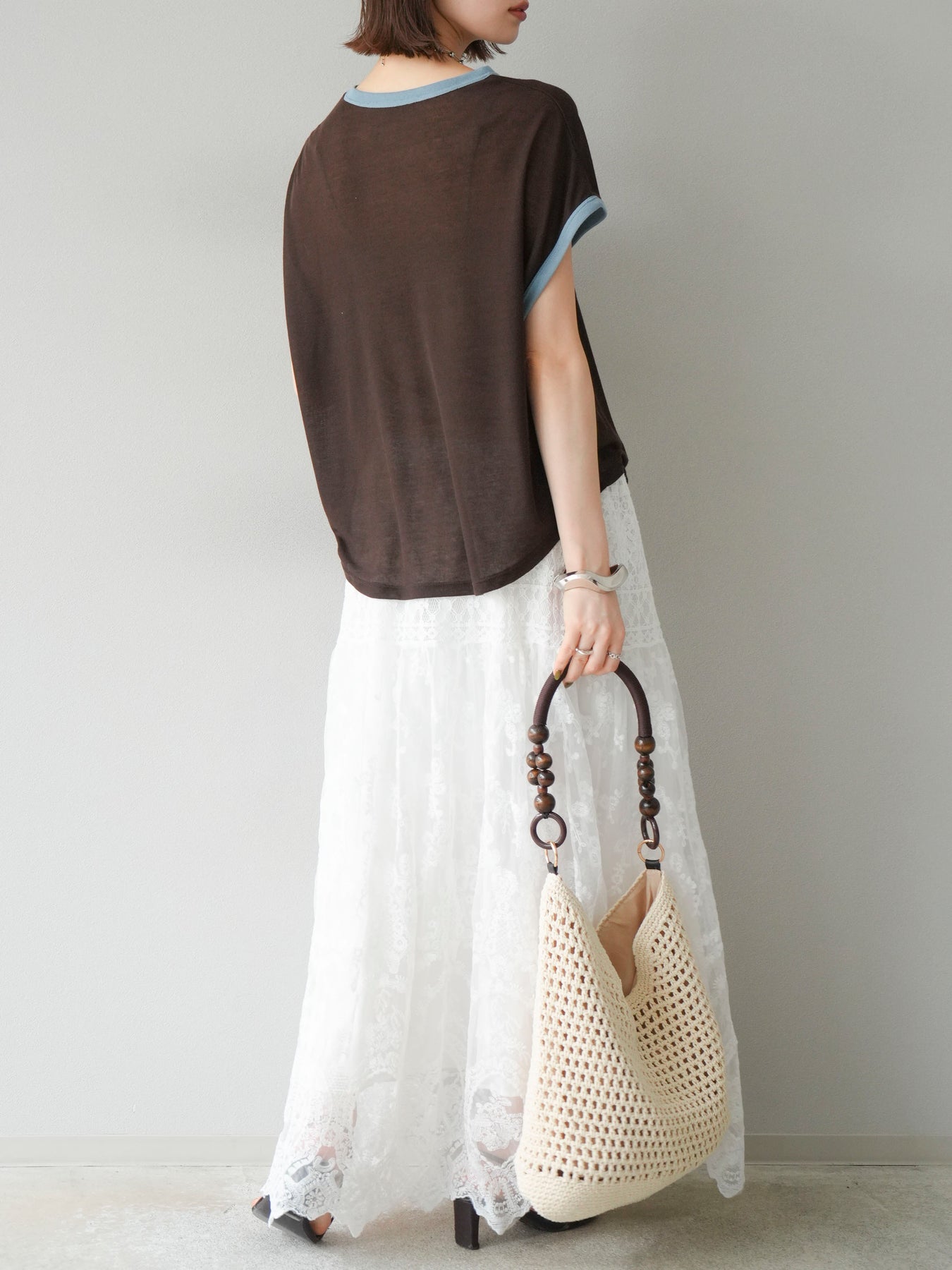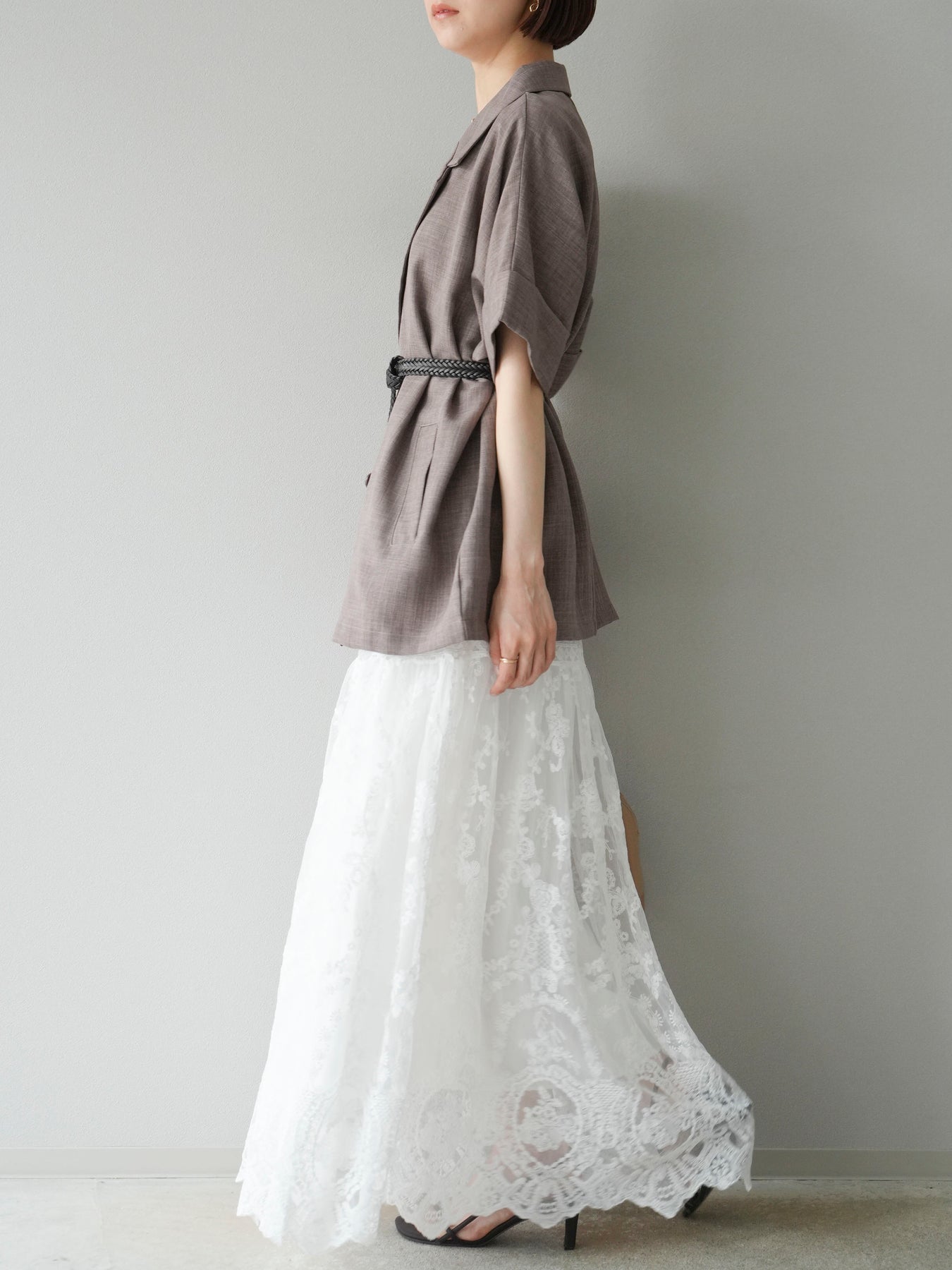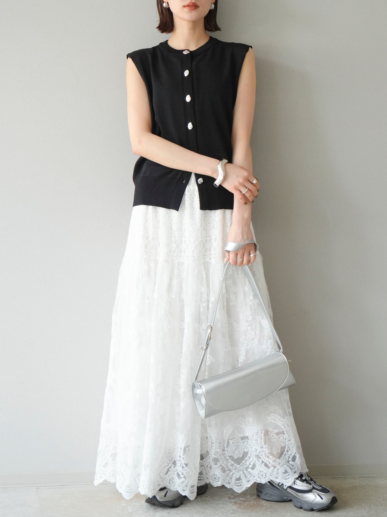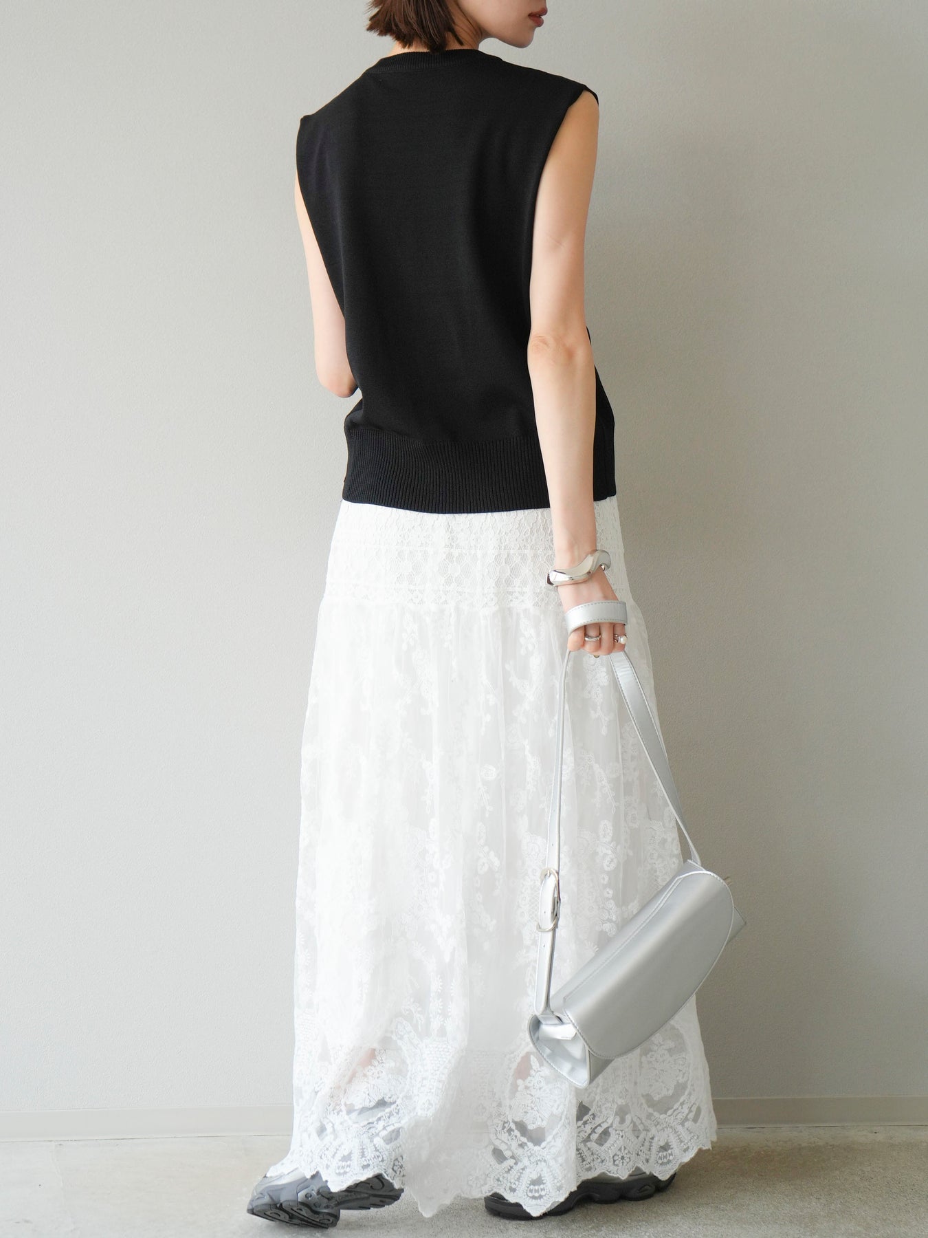 華やかで繊細なレースが贅沢に施された、エレガントな印象のフレアスカート。 裾にかけて広がるボリューム感と透け感が、歩くたびにふんわりと揺れて軽やかな女性らしさを演出します。 上品なレース柄と程よい光沢感がありながらも、ウエストゴム仕様で着心地はリラクシー。 裏地付きで安心して着用でき、Tシャツやシンプルなトップスと合わせるだけでスタイリングが完成します。 カジュアルな抜け感にも、きれいめなドレッシーさにも対応できる万能な一枚。 デイリーからオケージョンまで、幅広く活躍する主役級スカートです。