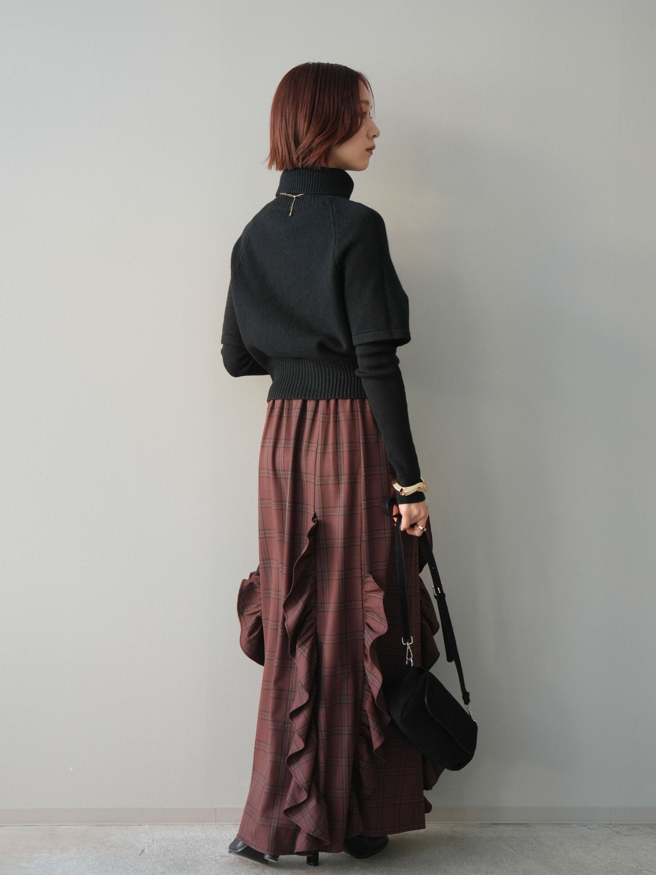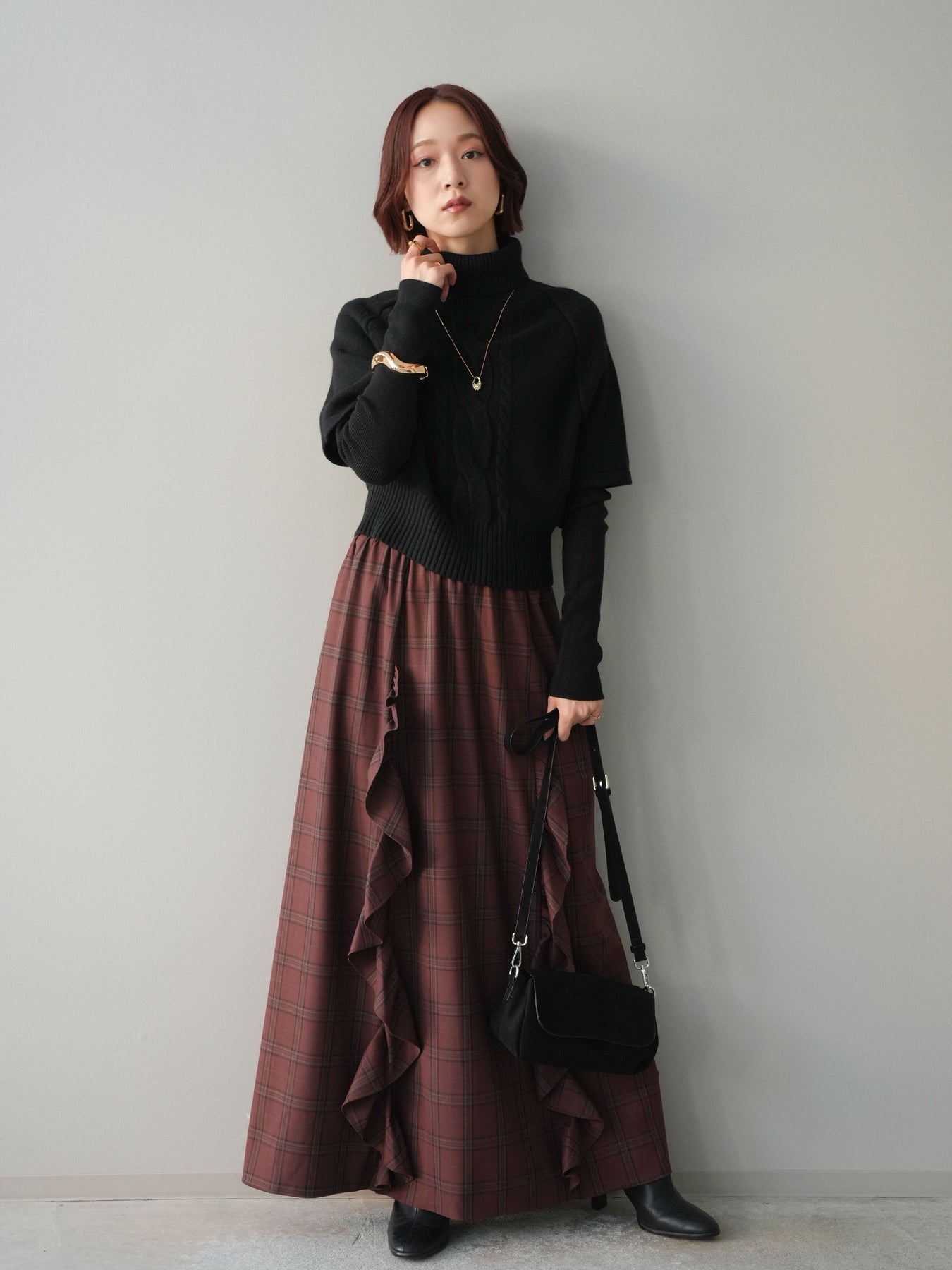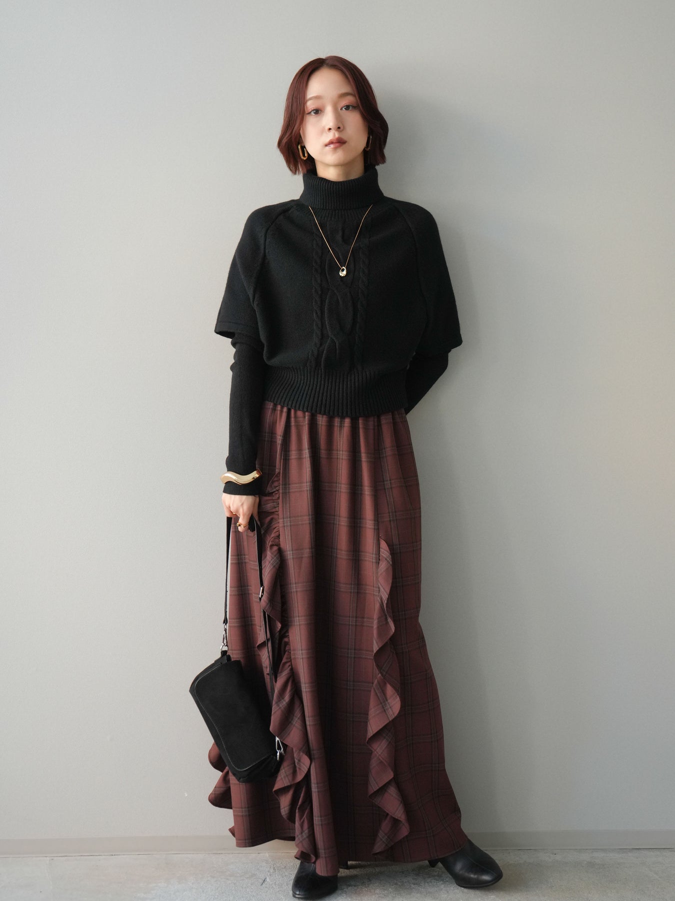 [予約]チェック柄フリルハイウエストマキシスカート/darkbrown