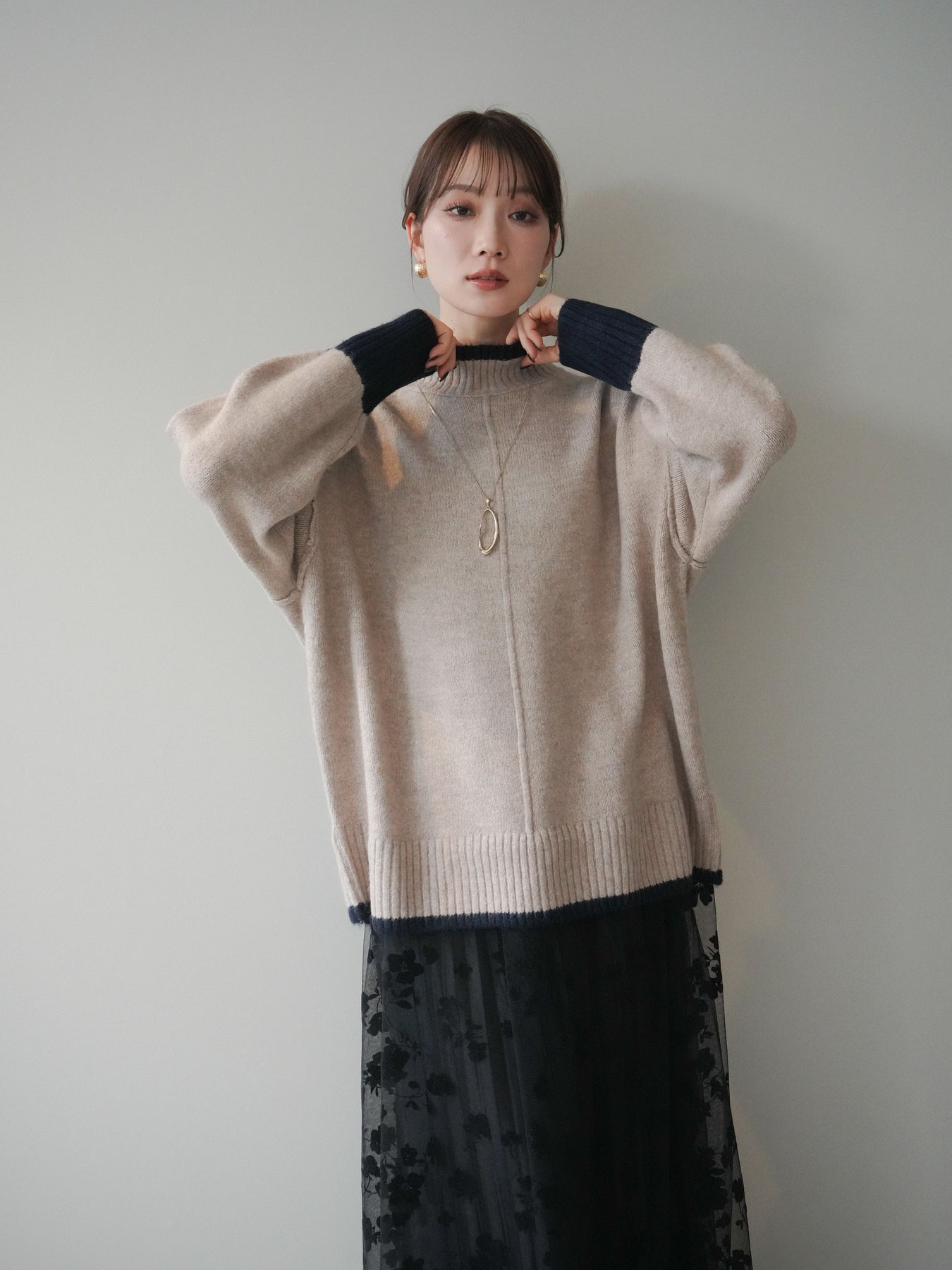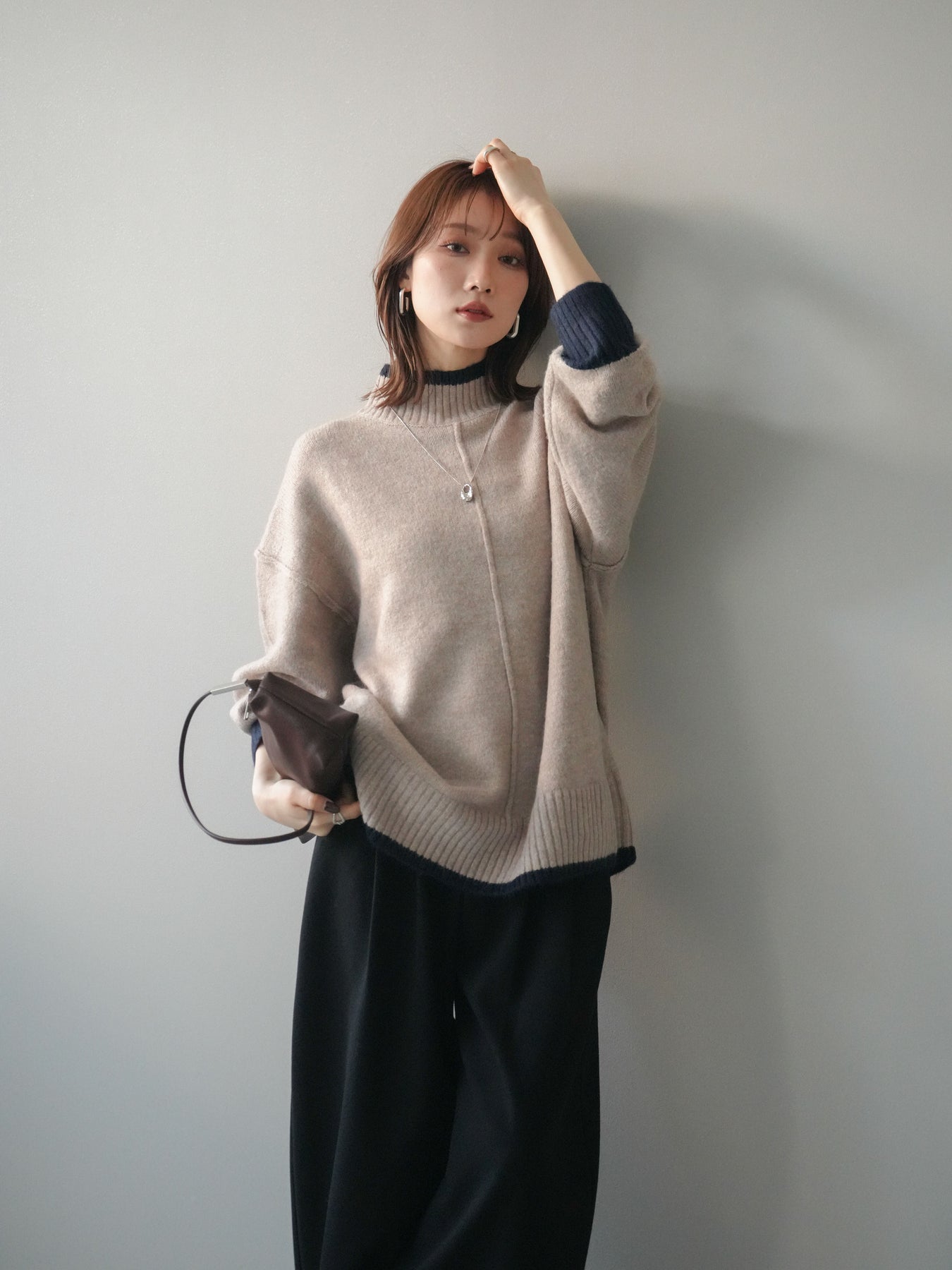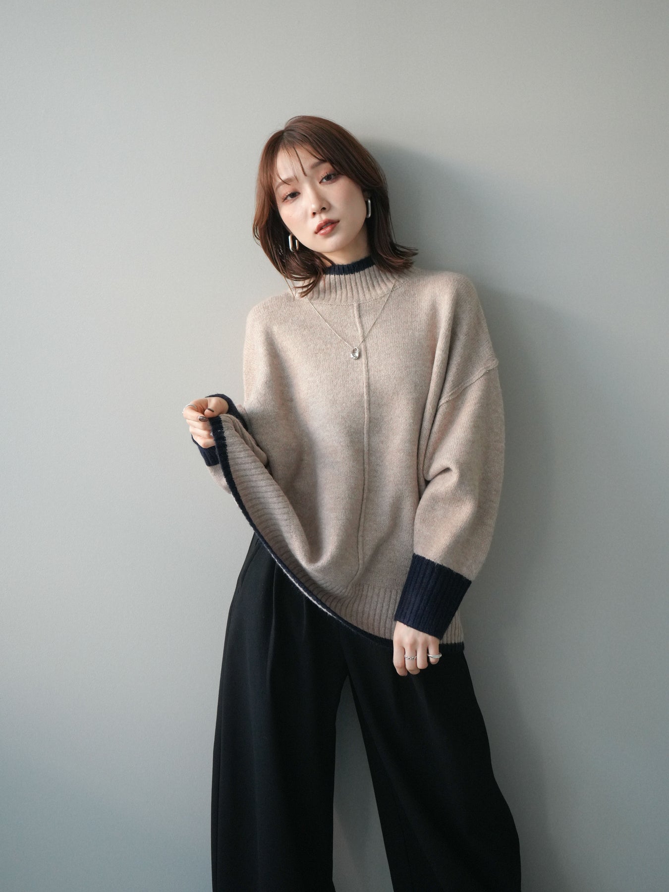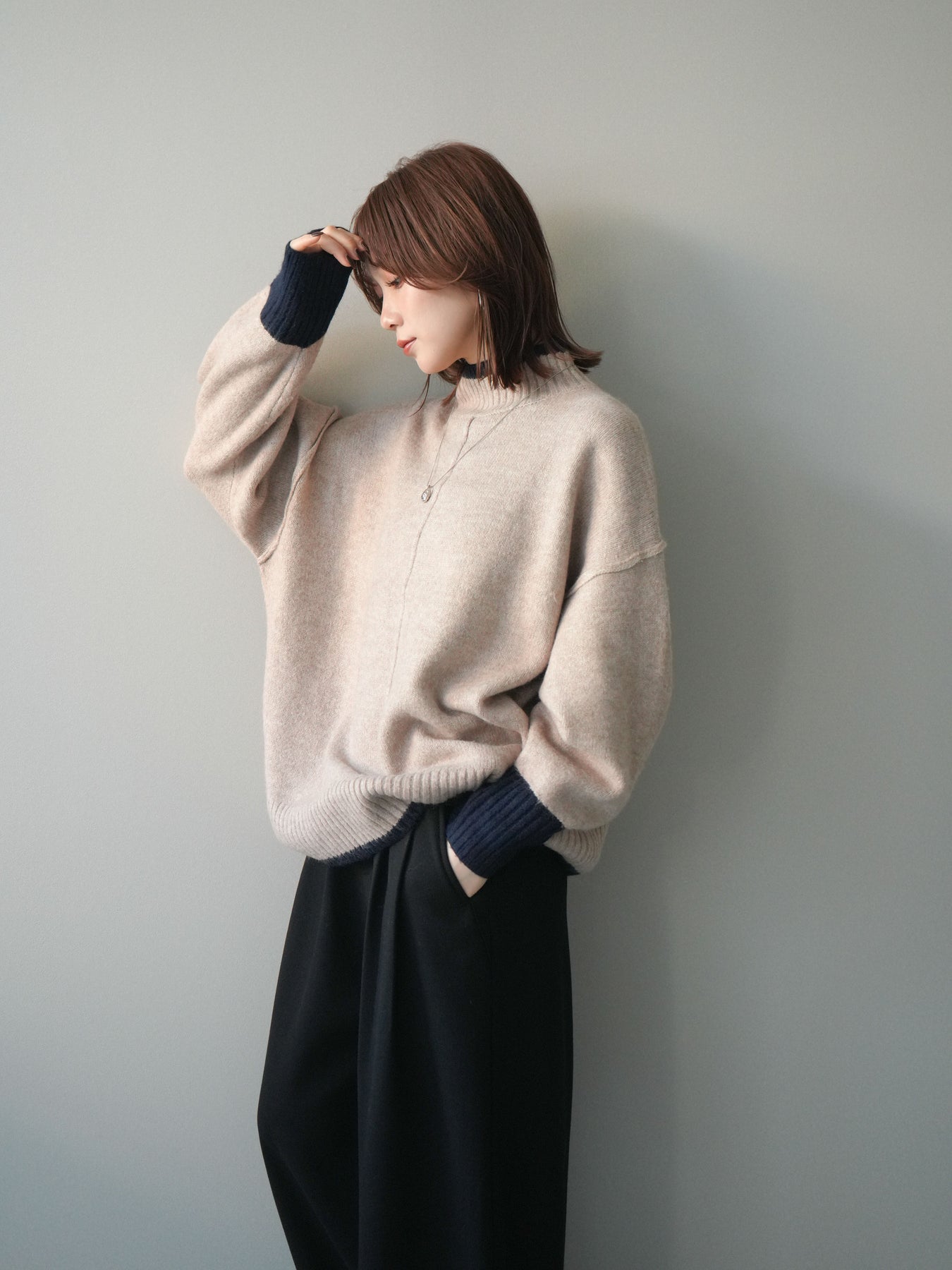[予約]配色ハイネックニットプルオーバー/beigenavy