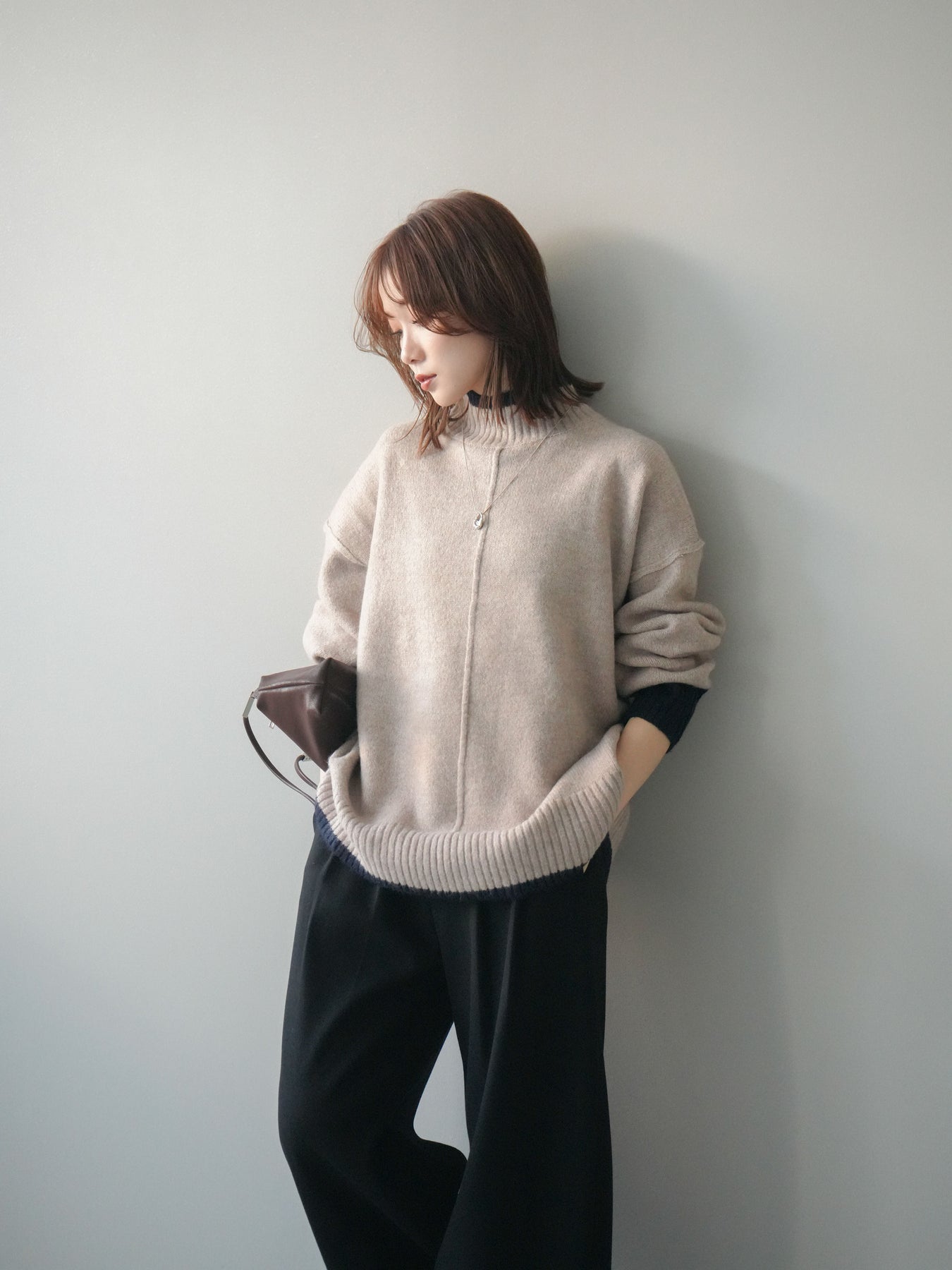 首元と袖口、裾に配したさりげない配色がアクセントになるハイネックニットプルオーバー。柔らかく滑らかな肌触りで、ゆったりとしたシルエットがリラックスした着心地を実現します。フロントの切替えラインが縦の印象を強め、シンプルながらも全体をすっきりと見せてくれるデザインに。デニムやスカートなど幅広いボトムスと合わせやすく、デイリーコーデに取り入れやすい万能な一枚です。 ※ボトムス、キャミソール(インナー)以外の商品は一律でインナーは付属していません。