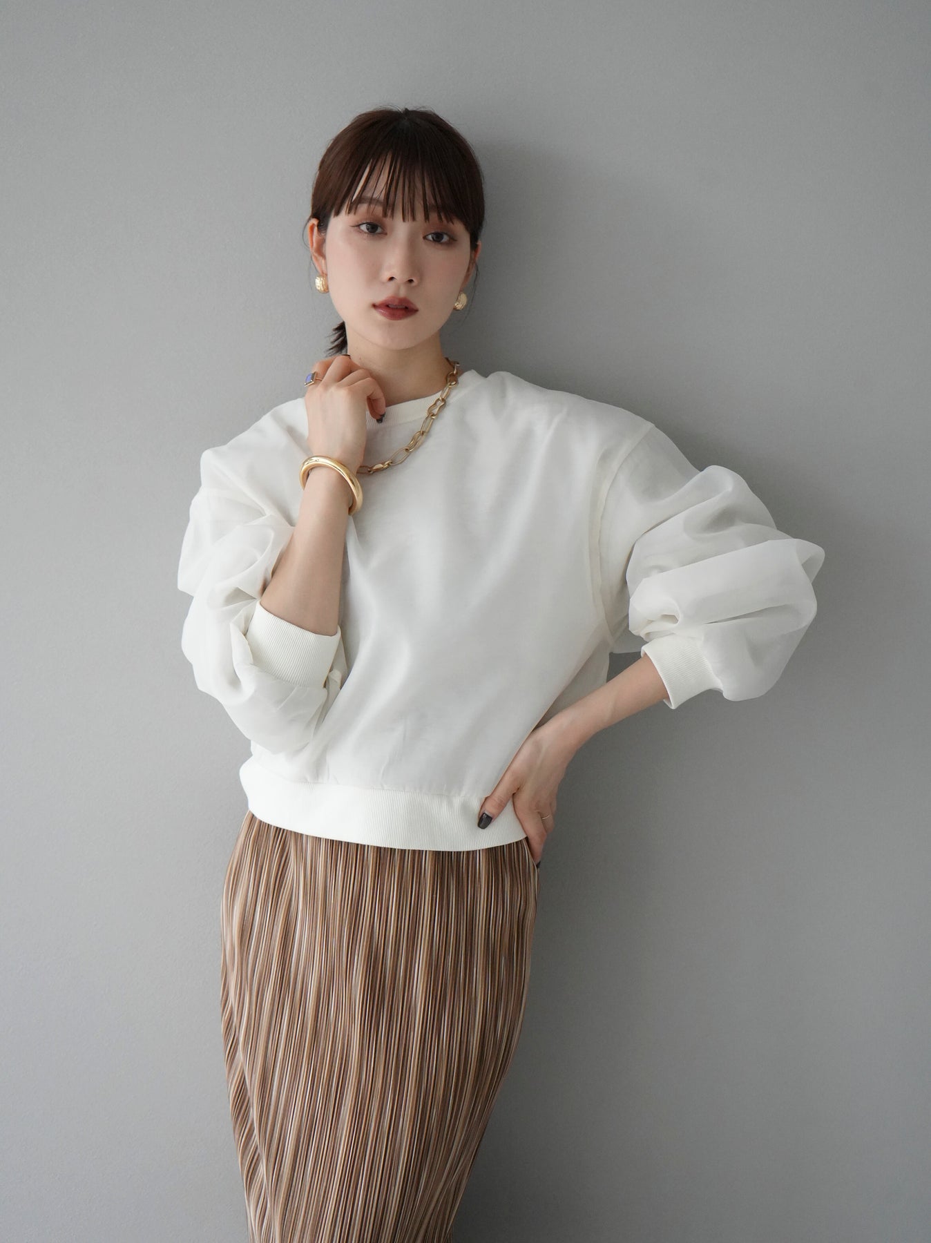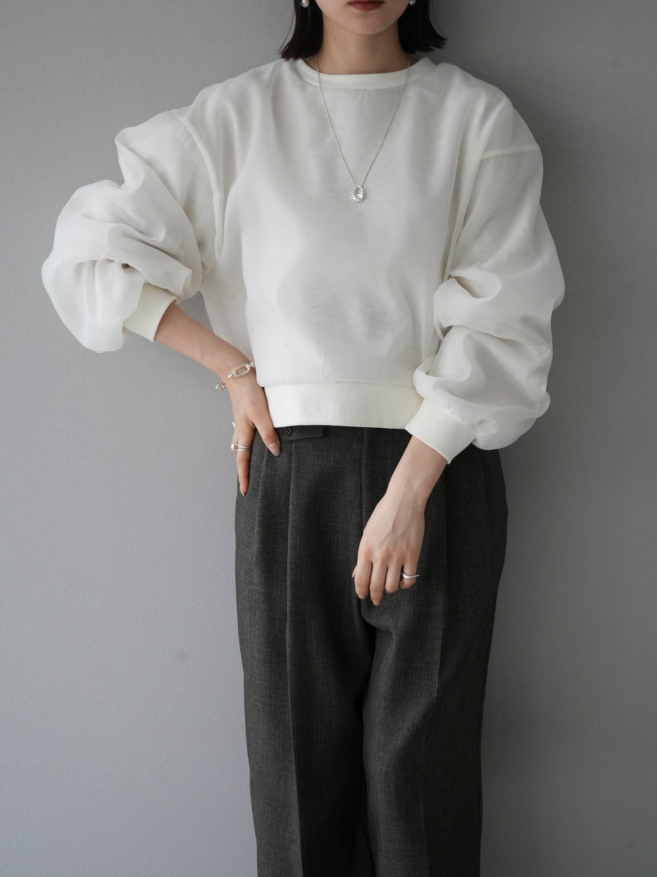 このクロップドプルオーバーは、トレンド感あふれるラメシアー素材を使用し、シンプルながらも個性的なスタイルを演出します。裏毛素材とシアー素材をレイヤードしたデザインが、洗練された雰囲気をプラス。クロップド丈で、ハイウエストボトムスとの相性も抜群。デイリーユースはもちろん、特別な日のコーディネートにもおすすめです。 ※ボトムス、キャミソール(インナー)以外の商品は一律でインナーは付属していません。