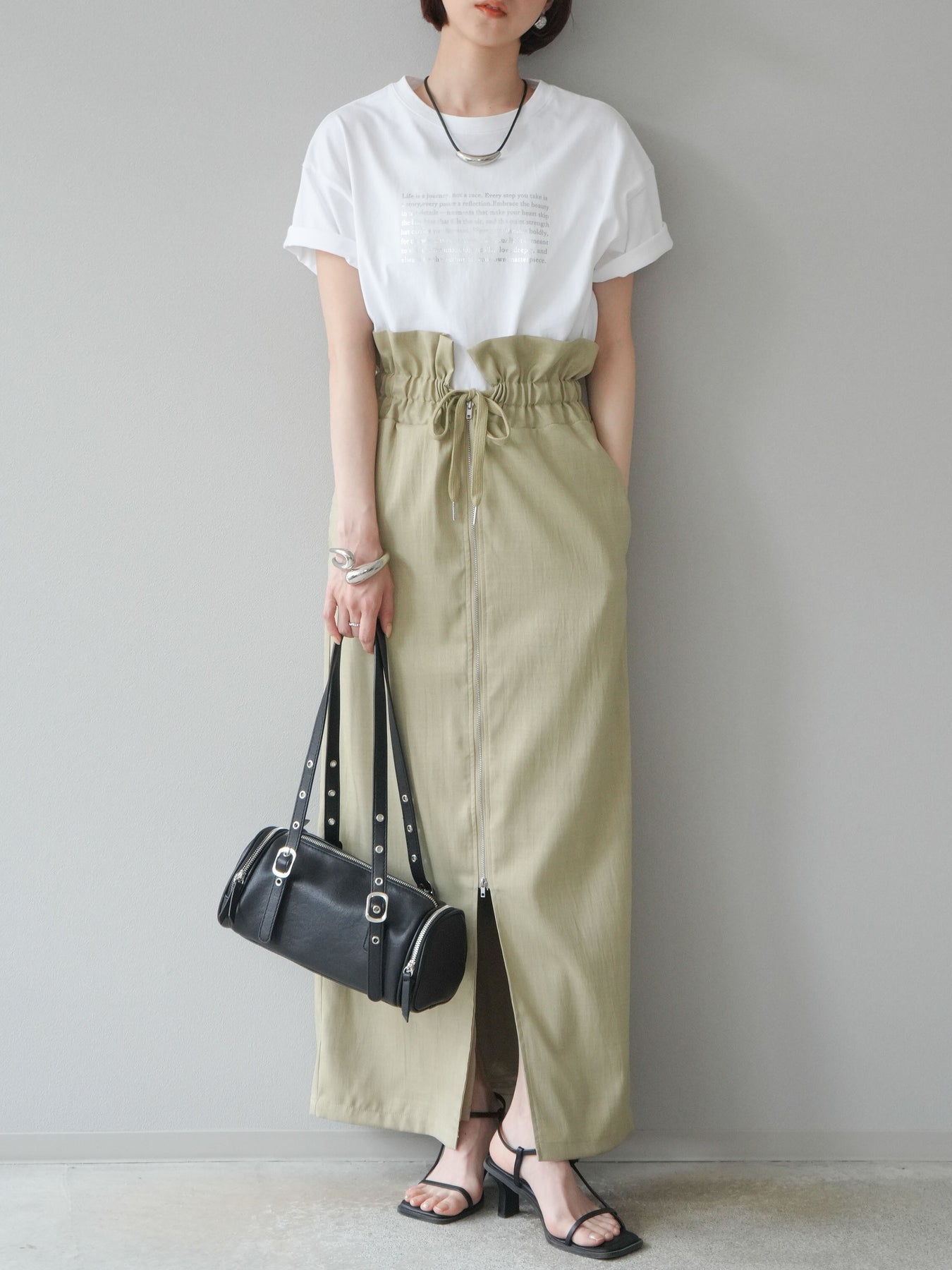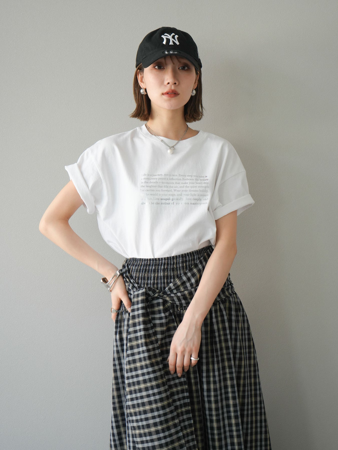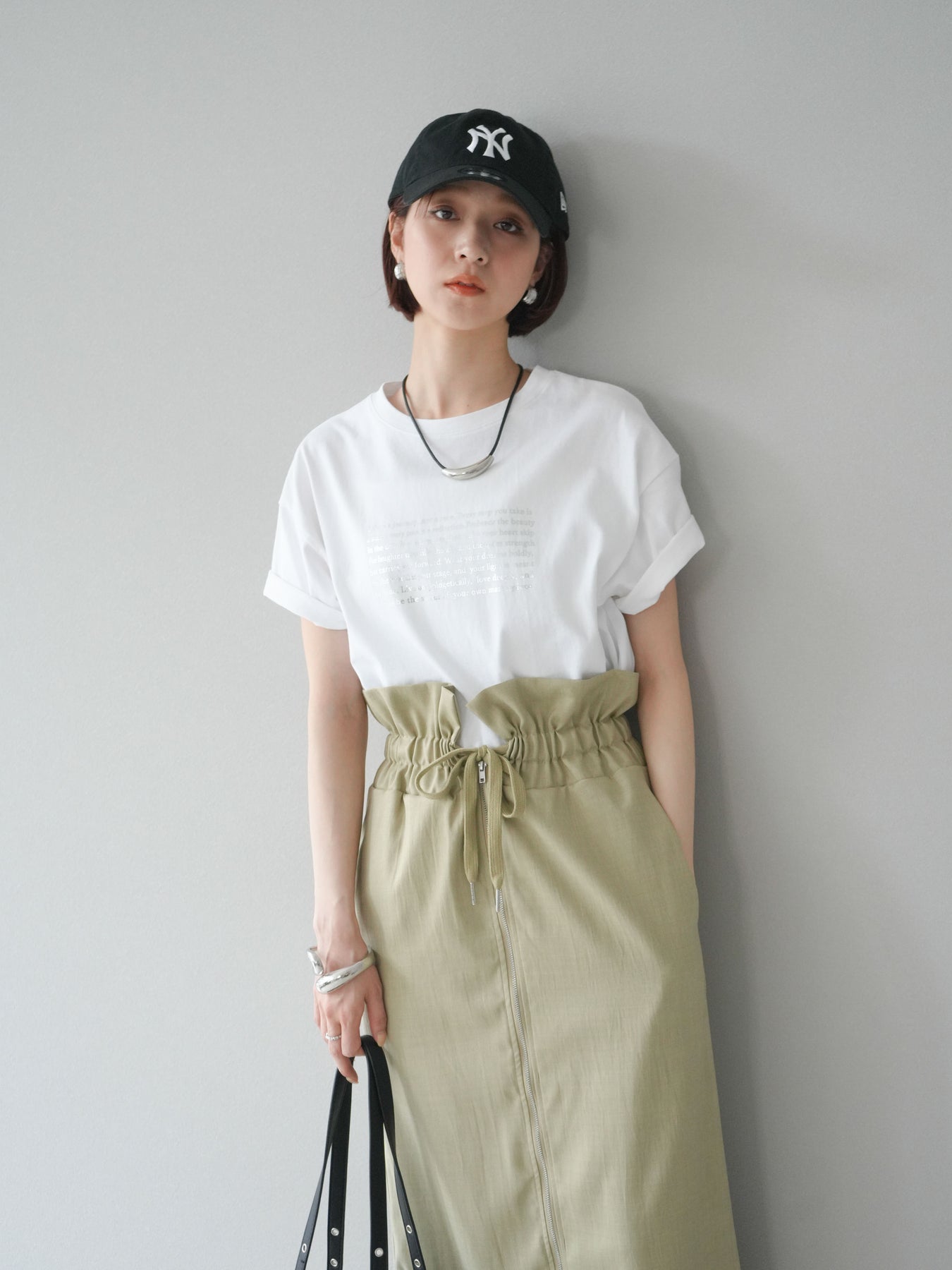 胸元のメッセージロゴにさりげない箔プリントを施した、今季注目のTシャツ。カジュアルながらも上品なツヤ感があり、スタイリングのアクセントにぴったりです。ロールアップされた袖やゆったりとしたシルエットが、抜け感のある着こなしを演出。パンツにもスカートにも合わせやすく、着回し力の高い1枚です。 ※ボトムス、キャミソール(インナー)以外の商品は一律でインナーは付属していません