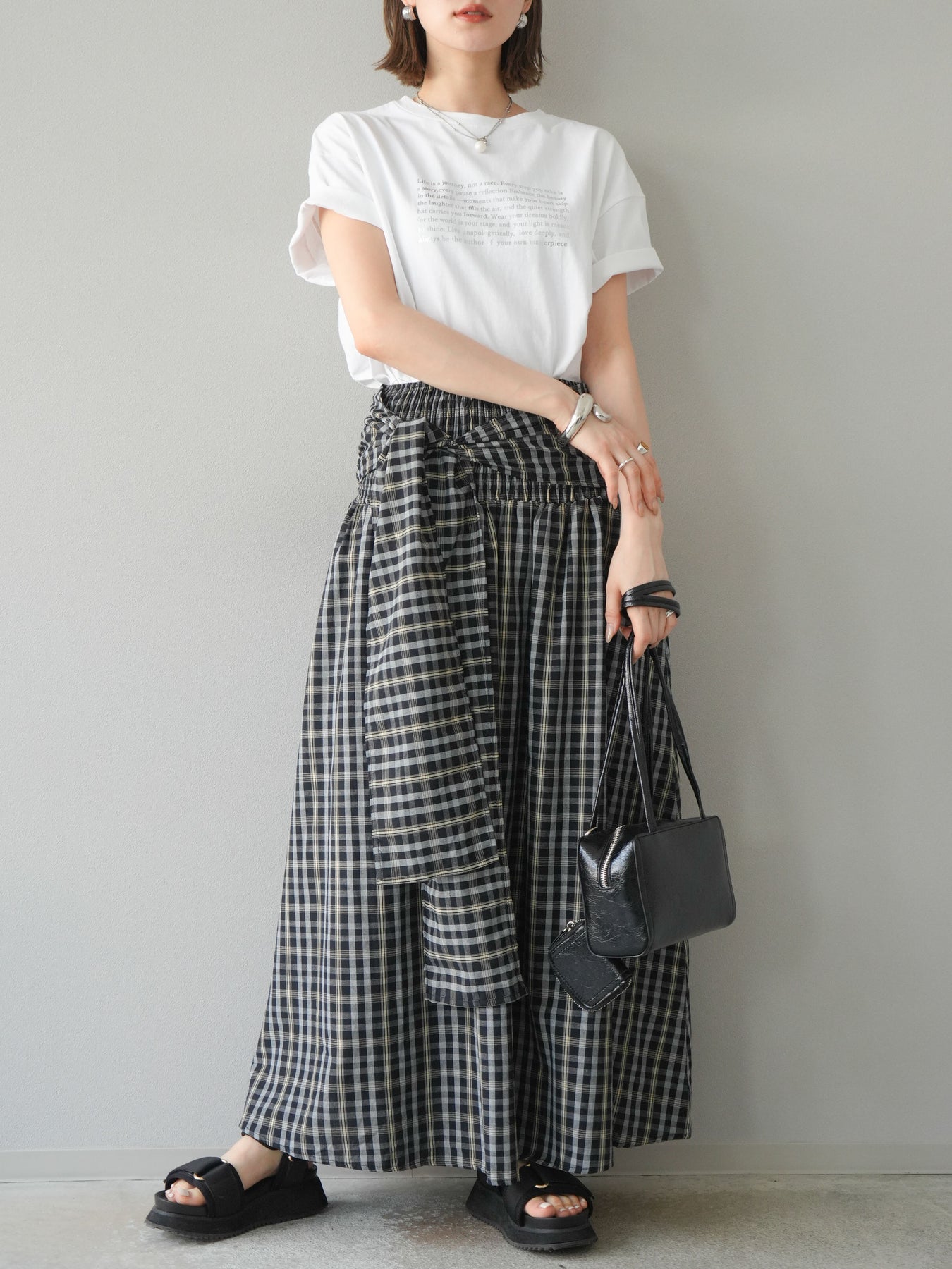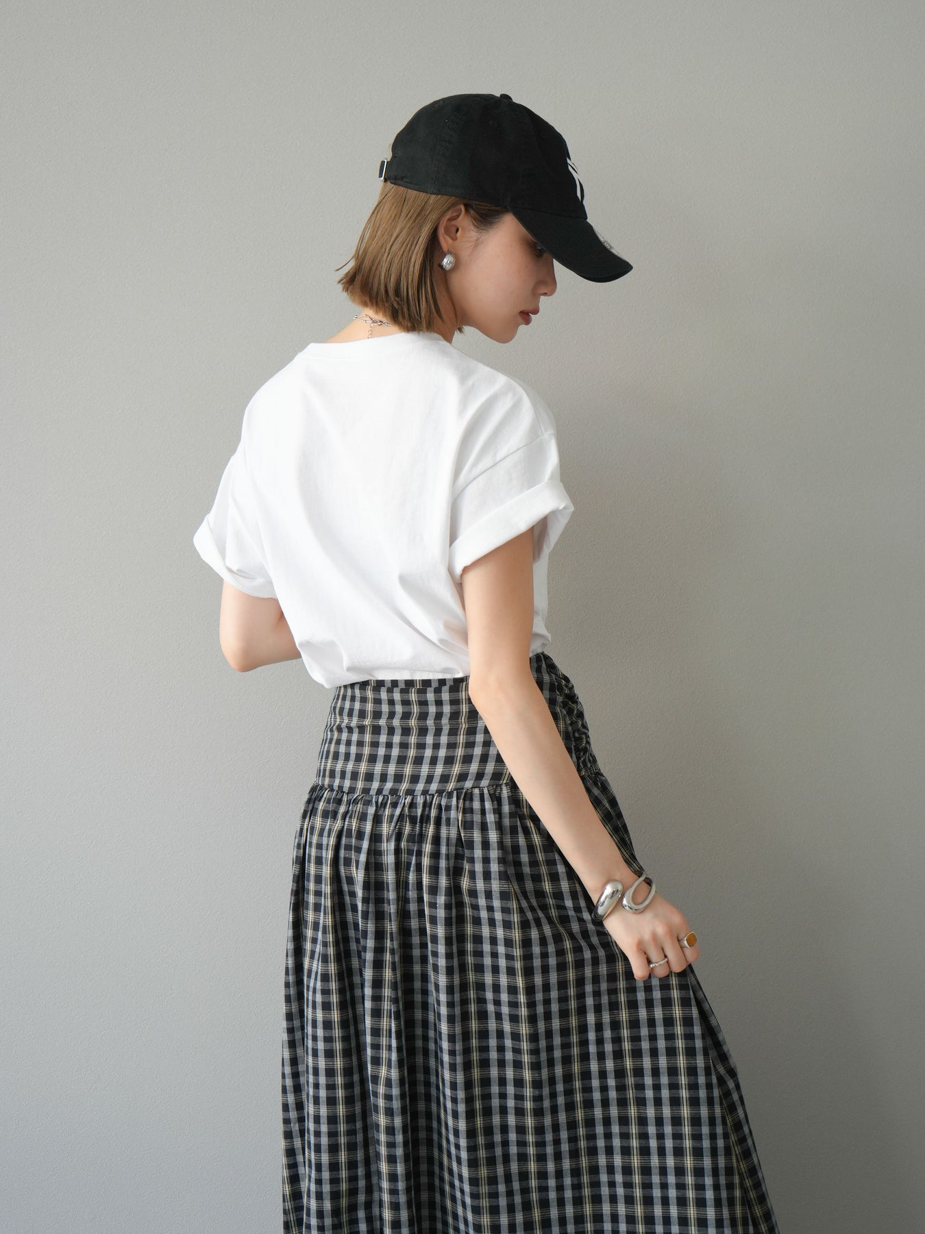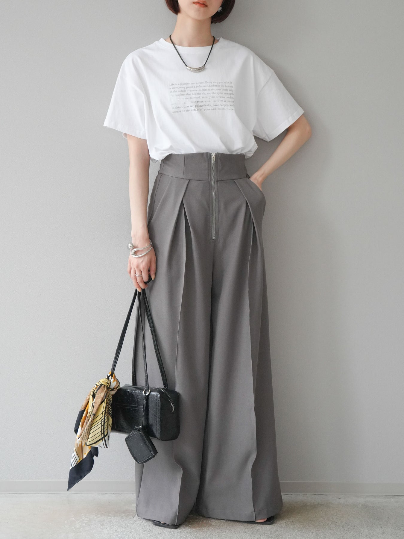 胸元のメッセージロゴにさりげない箔プリントを施した、今季注目のTシャツ。カジュアルながらも上品なツヤ感があり、スタイリングのアクセントにぴったりです。ロールアップされた袖やゆったりとしたシルエットが、抜け感のある着こなしを演出。パンツにもスカートにも合わせやすく、着回し力の高い1枚です。 ※ボトムス、キャミソール(インナー)以外の商品は一律でインナーは付属していません
