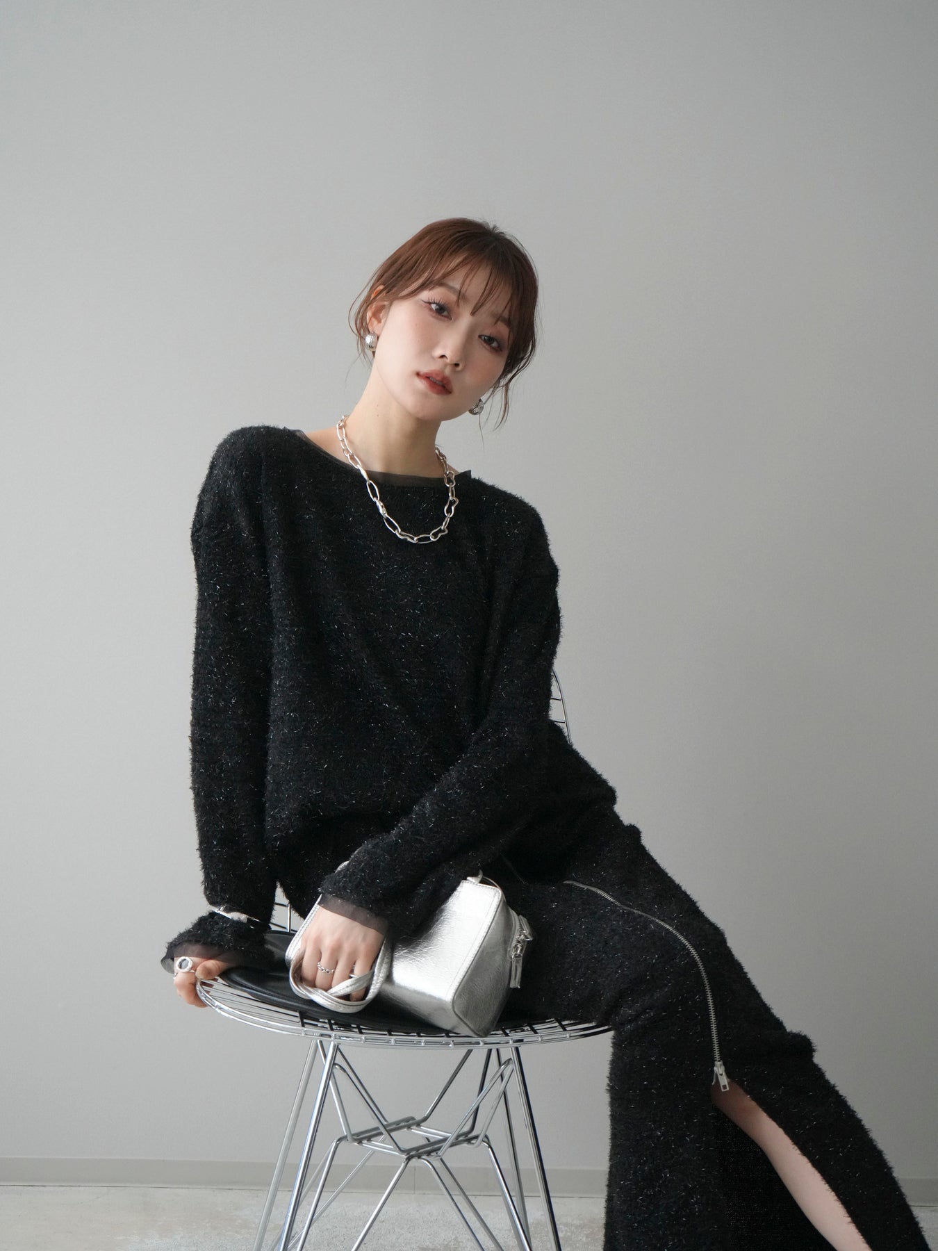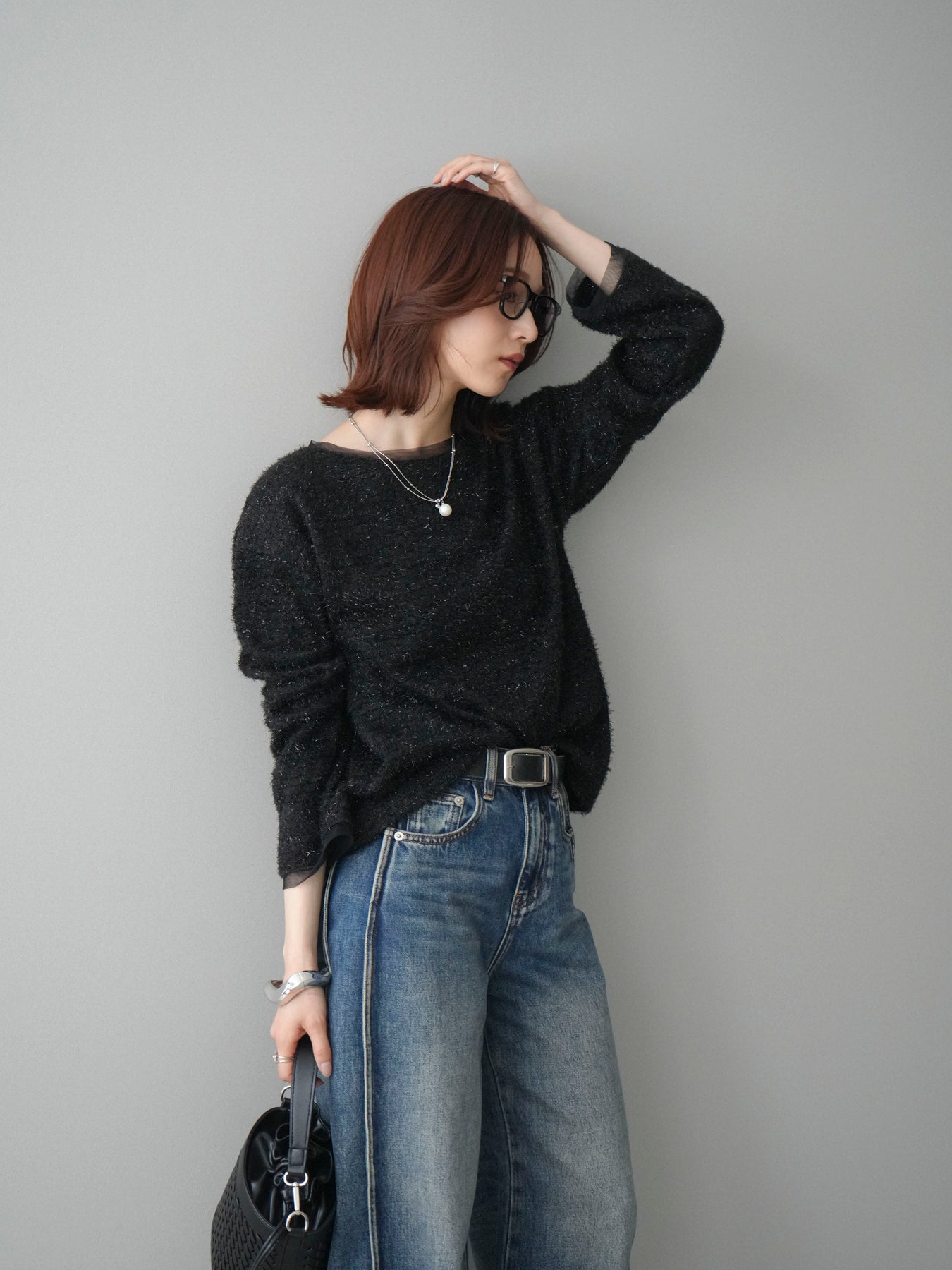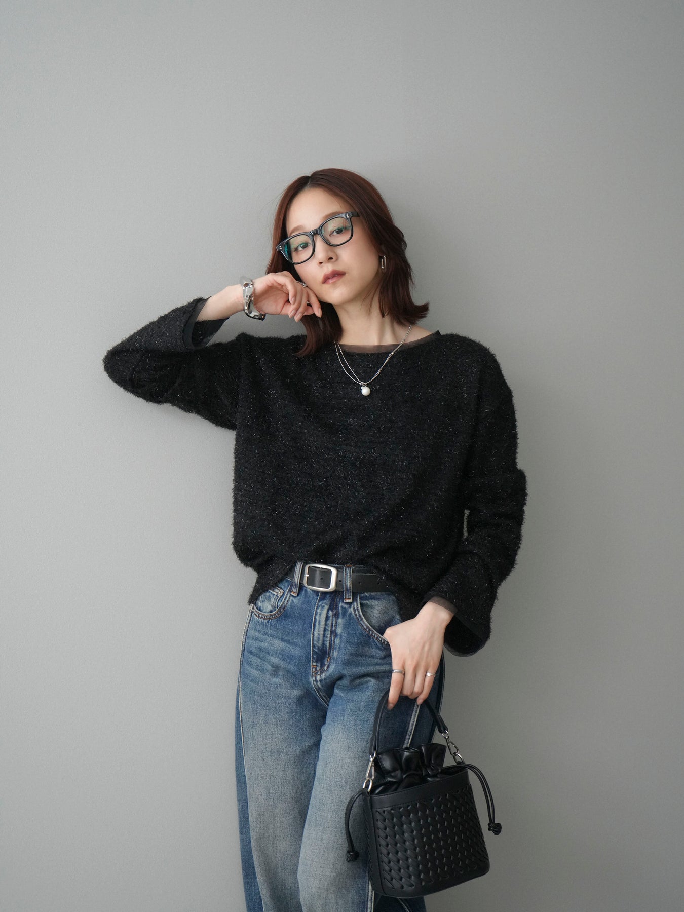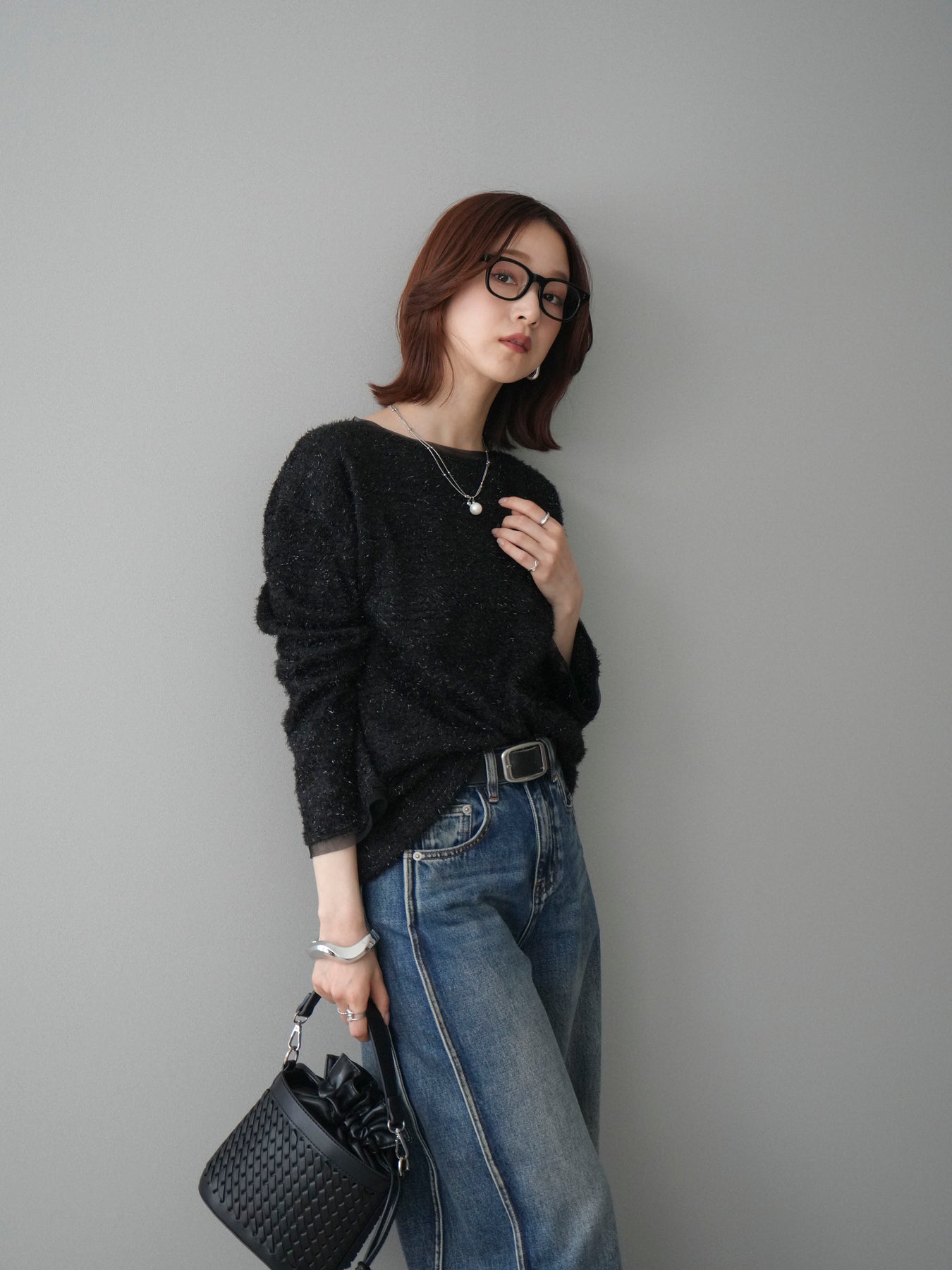 繊細なラメ糸を織り込んだシャギー素材が、さりげない華やかさを演出するトップス。 毛足のある表情豊かな素材感が、シンプルながらもコーディネートの主役になります。 ほどよくゆとりのあるシルエットで、身体のラインを拾いにくくリラックスした着心地。 インナーにチュールやカットソーを重ねてもごわつきにくく、レイヤードスタイルも楽しめます。 一枚で着映えするのはもちろん、ジャケットやコートのインナーとしても存在感を発揮。 デニムやスラックス、スカートまで幅広く合わせやすく、秋冬のスタイリングに奥行きをプラスしてくれるアイテムです。