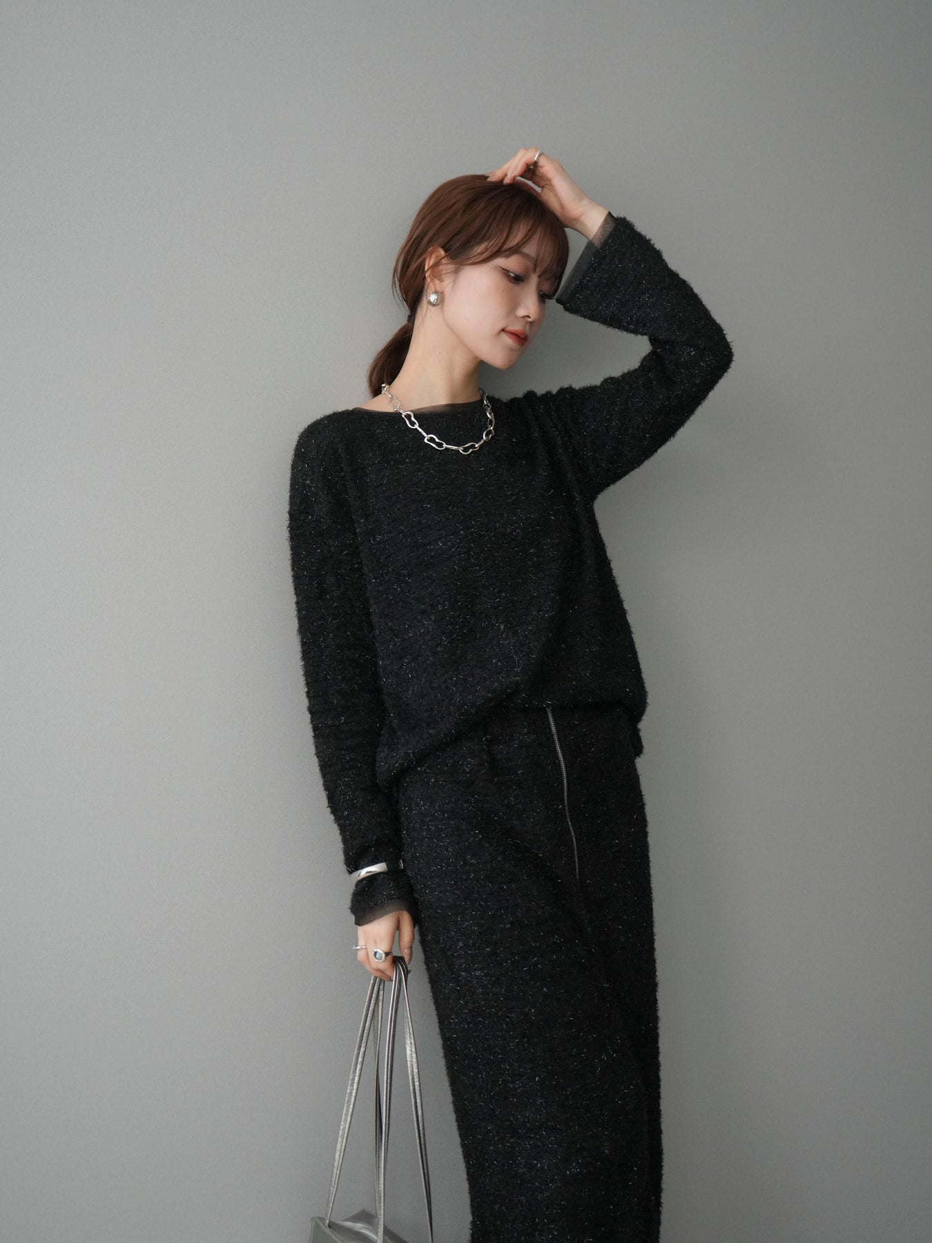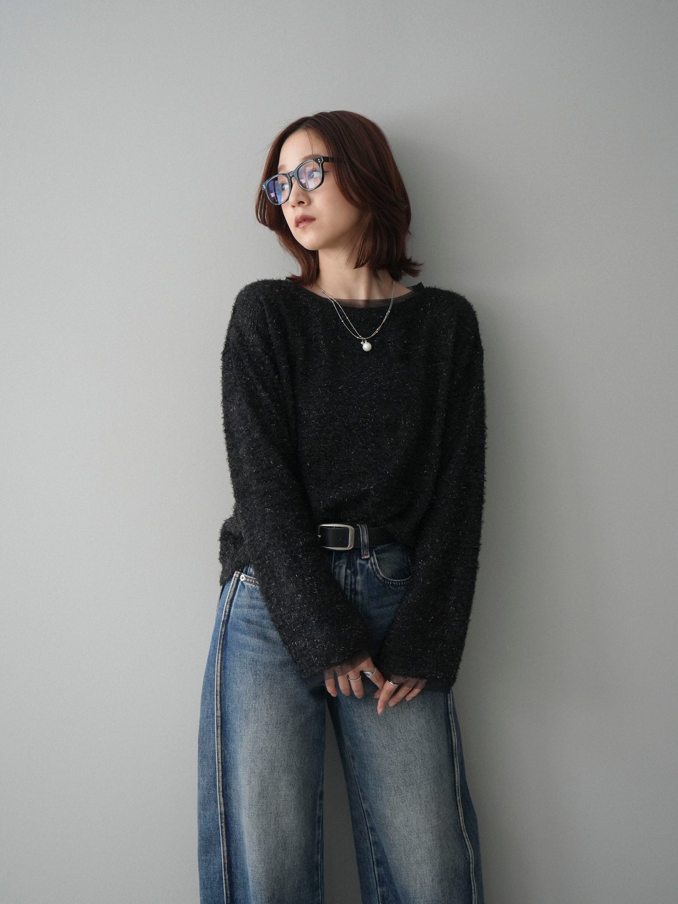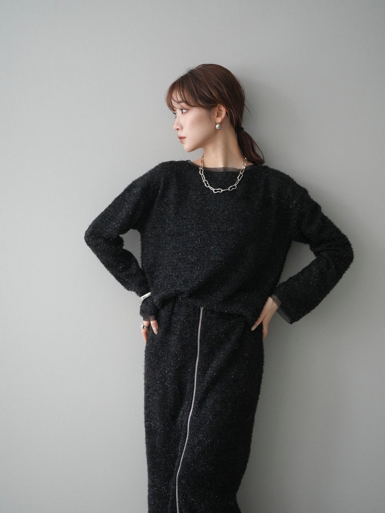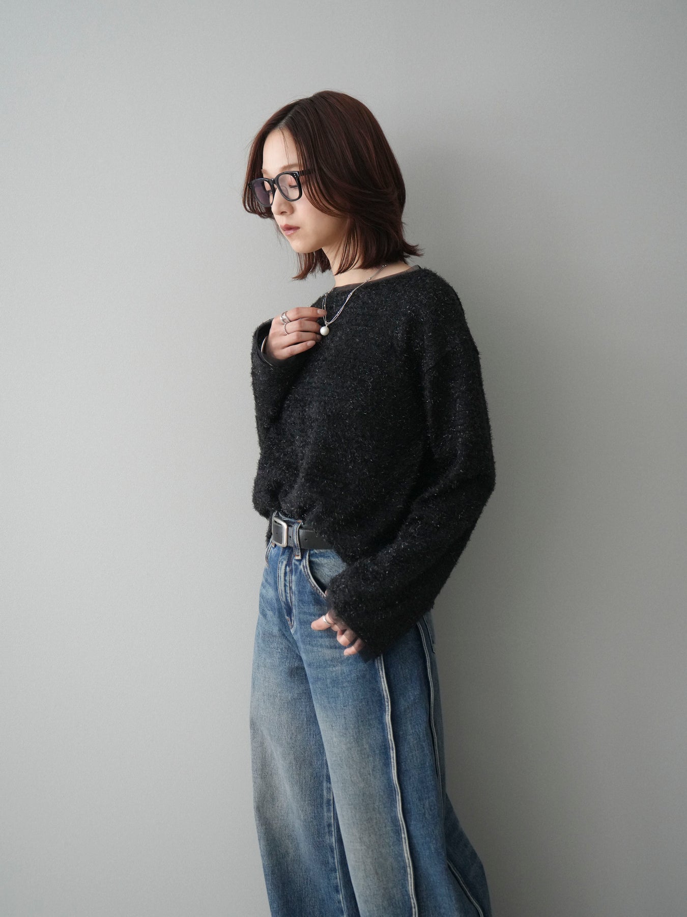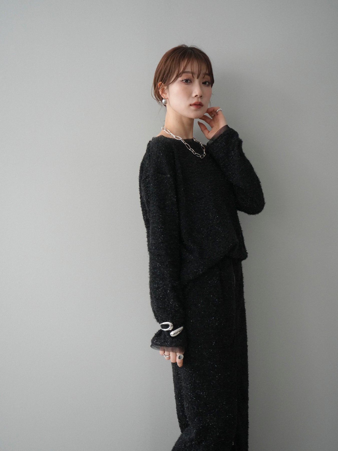繊細なラメ糸を織り込んだシャギー素材が、さりげない華やかさを演出するトップス。 毛足のある表情豊かな素材感が、シンプルながらもコーディネートの主役になります。 ほどよくゆとりのあるシルエットで、身体のラインを拾いにくくリラックスした着心地。 インナーにチュールやカットソーを重ねてもごわつきにくく、レイヤードスタイルも楽しめます。 一枚で着映えするのはもちろん、ジャケットやコートのインナーとしても存在感を発揮。 デニムやスラックス、スカートまで幅広く合わせやすく、秋冬のスタイリングに奥行きをプラスしてくれるアイテムです。