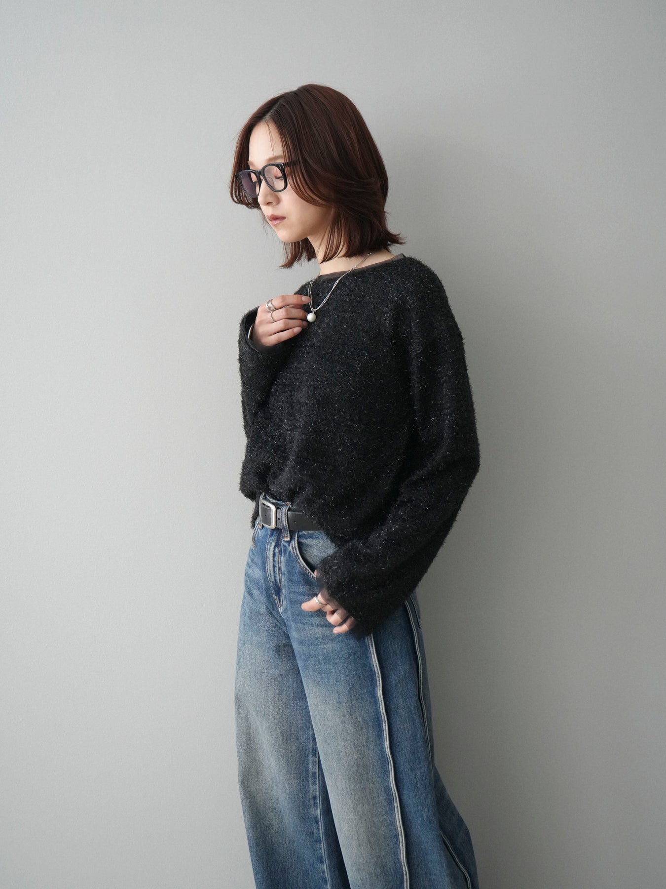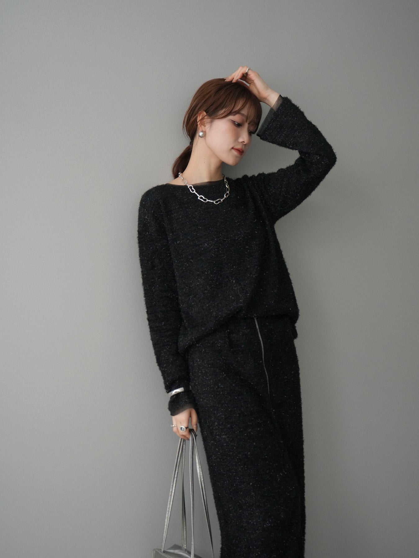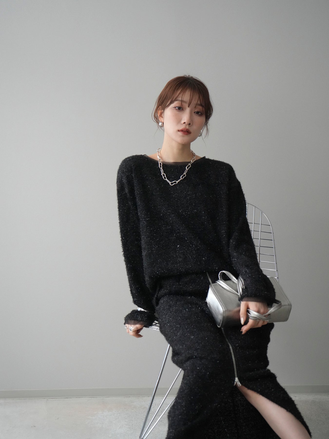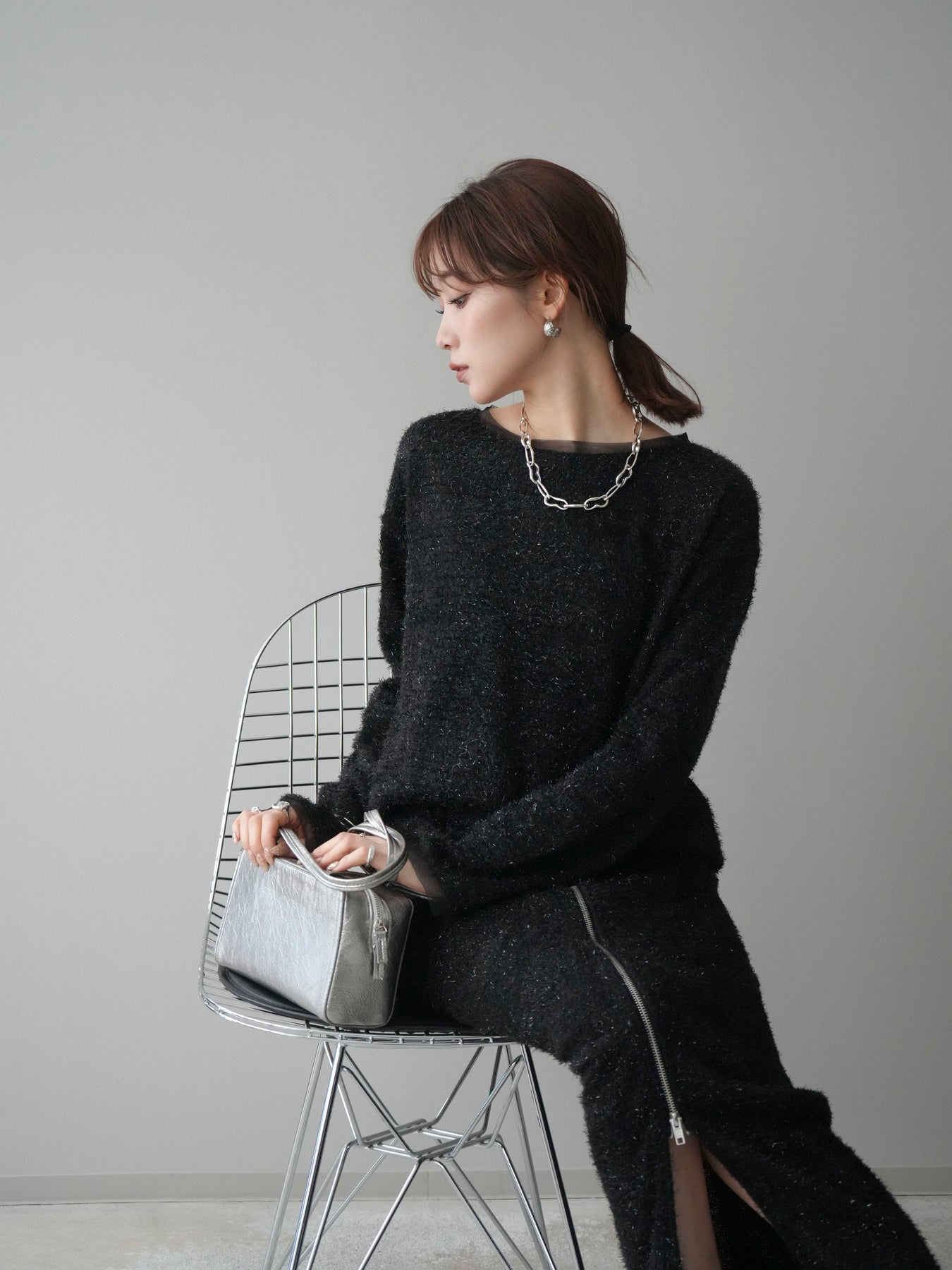 繊細なラメ糸を織り込んだシャギー素材が、さりげない華やかさを演出するトップス。 毛足のある表情豊かな素材感が、シンプルながらもコーディネートの主役になります。 ほどよくゆとりのあるシルエットで、身体のラインを拾いにくくリラックスした着心地。 インナーにチュールやカットソーを重ねてもごわつきにくく、レイヤードスタイルも楽しめます。 一枚で着映えするのはもちろん、ジャケットやコートのインナーとしても存在感を発揮。 デニムやスラックス、スカートまで幅広く合わせやすく、秋冬のスタイリングに奥行きをプラスしてくれるアイテムです。