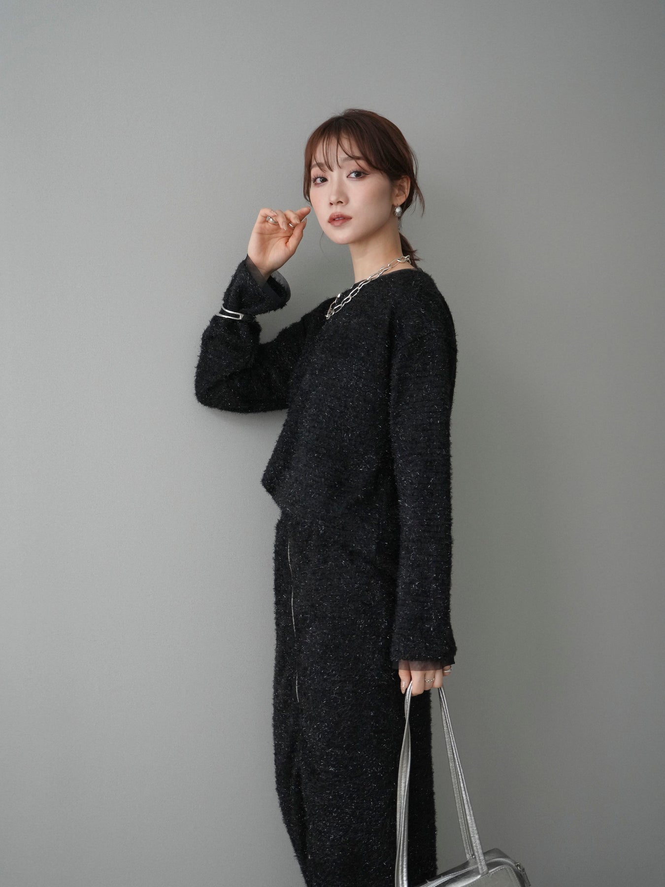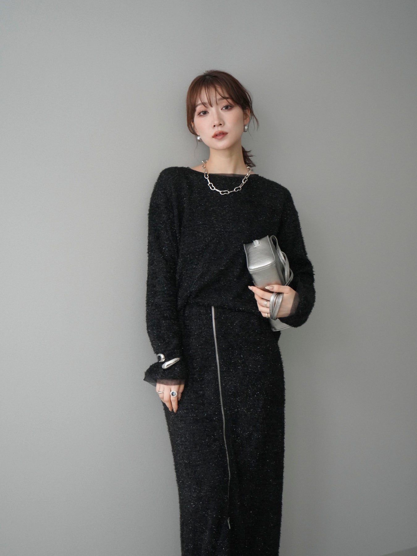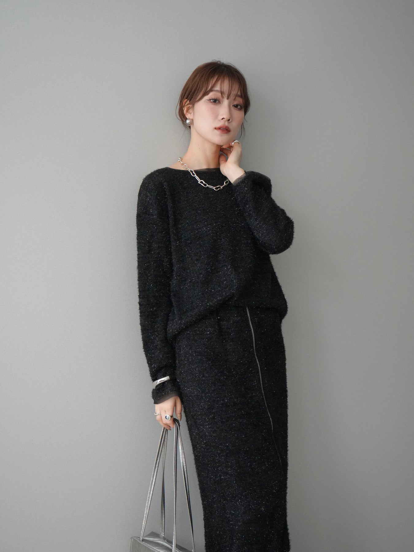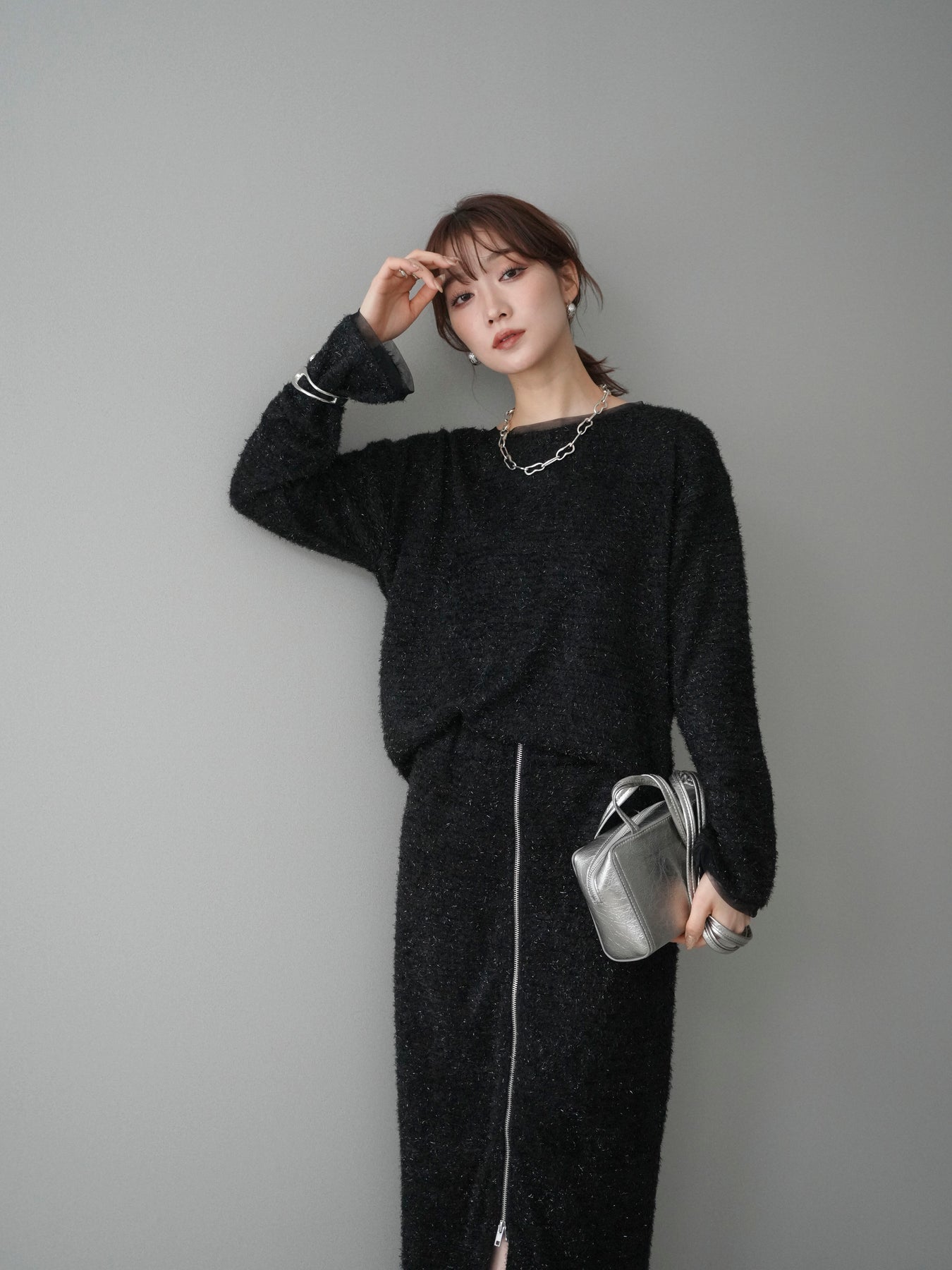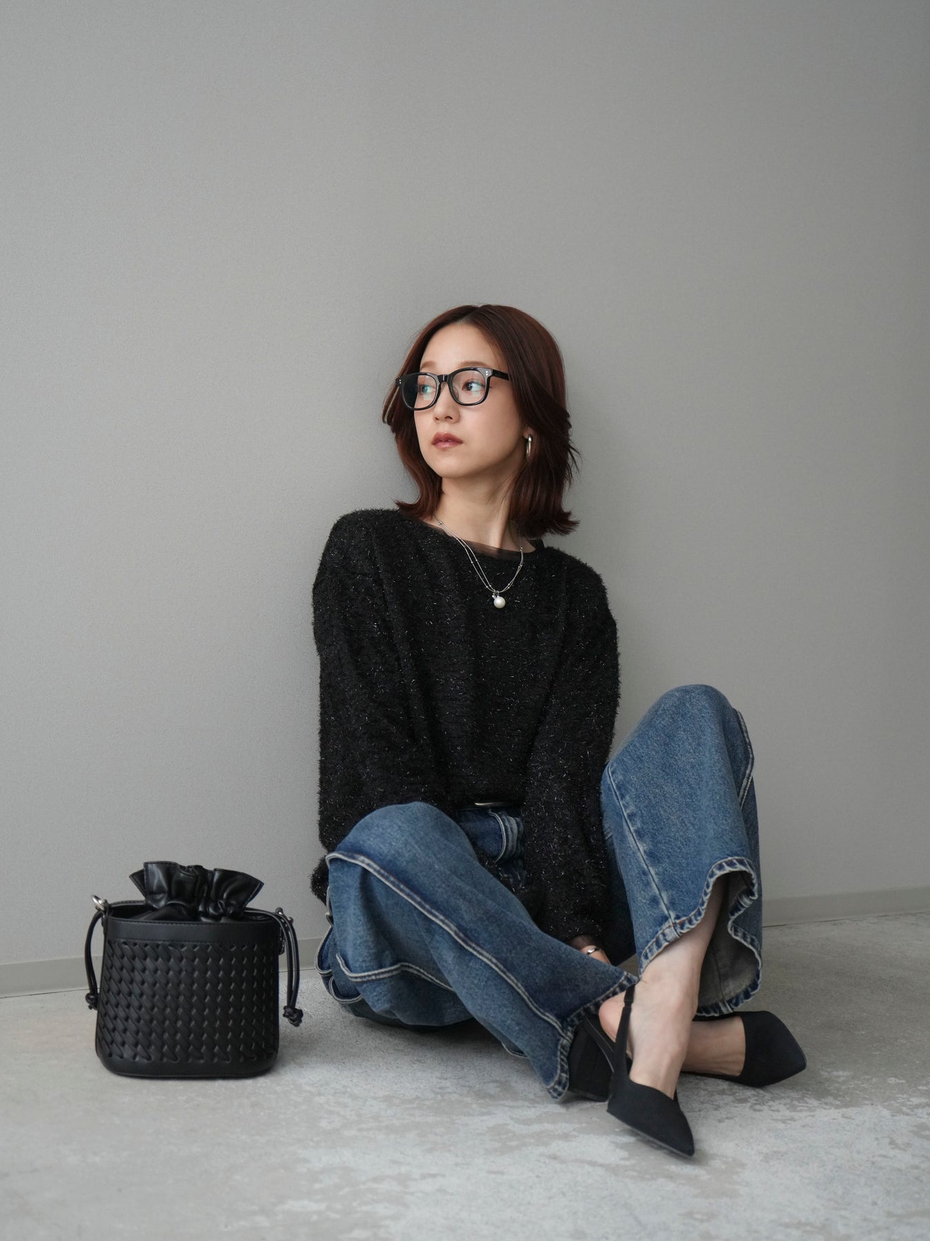 繊細なラメ糸を織り込んだシャギー素材が、さりげない華やかさを演出するトップス。 毛足のある表情豊かな素材感が、シンプルながらもコーディネートの主役になります。 ほどよくゆとりのあるシルエットで、身体のラインを拾いにくくリラックスした着心地。 インナーにチュールやカットソーを重ねてもごわつきにくく、レイヤードスタイルも楽しめます。 一枚で着映えするのはもちろん、ジャケットやコートのインナーとしても存在感を発揮。 デニムやスラックス、スカートまで幅広く合わせやすく、秋冬のスタイリングに奥行きをプラスしてくれるアイテムです。
