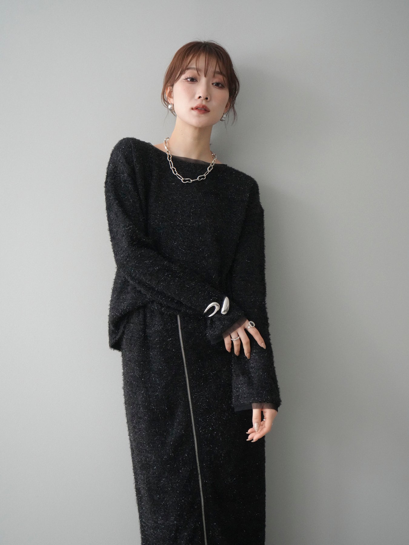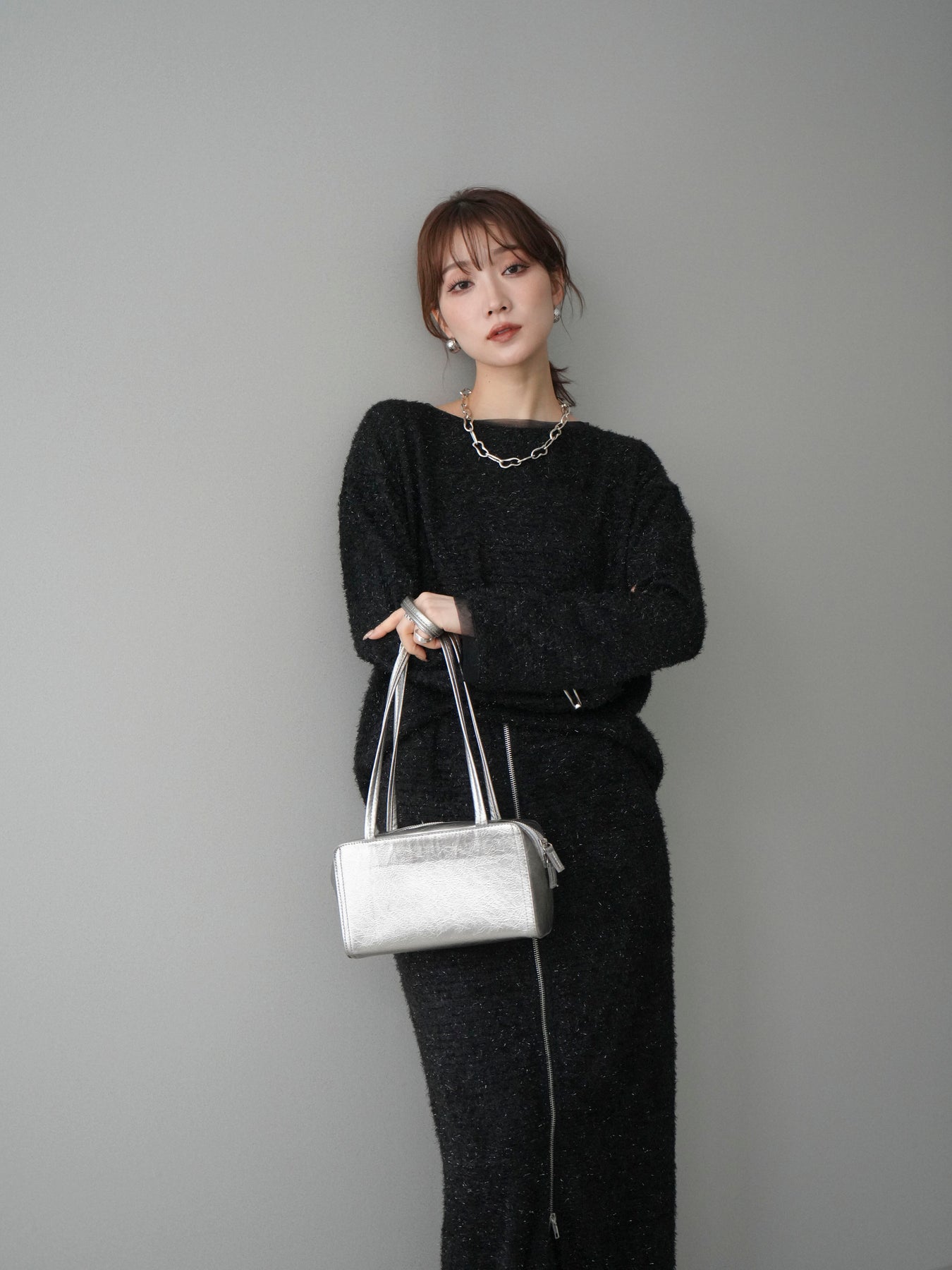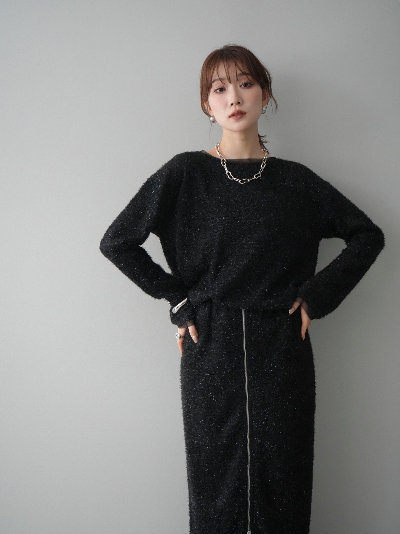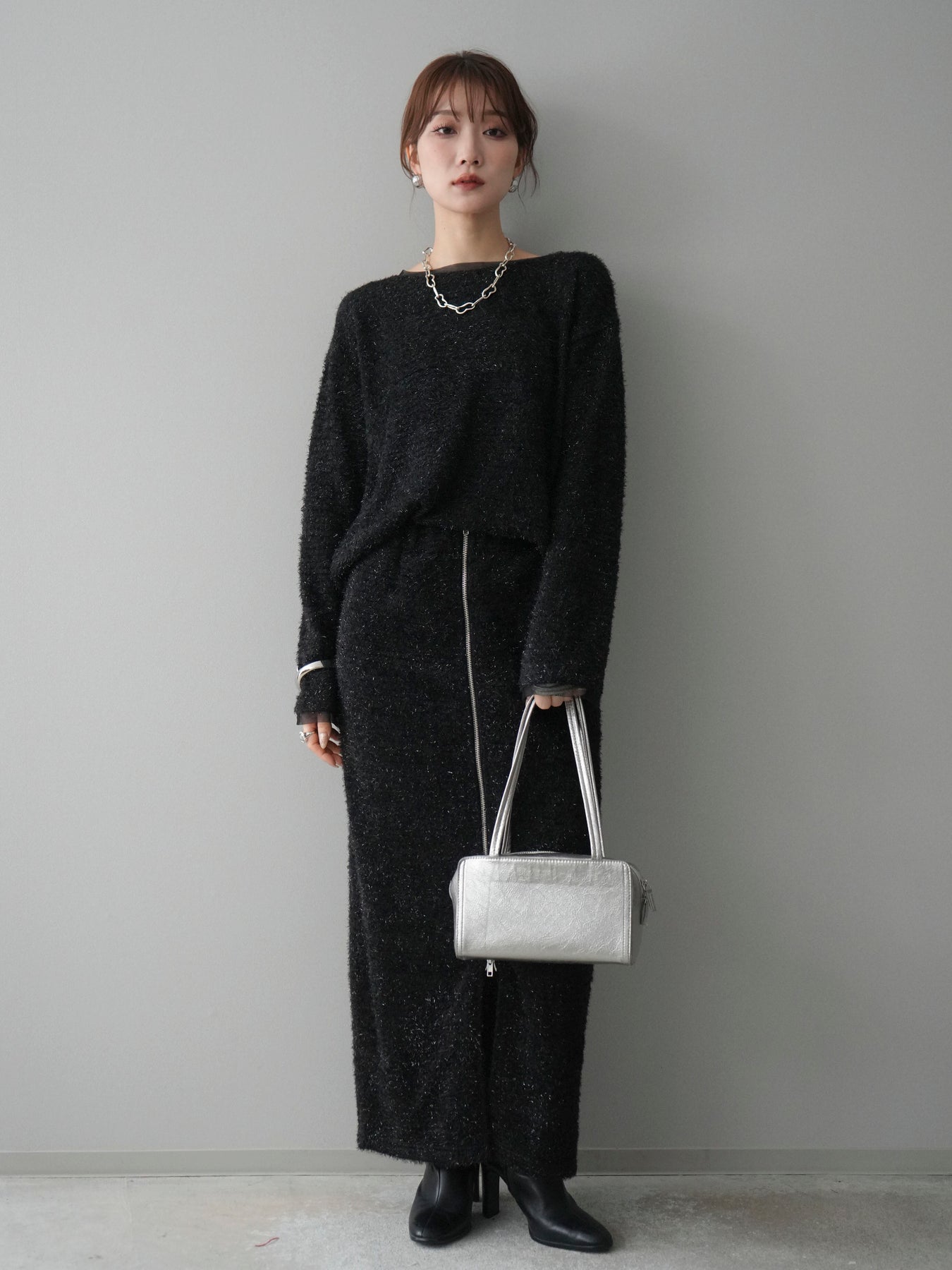 繊細なラメ糸を織り込んだシャギー素材が、さりげない華やかさを演出するトップス。 毛足のある表情豊かな素材感が、シンプルながらもコーディネートの主役になります。 ほどよくゆとりのあるシルエットで、身体のラインを拾いにくくリラックスした着心地。 インナーにチュールやカットソーを重ねてもごわつきにくく、レイヤードスタイルも楽しめます。 一枚で着映えするのはもちろん、ジャケットやコートのインナーとしても存在感を発揮。 デニムやスラックス、スカートまで幅広く合わせやすく、秋冬のスタイリングに奥行きをプラスしてくれるアイテムです。