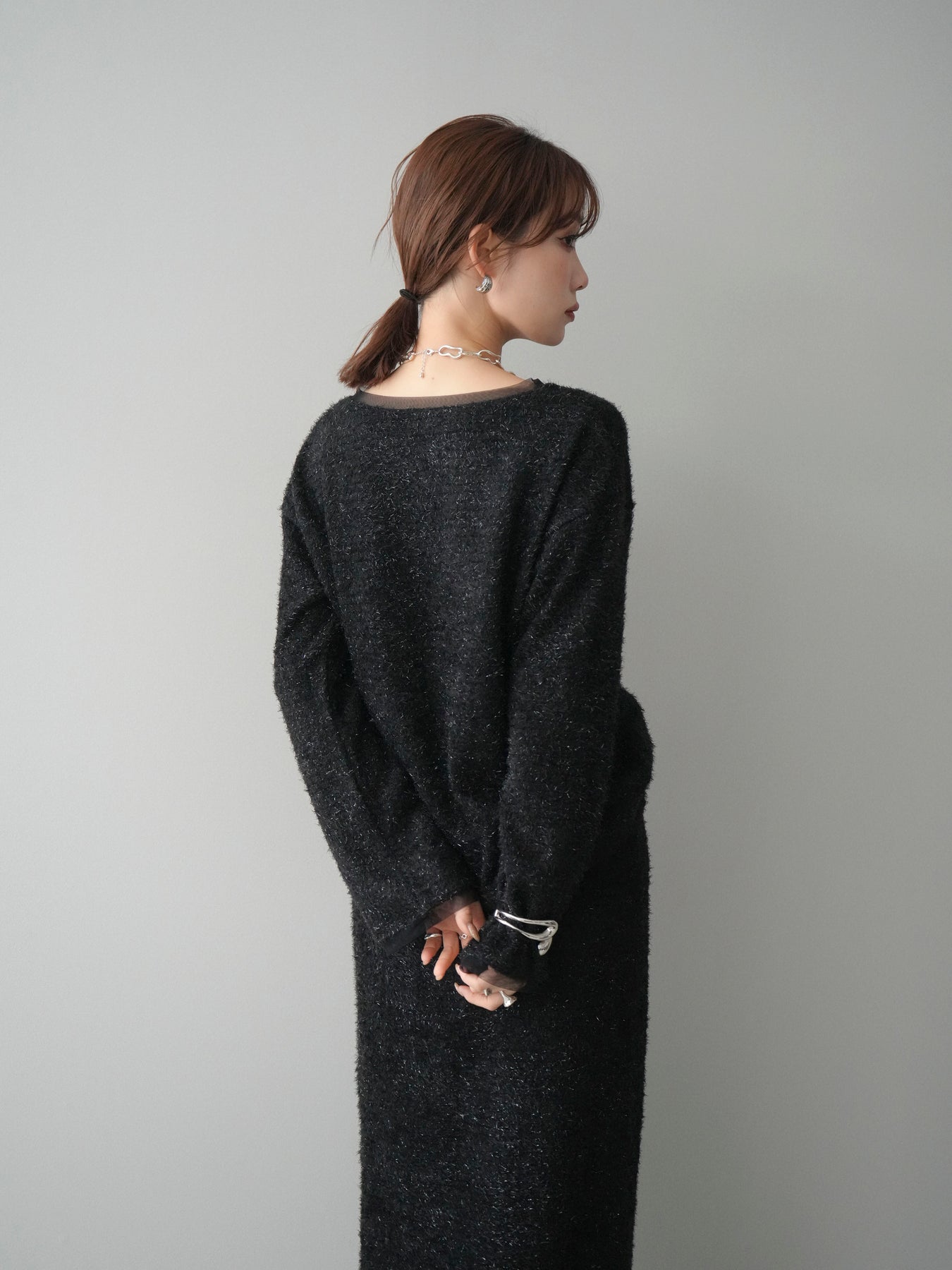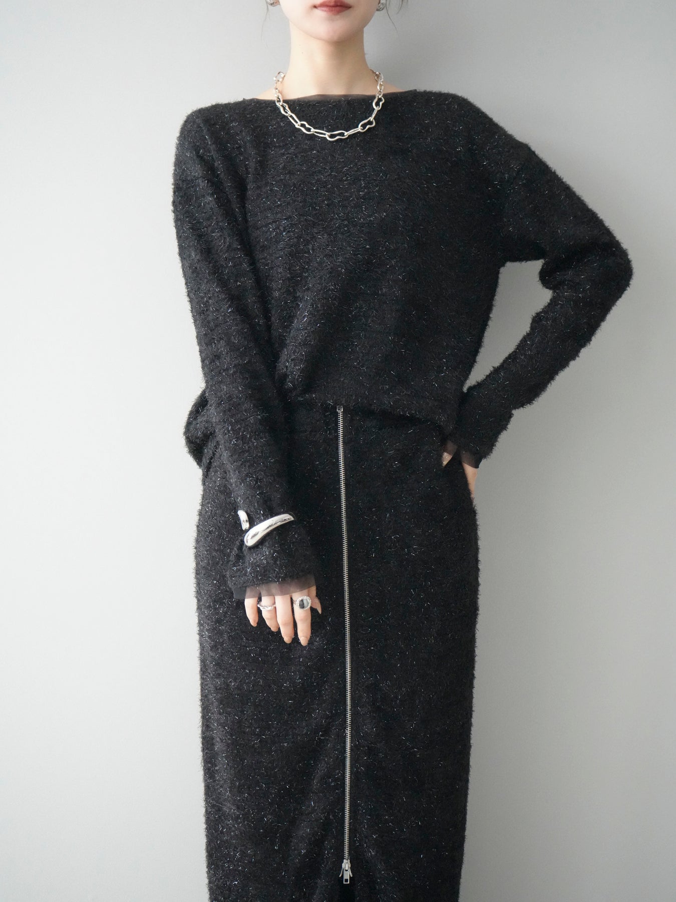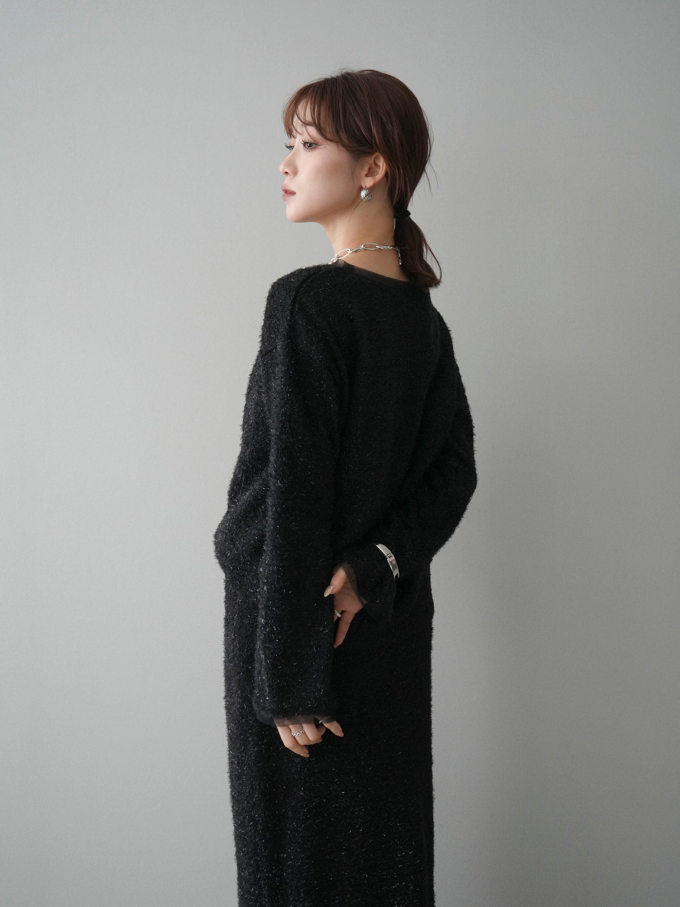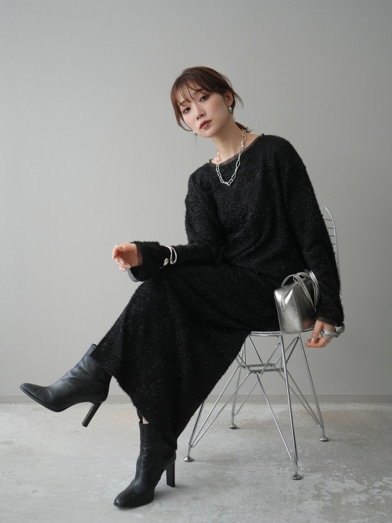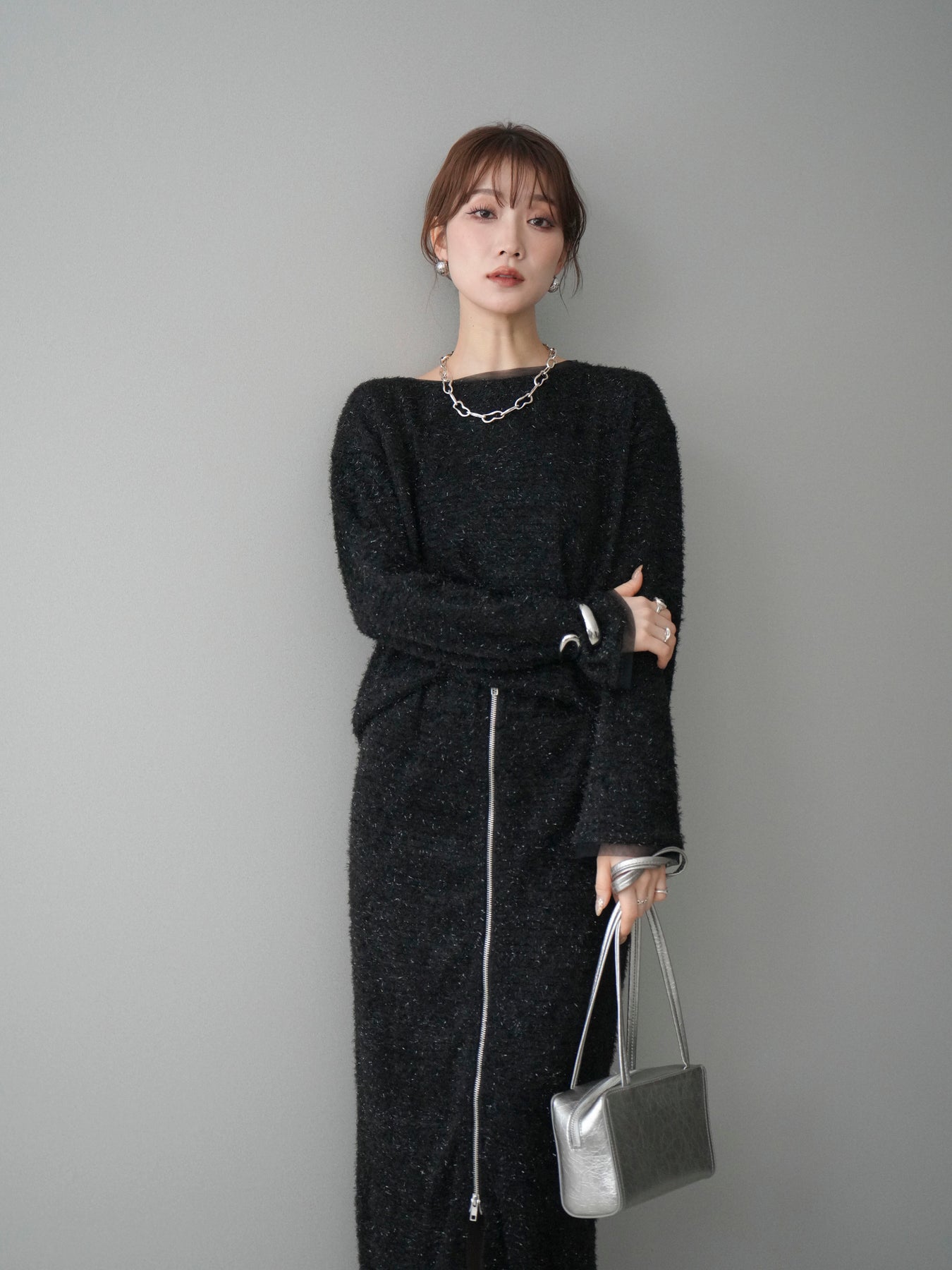 繊細なラメ糸を織り込んだシャギー素材が、さりげない華やかさを演出するトップス。 毛足のある表情豊かな素材感が、シンプルながらもコーディネートの主役になります。 ほどよくゆとりのあるシルエットで、身体のラインを拾いにくくリラックスした着心地。 インナーにチュールやカットソーを重ねてもごわつきにくく、レイヤードスタイルも楽しめます。 一枚で着映えするのはもちろん、ジャケットやコートのインナーとしても存在感を発揮。 デニムやスラックス、スカートまで幅広く合わせやすく、秋冬のスタイリングに奥行きをプラスしてくれるアイテムです。