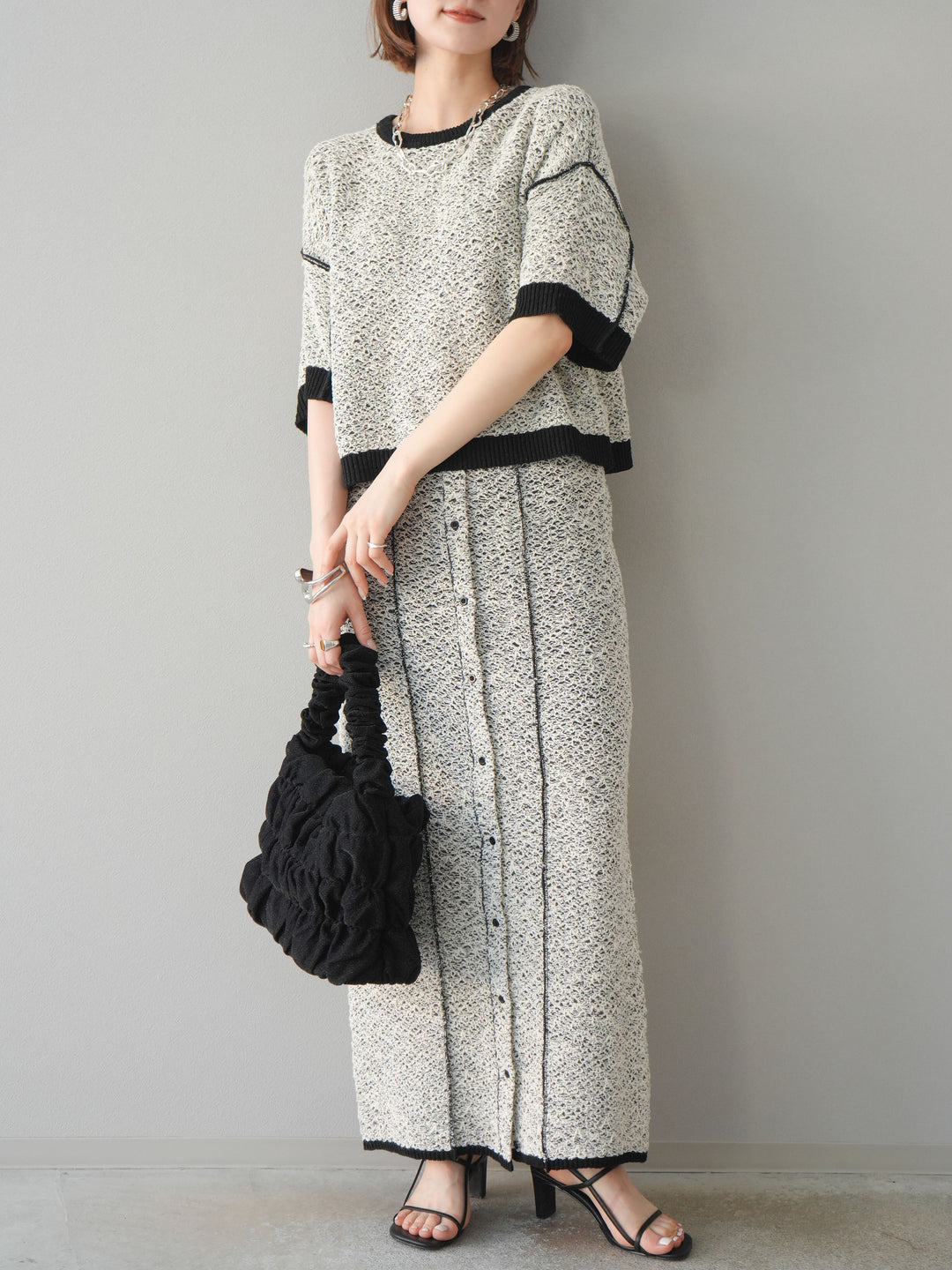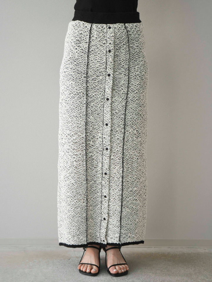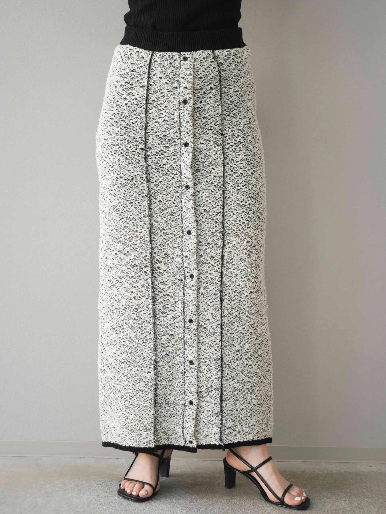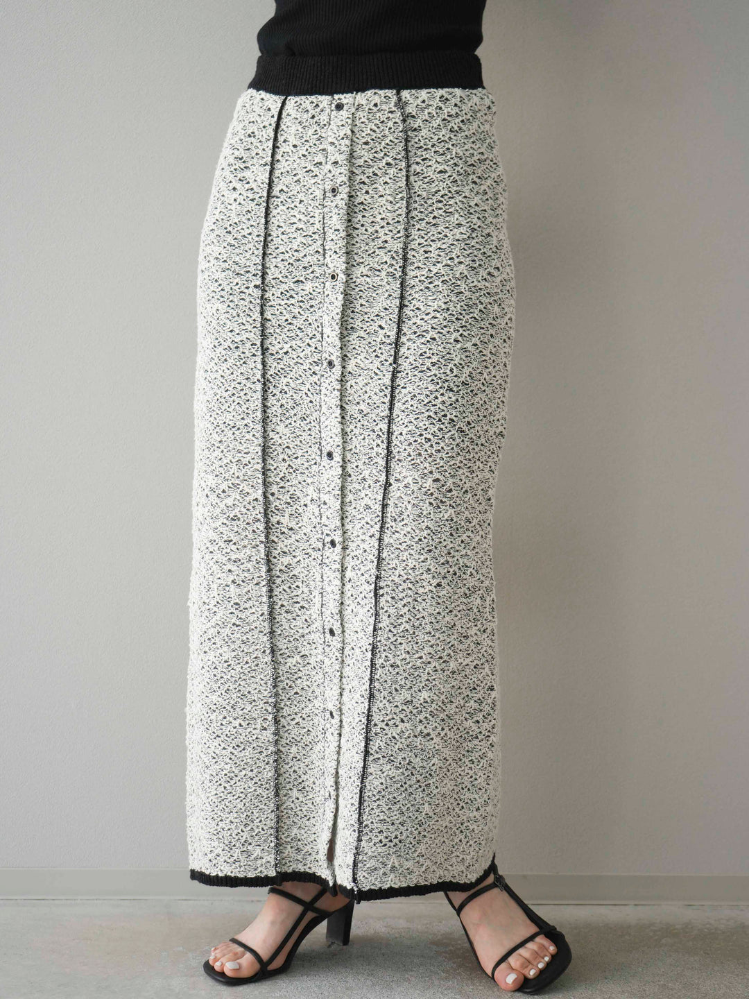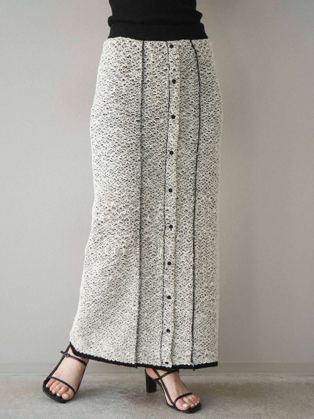 トレンドのミックスヤーン素材を使用したタイトスカート。奥行きのある編地が魅力的で、シンプルながらも存在感のある一枚です。すっきりとしたIラインシルエットが、女性らしい印象を演出。フロントのボタンディテールがアクセントになり、カジュアルにもきれいめにもマッチします。同素材のトップスとセットアップでの着こなしもおすすめ。 ※ボトムス、キャミソール(インナー)以外の商品は一律でインナーは付属していません。