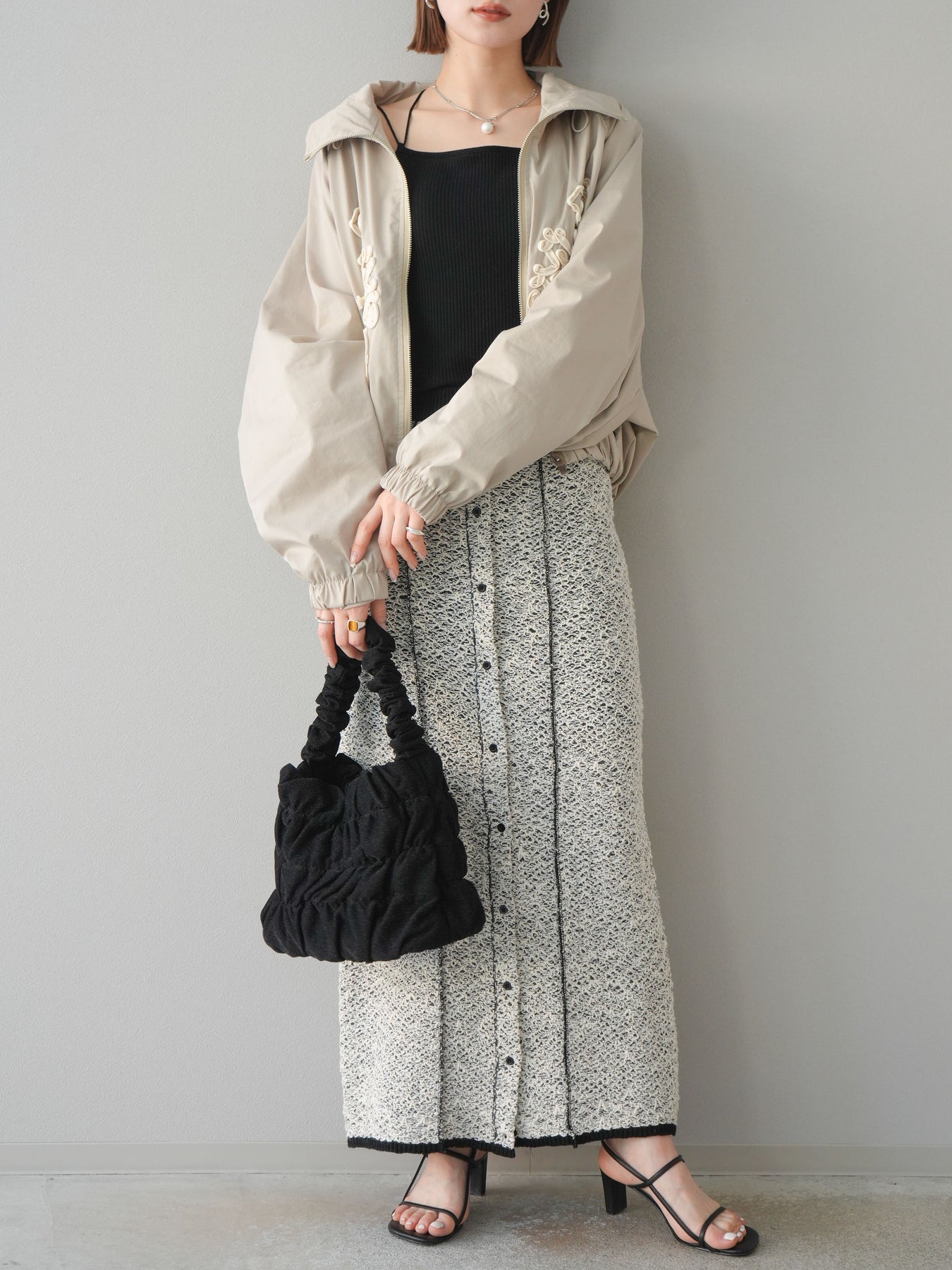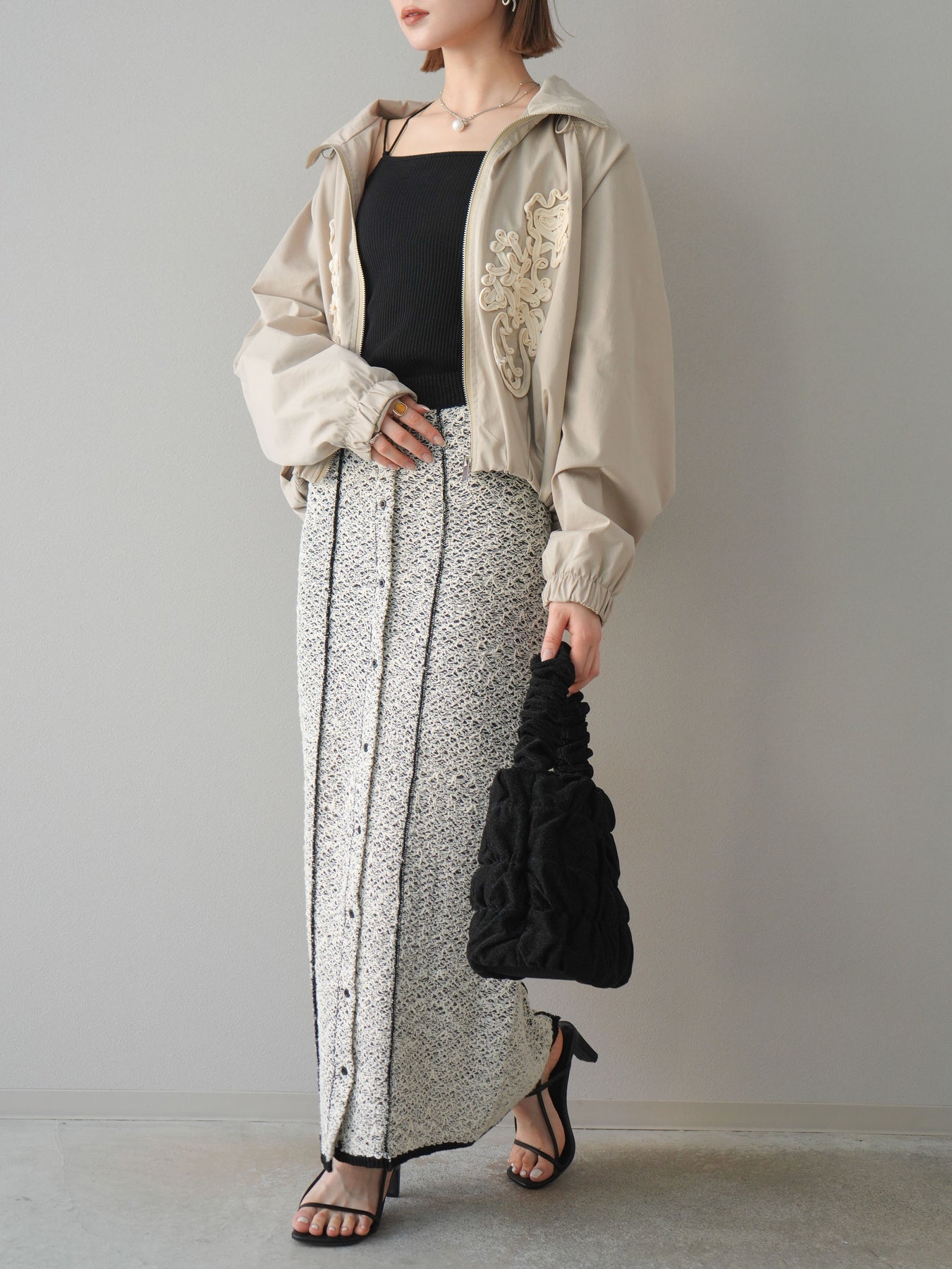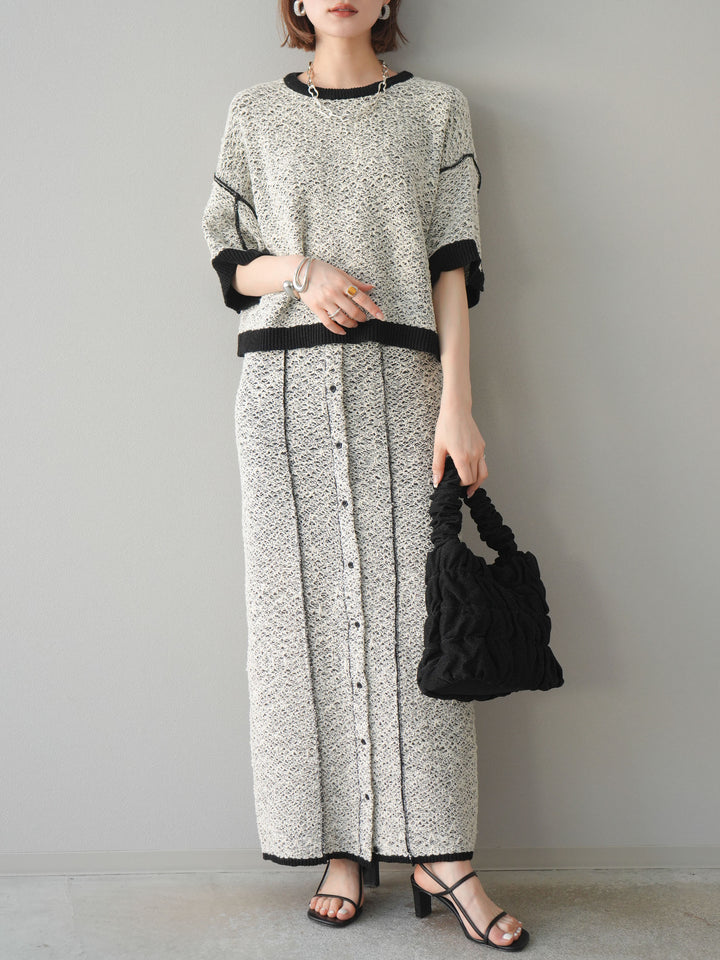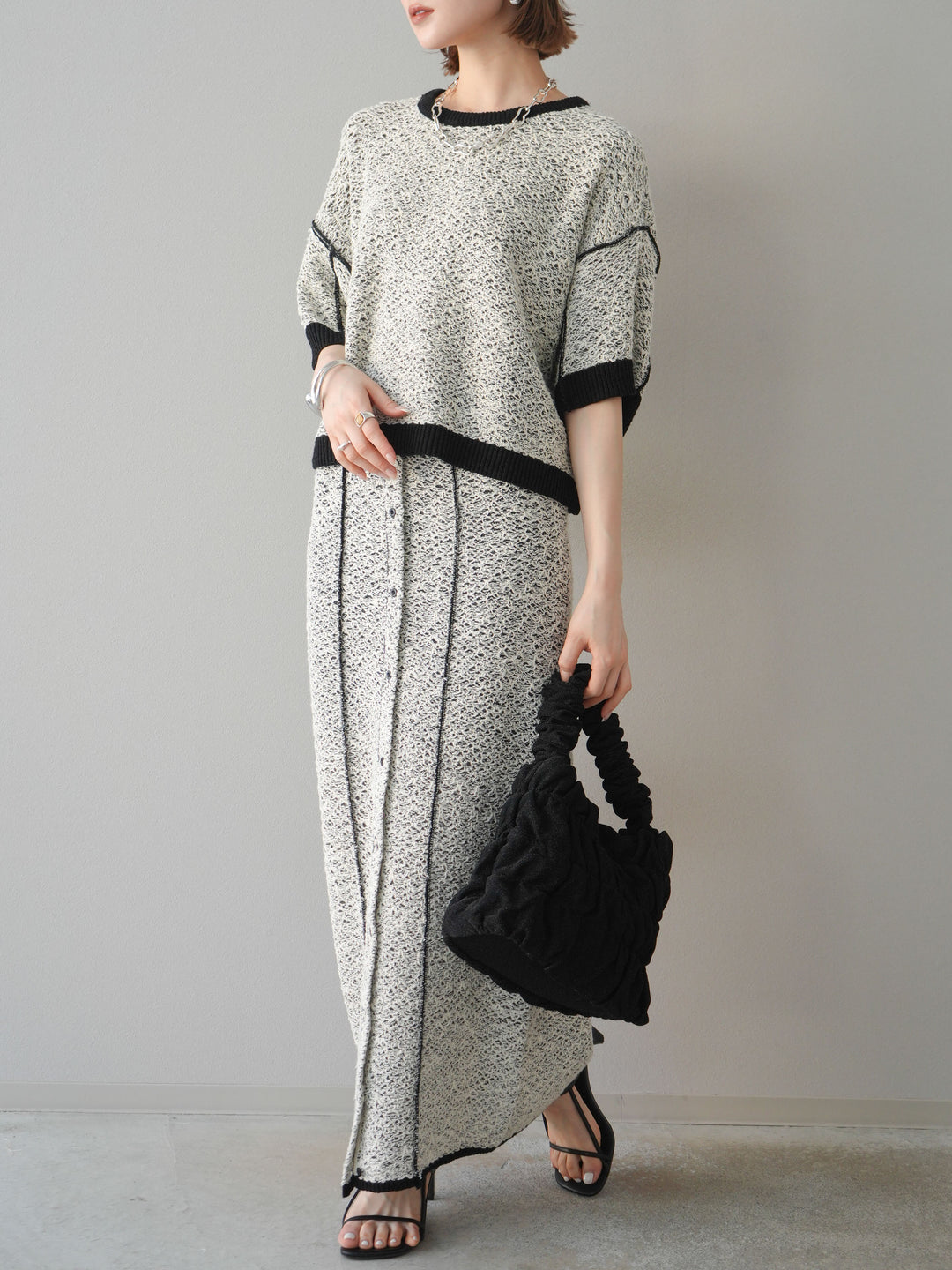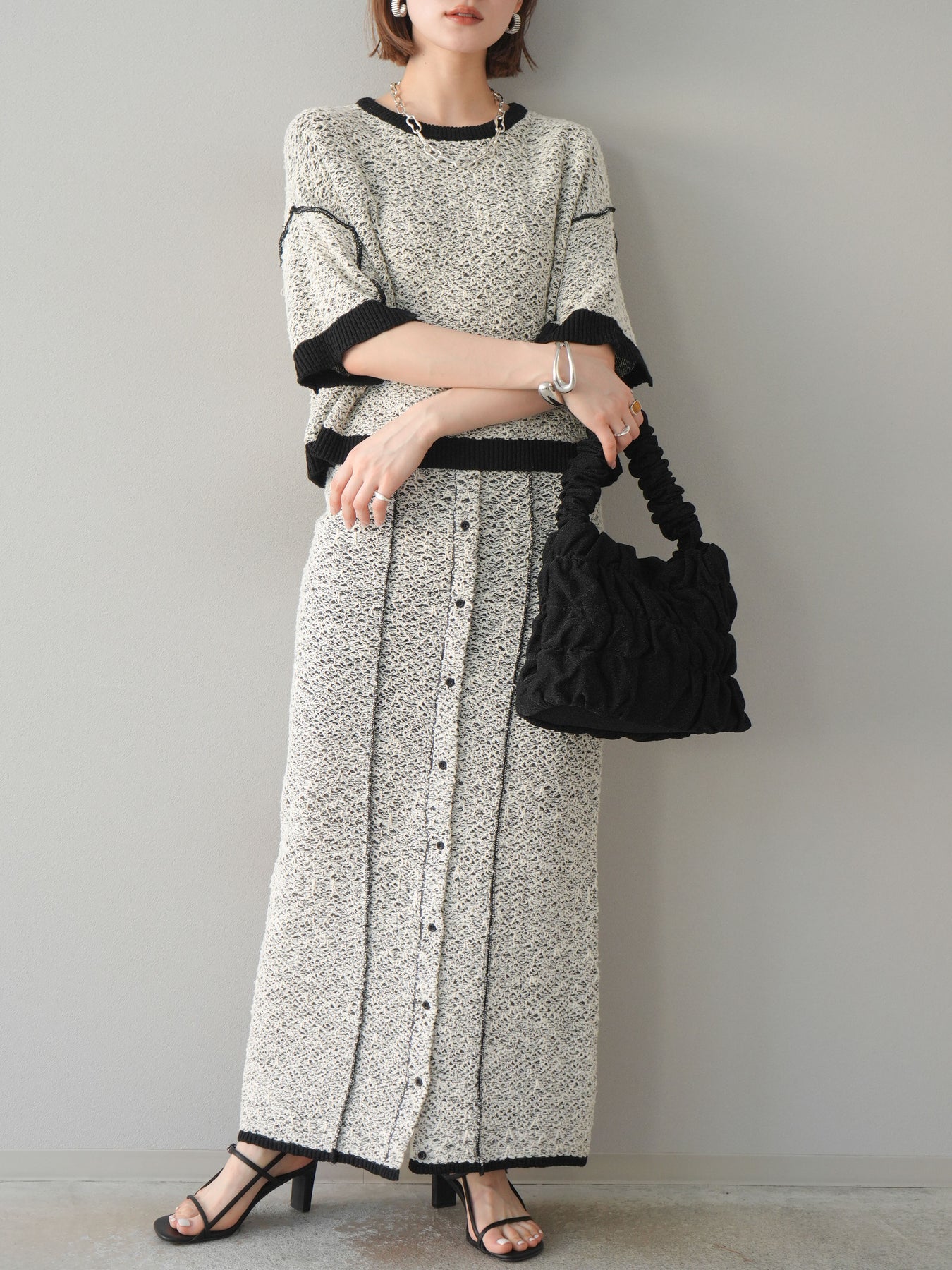 トレンドのミックスヤーン素材を使用したタイトスカート。奥行きのある編地が魅力的で、シンプルながらも存在感のある一枚です。すっきりとしたIラインシルエットが、女性らしい印象を演出。フロントのボタンディテールがアクセントになり、カジュアルにもきれいめにもマッチします。同素材のトップスとセットアップでの着こなしもおすすめ。 ※ボトムス、キャミソール(インナー)以外の商品は一律でインナーは付属していません。