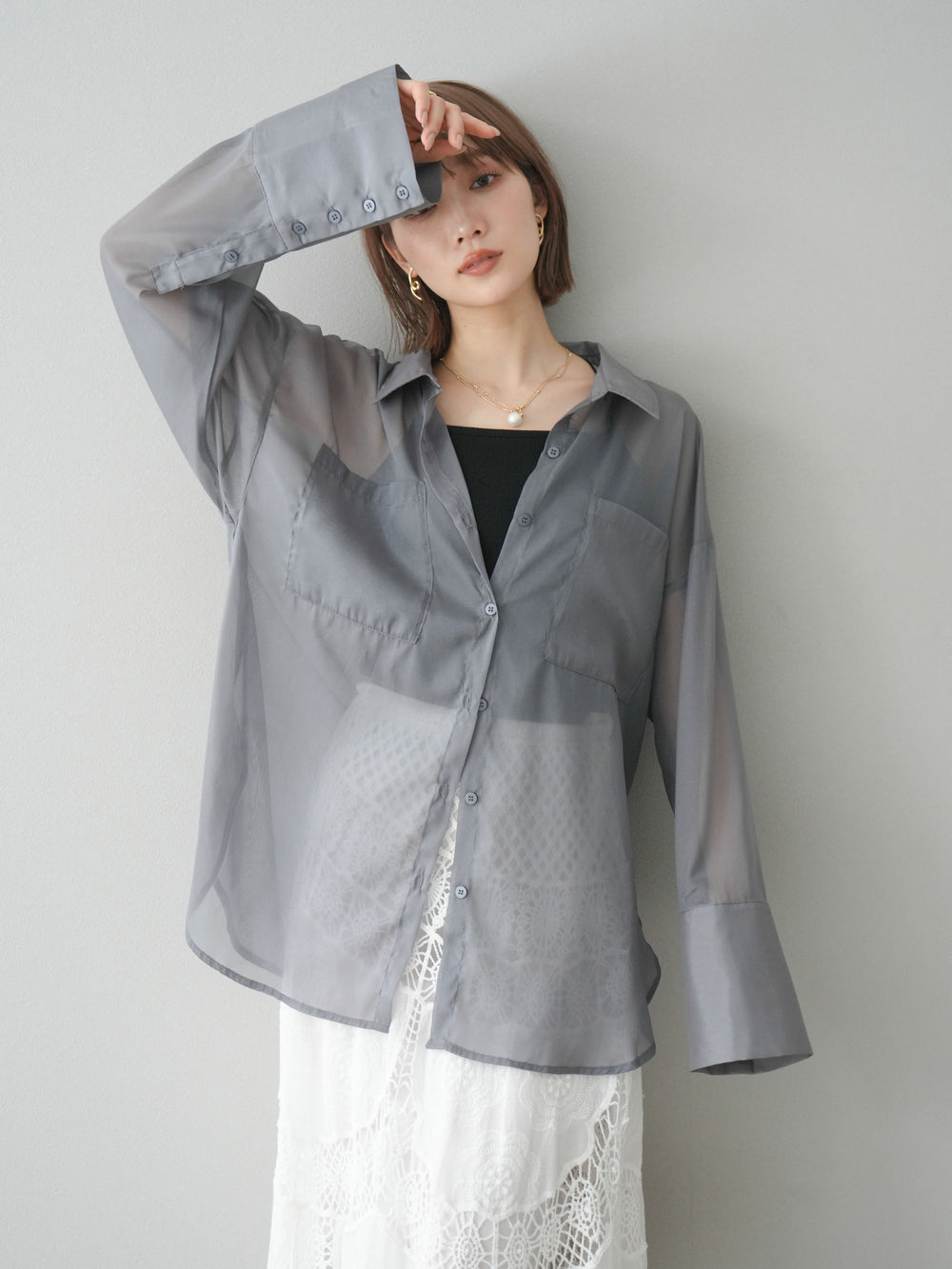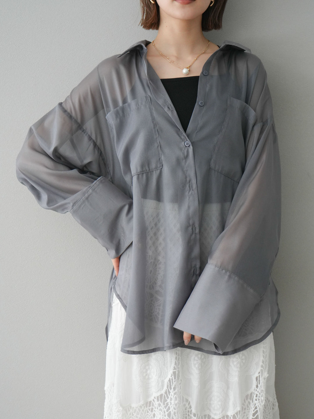 [予約]フリンジジャガード×チュールレイヤードシャツ/ブラック