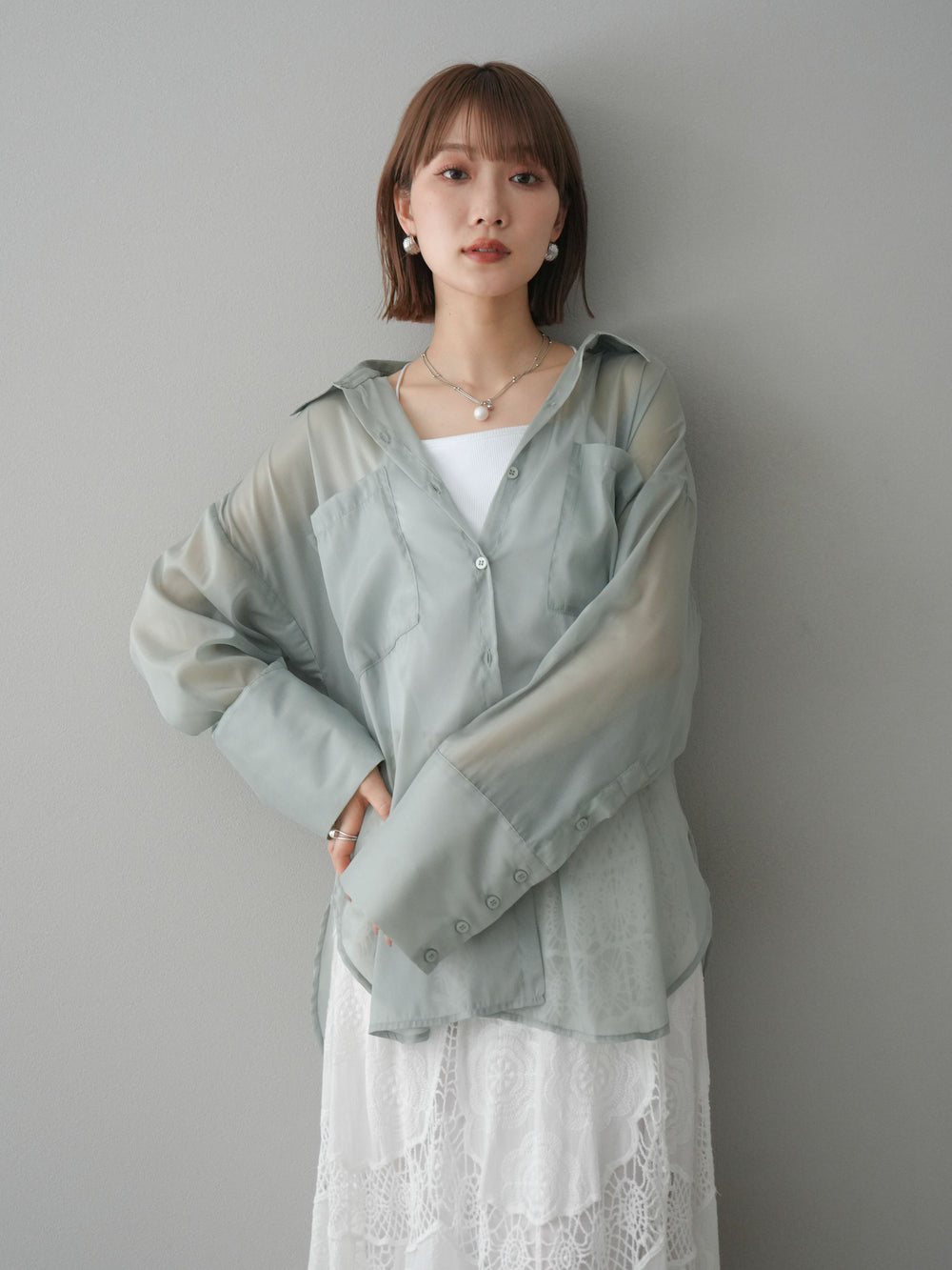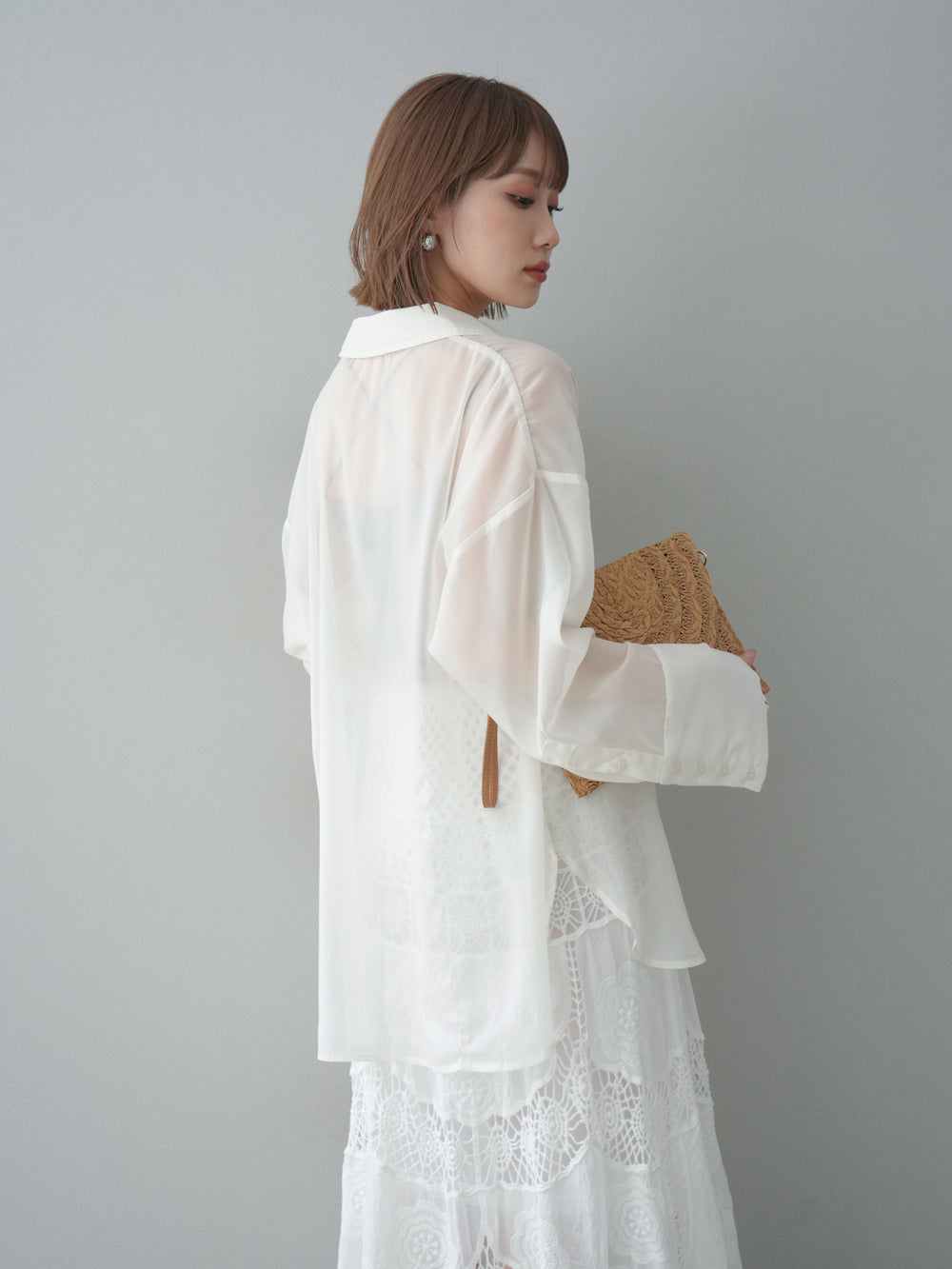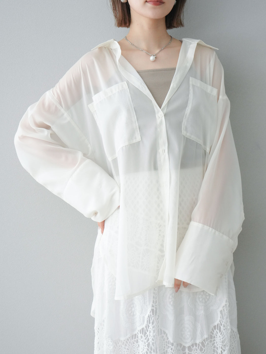 [予約]フリンジジャガード×チュールレイヤードシャツ/アイボリー