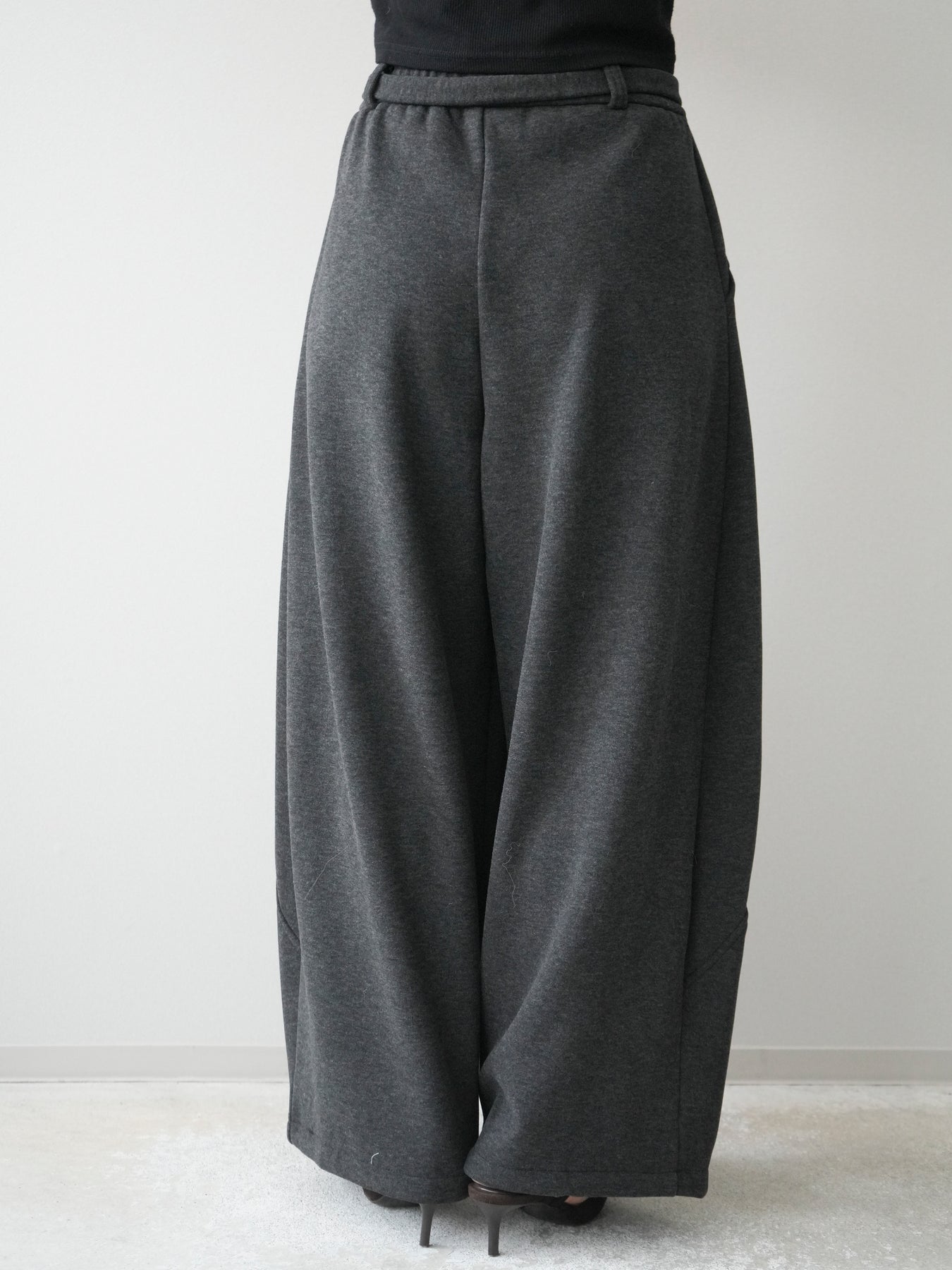 なだらかなカーブラインが特徴の、立体感のあるシルエットが魅力のスエットパンツ。 ラフになりすぎないフォルムで、スエット素材ながらも洗練された印象に仕上がっています。 ウエスト部分のベルトデザインがさりげないアクセントとなり、スタイリング全体を引き締めてくれます。 程よいボリューム感で脚のラインを拾いにくく、リラックス感ときれいめ要素を両立。 デイリー使いはもちろん、ニットやシャツと合わせた大人カジュアルにも活躍する一本です。