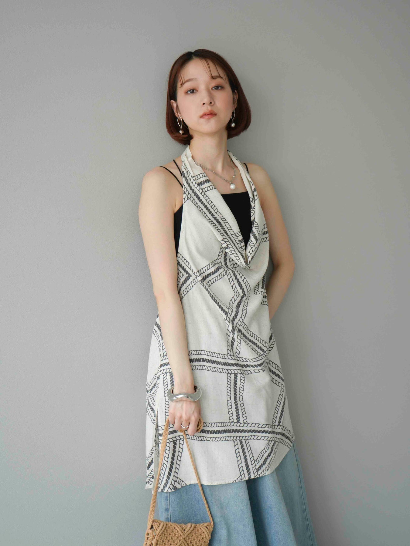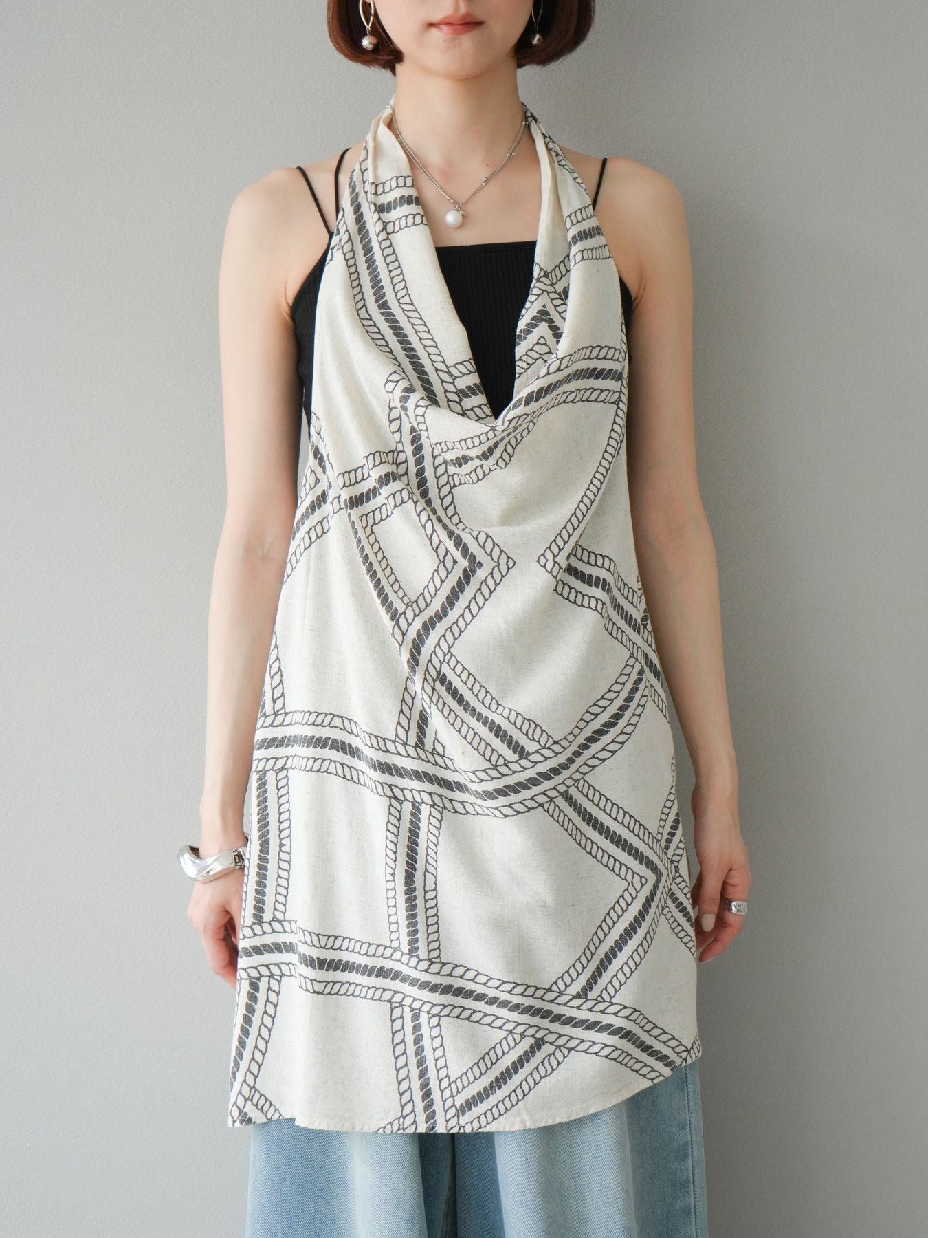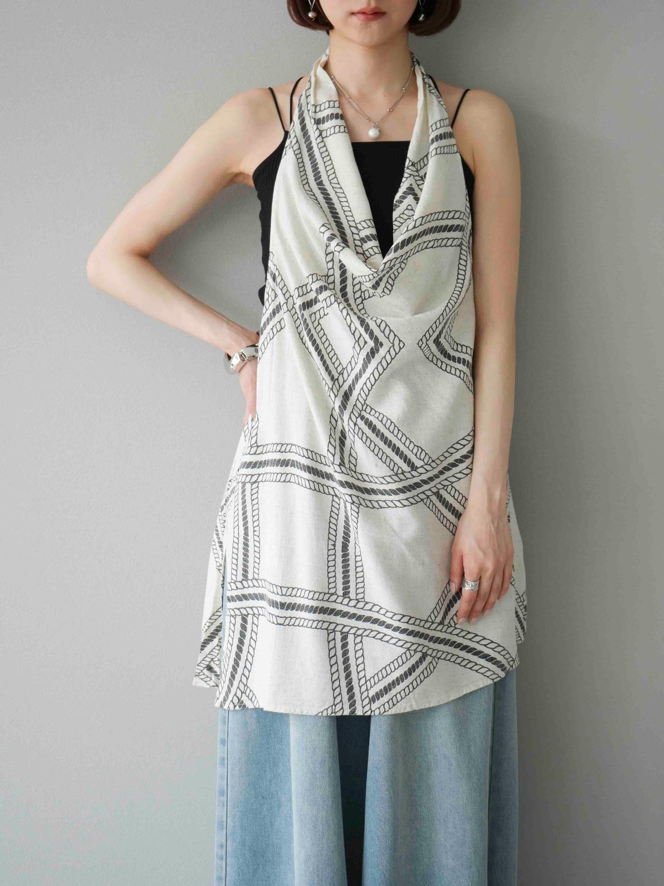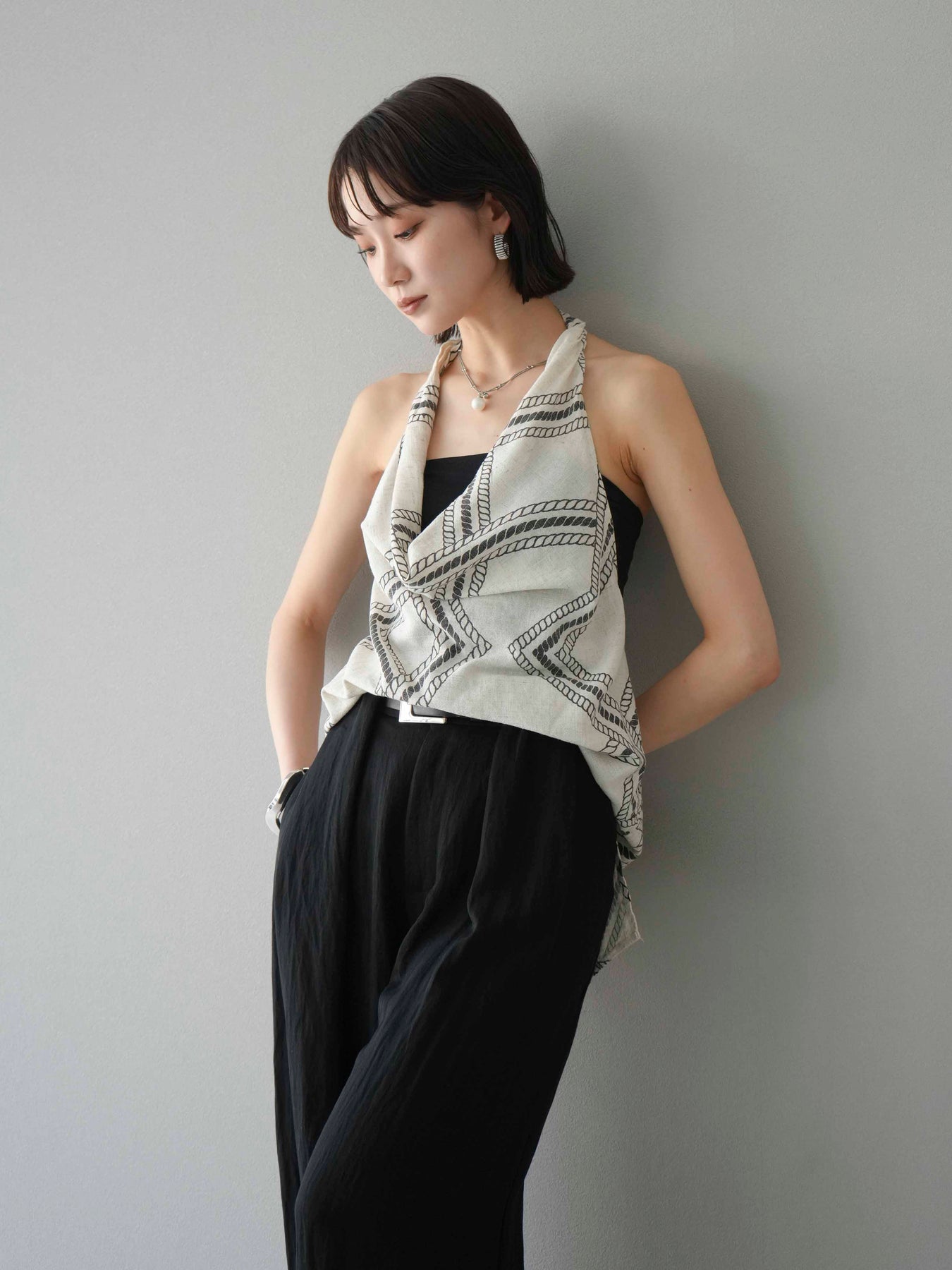 リゾート感漂うロープ柄が目を惹く、リネンタッチ素材のノースリーブブラウス。軽やかな生地感とゆったりとしたシルエットがリラックスムードを演出し、ドレープ感のあるデザインで大人のこなれ感をプラス。ホルターネック風の首元が女性らしさを引き立て、ウエストにベルトを巻いてメリハリのあるスタイリングも楽しめます。同柄のパンツとセットアップ風に着こなすのもおすすめ。1枚で主役になる夏にぴったりの一着です。 ※ボトムス、キャミソール(インナー)以外の商品は一律でインナーは付属していません。