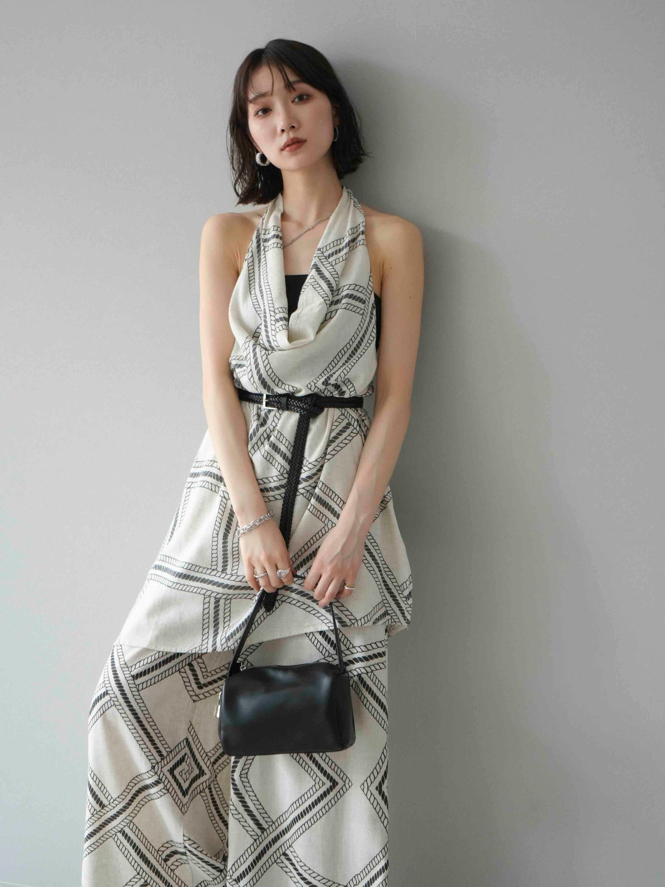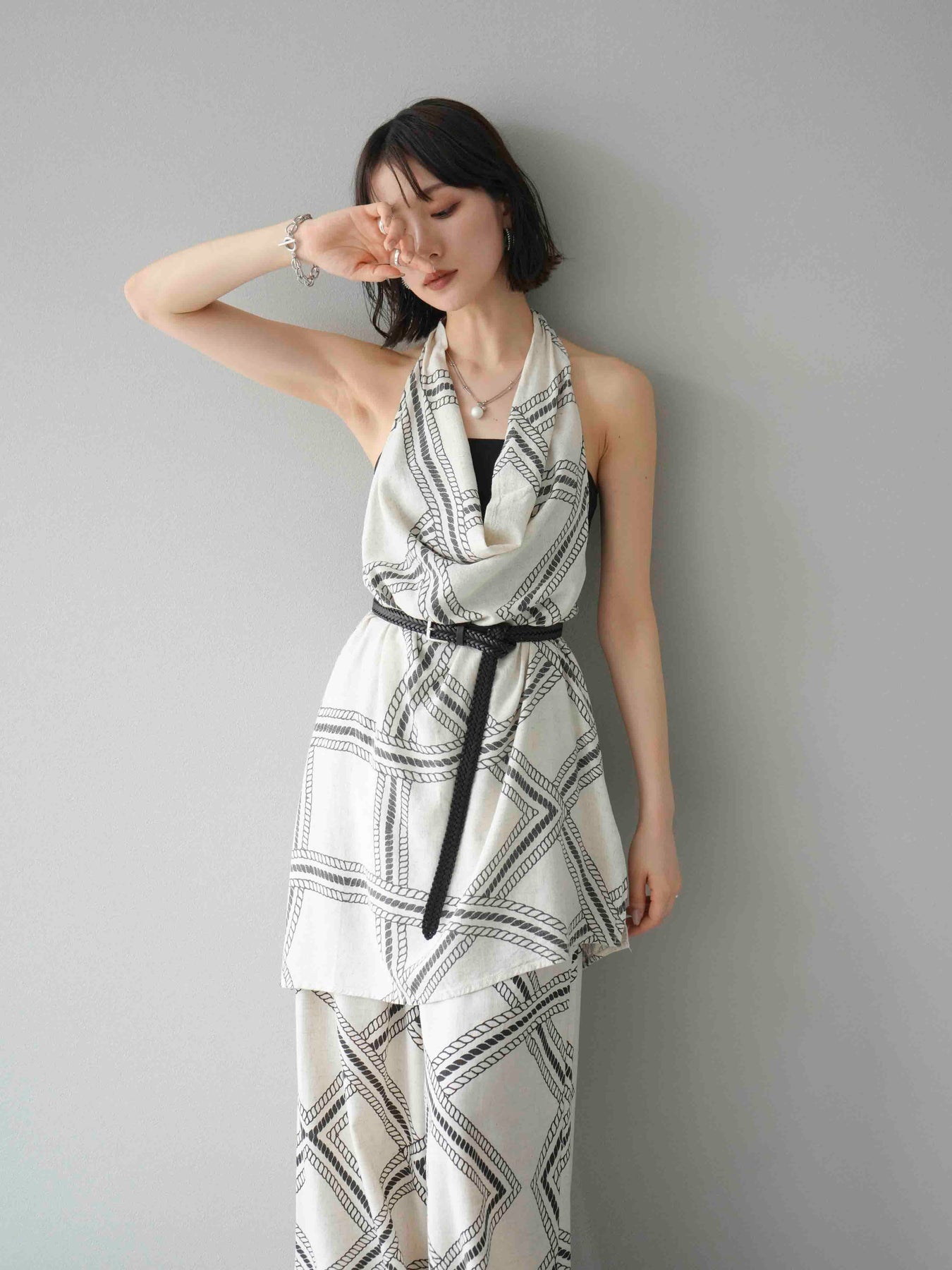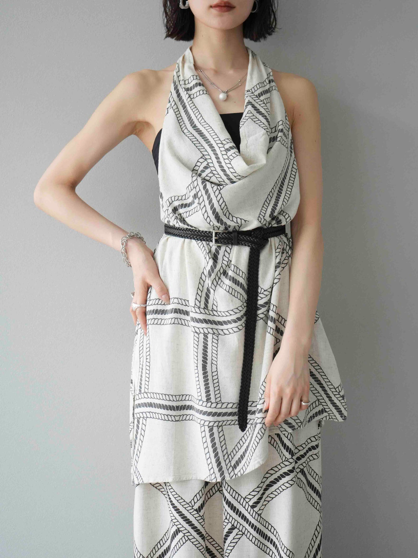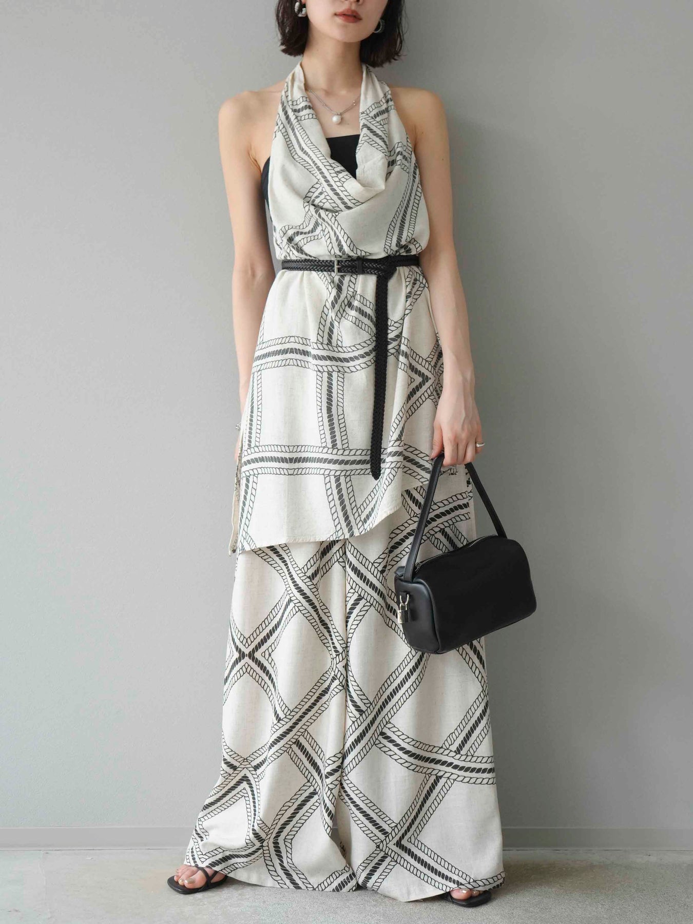 リゾート感漂うロープ柄が目を惹く、リネンタッチ素材のノースリーブブラウス。軽やかな生地感とゆったりとしたシルエットがリラックスムードを演出し、ドレープ感のあるデザインで大人のこなれ感をプラス。ホルターネック風の首元が女性らしさを引き立て、ウエストにベルトを巻いてメリハリのあるスタイリングも楽しめます。同柄のパンツとセットアップ風に着こなすのもおすすめ。1枚で主役になる夏にぴったりの一着です。 ※ボトムス、キャミソール(インナー)以外の商品は一律でインナーは付属していません。