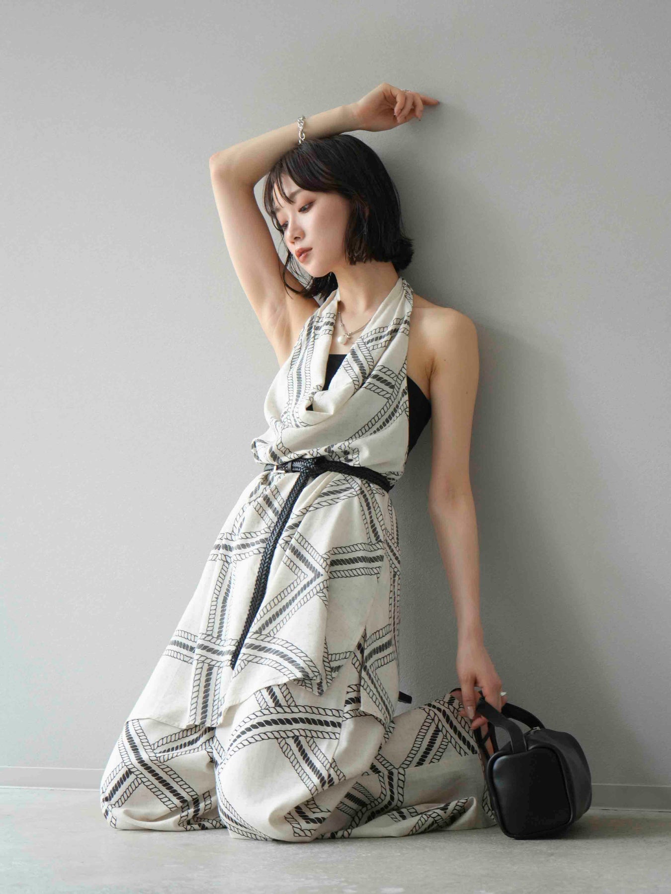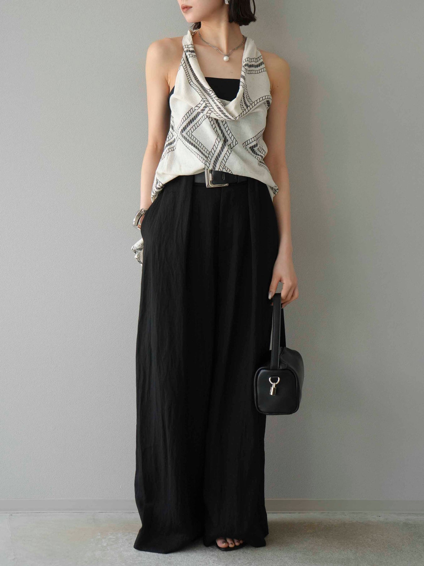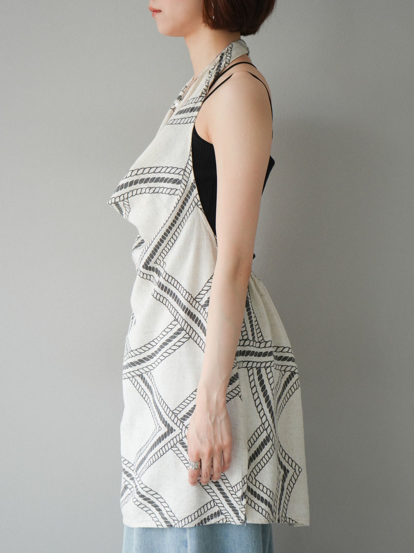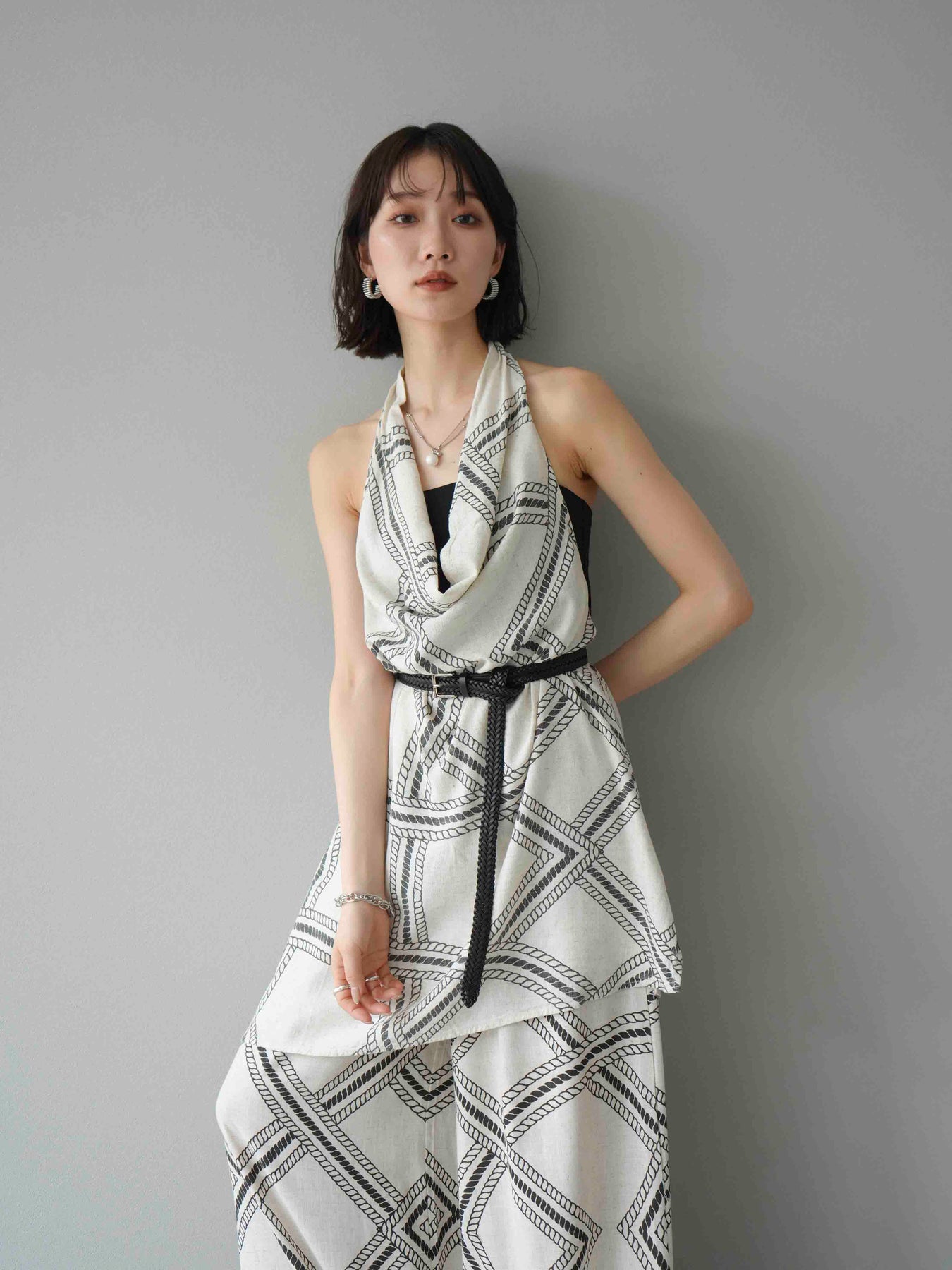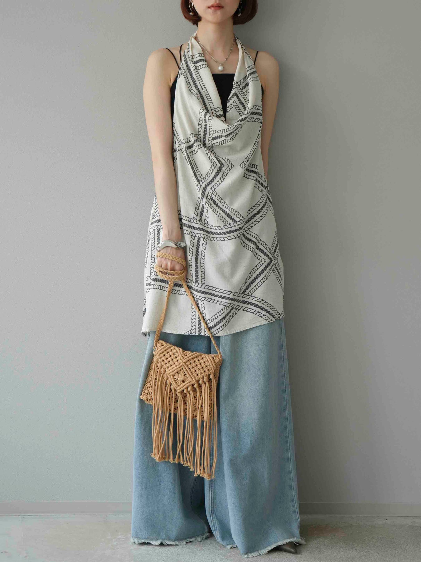 リゾート感漂うロープ柄が目を惹く、リネンタッチ素材のノースリーブブラウス。軽やかな生地感とゆったりとしたシルエットがリラックスムードを演出し、ドレープ感のあるデザインで大人のこなれ感をプラス。ホルターネック風の首元が女性らしさを引き立て、ウエストにベルトを巻いてメリハリのあるスタイリングも楽しめます。同柄のパンツとセットアップ風に着こなすのもおすすめ。1枚で主役になる夏にぴったりの一着です。 ※ボトムス、キャミソール(インナー)以外の商品は一律でインナーは付属していません。