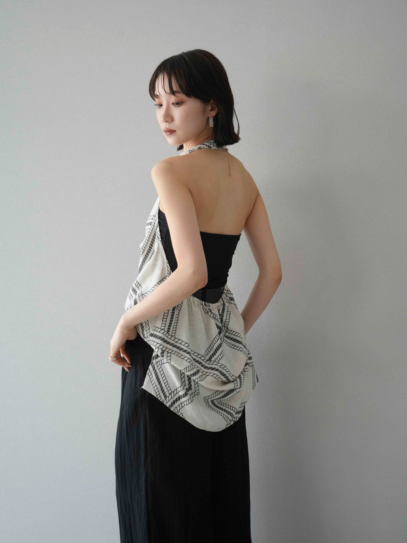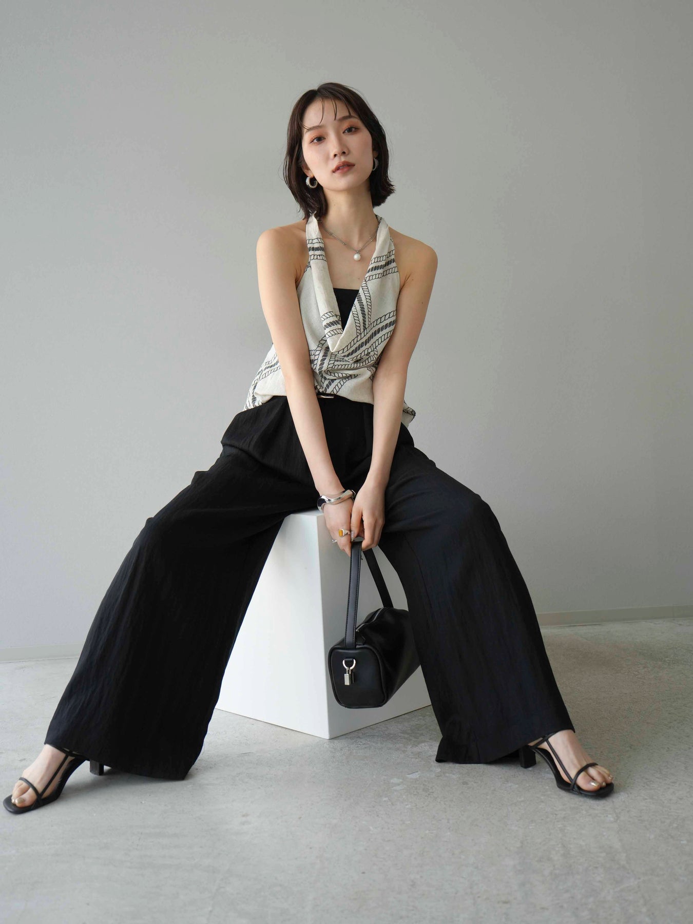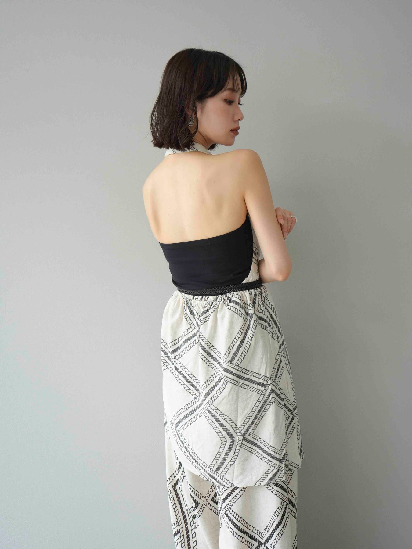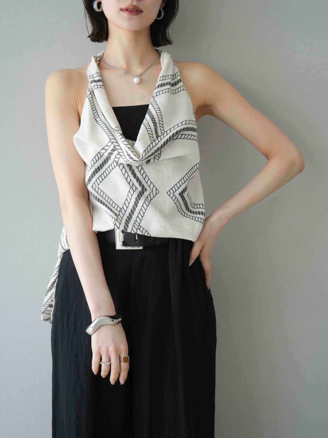 リゾート感漂うロープ柄が目を惹く、リネンタッチ素材のノースリーブブラウス。軽やかな生地感とゆったりとしたシルエットがリラックスムードを演出し、ドレープ感のあるデザインで大人のこなれ感をプラス。ホルターネック風の首元が女性らしさを引き立て、ウエストにベルトを巻いてメリハリのあるスタイリングも楽しめます。同柄のパンツとセットアップ風に着こなすのもおすすめ。1枚で主役になる夏にぴったりの一着です。 ※ボトムス、キャミソール(インナー)以外の商品は一律でインナーは付属していません。