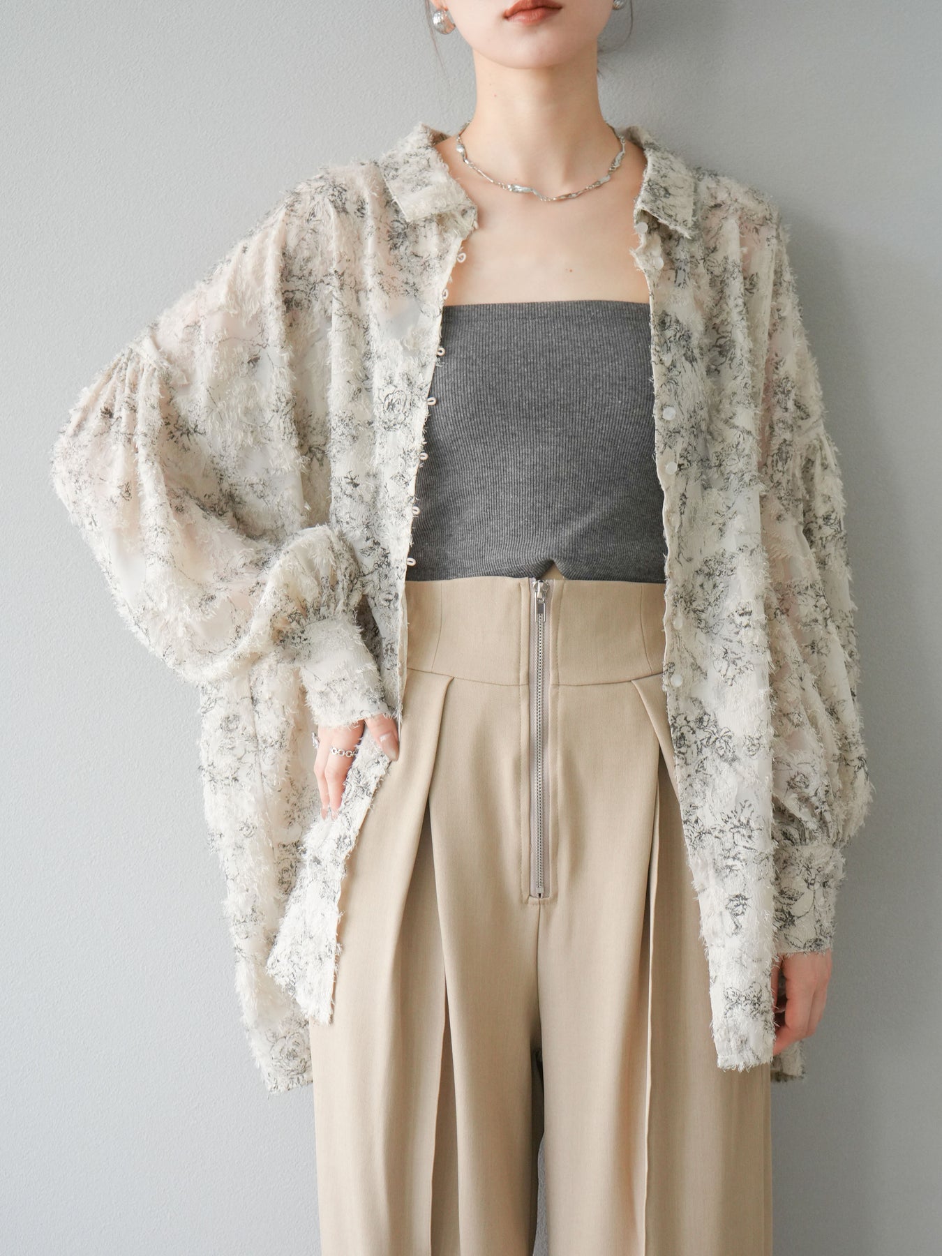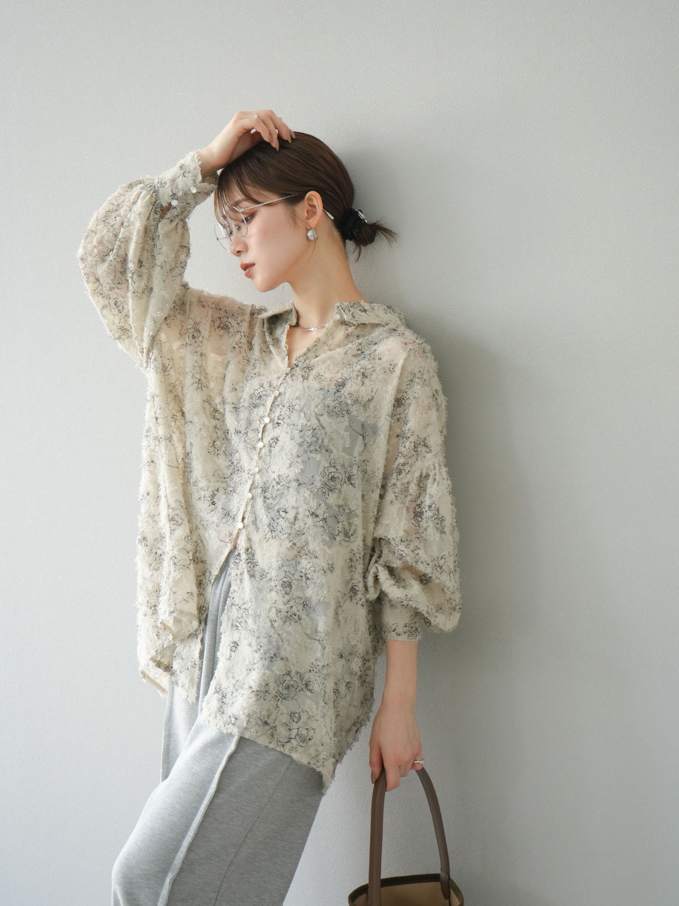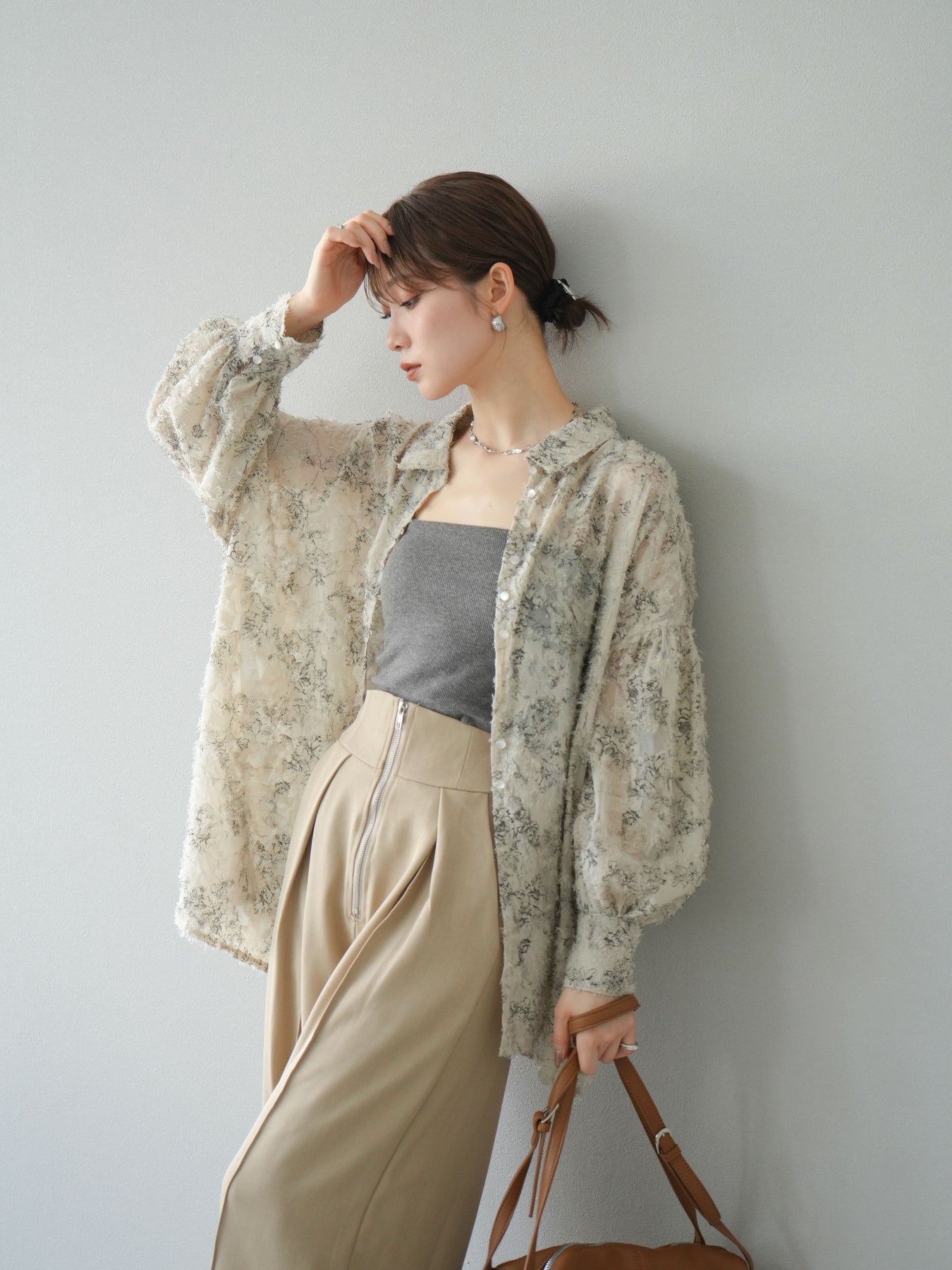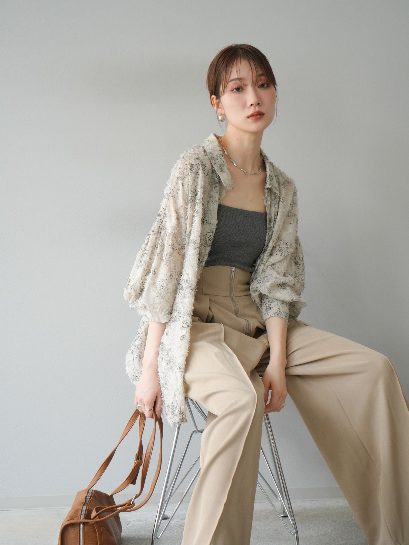立体感のあるフリンジジャガード素材を使用した、ボリュームスリーブブラウス。軽やかな透け感と華やかな表情が魅力で、1枚でコーディネートの主役に。ゆったりとしたシルエットに長めの丈感で、パンツにもスカートにも合わせやすいデザインです。袖口にはギャザーを施し、ふんわりとしたボリューム感を演出。前開き仕様で羽織りとしても活躍します。 ※ボトムス、キャミソール(インナー)以外の商品は一律でインナーは付属していません