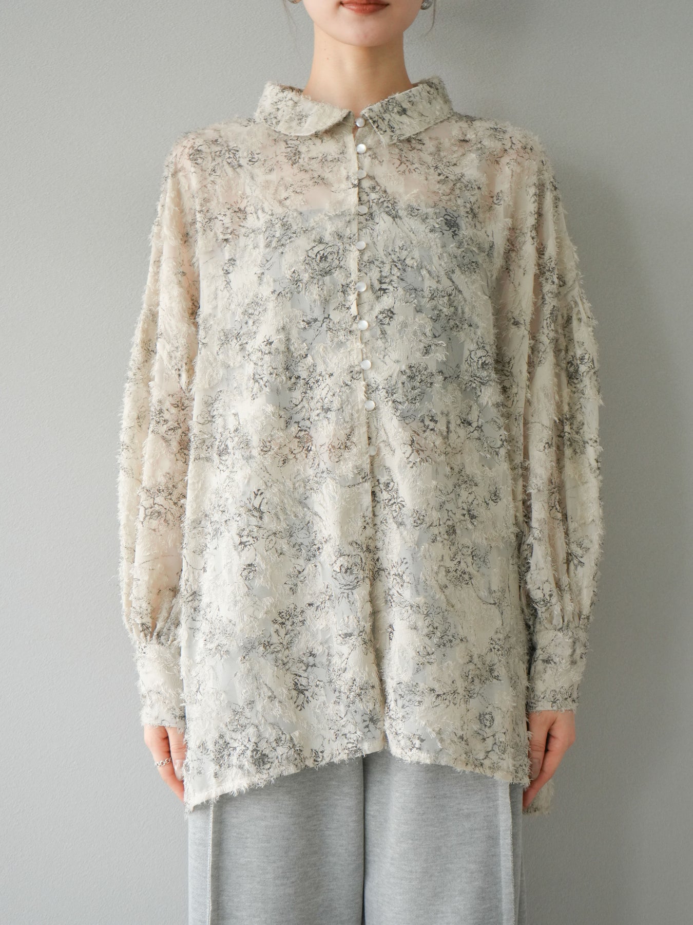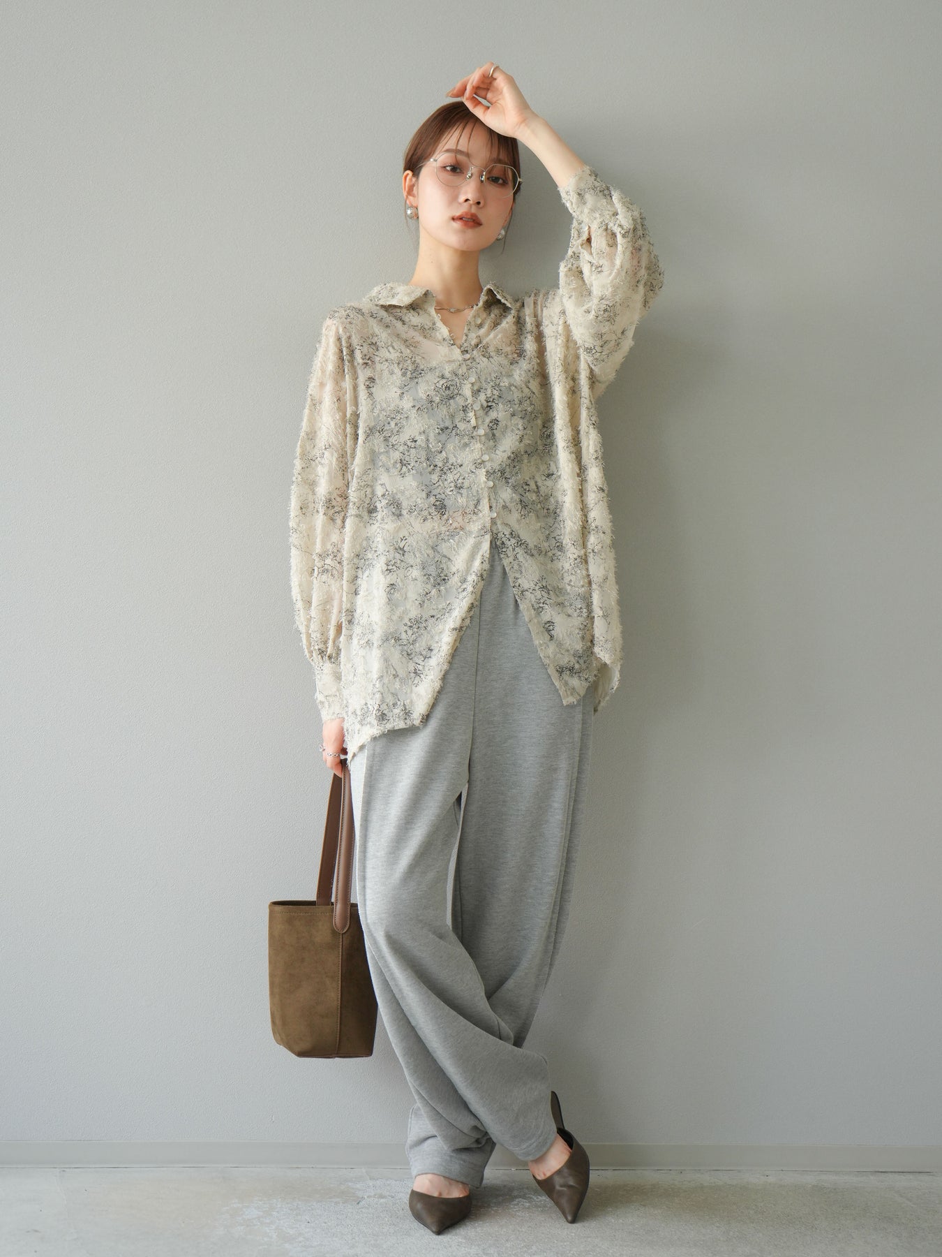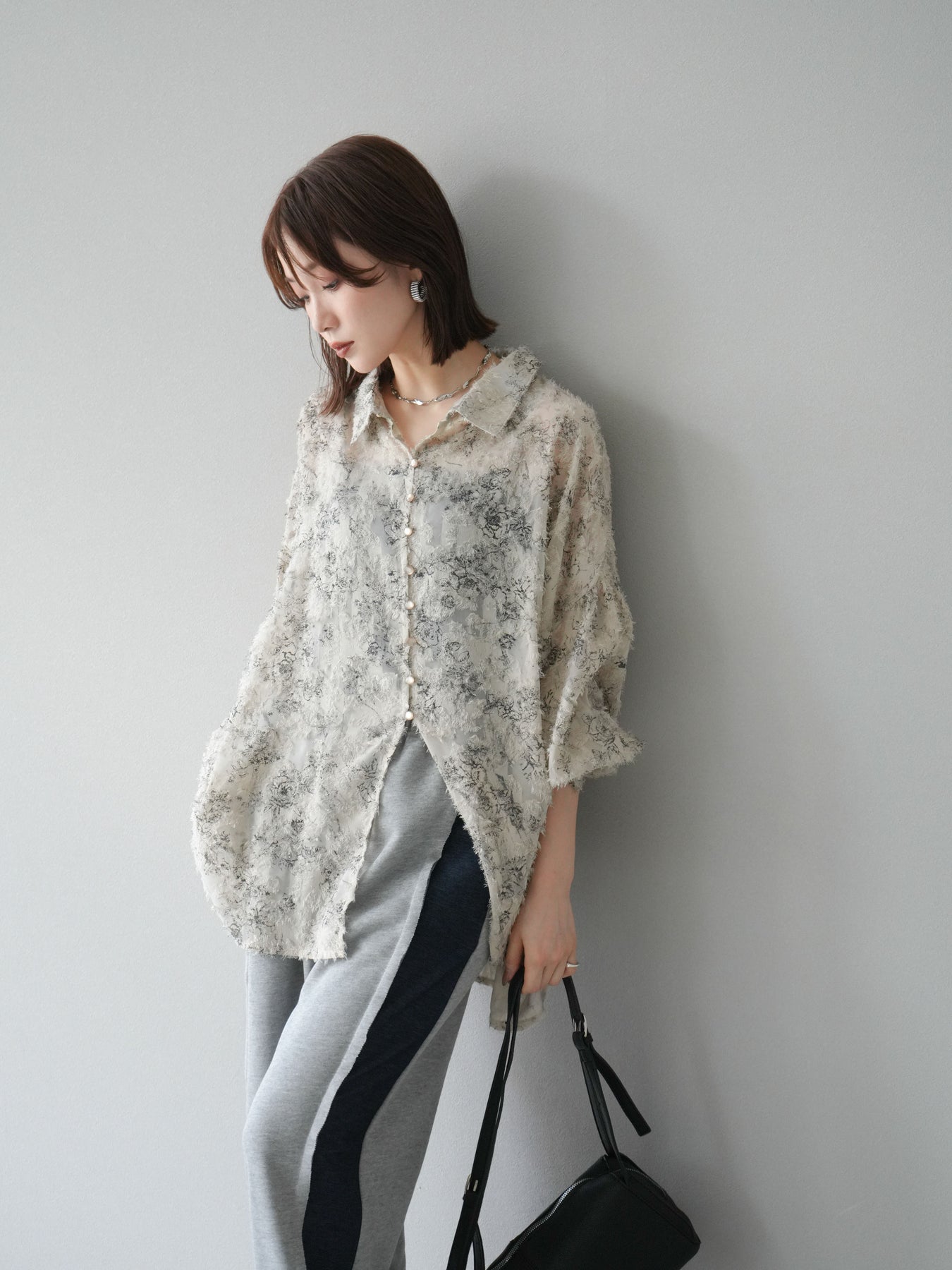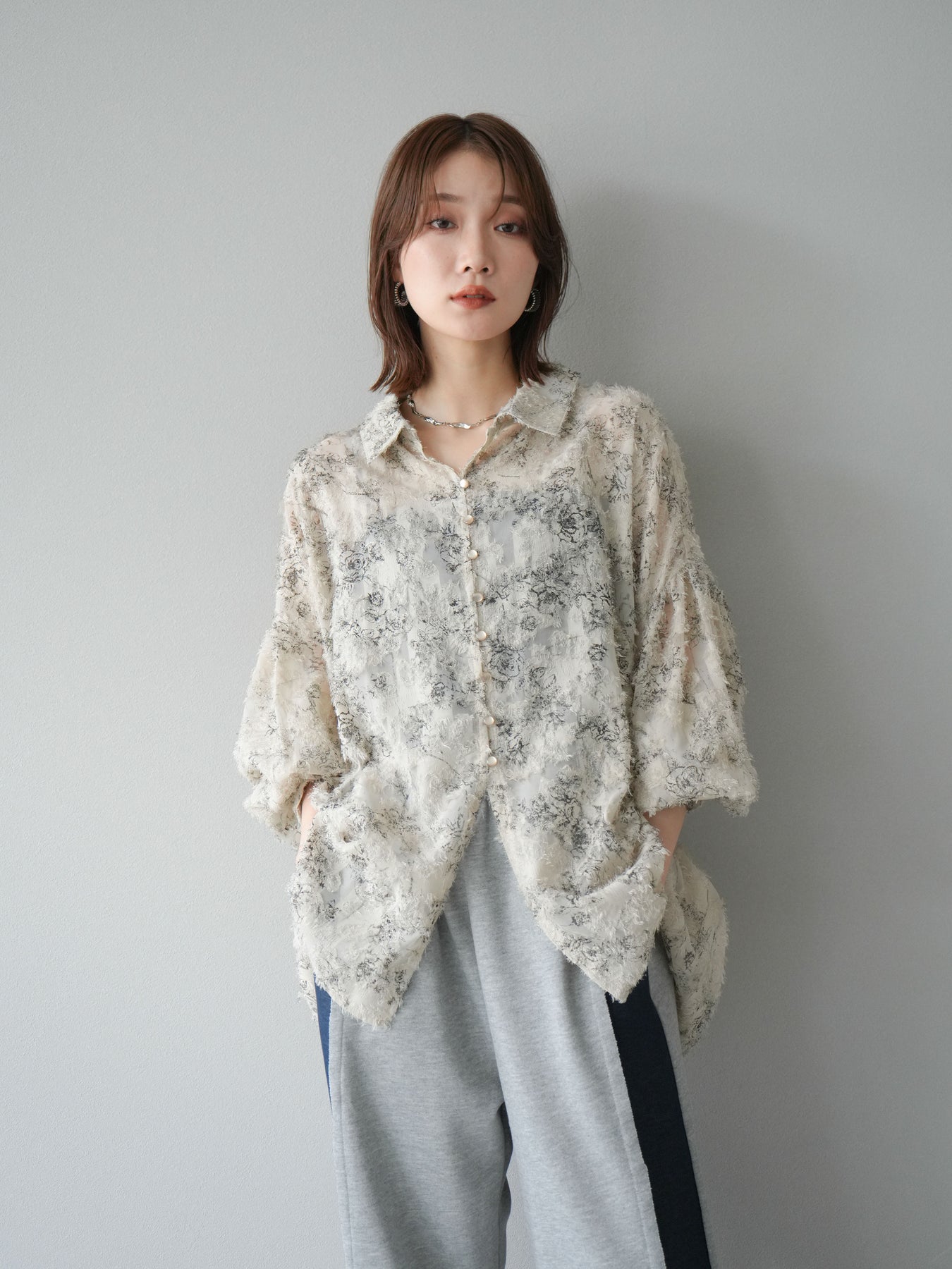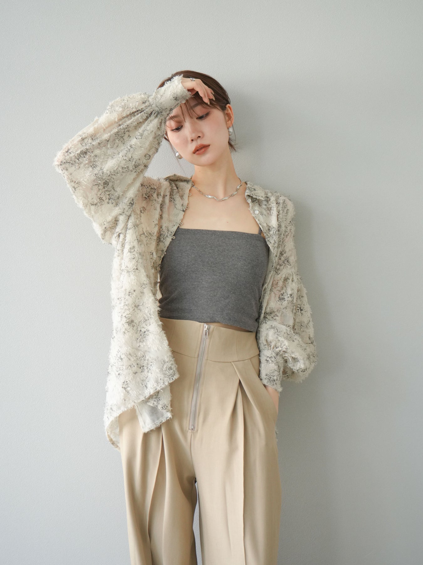 立体感のあるフリンジジャガード素材を使用した、ボリュームスリーブブラウス。軽やかな透け感と華やかな表情が魅力で、1枚でコーディネートの主役に。ゆったりとしたシルエットに長めの丈感で、パンツにもスカートにも合わせやすいデザインです。袖口にはギャザーを施し、ふんわりとしたボリューム感を演出。前開き仕様で羽織りとしても活躍します。 ※ボトムス、キャミソール(インナー)以外の商品は一律でインナーは付属していません