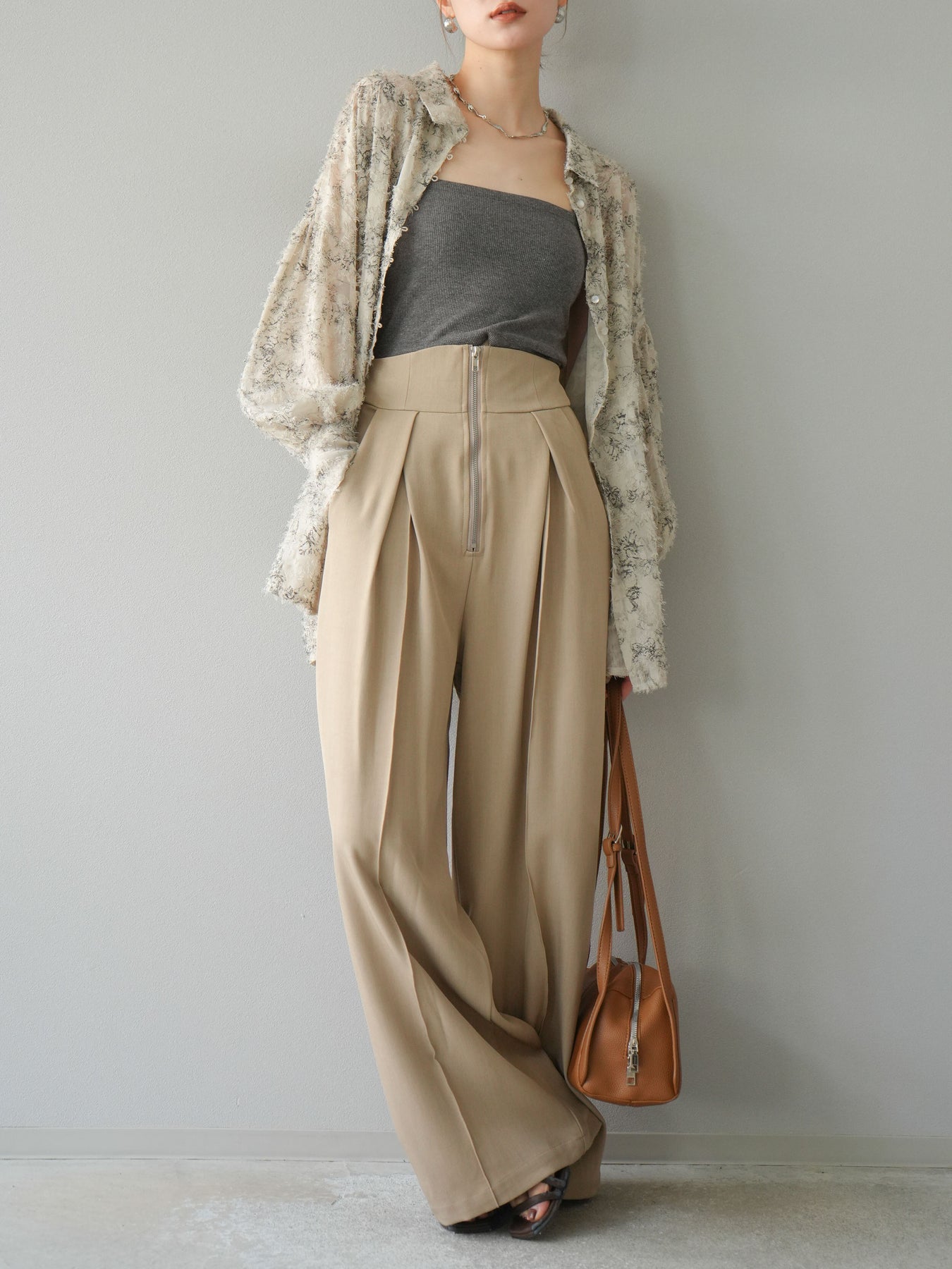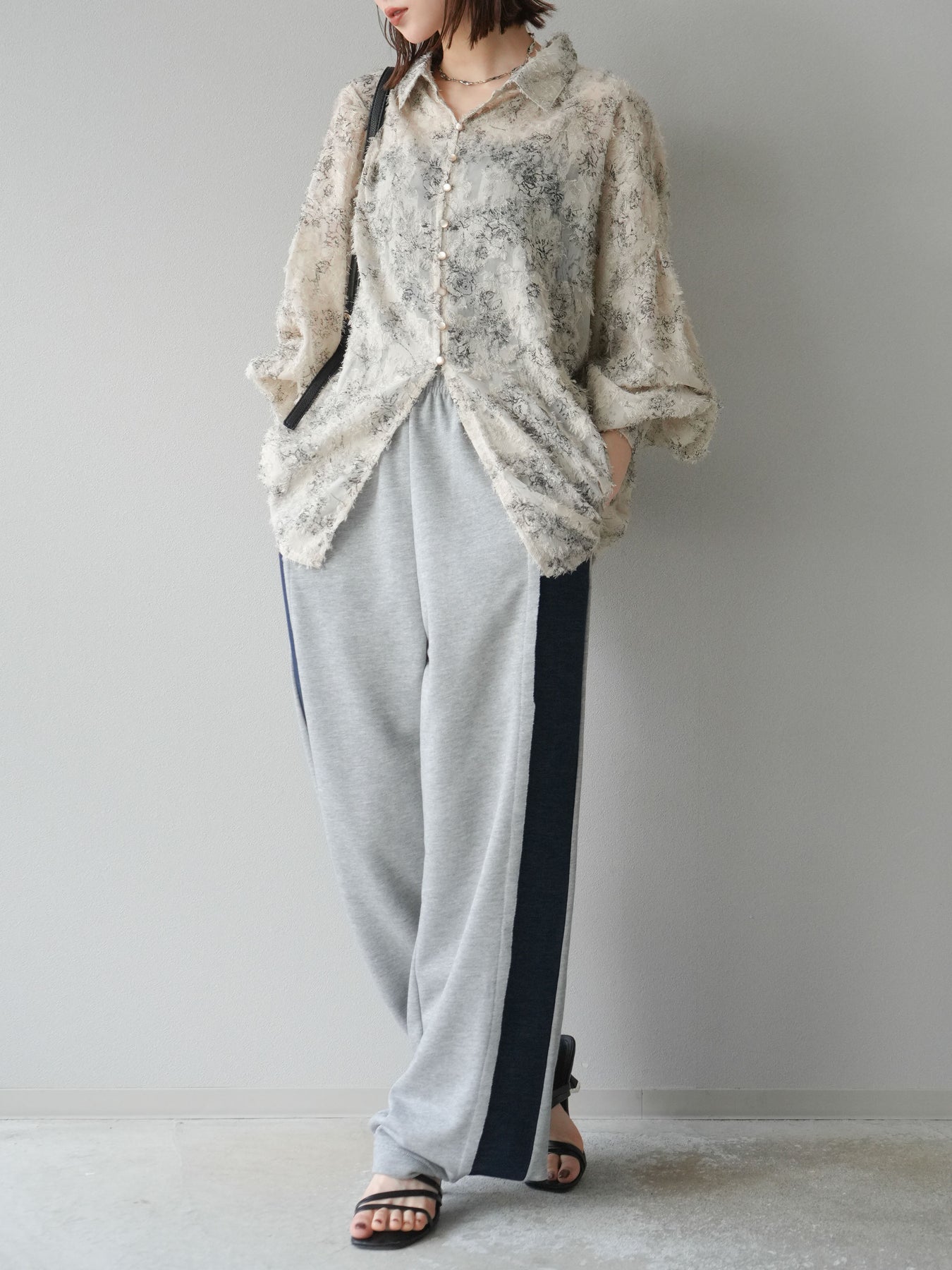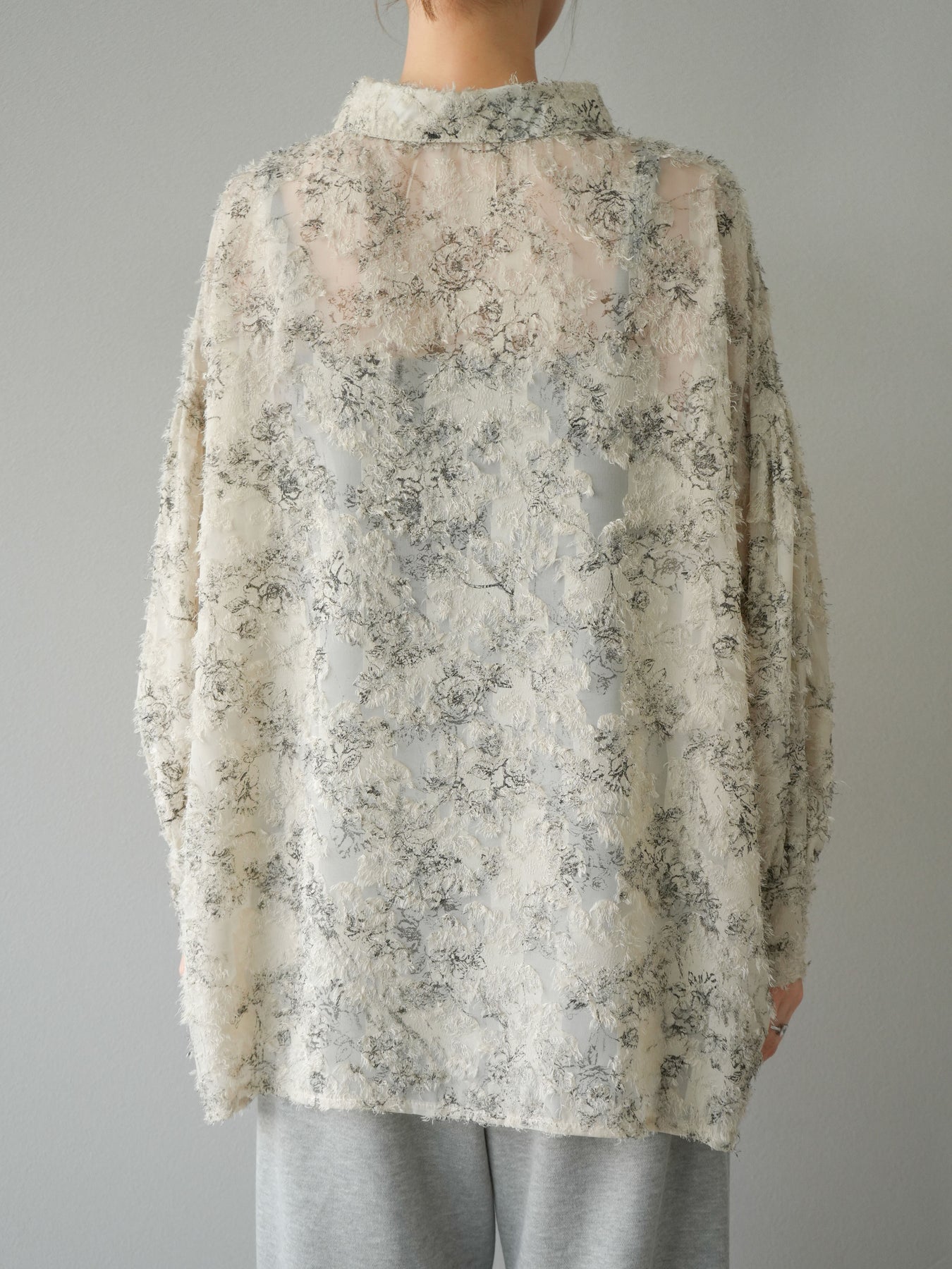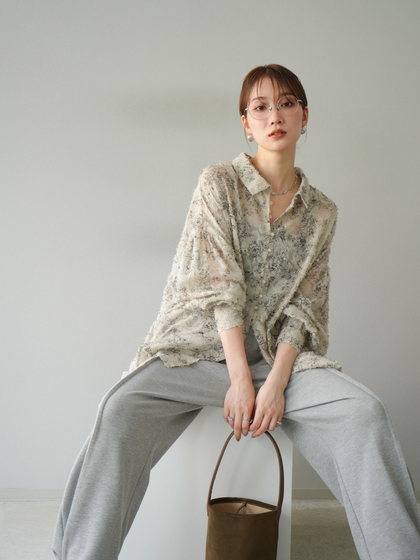 立体感のあるフリンジジャガード素材を使用した、ボリュームスリーブブラウス。軽やかな透け感と華やかな表情が魅力で、1枚でコーディネートの主役に。ゆったりとしたシルエットに長めの丈感で、パンツにもスカートにも合わせやすいデザインです。袖口にはギャザーを施し、ふんわりとしたボリューム感を演出。前開き仕様で羽織りとしても活躍します。 ※ボトムス、キャミソール(インナー)以外の商品は一律でインナーは付属していません