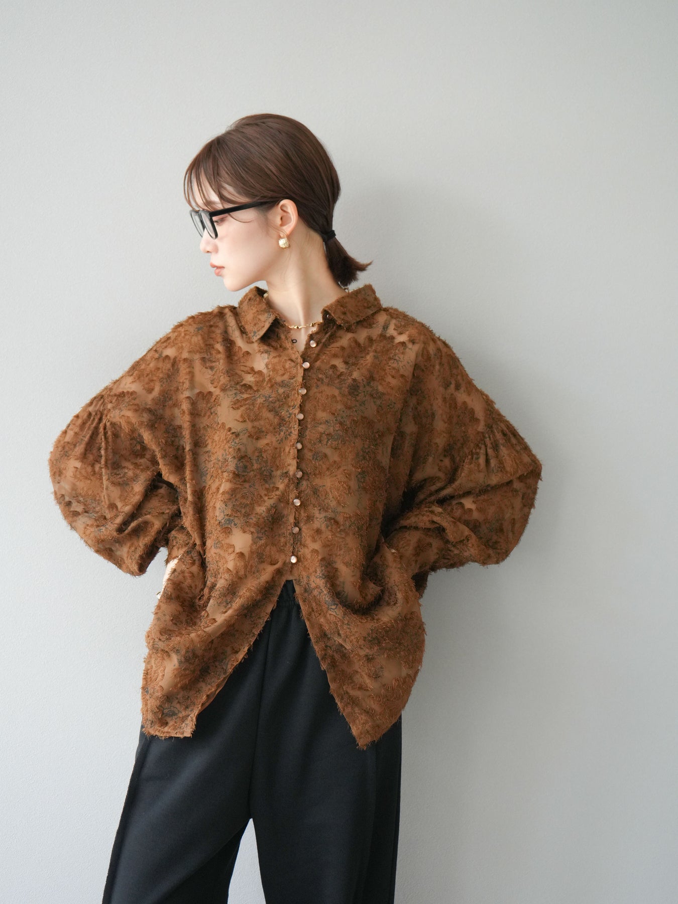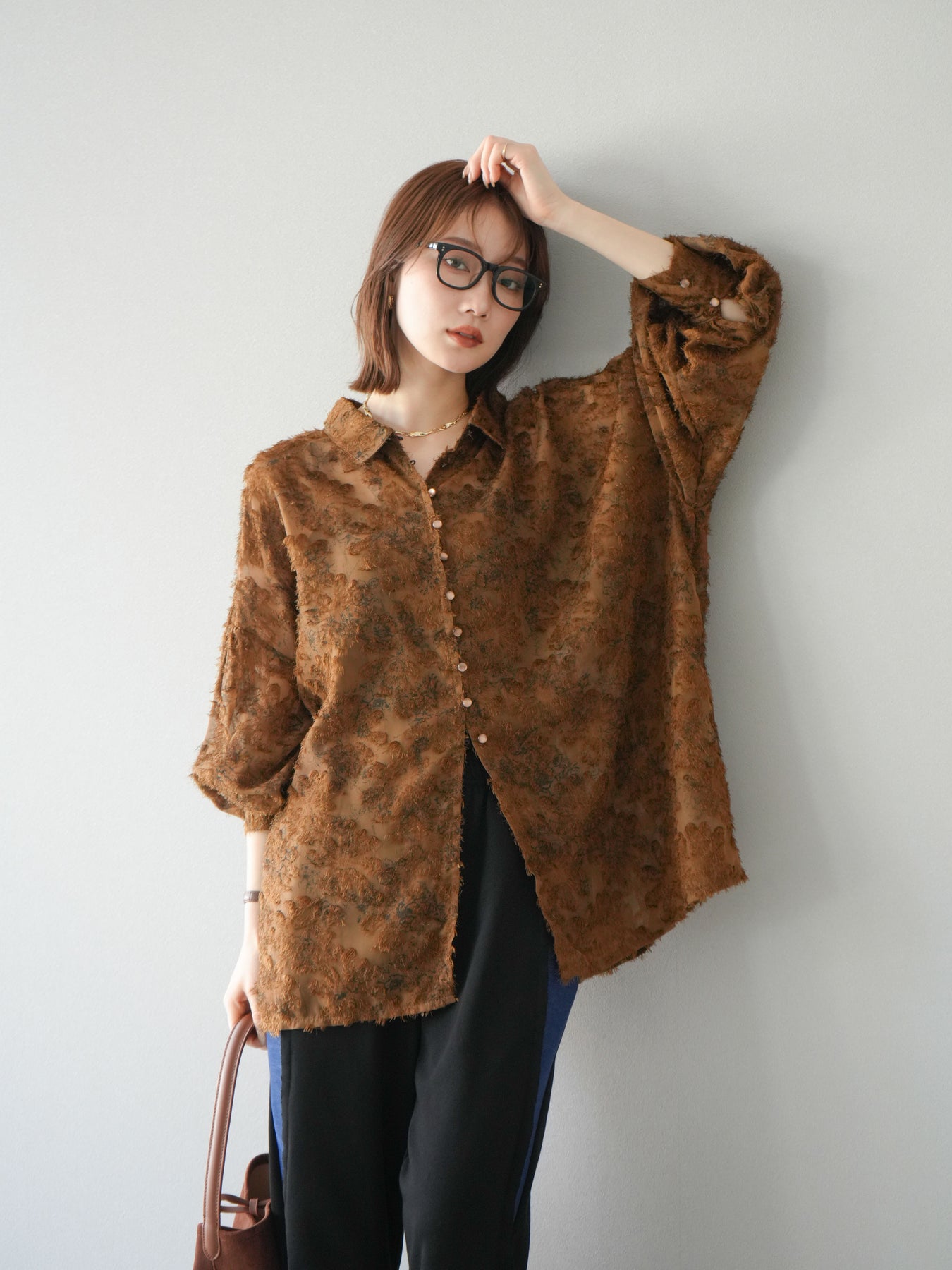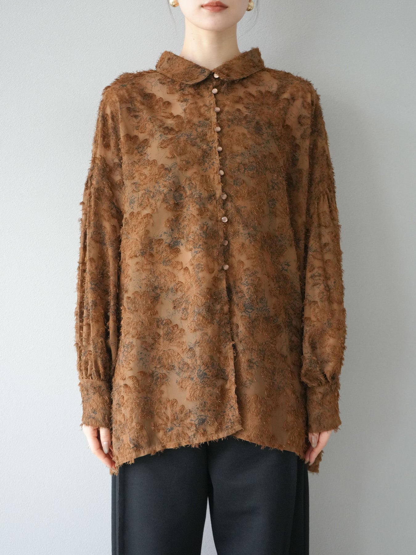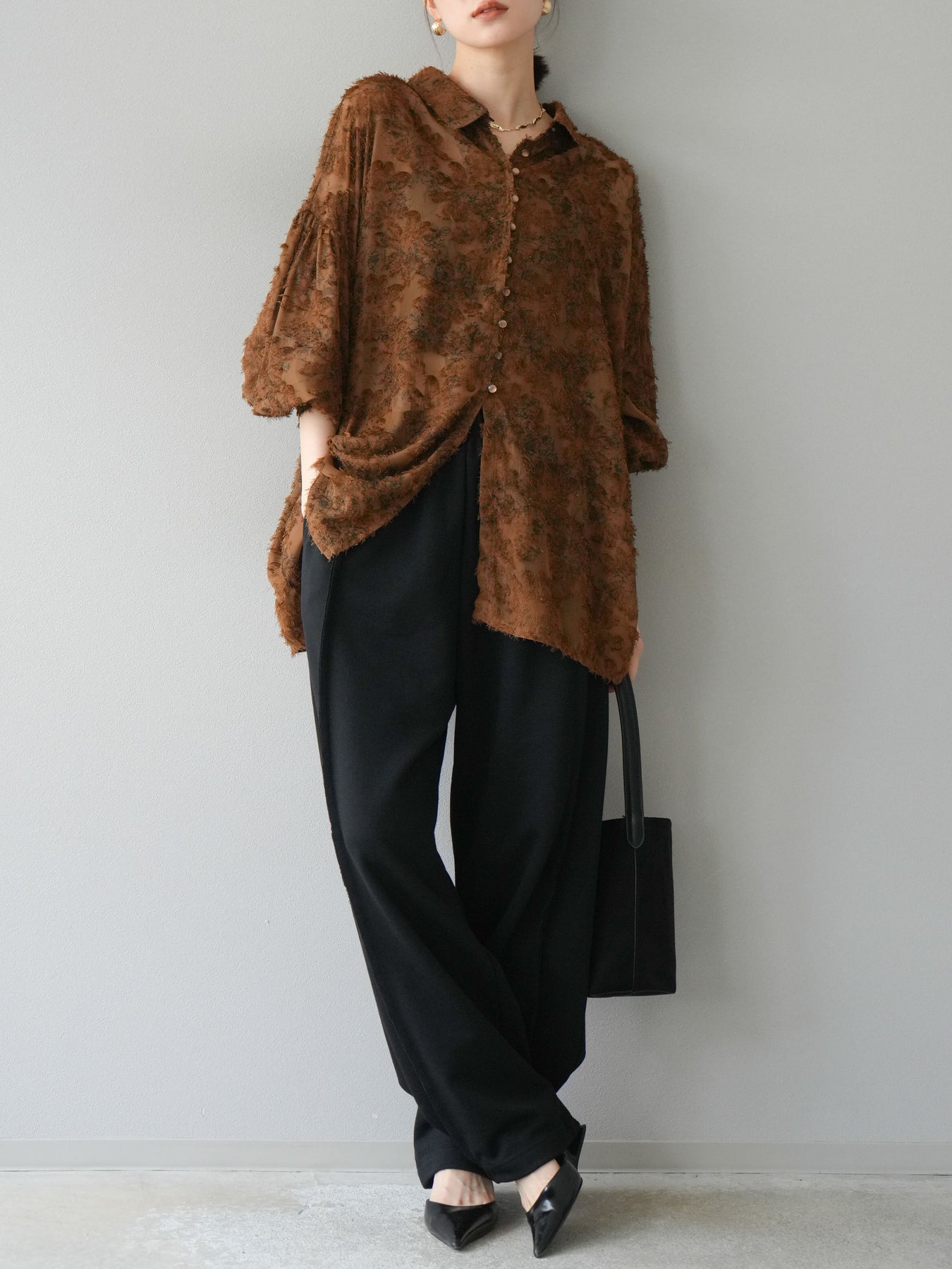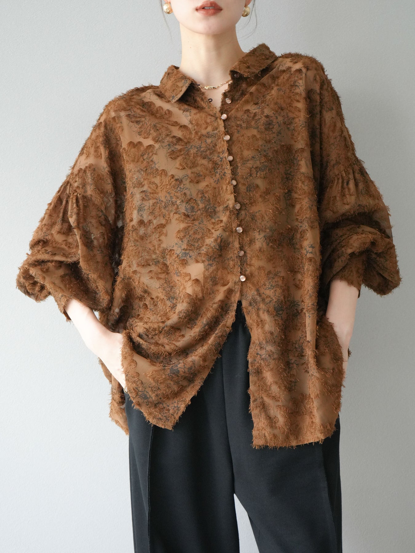 立体感のあるフリンジジャガード素材を使用した、ボリュームスリーブブラウス。軽やかな透け感と華やかな表情が魅力で、1枚でコーディネートの主役に。ゆったりとしたシルエットに長めの丈感で、パンツにもスカートにも合わせやすいデザインです。袖口にはギャザーを施し、ふんわりとしたボリューム感を演出。前開き仕様で羽織りとしても活躍します。 ※ボトムス、キャミソール(インナー)以外の商品は一律でインナーは付属していません
