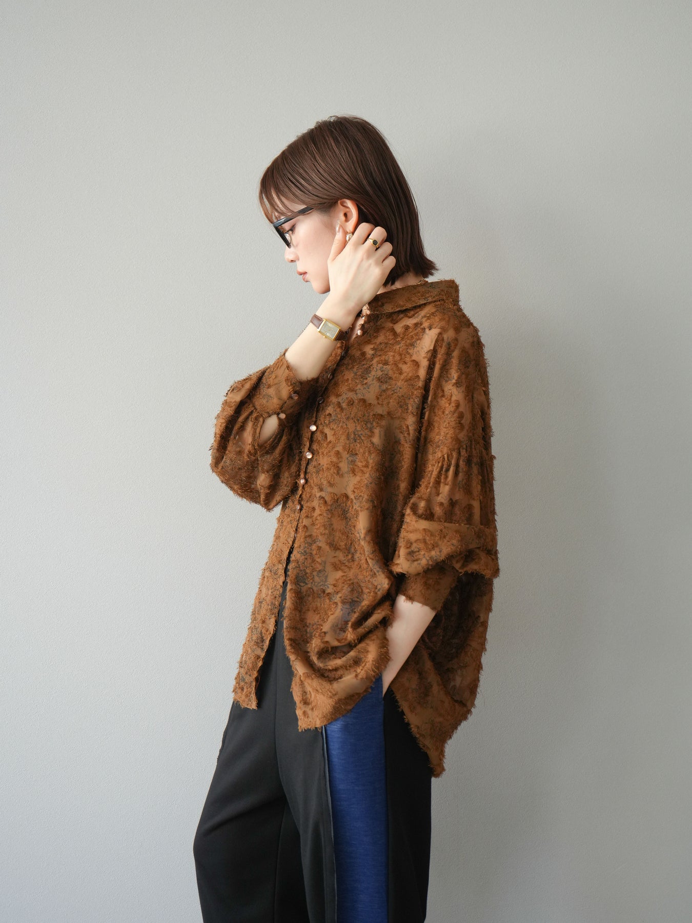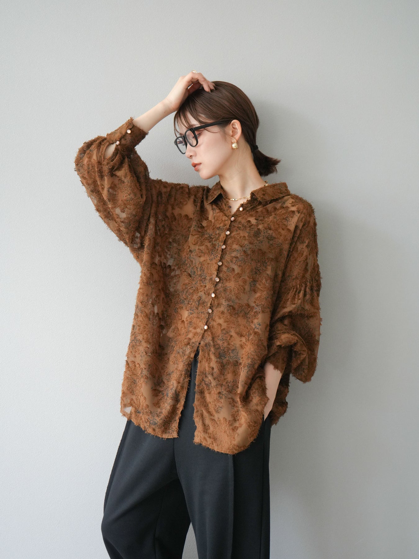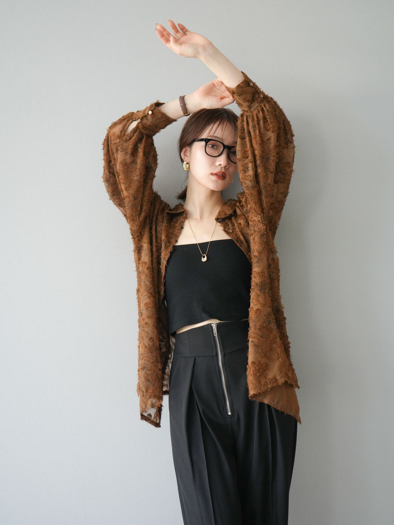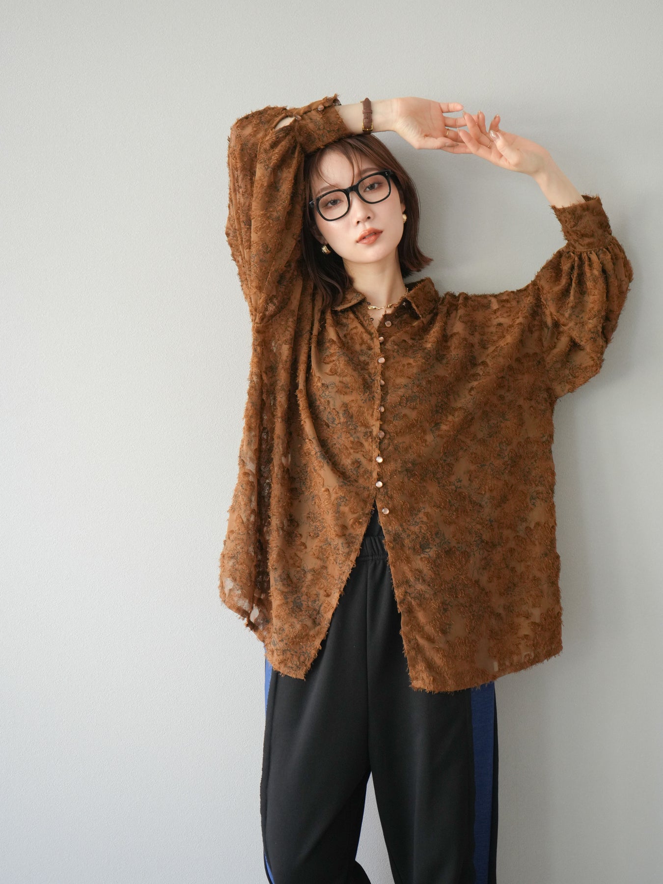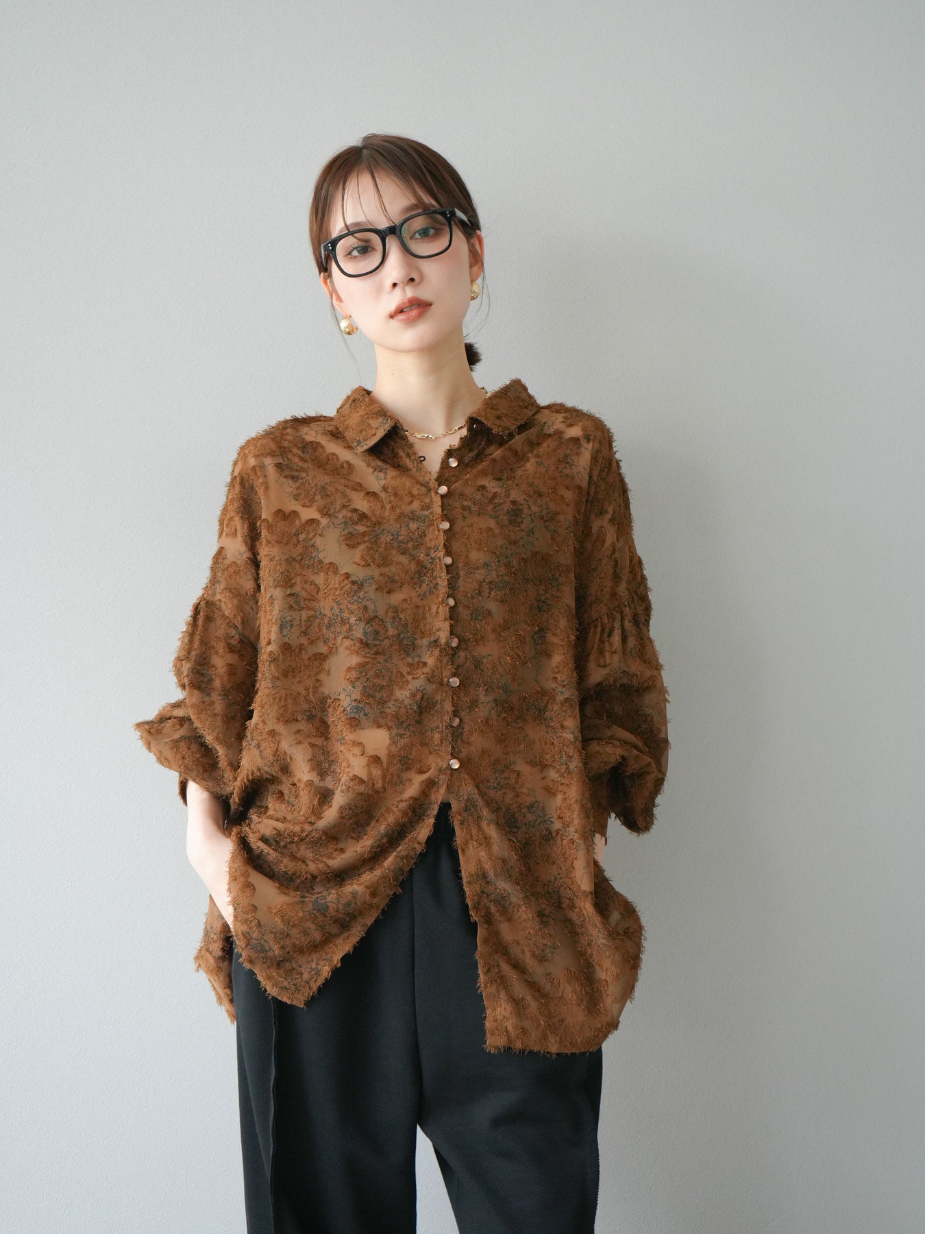 立体感のあるフリンジジャガード素材を使用した、ボリュームスリーブブラウス。軽やかな透け感と華やかな表情が魅力で、1枚でコーディネートの主役に。ゆったりとしたシルエットに長めの丈感で、パンツにもスカートにも合わせやすいデザインです。袖口にはギャザーを施し、ふんわりとしたボリューム感を演出。前開き仕様で羽織りとしても活躍します。 ※ボトムス、キャミソール(インナー)以外の商品は一律でインナーは付属していません