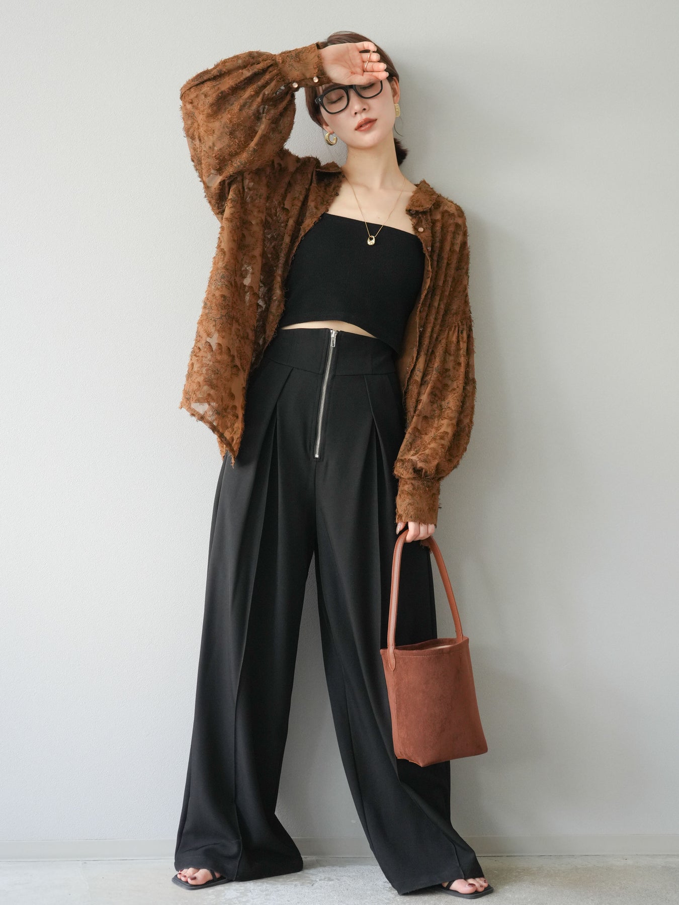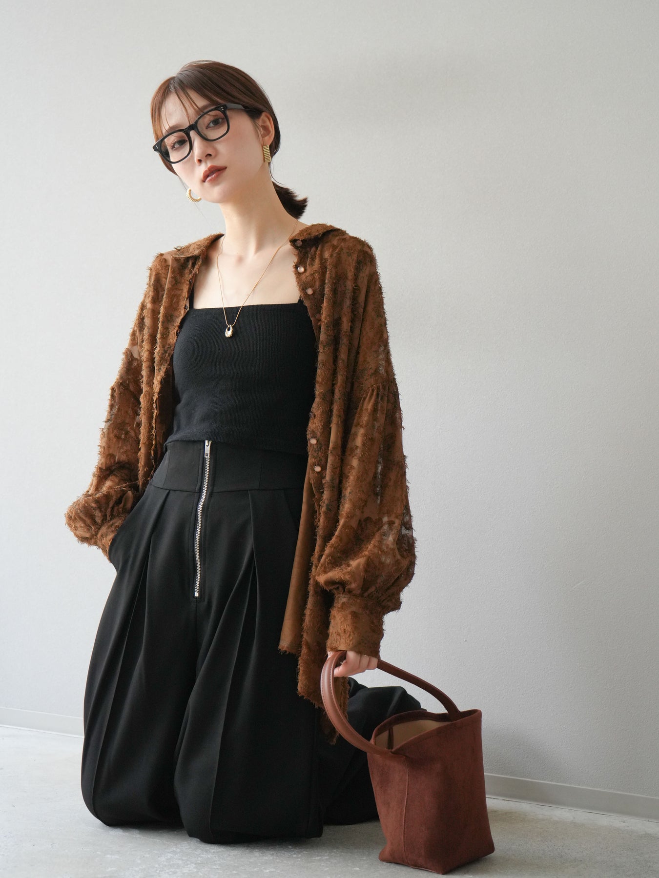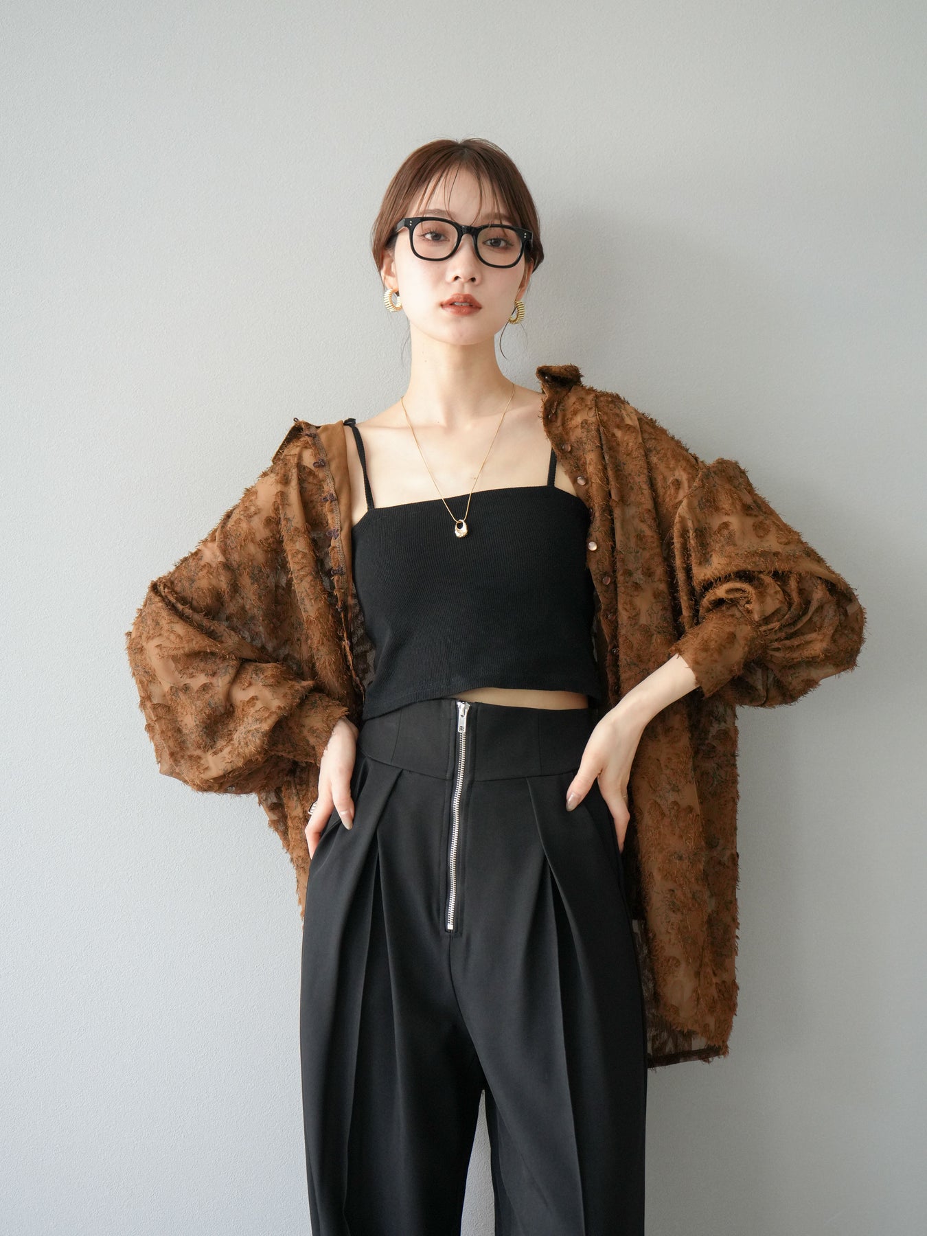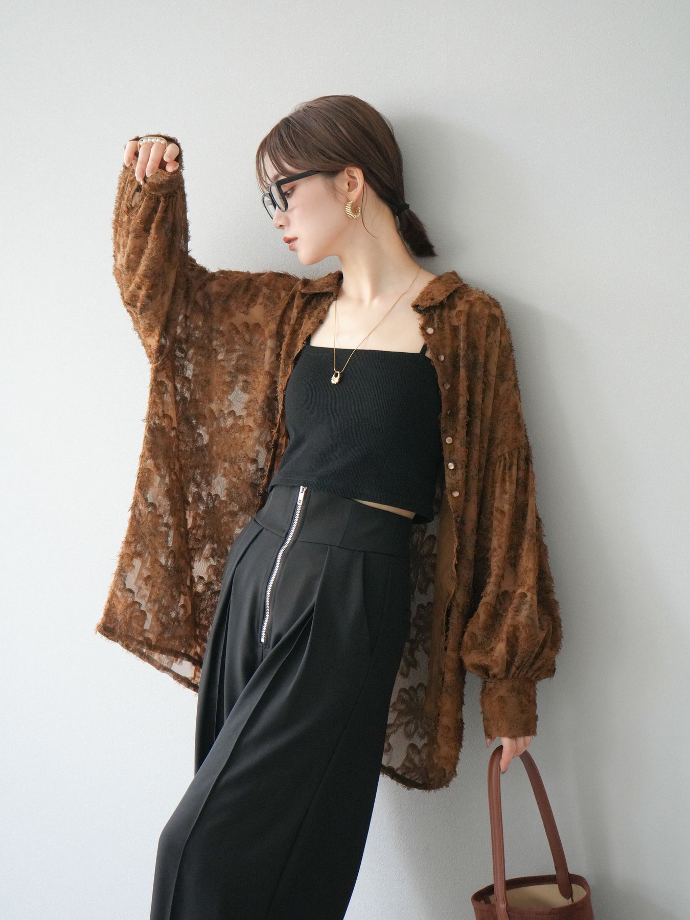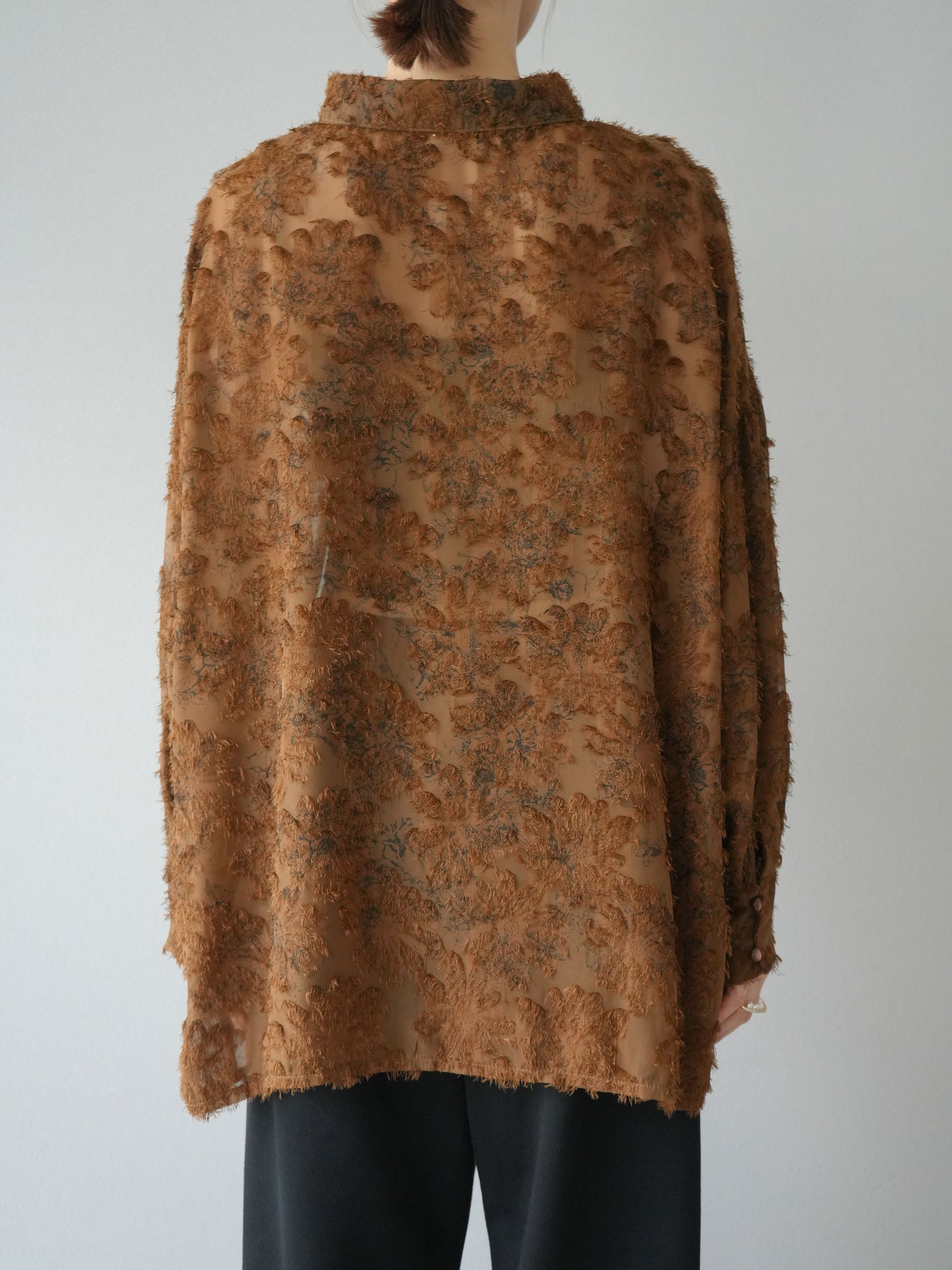 立体感のあるフリンジジャガード素材を使用した、ボリュームスリーブブラウス。軽やかな透け感と華やかな表情が魅力で、1枚でコーディネートの主役に。ゆったりとしたシルエットに長めの丈感で、パンツにもスカートにも合わせやすいデザインです。袖口にはギャザーを施し、ふんわりとしたボリューム感を演出。前開き仕様で羽織りとしても活躍します。 ※ボトムス、キャミソール(インナー)以外の商品は一律でインナーは付属していません