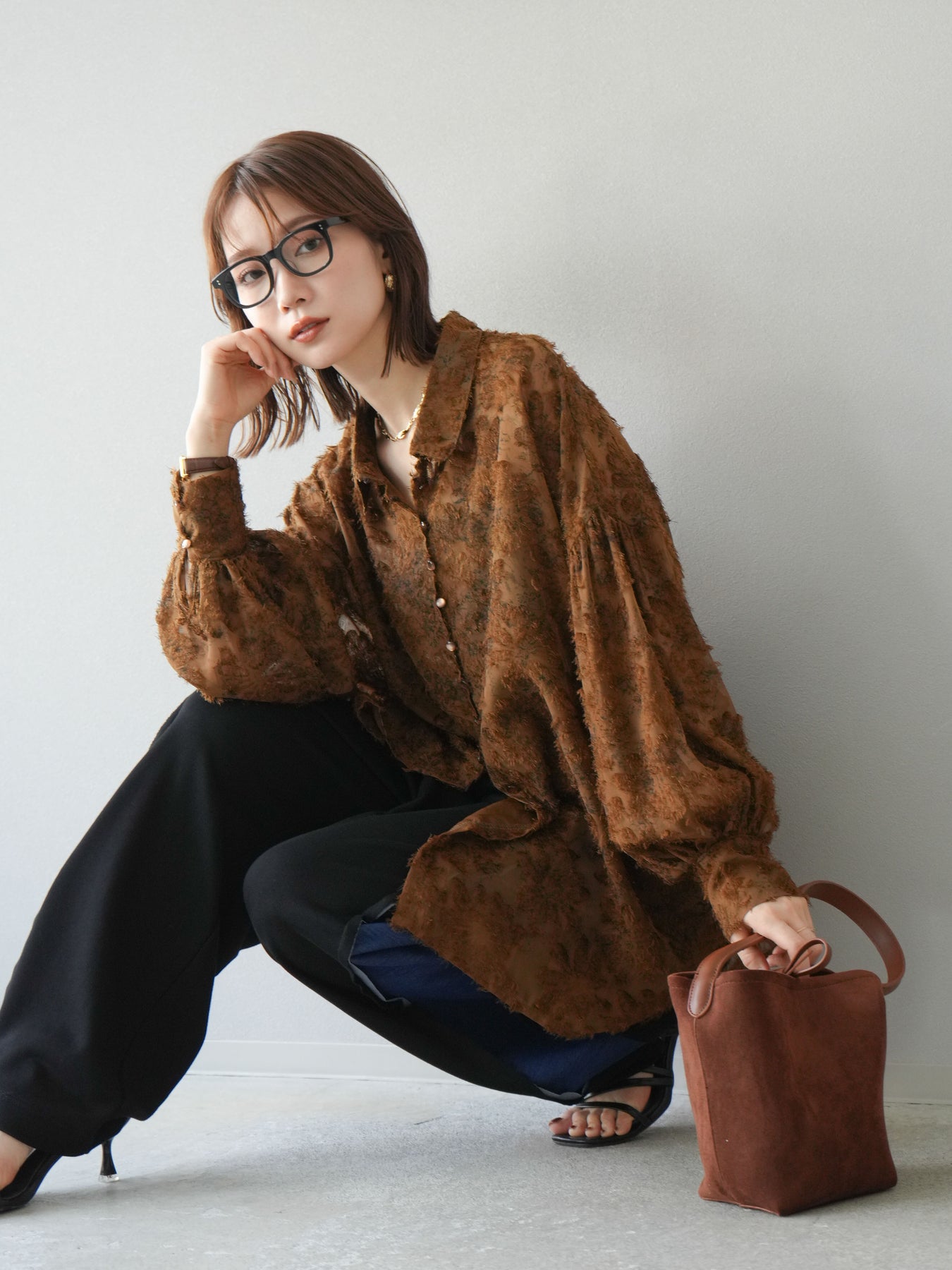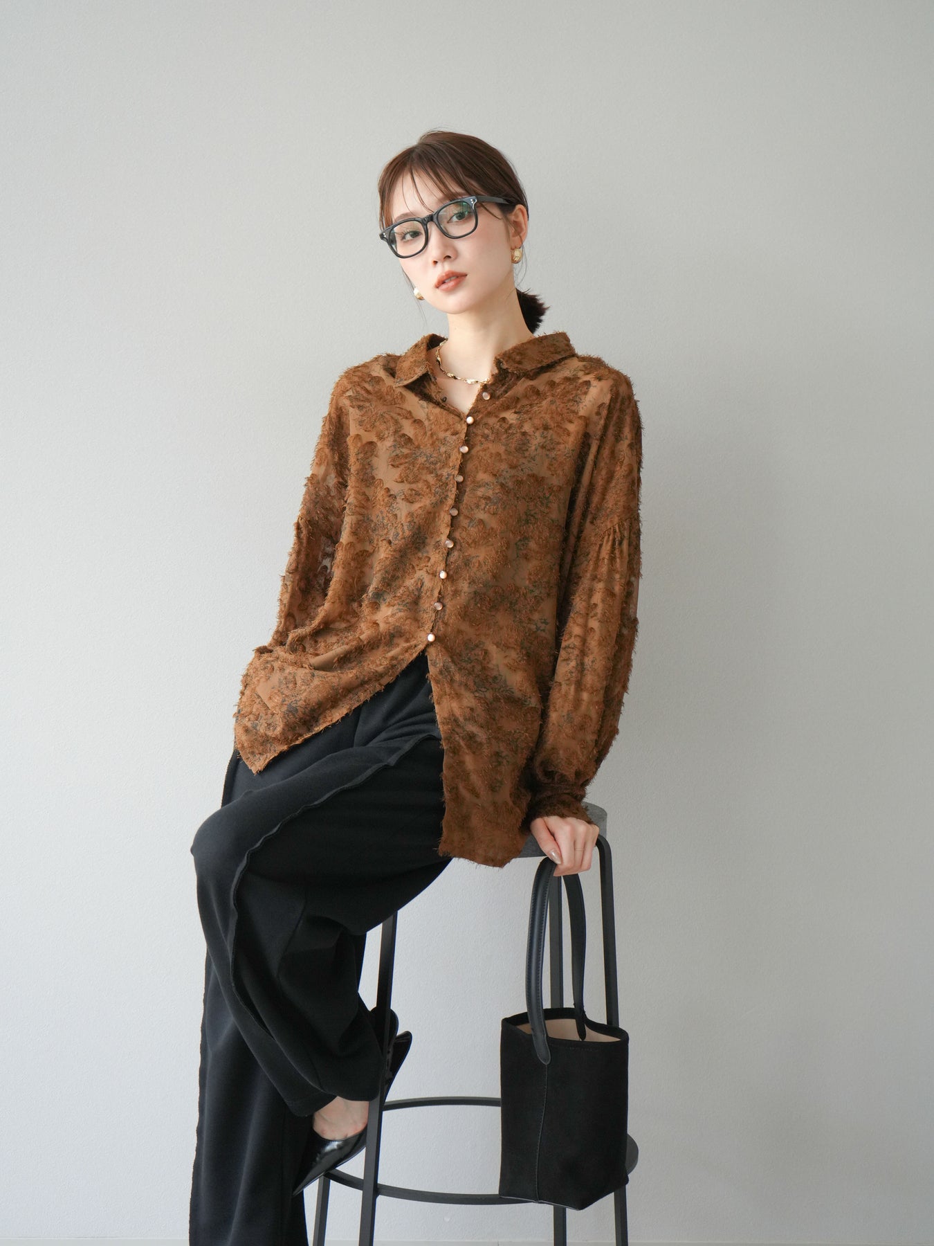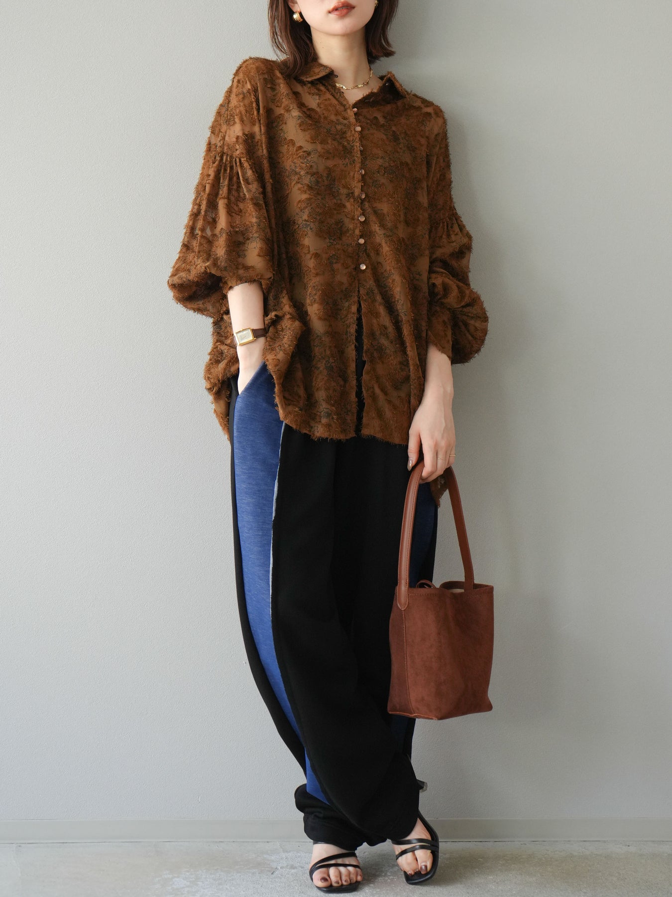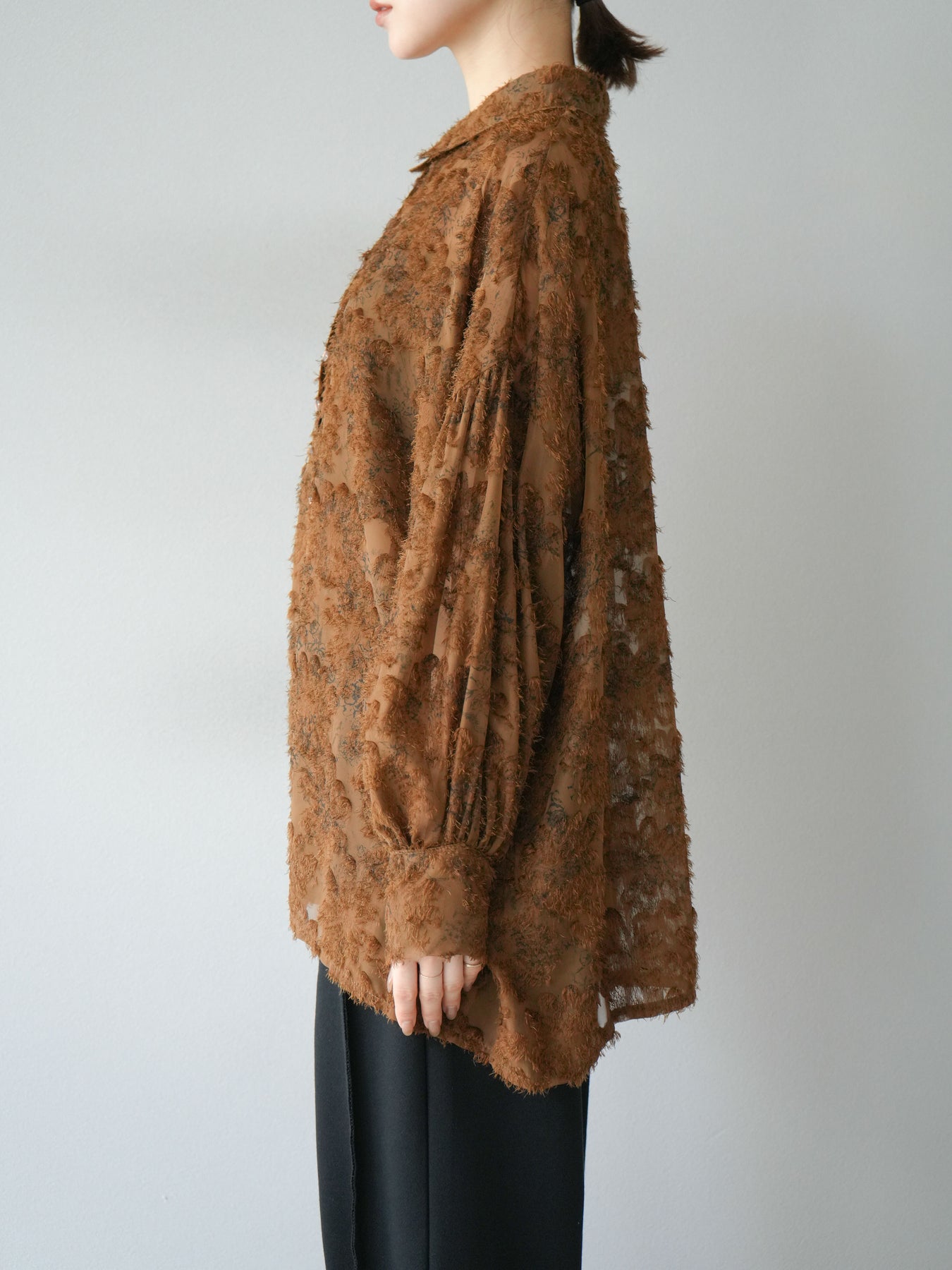 [予約]ニュアンスフリンジジャガードボリュームスリーブブラウス/ブラウン