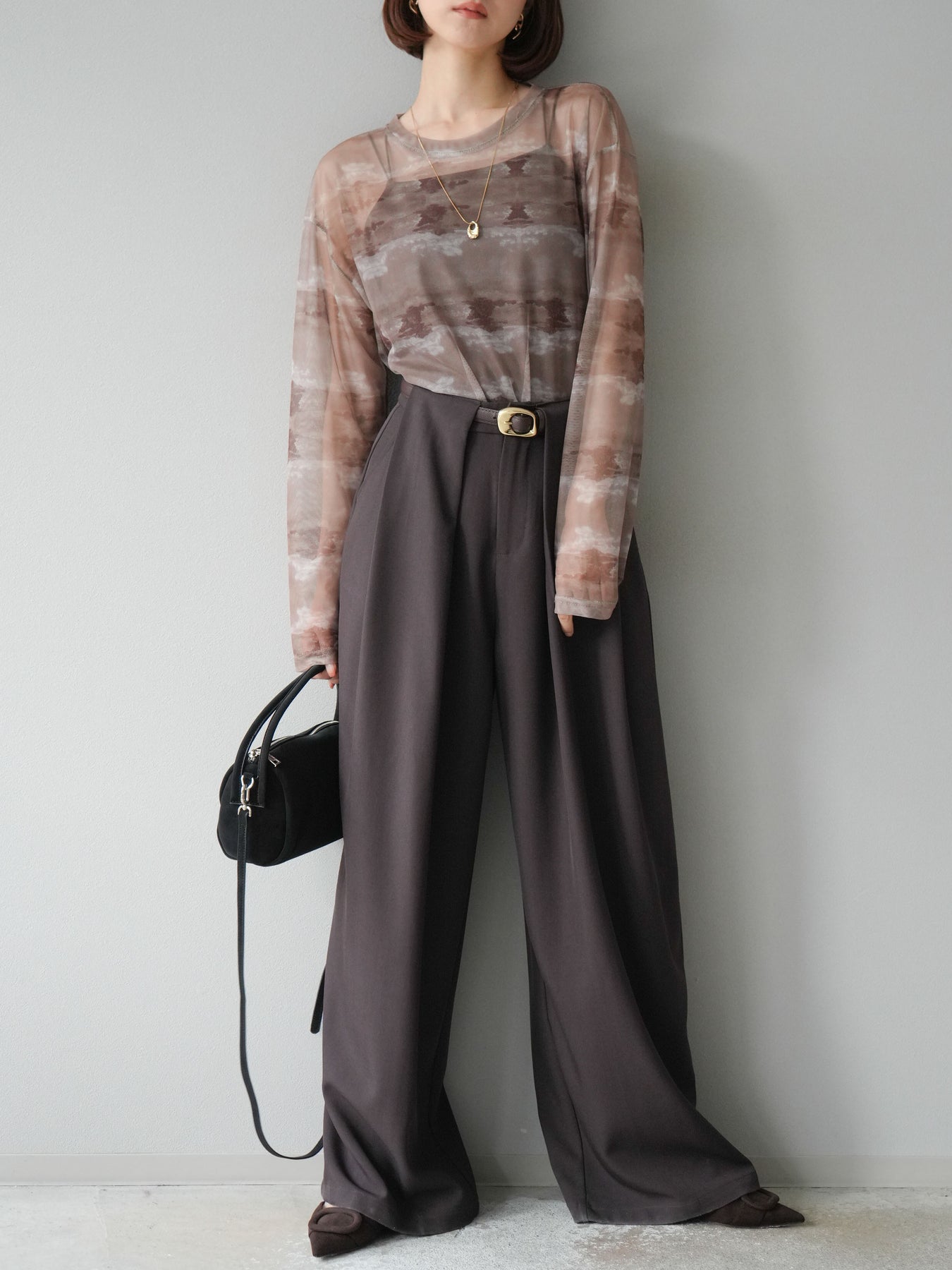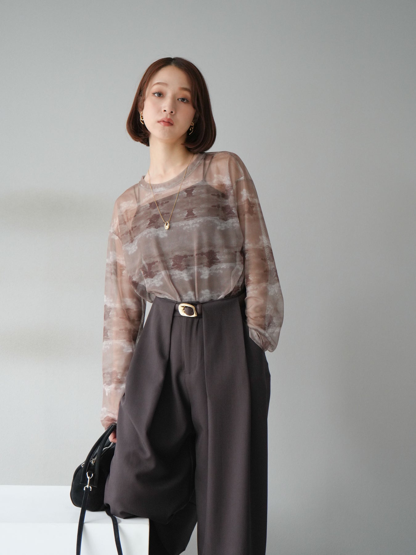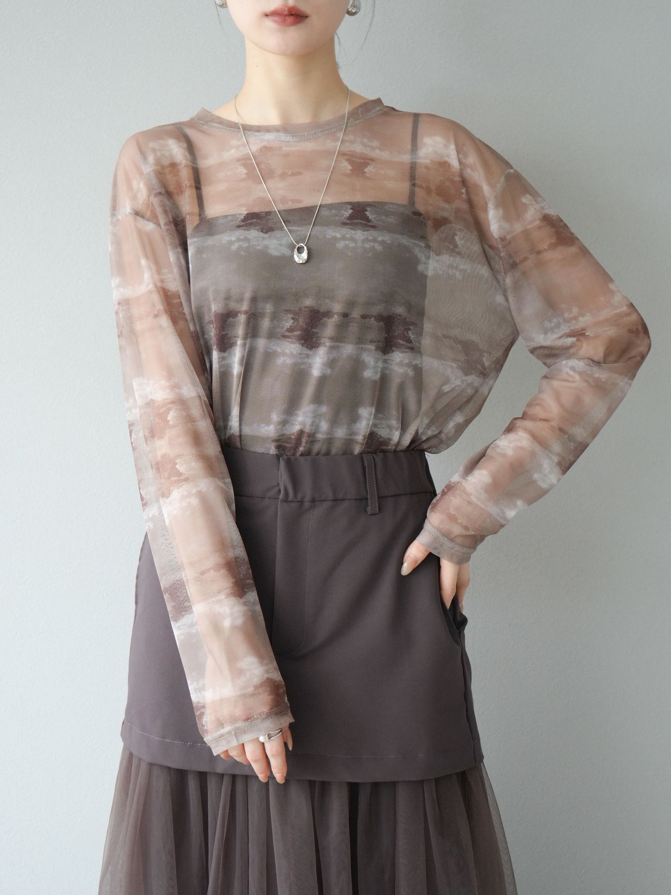 ニュアンス感のあるプリントを施したシアートップス。透け感のある軽やかな素材が女性らしい抜け感を演出し、スタイリングにモードな雰囲気をプラスします。程よくフィットするシルエットでインナーとしても着やすく、キャミソールやベアトップを合わせれば1枚でも着映えする万能アイテム。柄の表情が豊かなので、シンプルなボトムスと合わせても存在感があり、コーディネートの主役として活躍します。季節の変わり目にはジャケットやカーディガンのインナーとして取り入れるのもおすすめです。 ※ボトムス、キャミソール(インナー)以外の商品は一律でインナーは付属していません。