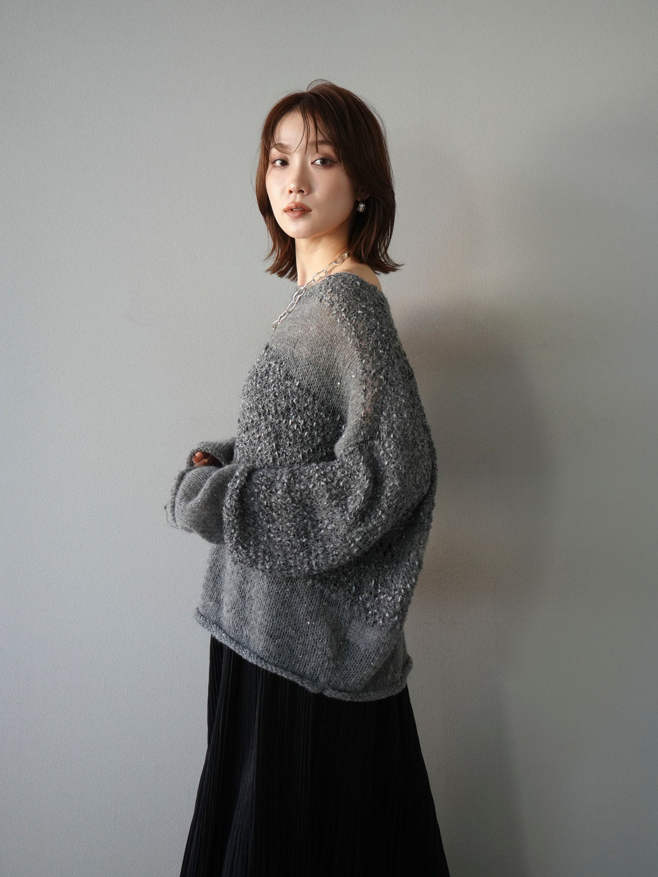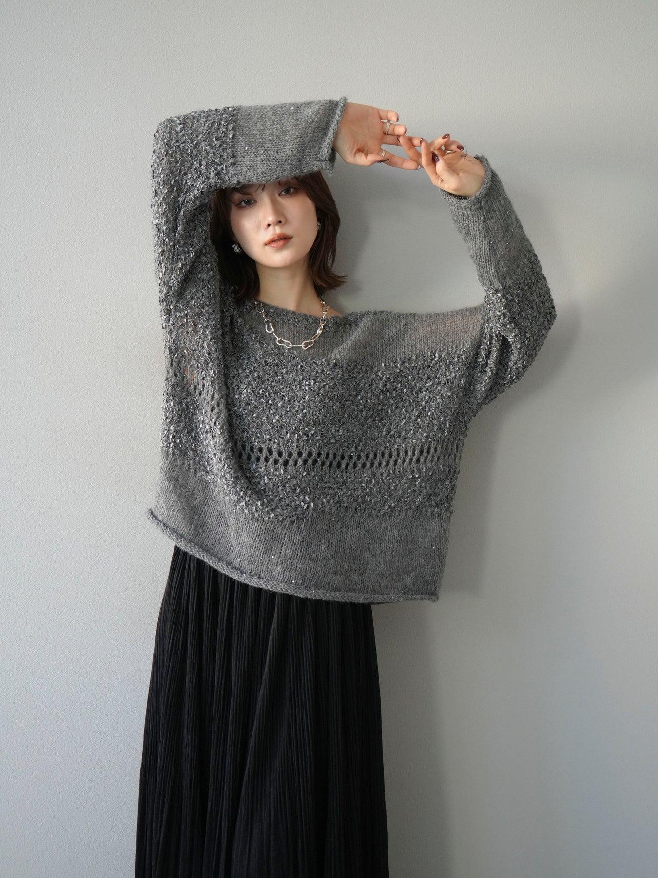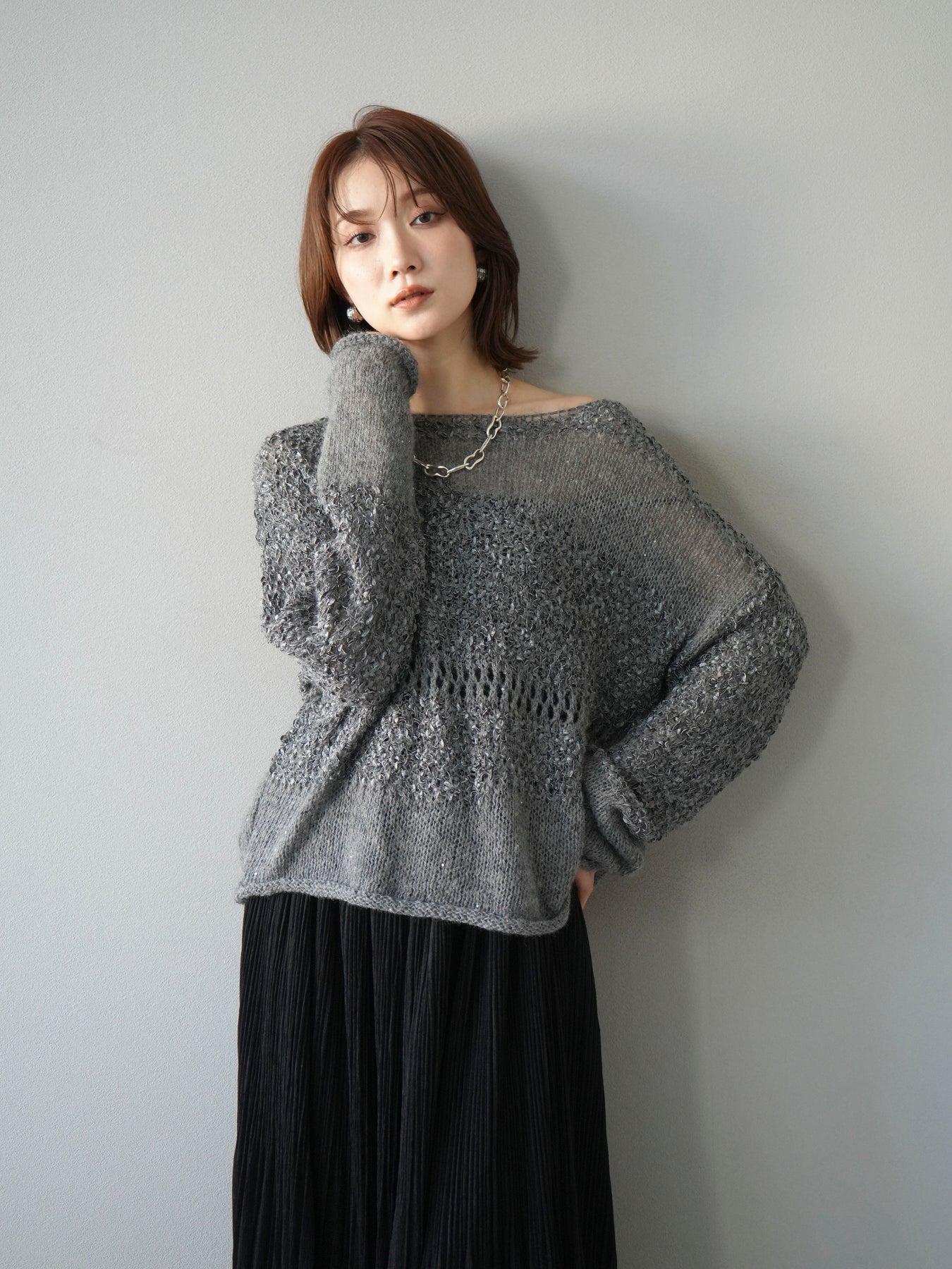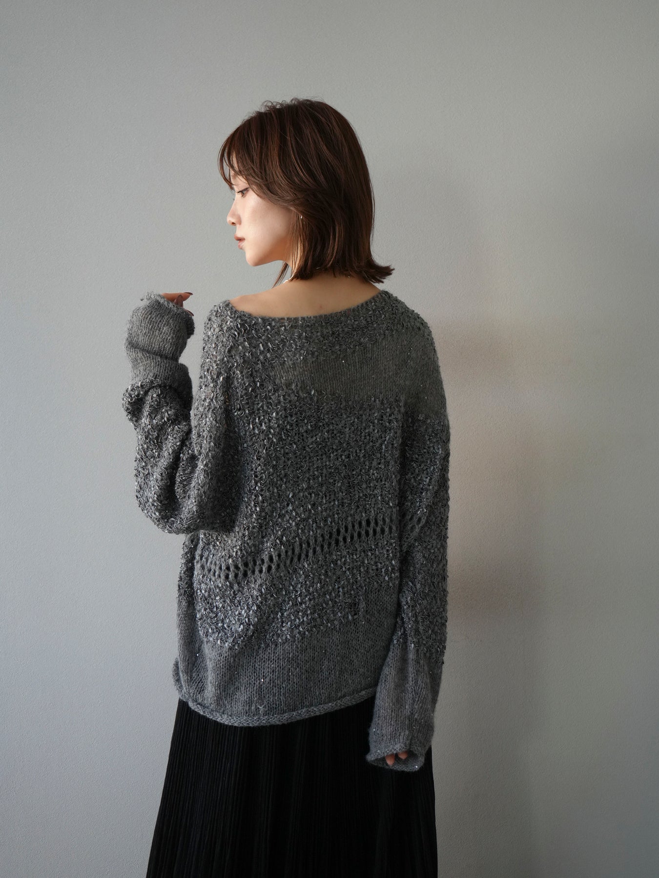 [予約]ミックスヤーンデザイン編みメッシュニットプルオーバー/グレー