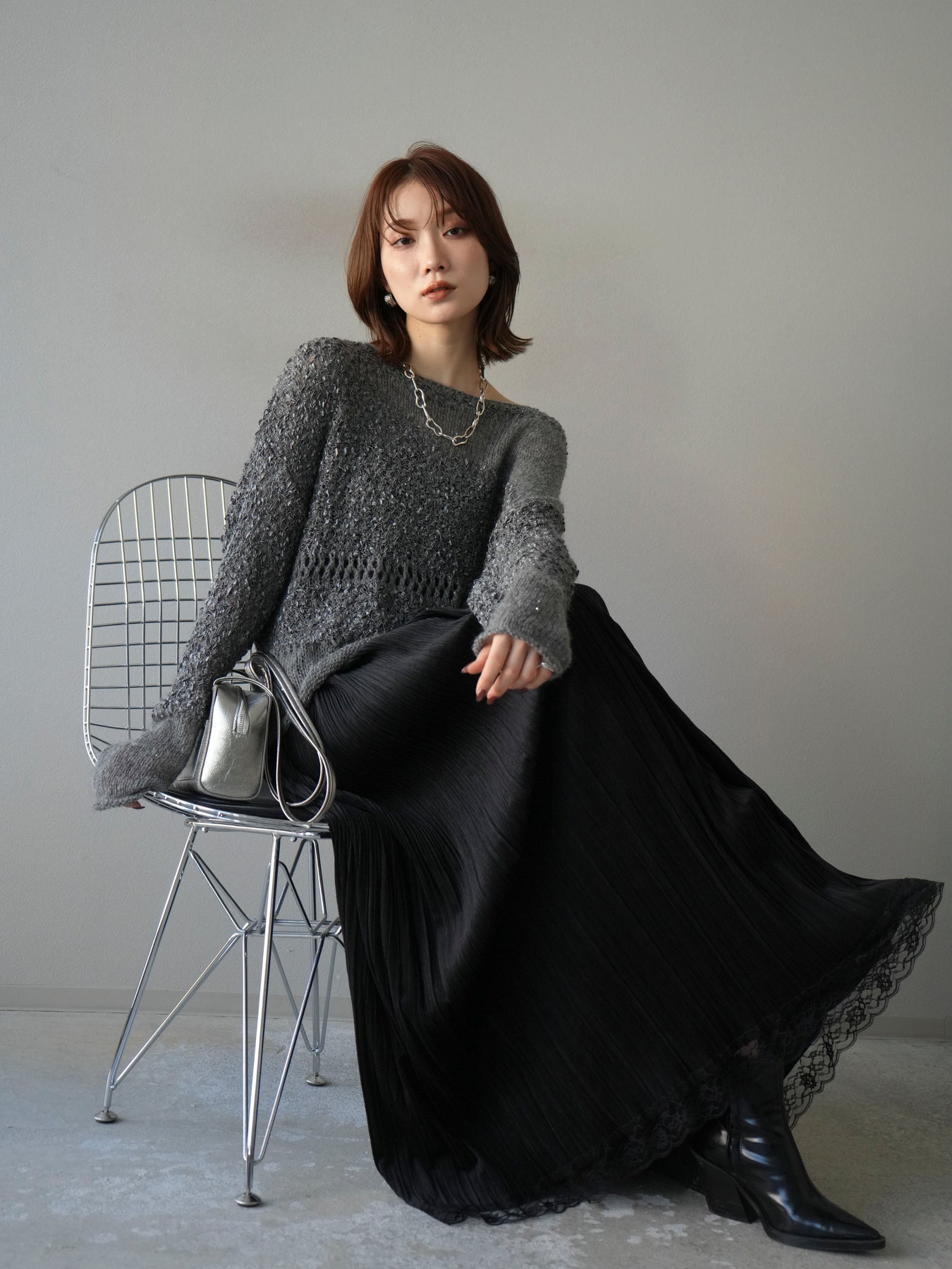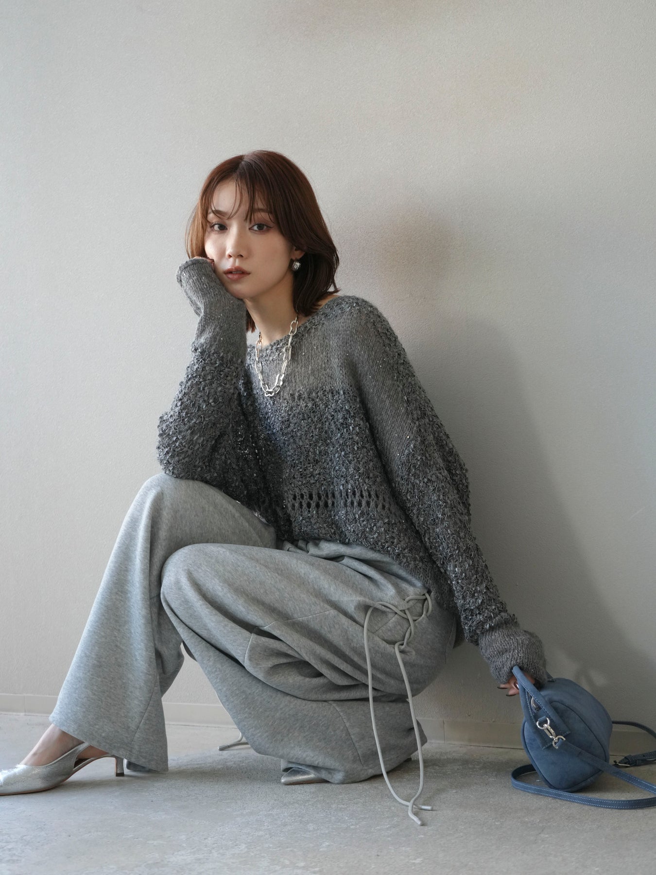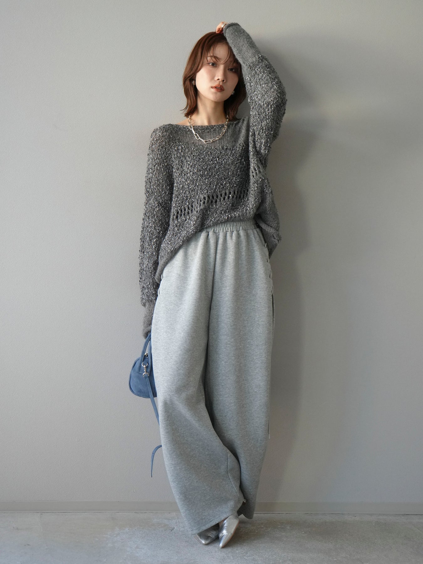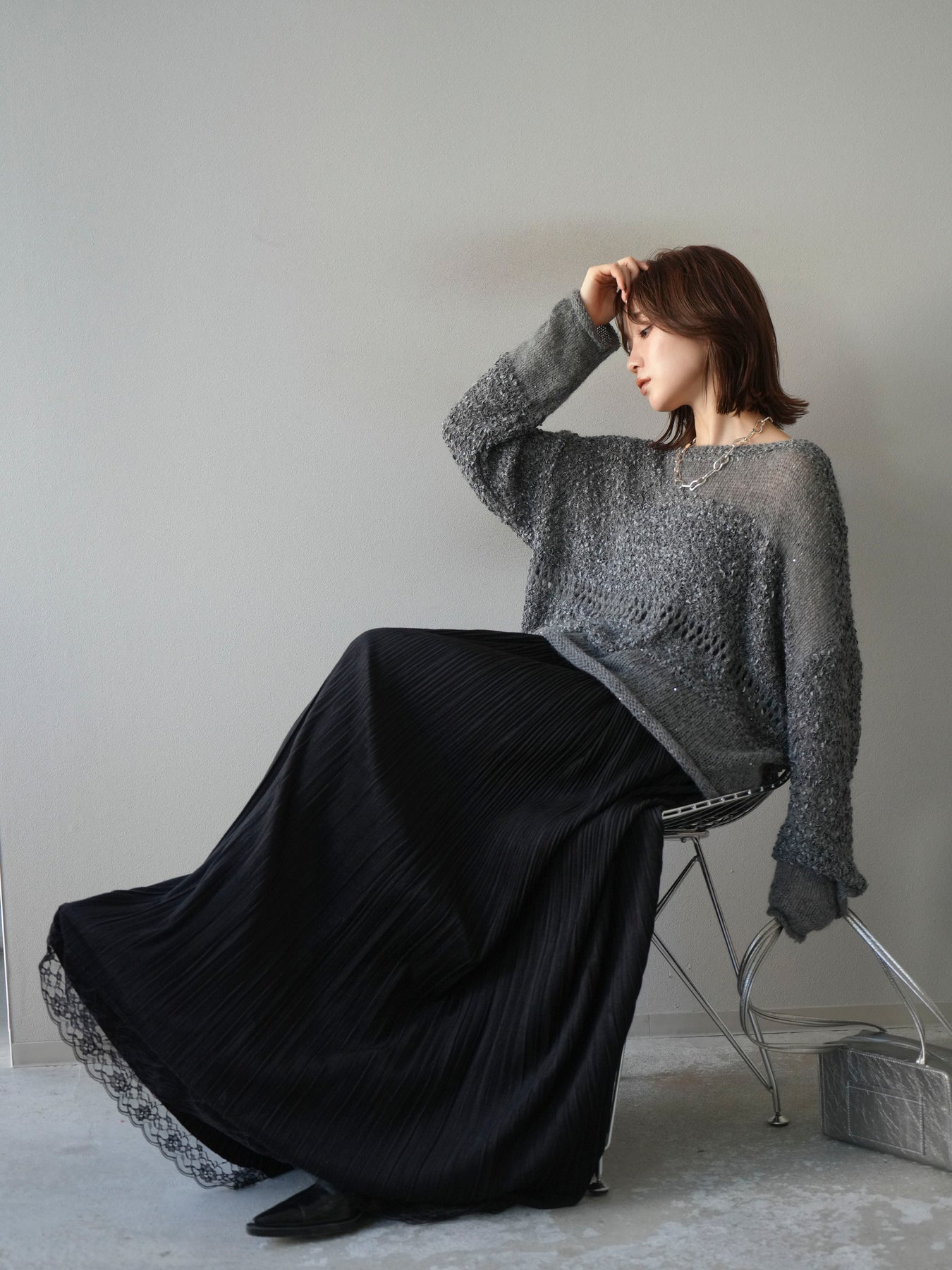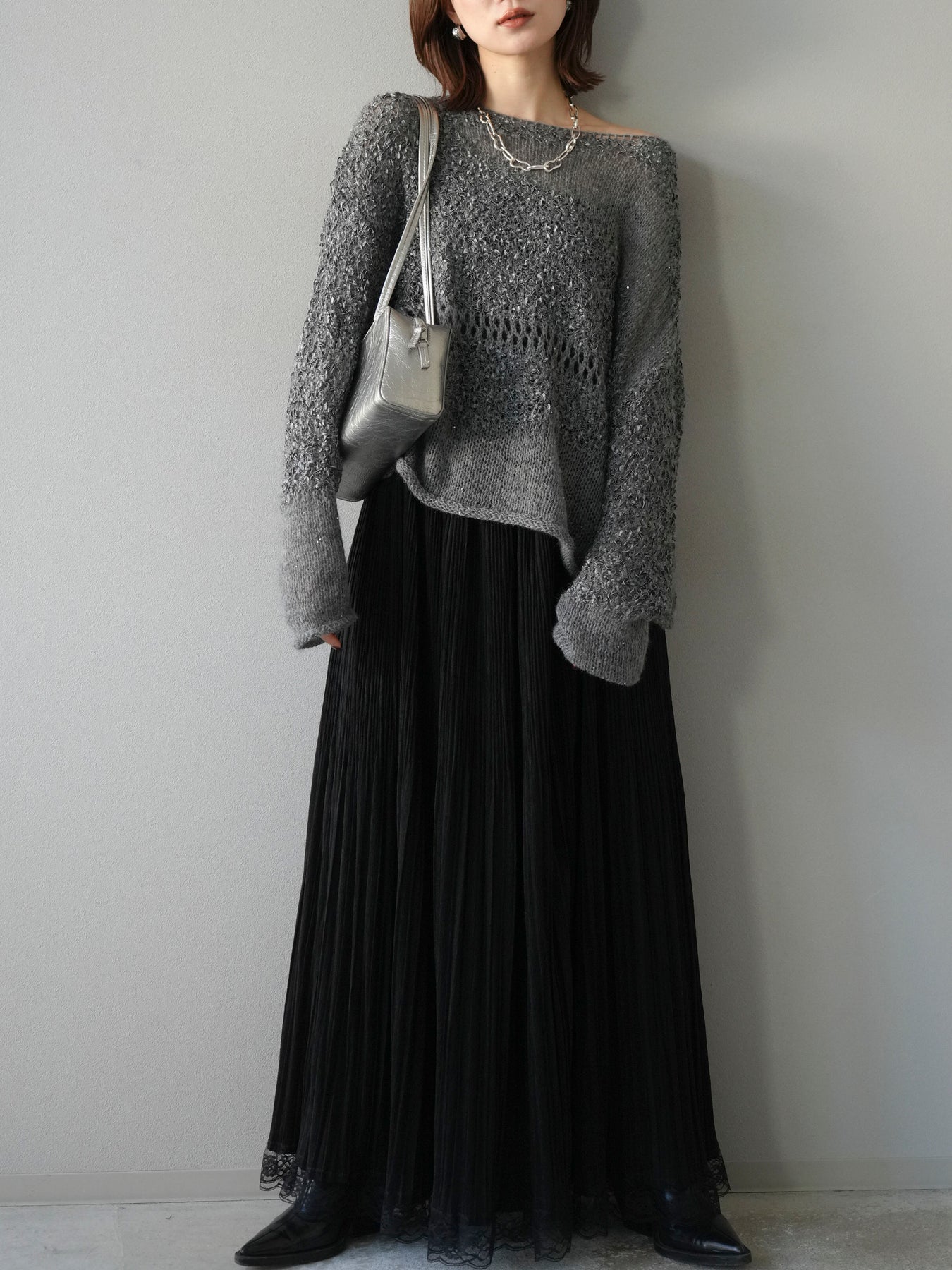 [予約]ミックスヤーンデザイン編みメッシュニットプルオーバー/グレー