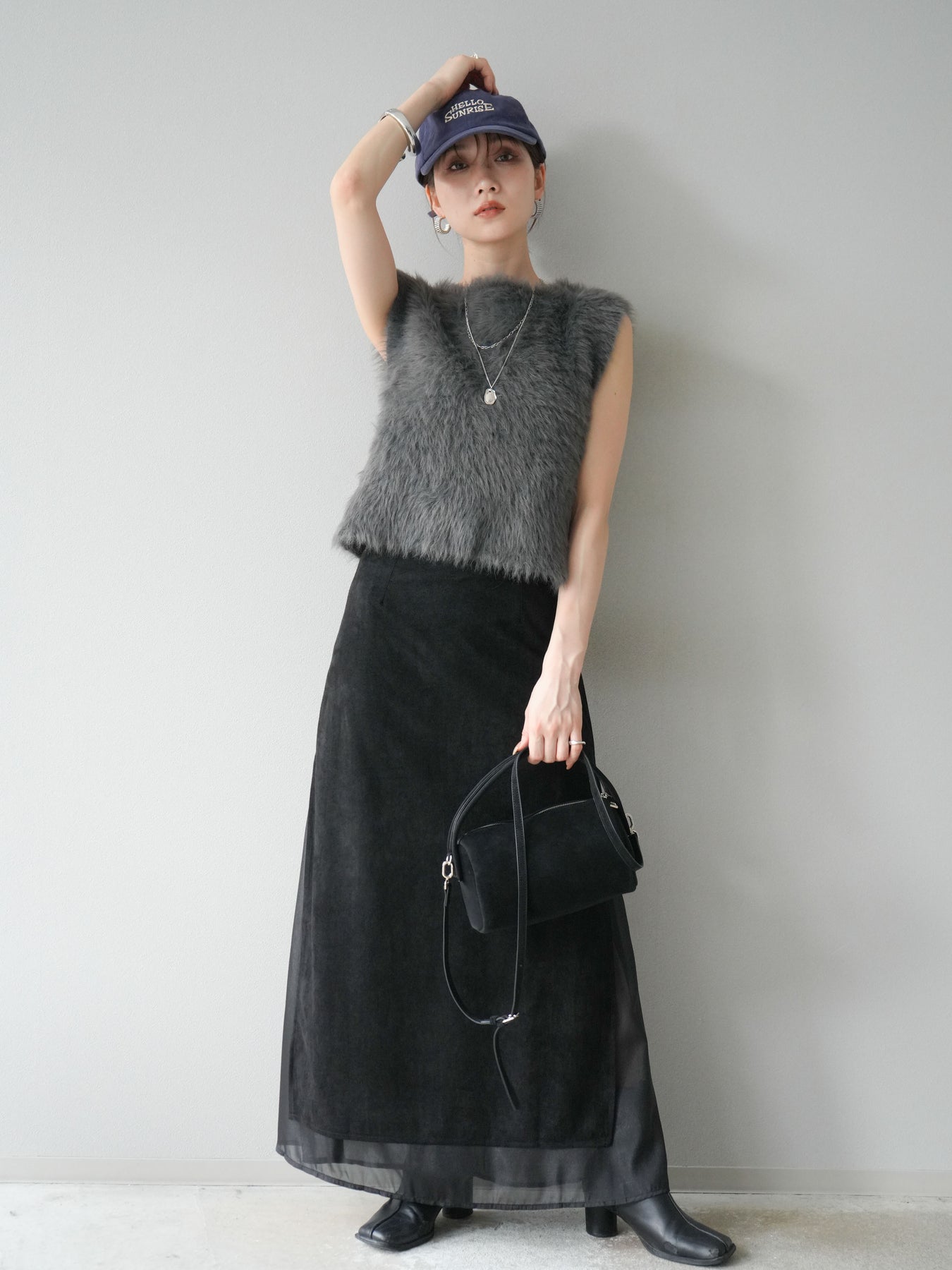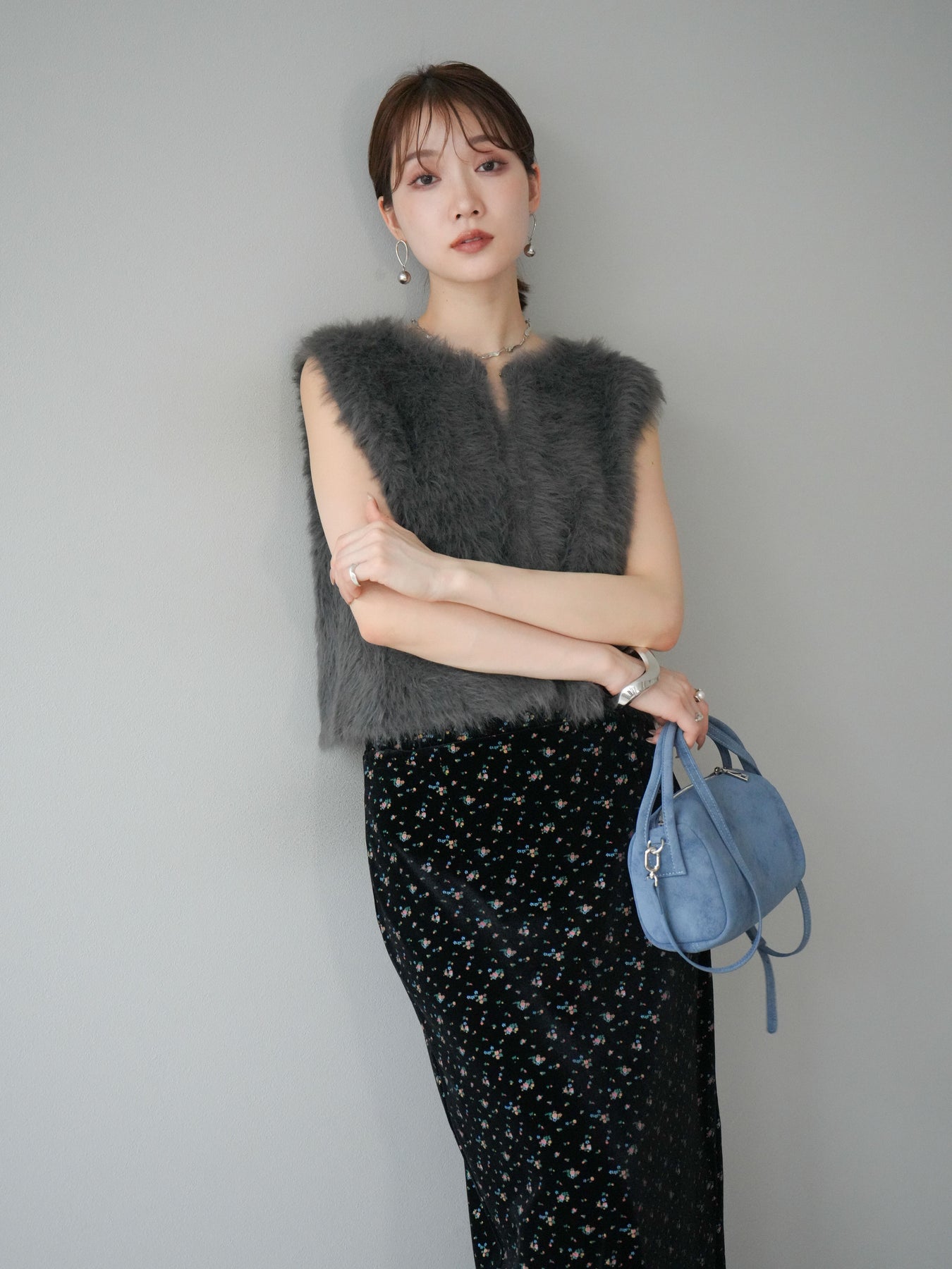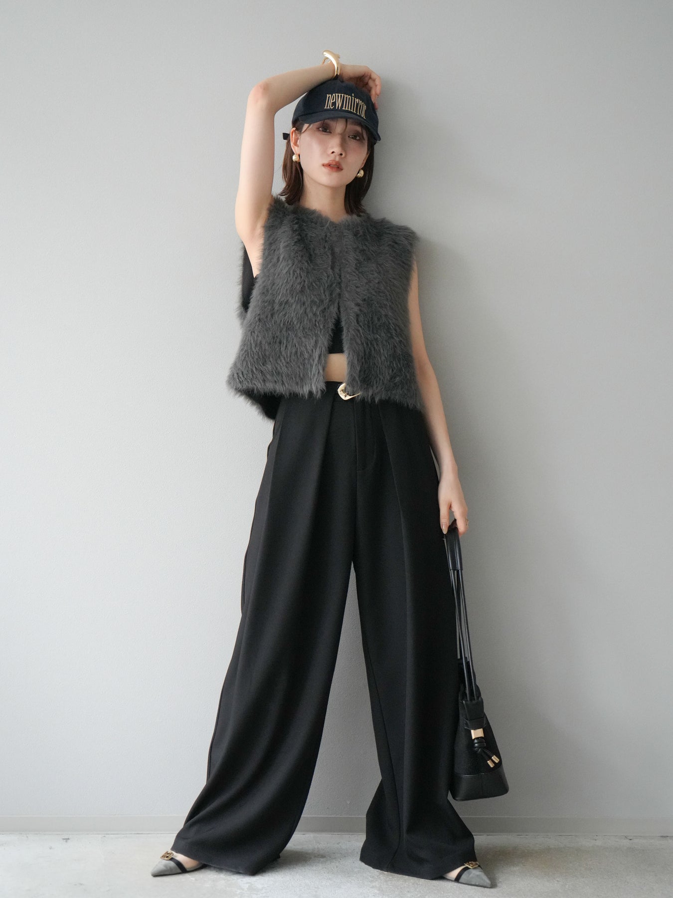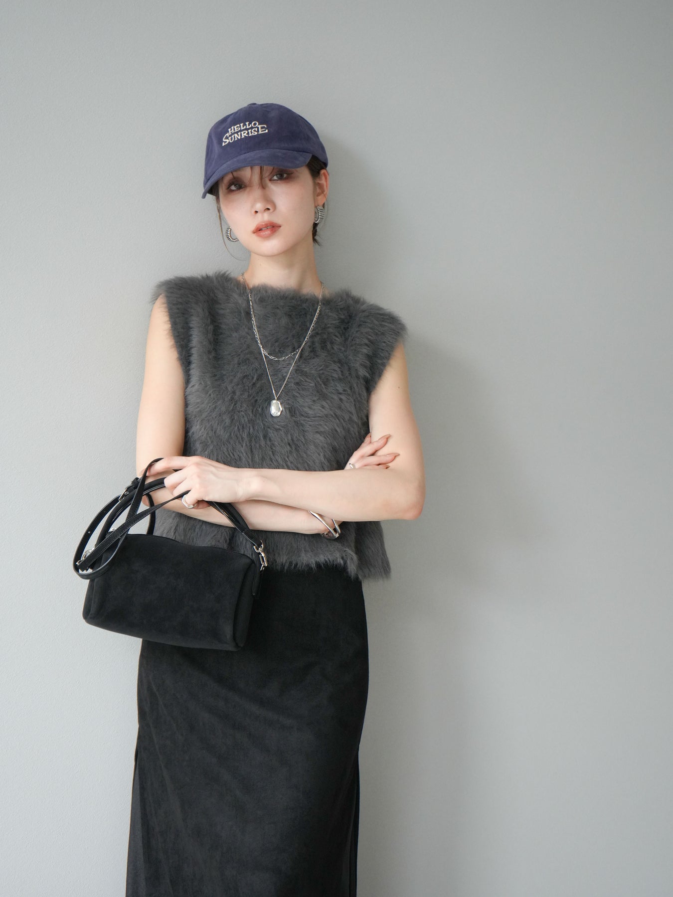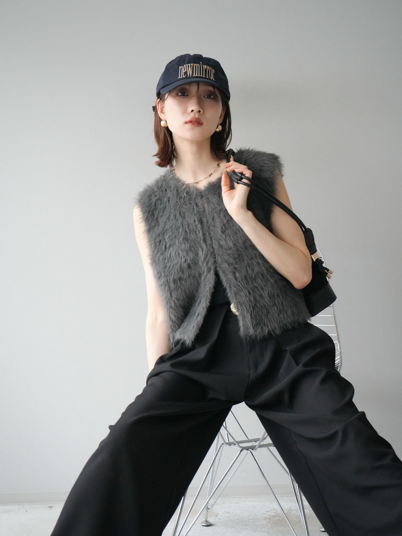 毛足の長いフェイクファーを使用し、ミンクのようなリッチな質感を表現したショートジレ。前後2WAY仕様で、シンプルなクルーネック側とボタンディテール側を気分やコーディネートに合わせて着回せるのが魅力です。コンパクトな丈感がバランスを取りやすく、ワイドパンツやロングスカートとも好相性。羽織るだけでシーズンムードを高め、シンプルなスタイリングを華やかに格上げしてくれます。デイリーから特別なシーンまで活躍する、存在感のあるアイテムです。 ※ボトムス、キャミソール(インナー)以外の商品は一律でインナーは付属していません。