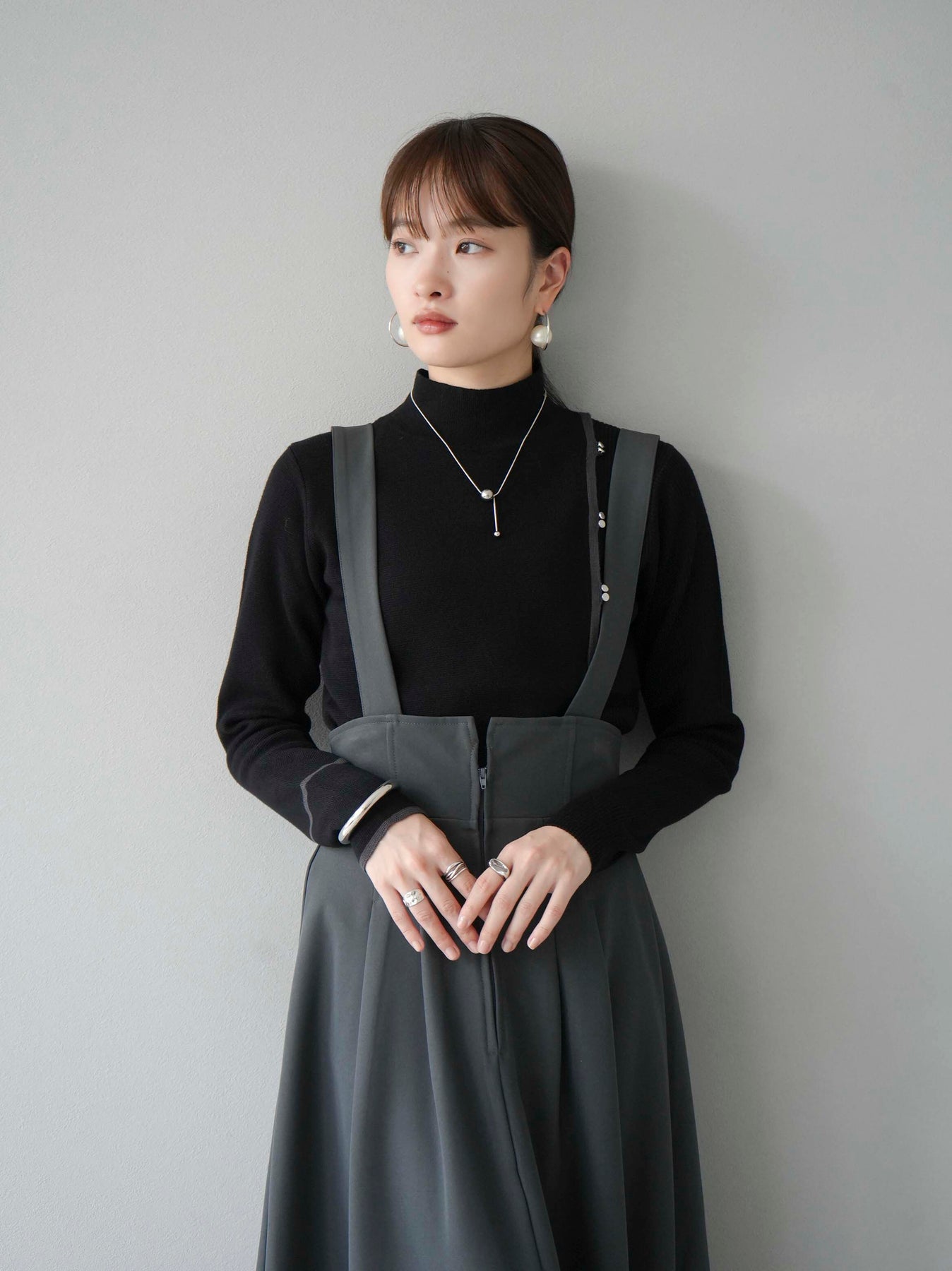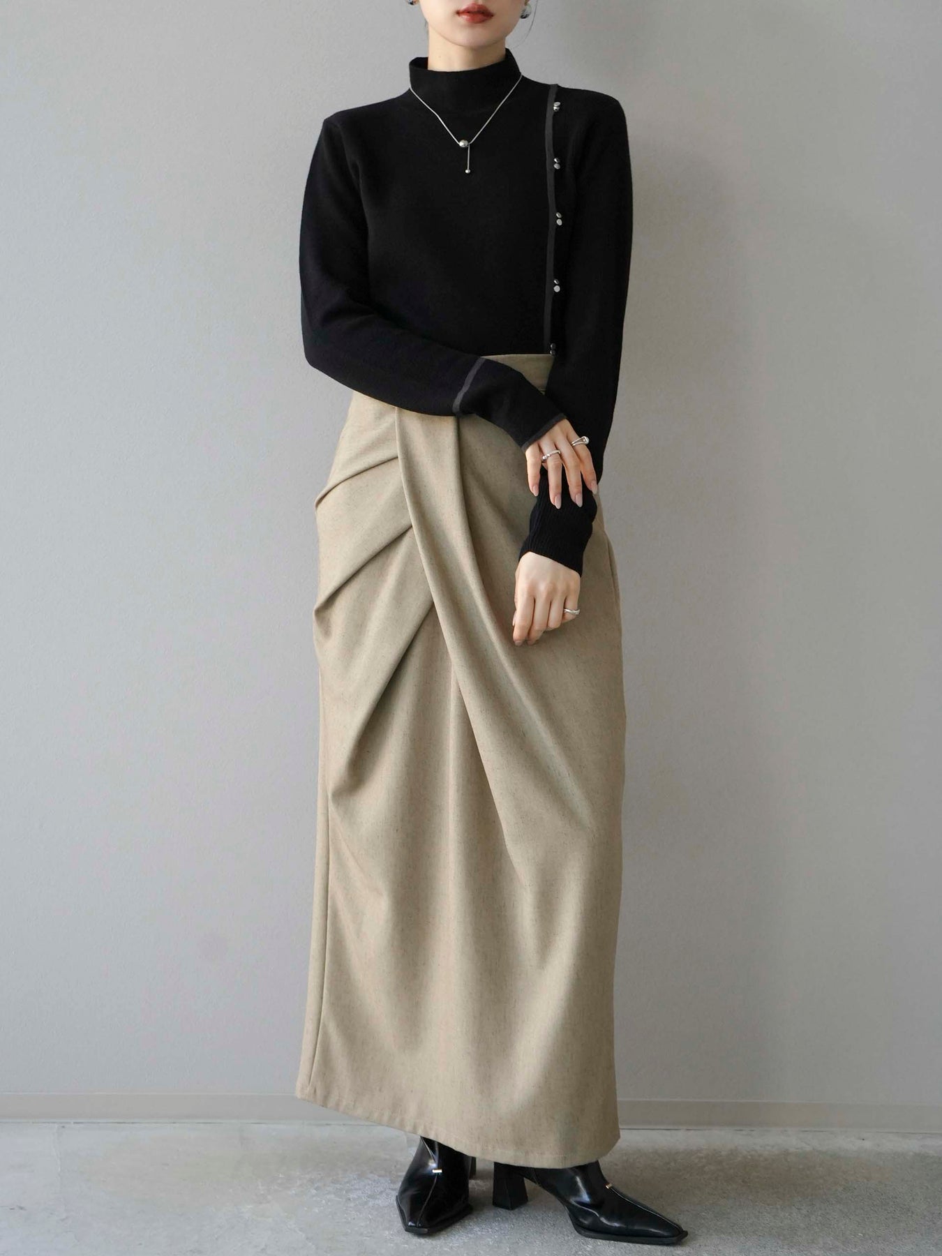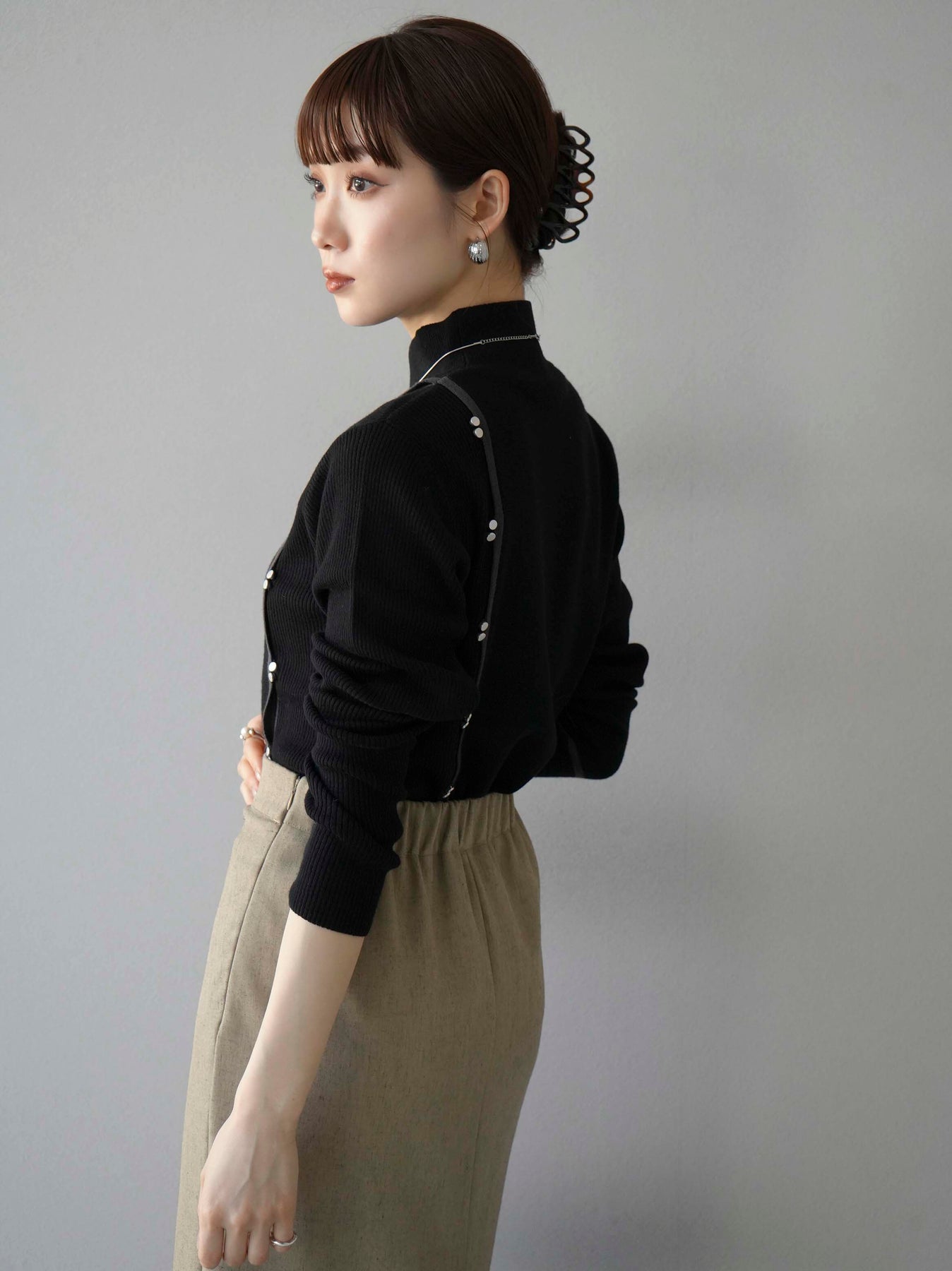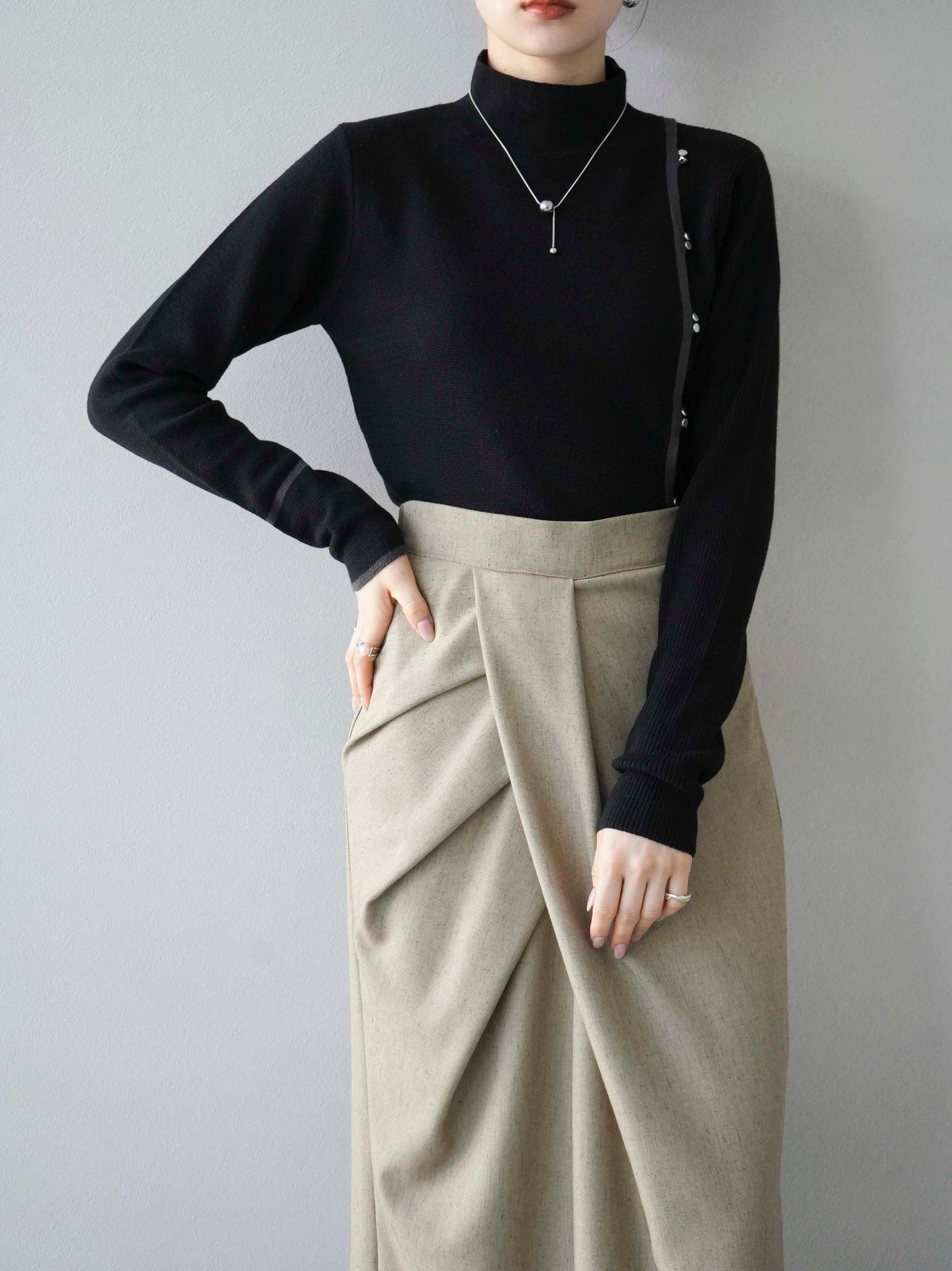 [予約]ボトルネック配色デザインボタンニットトップス/ブラック