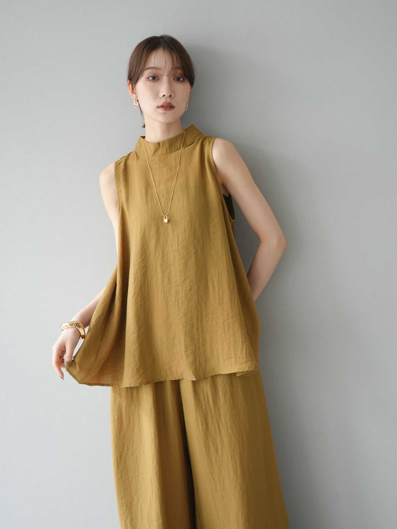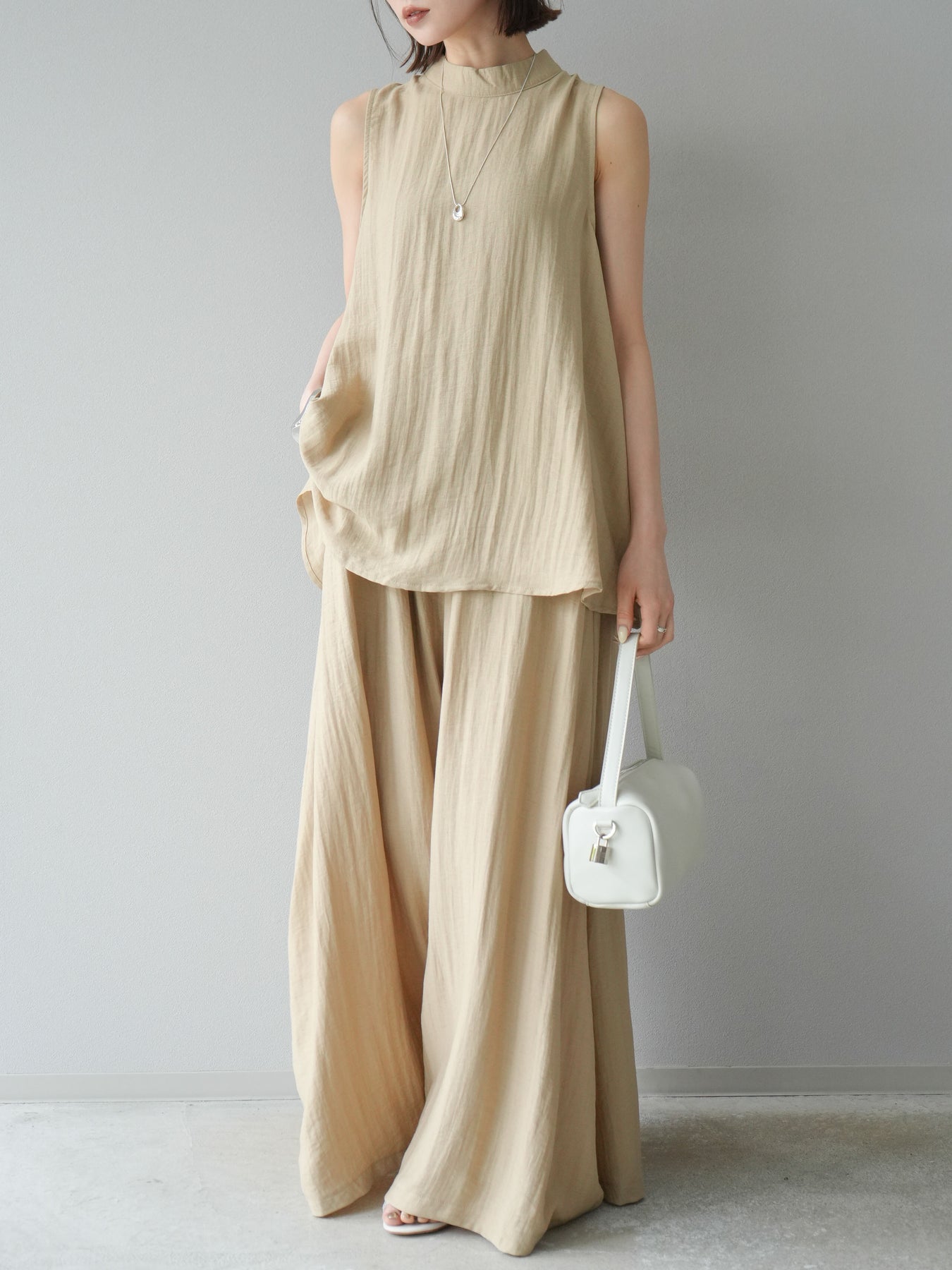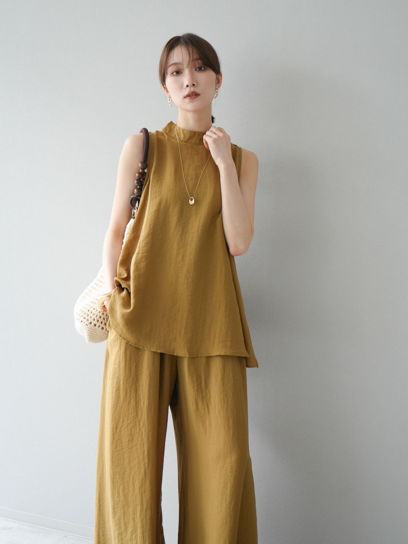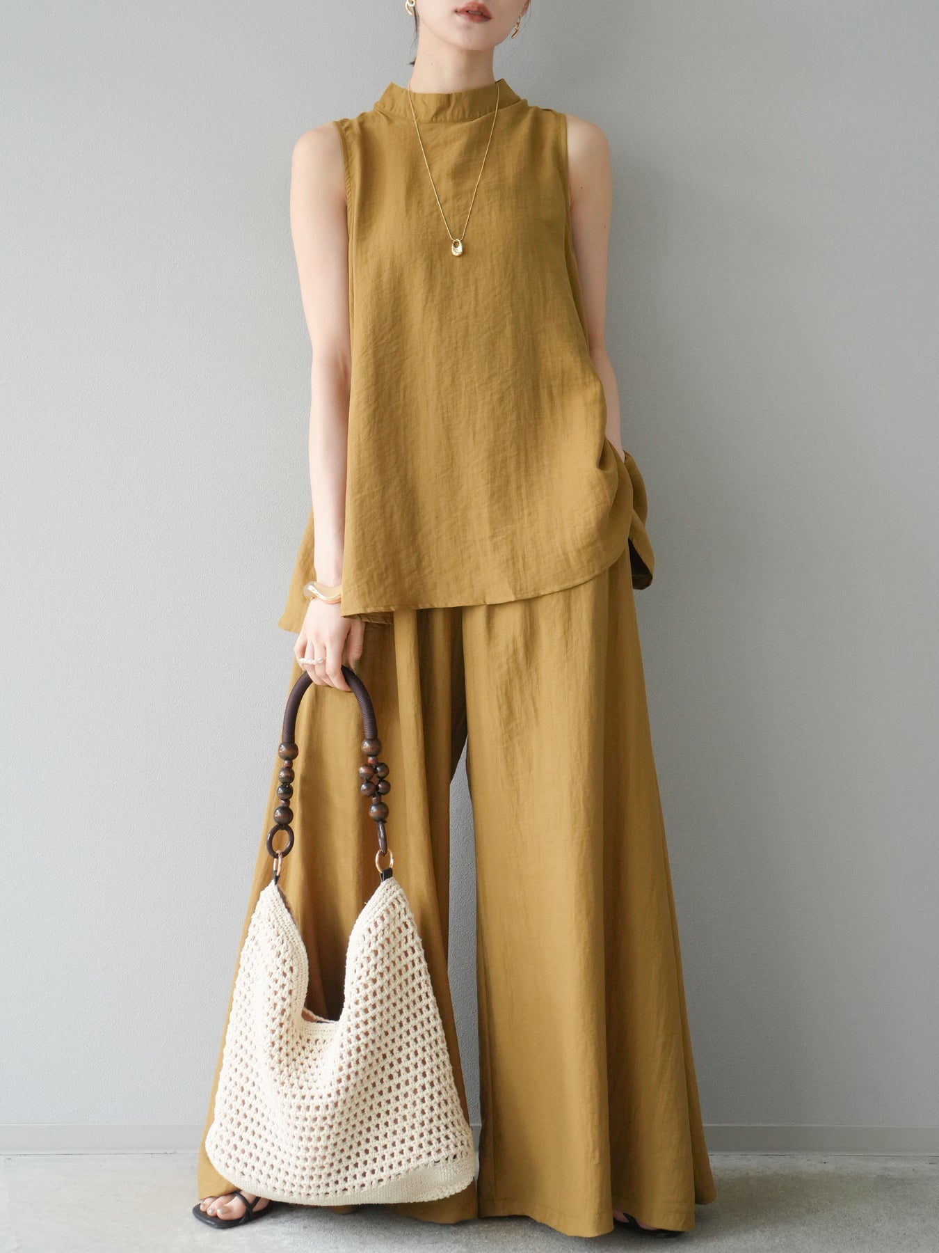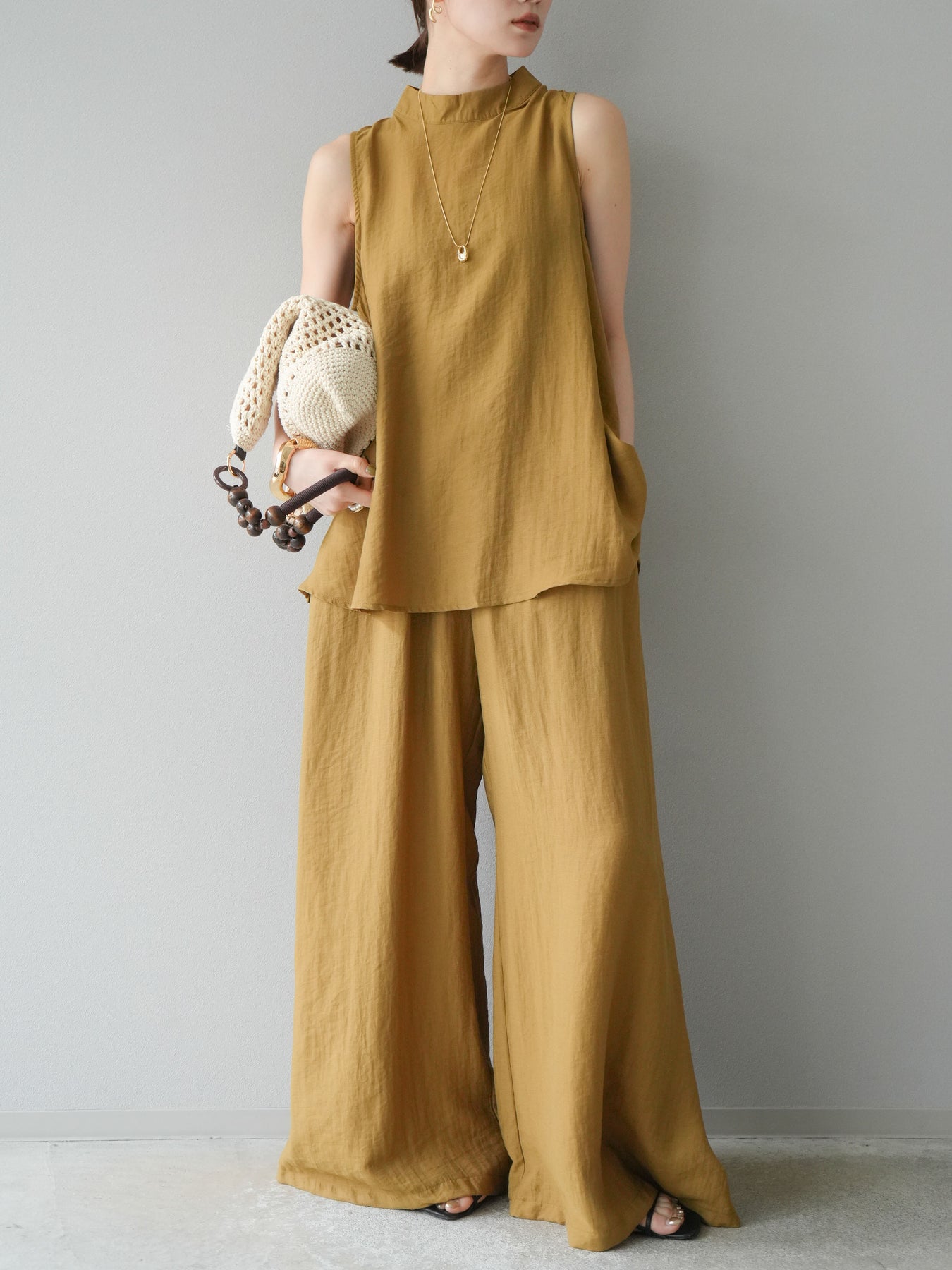 ふんわりと広がるAラインシルエットが魅力のノースリーブブラウスと、リラクシーな着心地のスーパーワイドパンツのセットアップ。程よい落ち感のある生地で動くたびに柔らかな揺れ感を演出し、品のある印象に。ブラウスは首元をさりげなくカバーするスタンドカラーデザインで、上品さと抜け感のバランスが絶妙です。パンツはウエストゴム仕様でストレスフリーな着用感に仕上げています。セットではもちろん、単品使いでも幅広く活躍するアイテムです。 ※ボトムス、キャミソール(インナー)以外の商品は一律でインナーは付属していません。