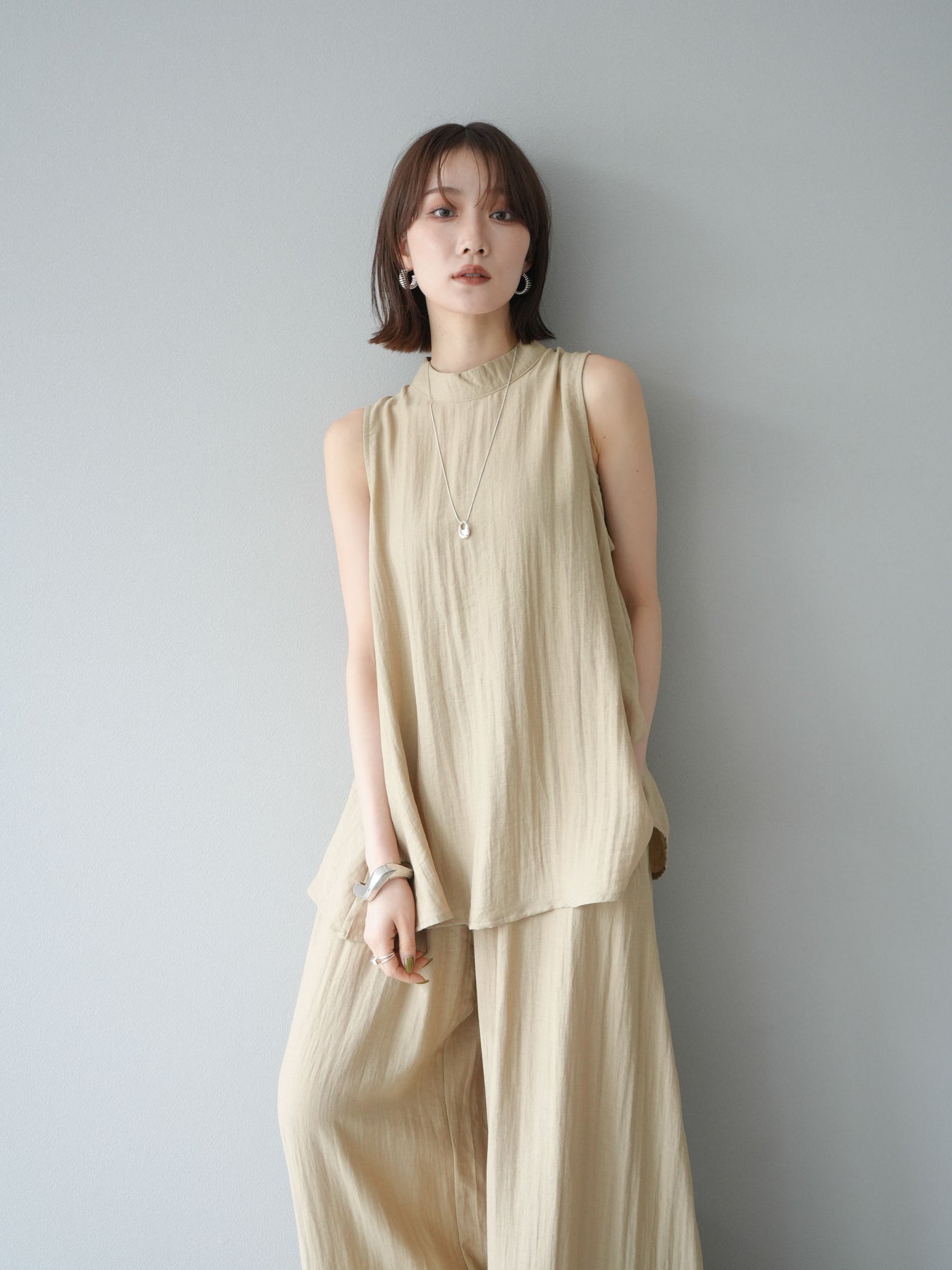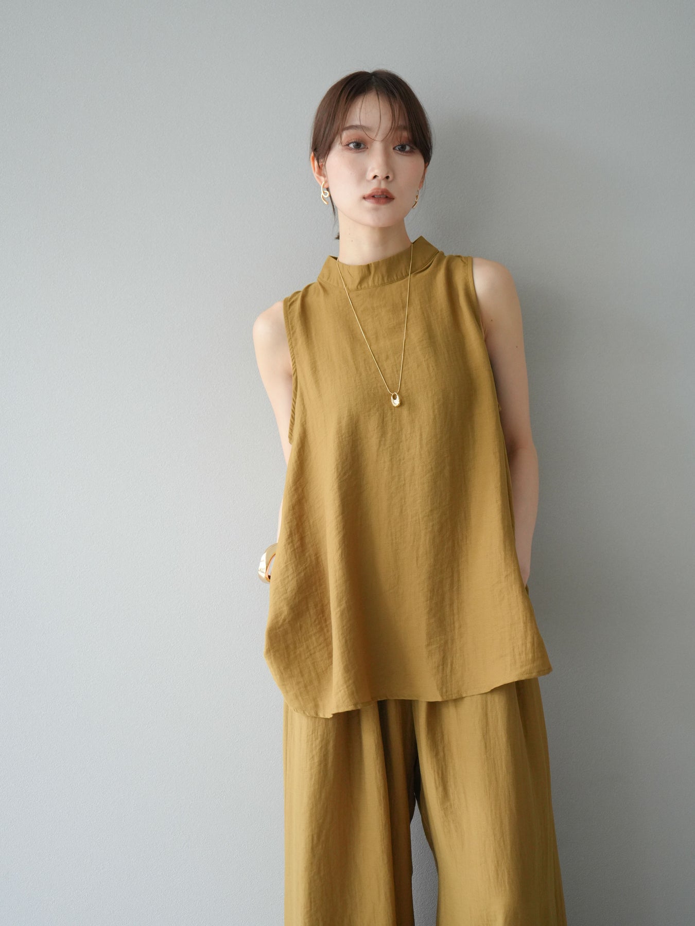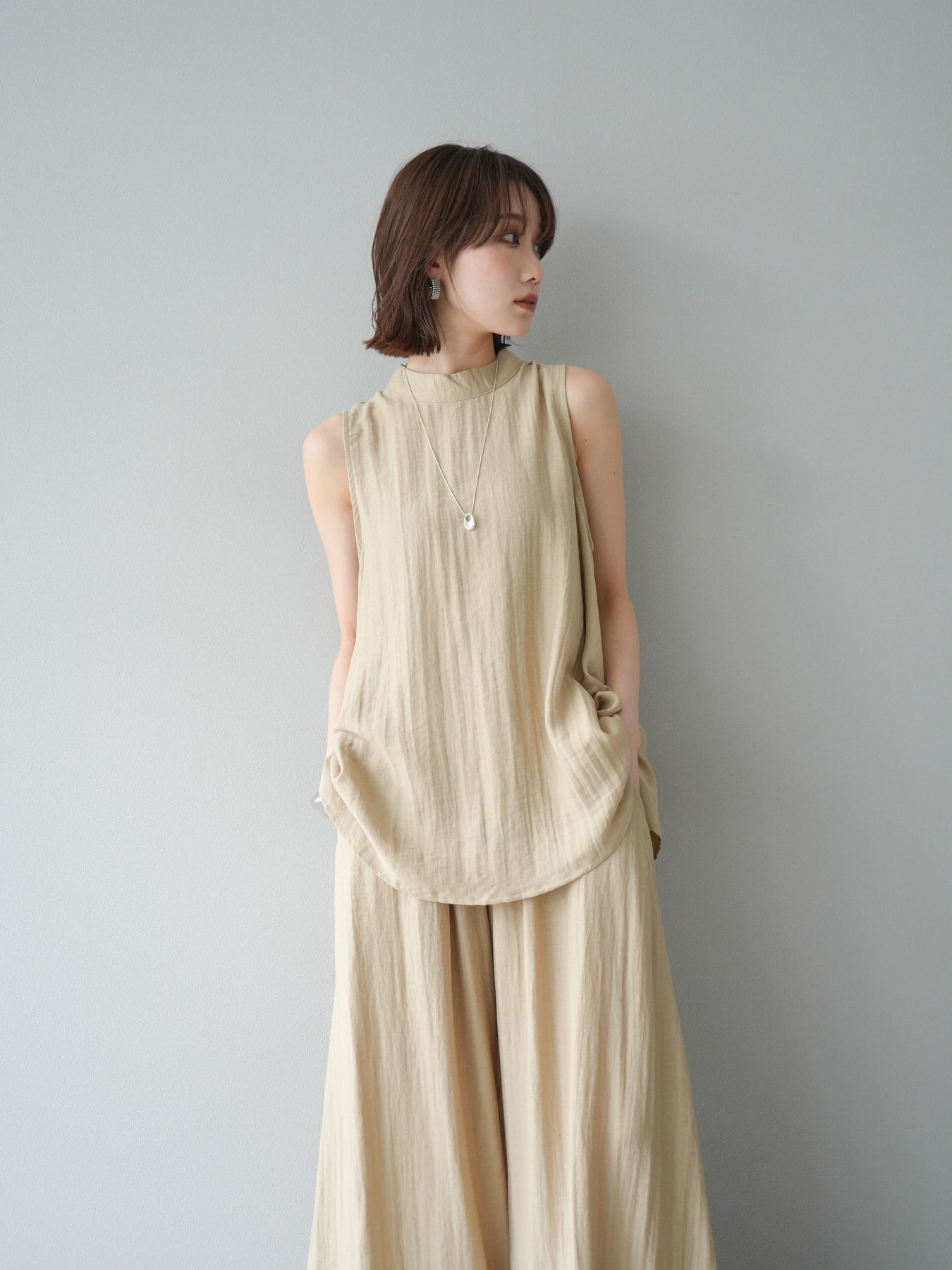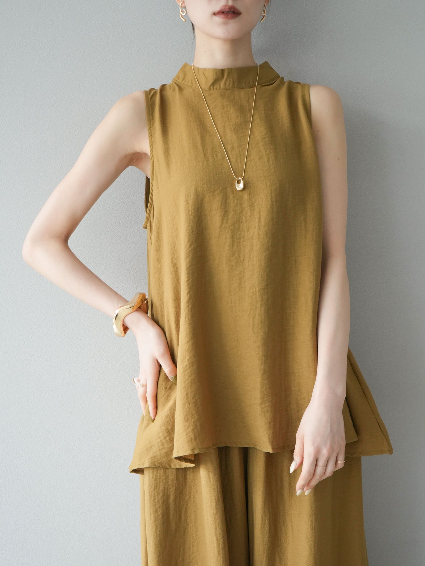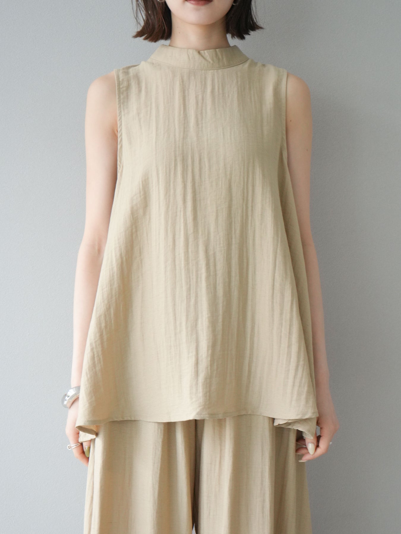 ふんわりと広がるAラインシルエットが魅力のノースリーブブラウスと、リラクシーな着心地のスーパーワイドパンツのセットアップ。程よい落ち感のある生地で動くたびに柔らかな揺れ感を演出し、品のある印象に。ブラウスは首元をさりげなくカバーするスタンドカラーデザインで、上品さと抜け感のバランスが絶妙です。パンツはウエストゴム仕様でストレスフリーな着用感に仕上げています。セットではもちろん、単品使いでも幅広く活躍するアイテムです。 ※ボトムス、キャミソール(インナー)以外の商品は一律でインナーは付属していません。