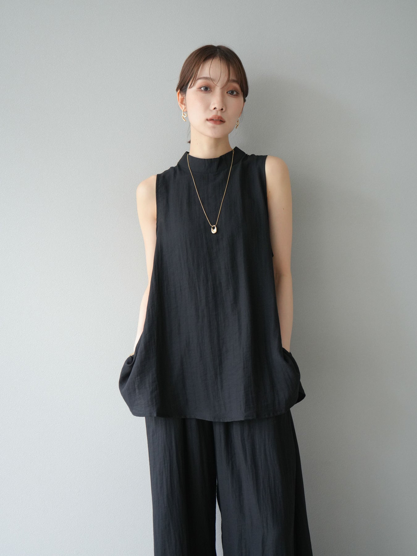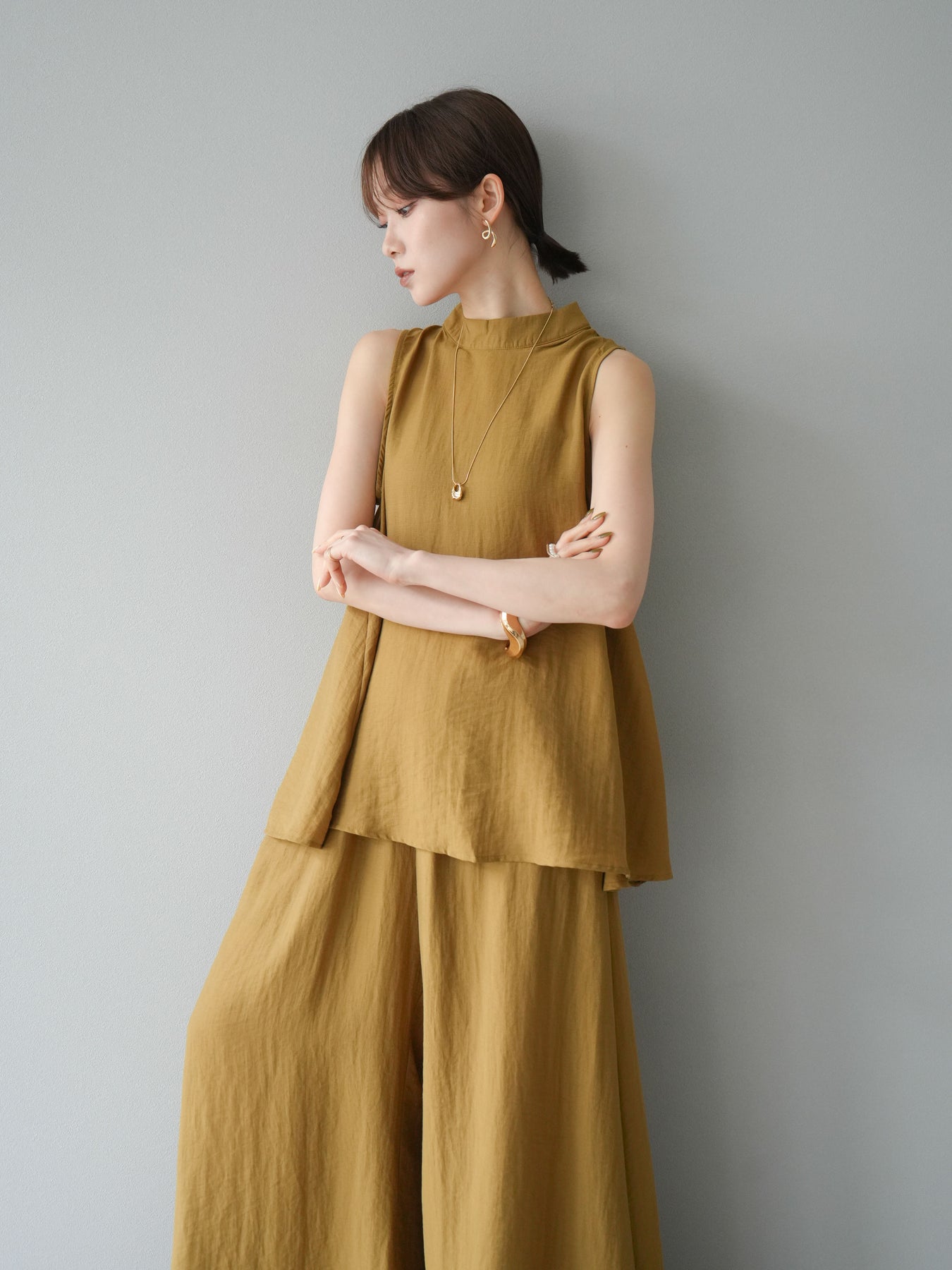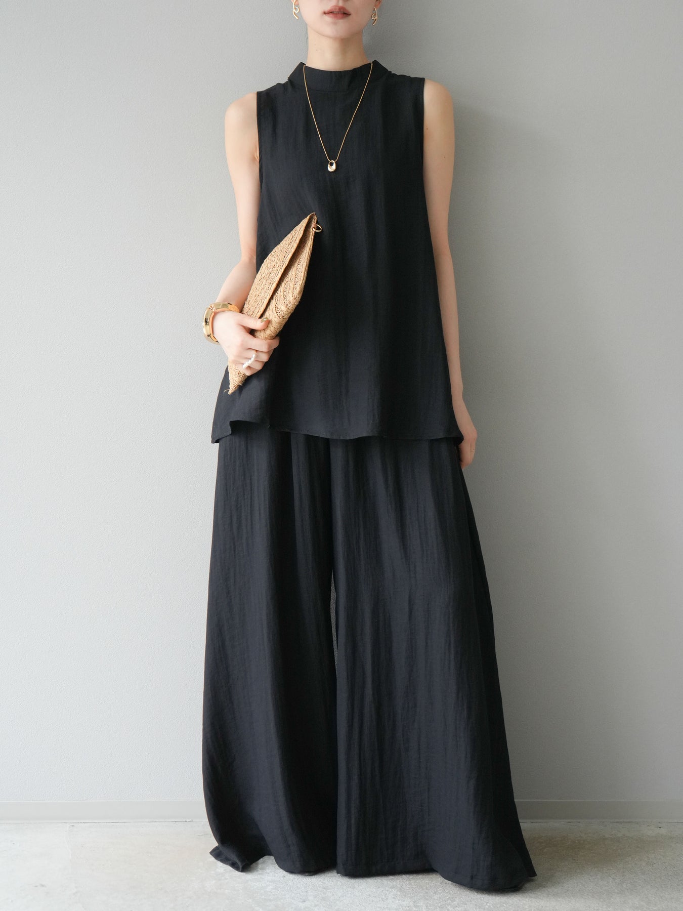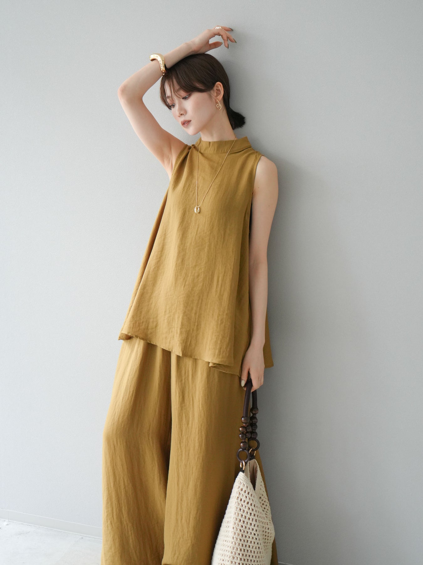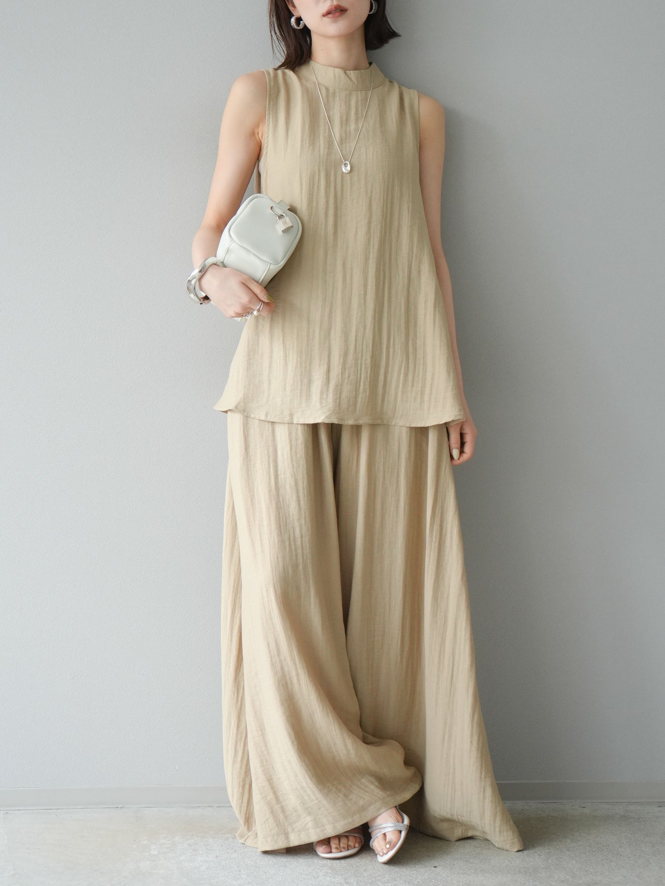 ふんわりと広がるAラインシルエットが魅力のノースリーブブラウスと、リラクシーな着心地のスーパーワイドパンツのセットアップ。程よい落ち感のある生地で動くたびに柔らかな揺れ感を演出し、品のある印象に。ブラウスは首元をさりげなくカバーするスタンドカラーデザインで、上品さと抜け感のバランスが絶妙です。パンツはウエストゴム仕様でストレスフリーな着用感に仕上げています。セットではもちろん、単品使いでも幅広く活躍するアイテムです。 ※ボトムス、キャミソール(インナー)以外の商品は一律でインナーは付属していません。