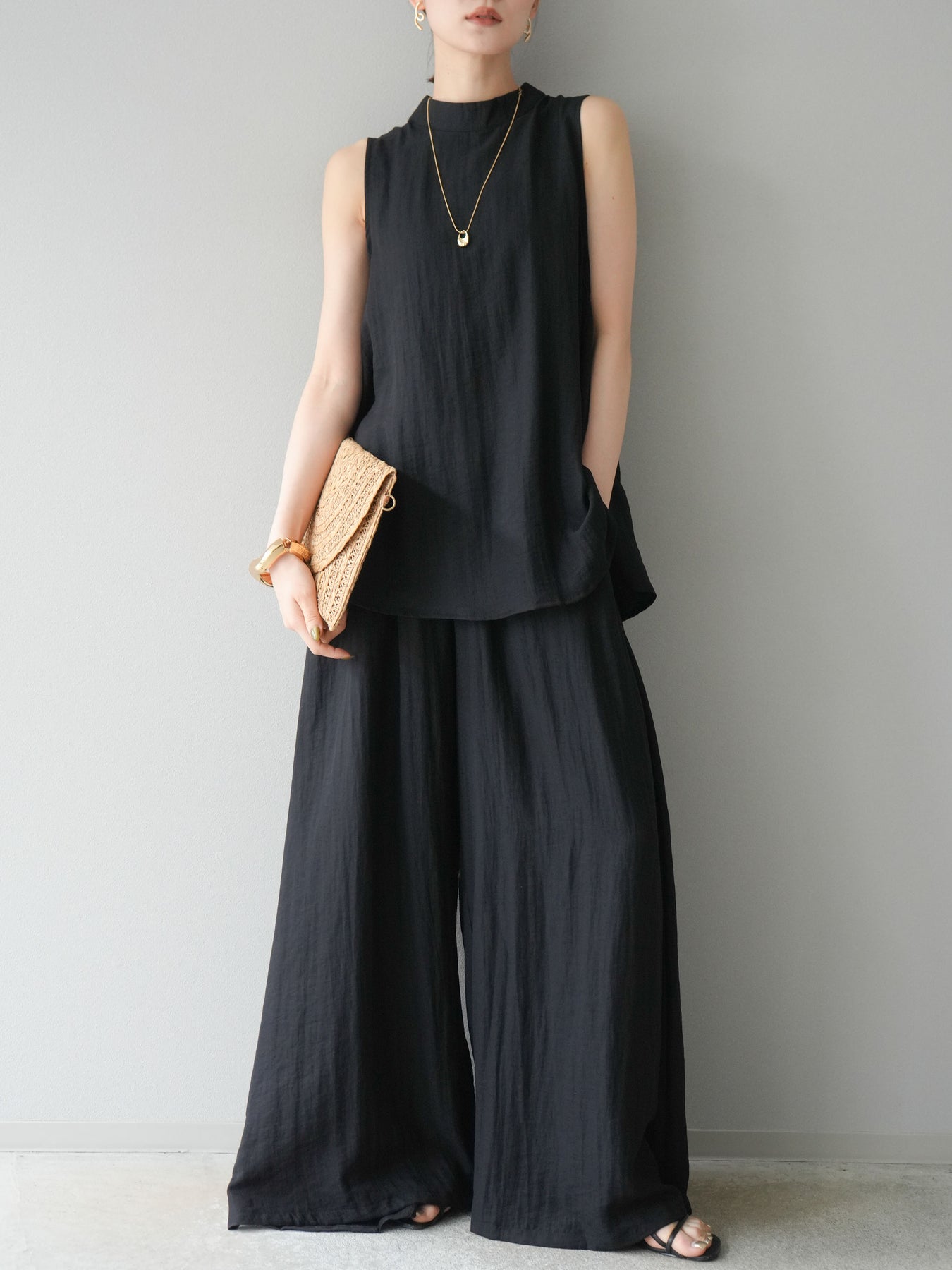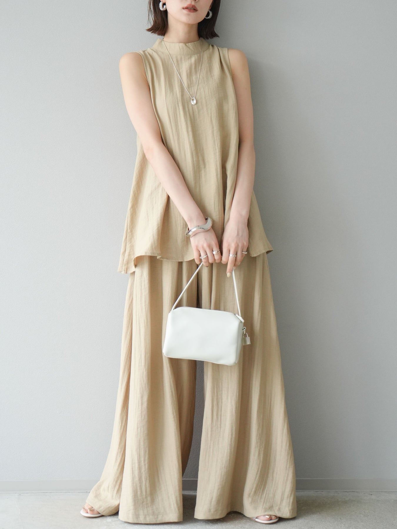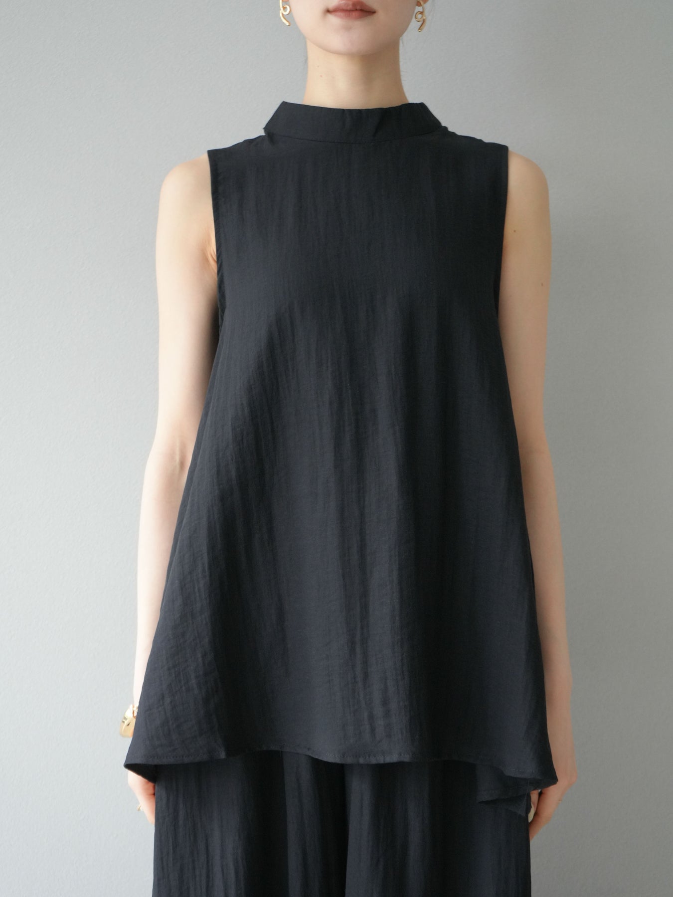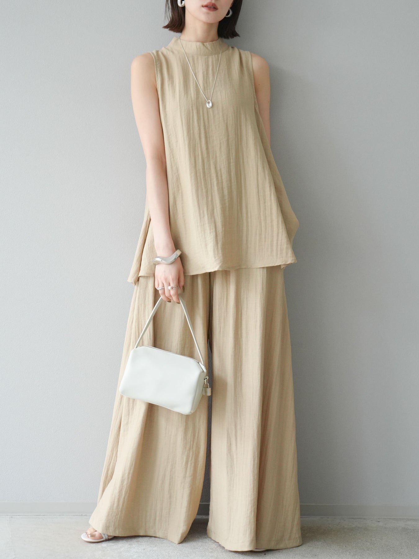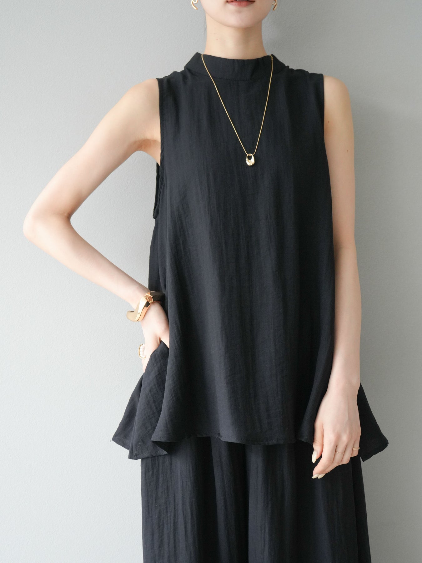 ふんわりと広がるAラインシルエットが魅力のノースリーブブラウスと、リラクシーな着心地のスーパーワイドパンツのセットアップ。程よい落ち感のある生地で動くたびに柔らかな揺れ感を演出し、品のある印象に。ブラウスは首元をさりげなくカバーするスタンドカラーデザインで、上品さと抜け感のバランスが絶妙です。パンツはウエストゴム仕様でストレスフリーな着用感に仕上げています。セットではもちろん、単品使いでも幅広く活躍するアイテムです。 ※ボトムス、キャミソール(インナー)以外の商品は一律でインナーは付属していません。