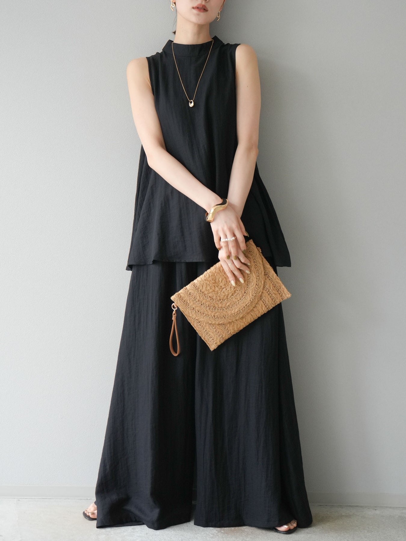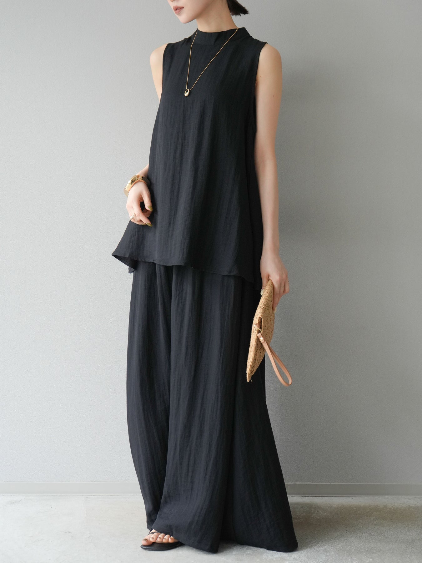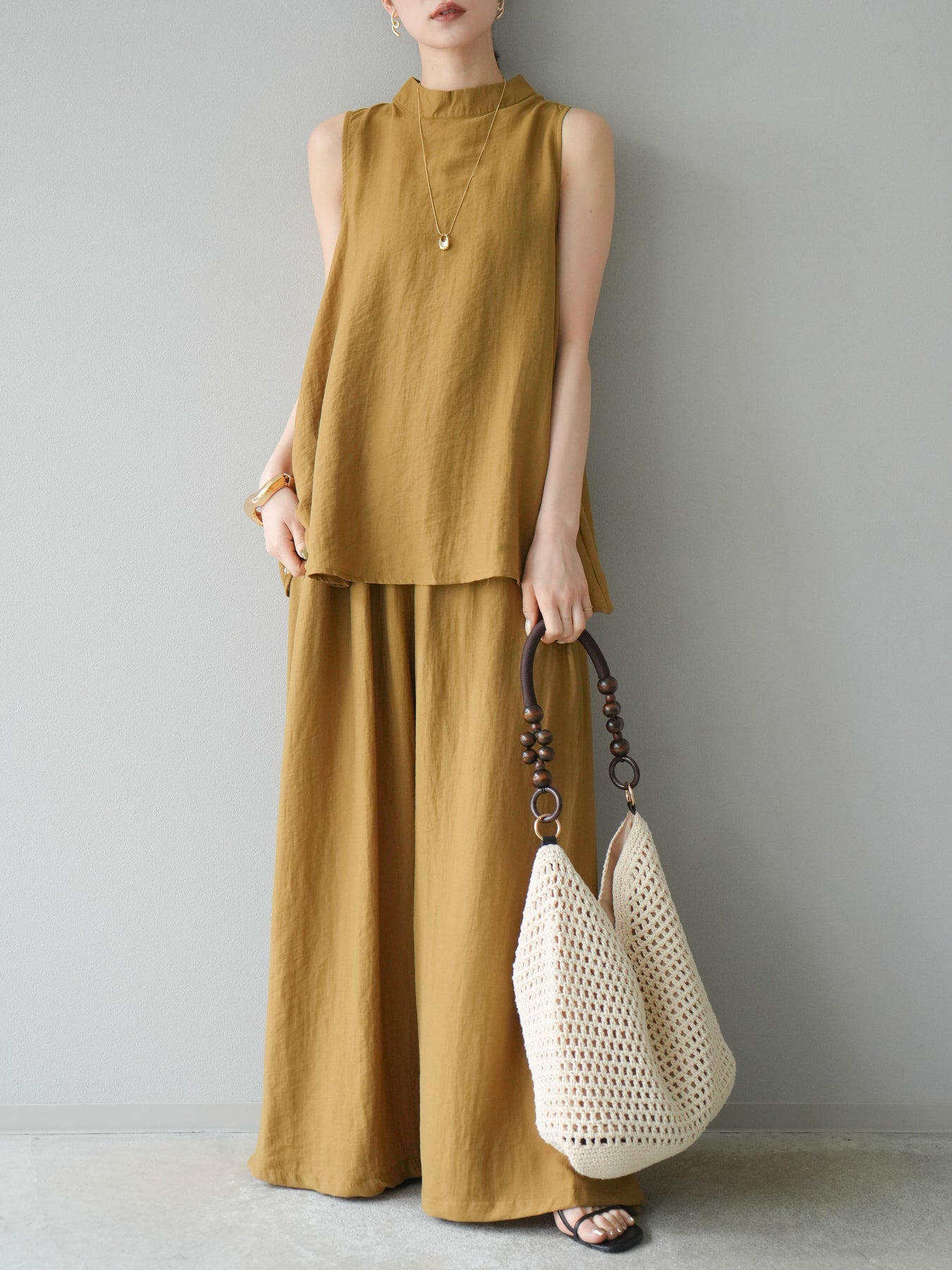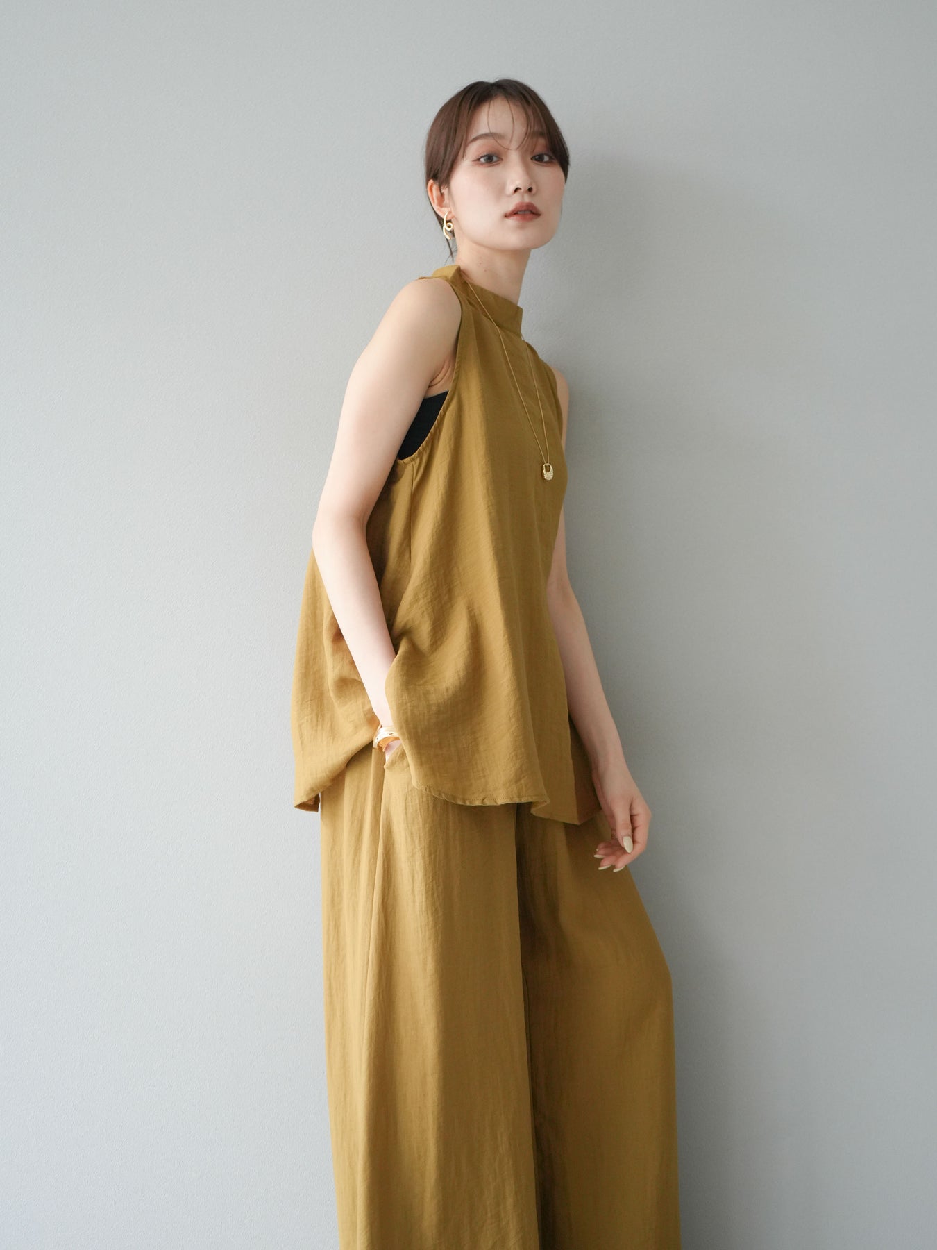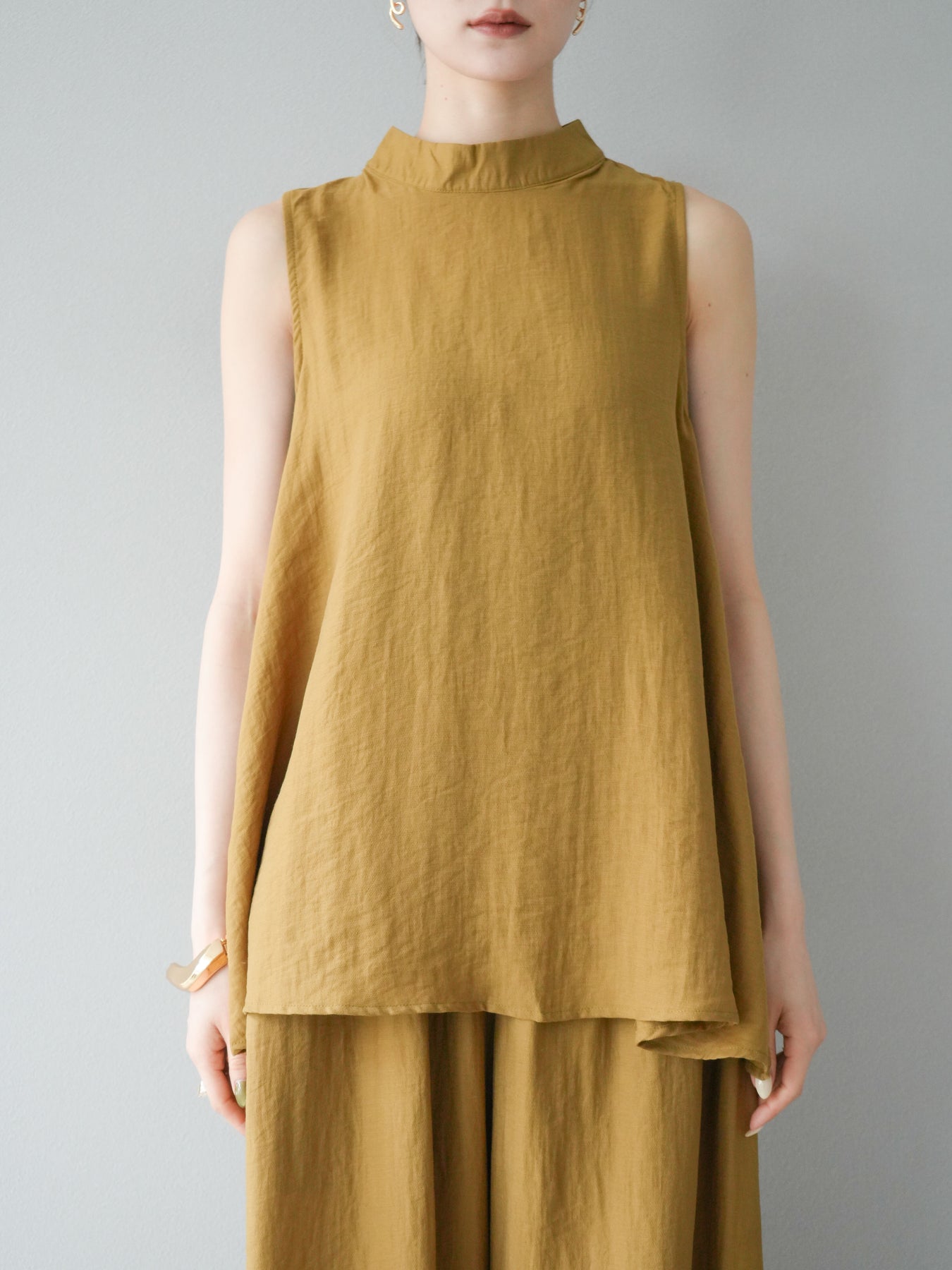 ふんわりと広がるAラインシルエットが魅力のノースリーブブラウスと、リラクシーな着心地のスーパーワイドパンツのセットアップ。程よい落ち感のある生地で動くたびに柔らかな揺れ感を演出し、品のある印象に。ブラウスは首元をさりげなくカバーするスタンドカラーデザインで、上品さと抜け感のバランスが絶妙です。パンツはウエストゴム仕様でストレスフリーな着用感に仕上げています。セットではもちろん、単品使いでも幅広く活躍するアイテムです。 ※ボトムス、キャミソール(インナー)以外の商品は一律でインナーは付属していません。