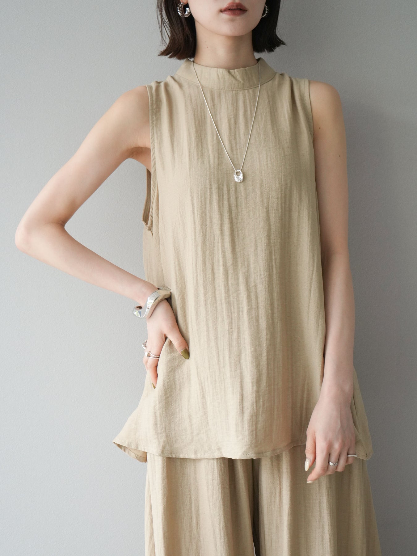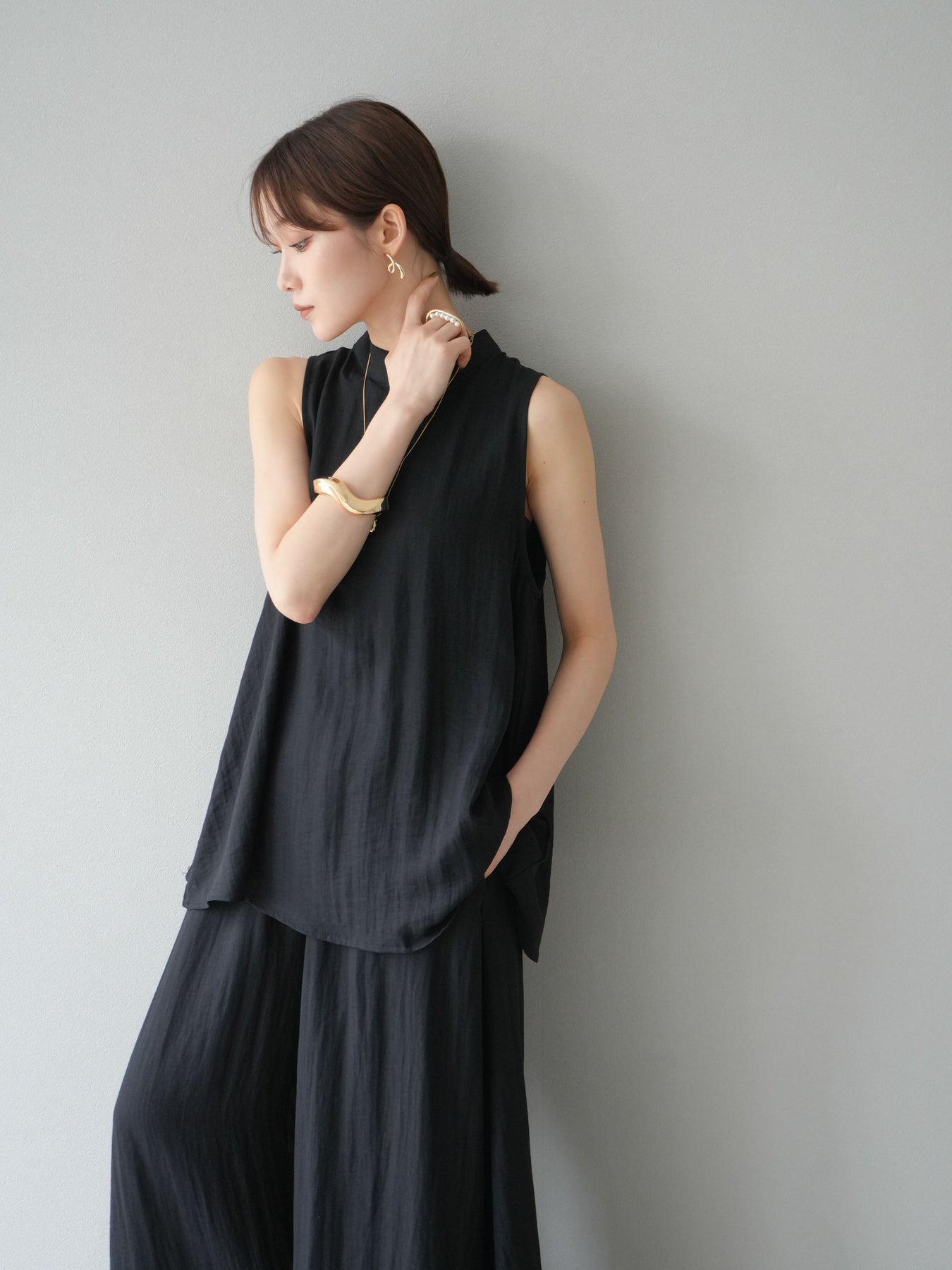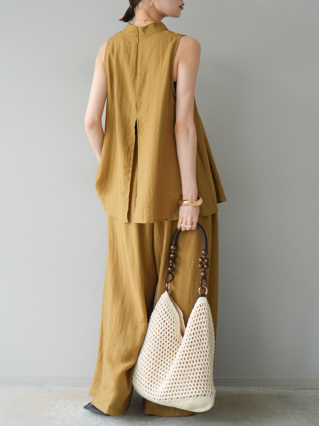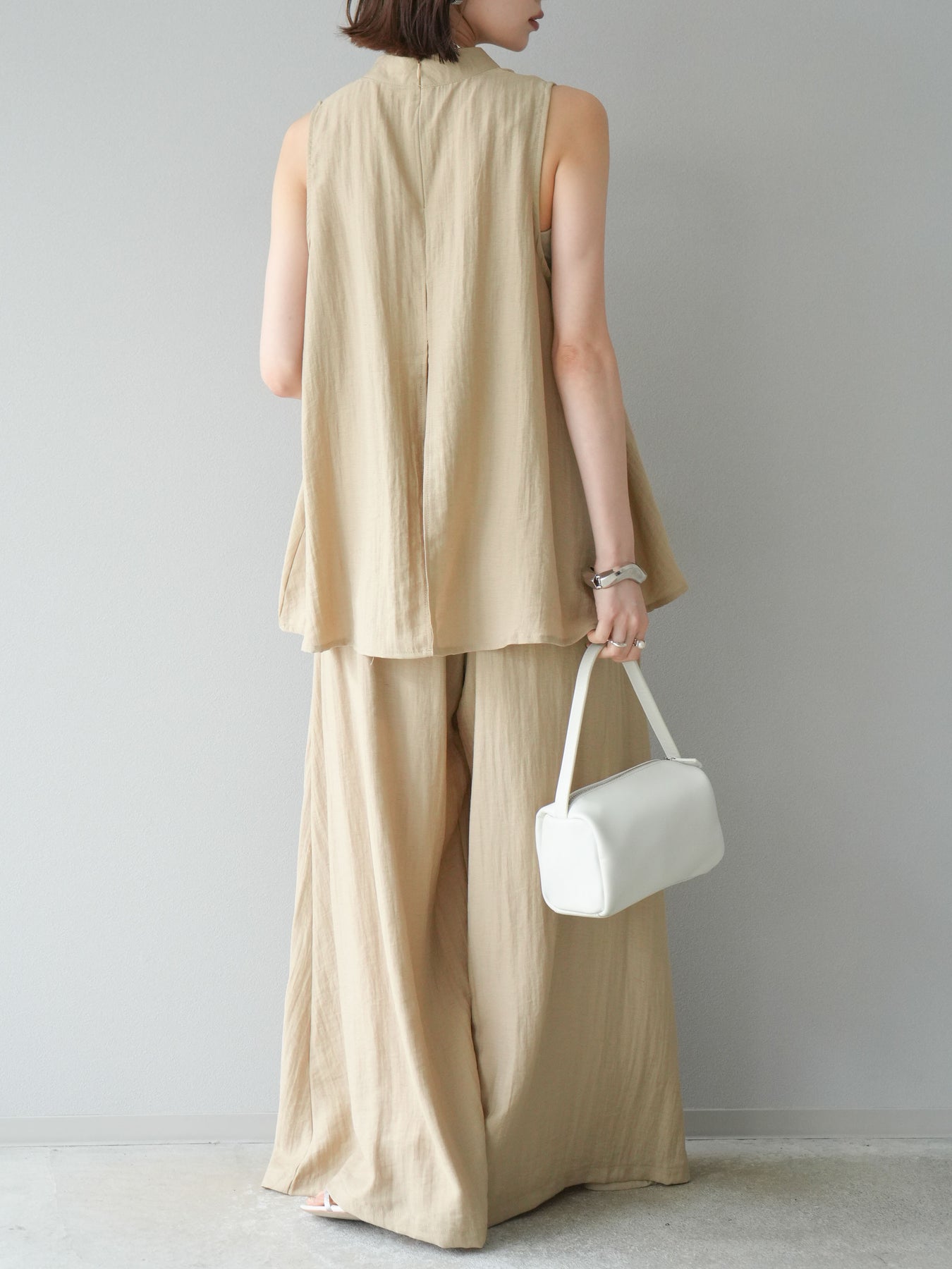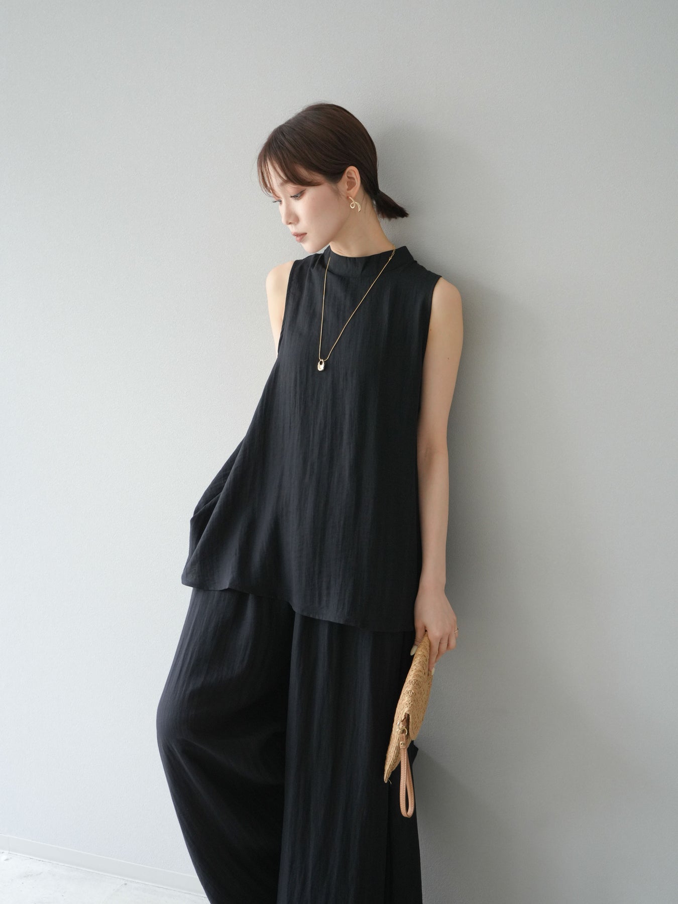 ふんわりと広がるAラインシルエットが魅力のノースリーブブラウスと、リラクシーな着心地のスーパーワイドパンツのセットアップ。程よい落ち感のある生地で動くたびに柔らかな揺れ感を演出し、品のある印象に。ブラウスは首元をさりげなくカバーするスタンドカラーデザインで、上品さと抜け感のバランスが絶妙です。パンツはウエストゴム仕様でストレスフリーな着用感に仕上げています。セットではもちろん、単品使いでも幅広く活躍するアイテムです。 ※ボトムス、キャミソール(インナー)以外の商品は一律でインナーは付属していません。