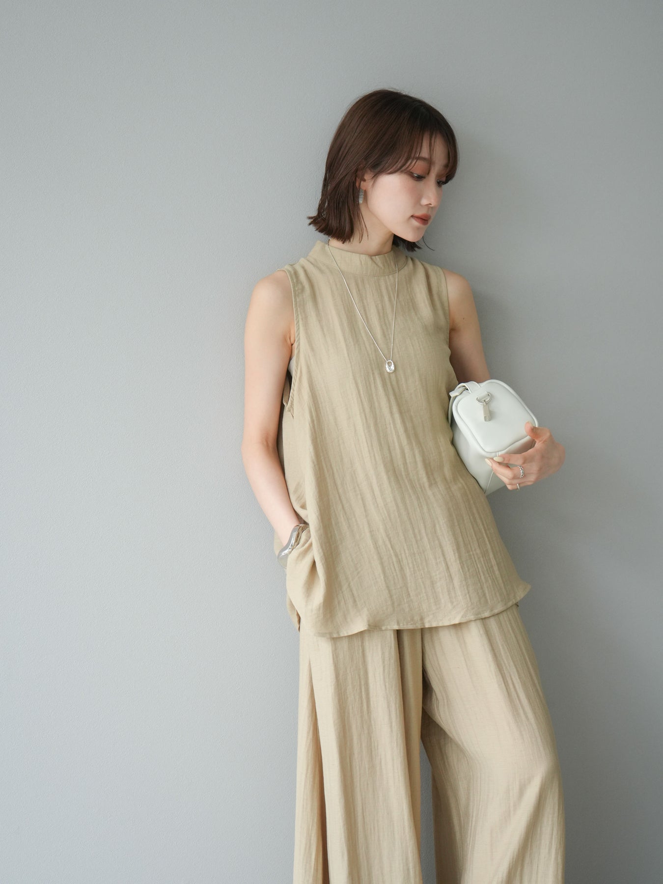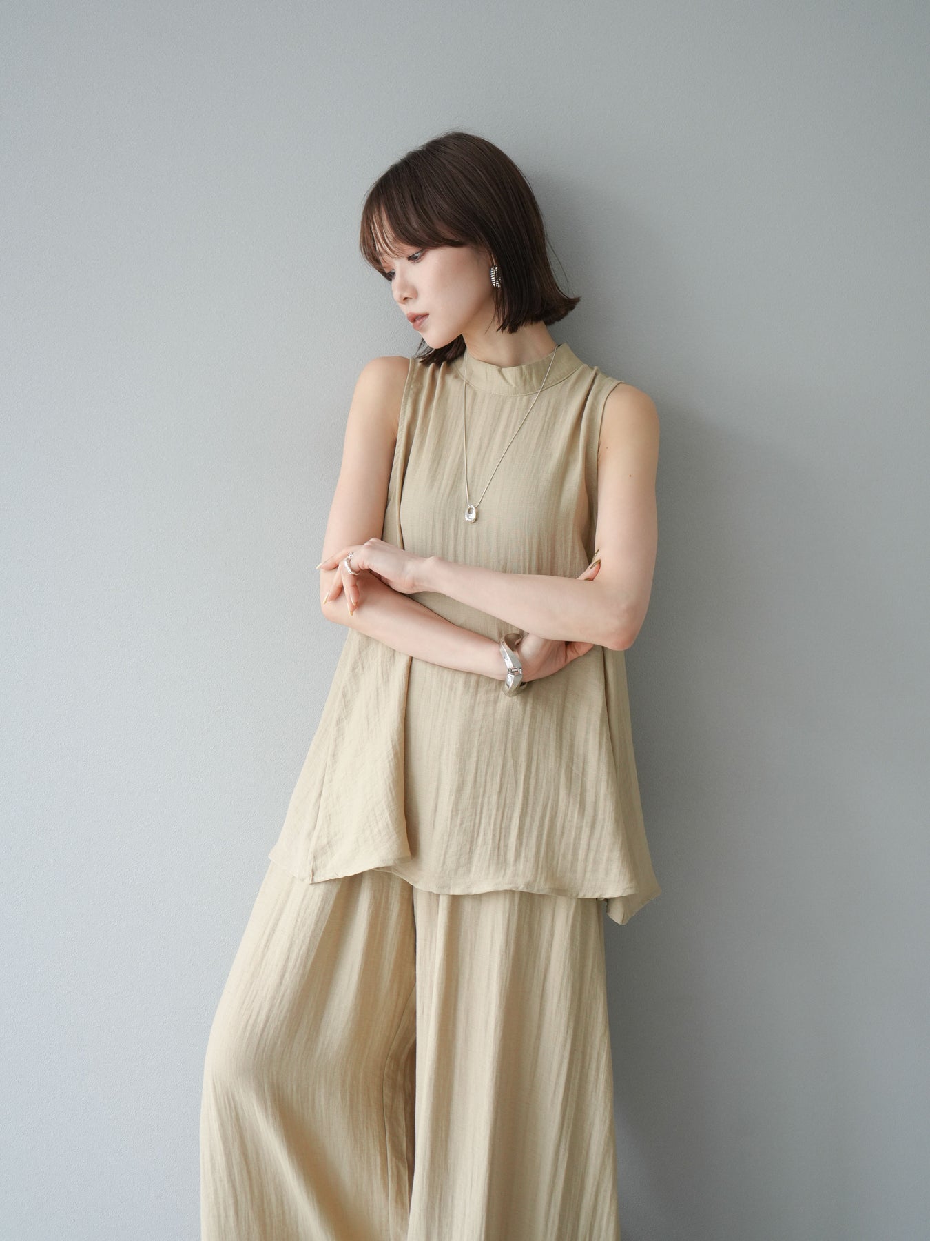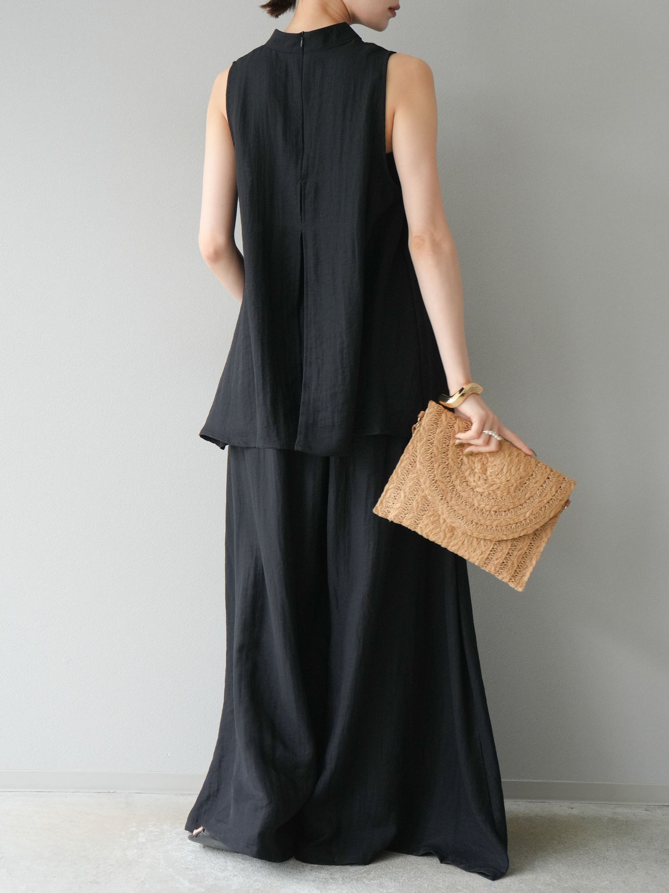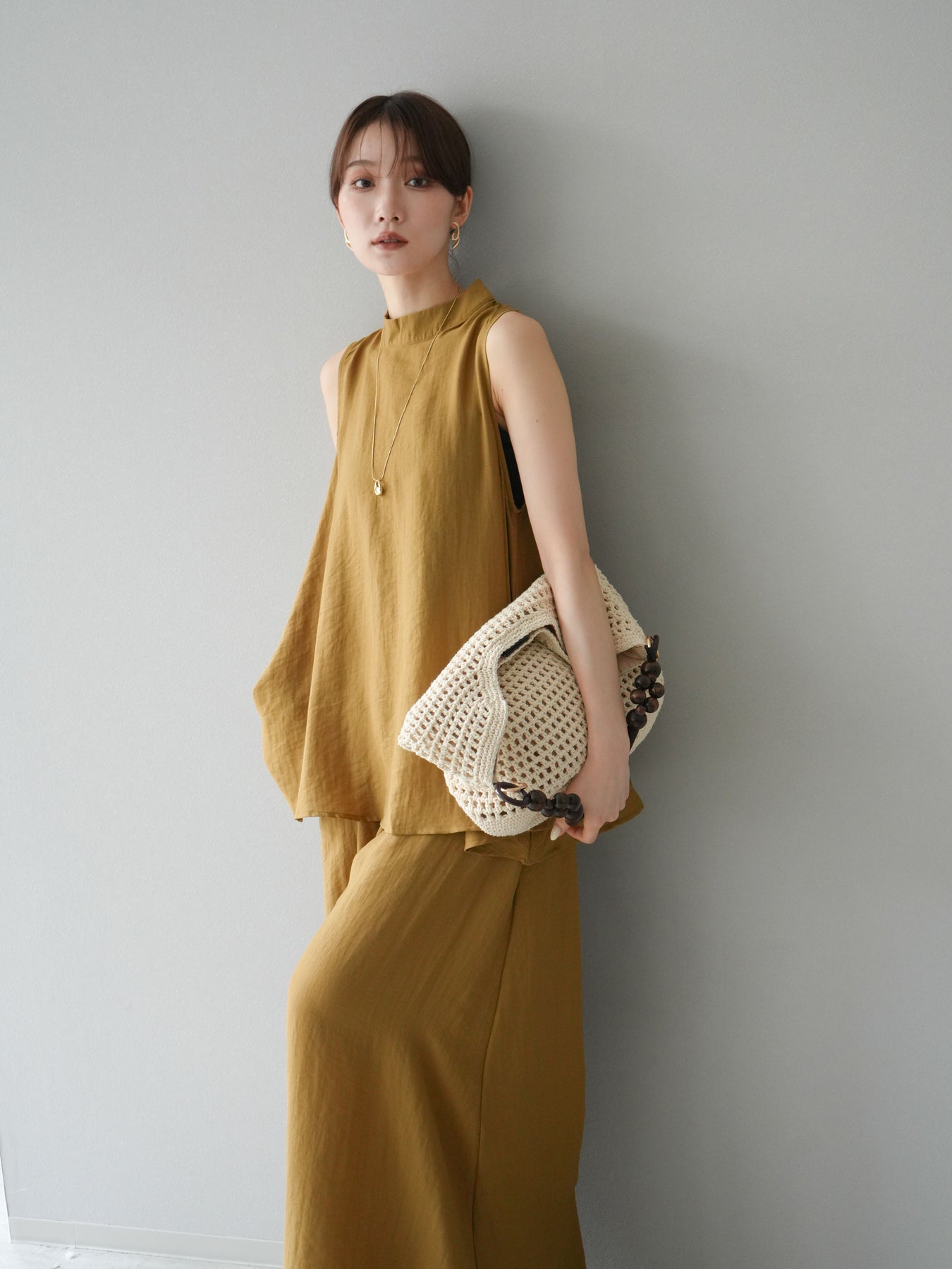 ふんわりと広がるAラインシルエットが魅力のノースリーブブラウスと、リラクシーな着心地のスーパーワイドパンツのセットアップ。程よい落ち感のある生地で動くたびに柔らかな揺れ感を演出し、品のある印象に。ブラウスは首元をさりげなくカバーするスタンドカラーデザインで、上品さと抜け感のバランスが絶妙です。パンツはウエストゴム仕様でストレスフリーな着用感に仕上げています。セットではもちろん、単品使いでも幅広く活躍するアイテムです。 ※ボトムス、キャミソール(インナー)以外の商品は一律でインナーは付属していません。