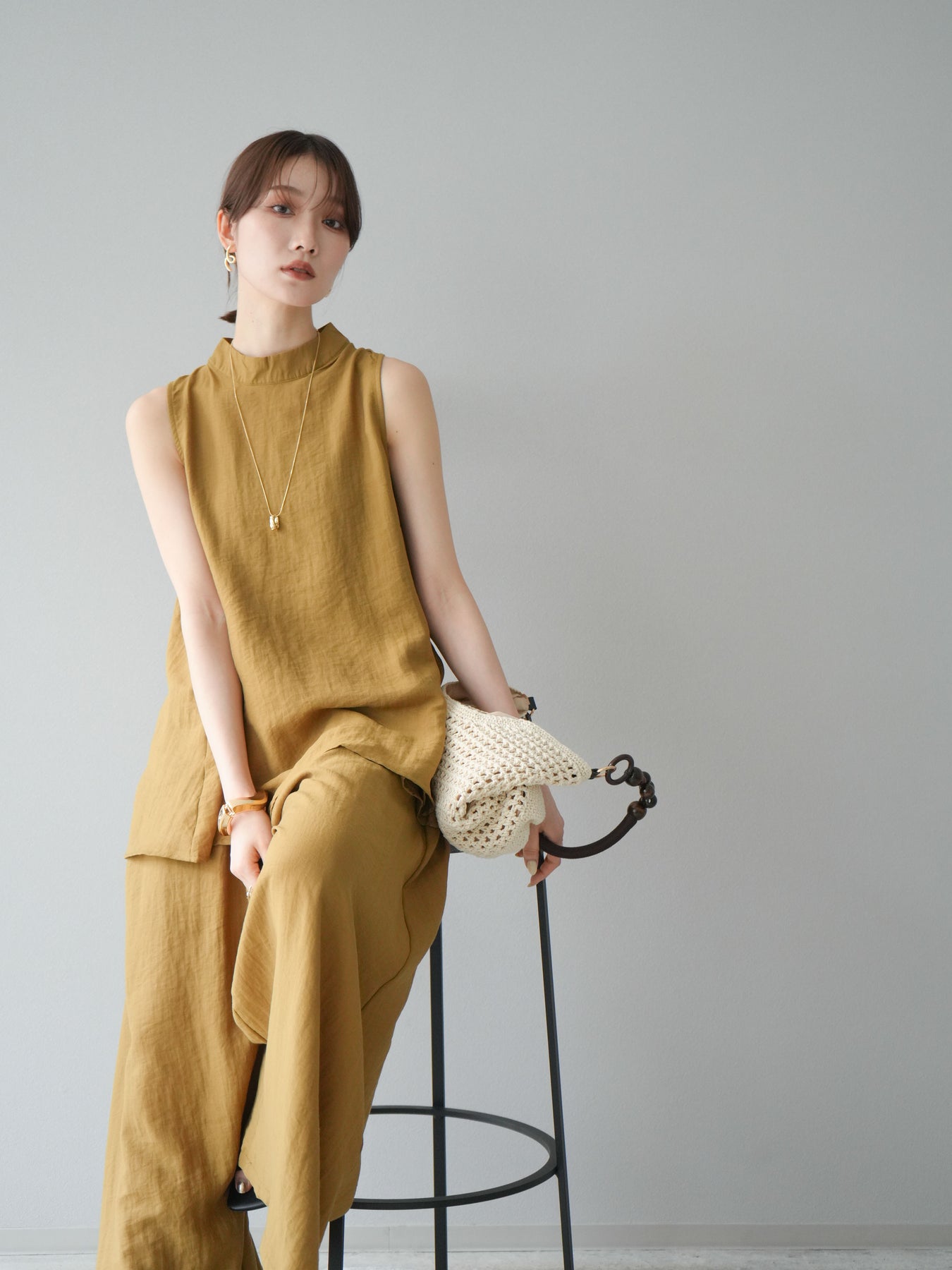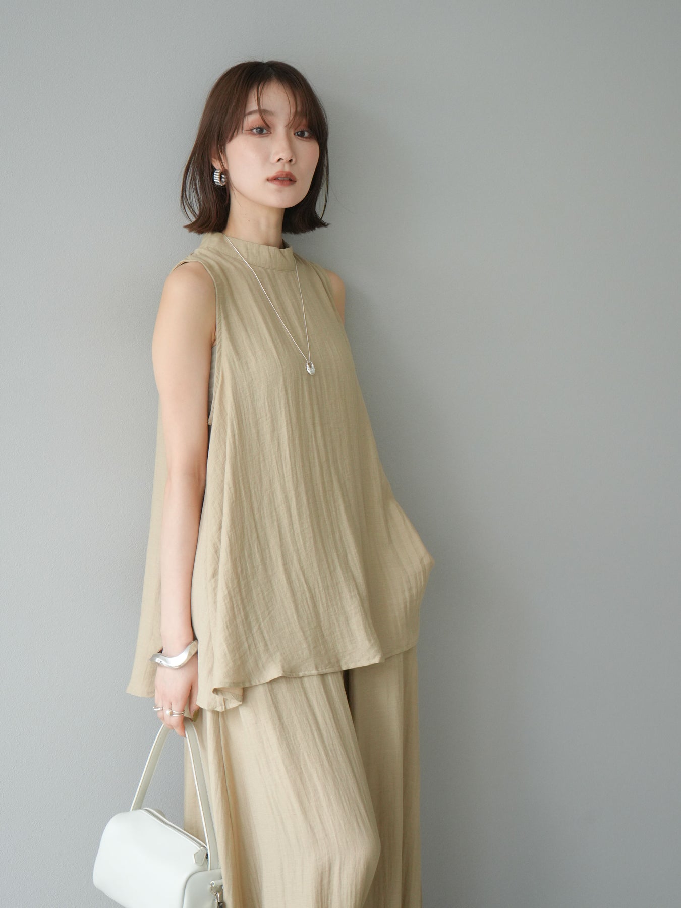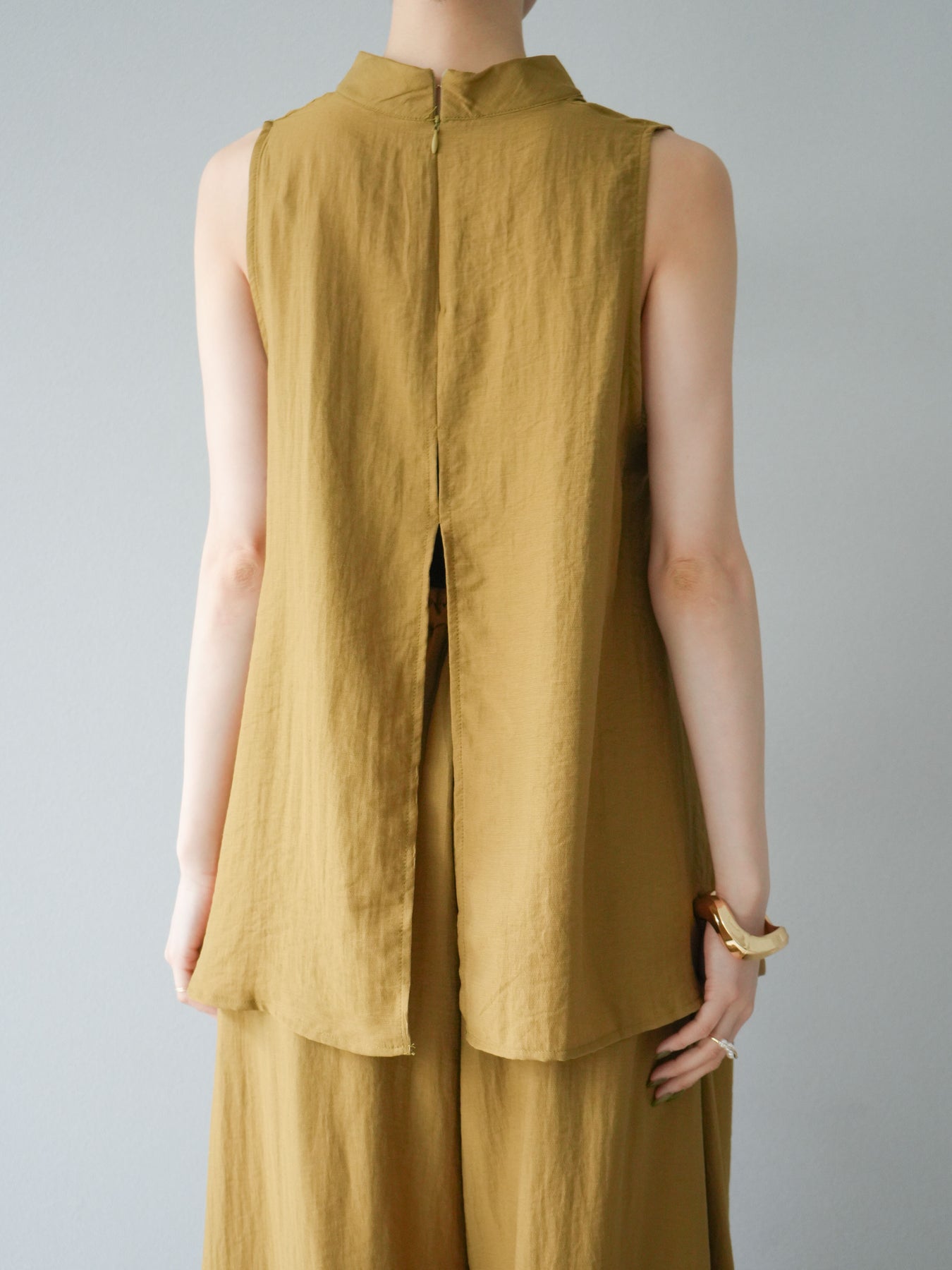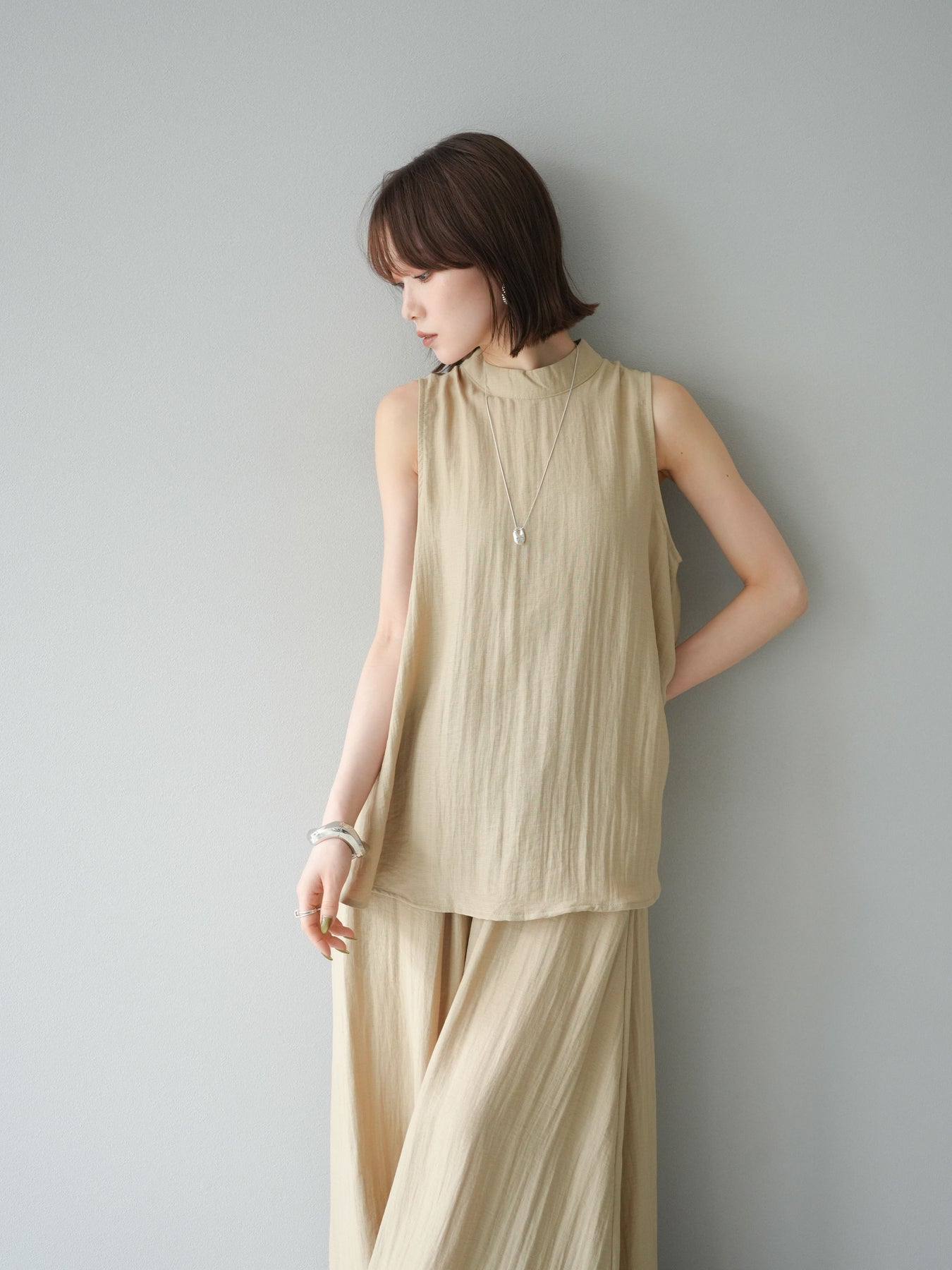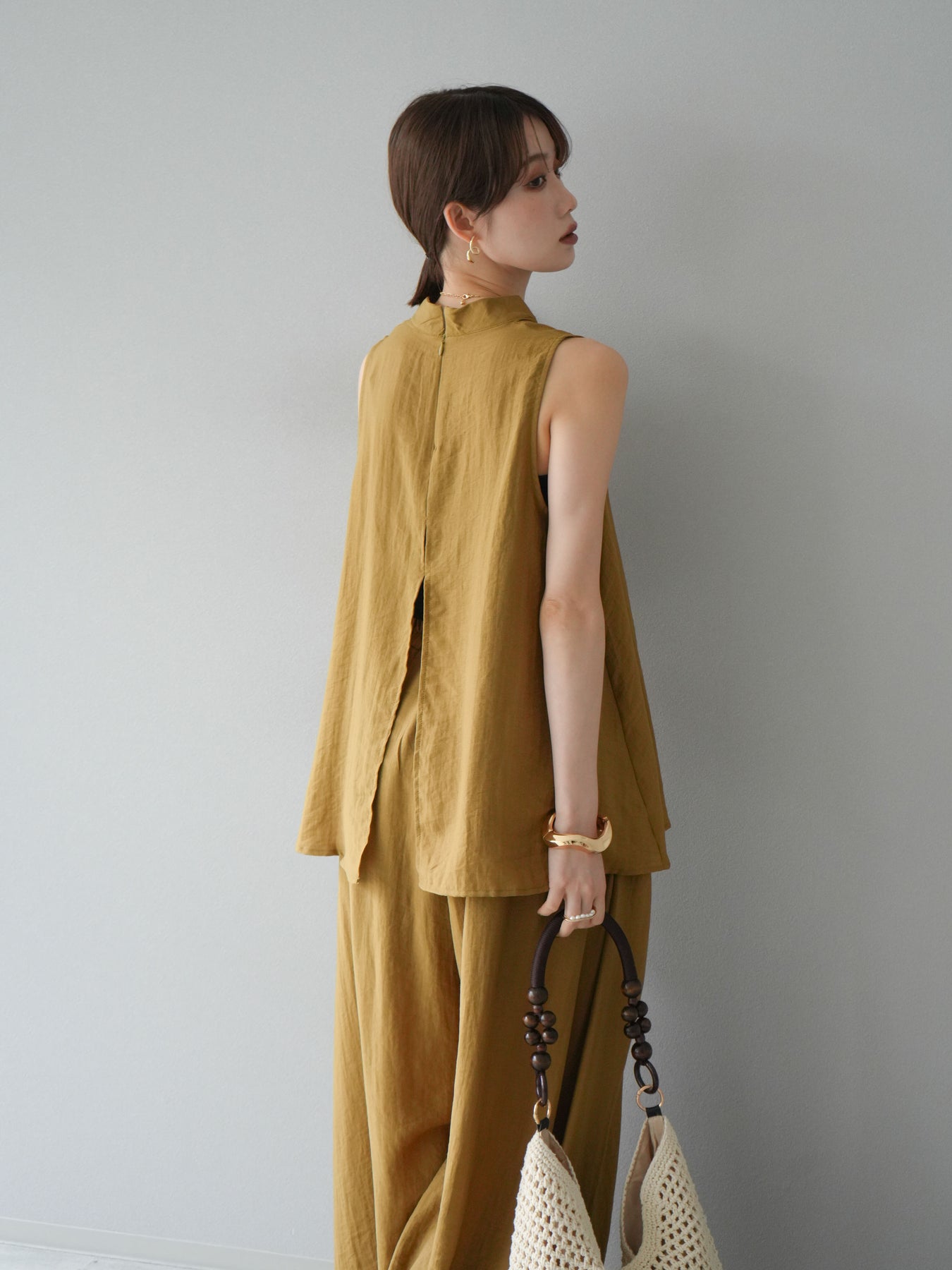 ふんわりと広がるAラインシルエットが魅力のノースリーブブラウスと、リラクシーな着心地のスーパーワイドパンツのセットアップ。程よい落ち感のある生地で動くたびに柔らかな揺れ感を演出し、品のある印象に。ブラウスは首元をさりげなくカバーするスタンドカラーデザインで、上品さと抜け感のバランスが絶妙です。パンツはウエストゴム仕様でストレスフリーな着用感に仕上げています。セットではもちろん、単品使いでも幅広く活躍するアイテムです。 ※ボトムス、キャミソール(インナー)以外の商品は一律でインナーは付属していません。