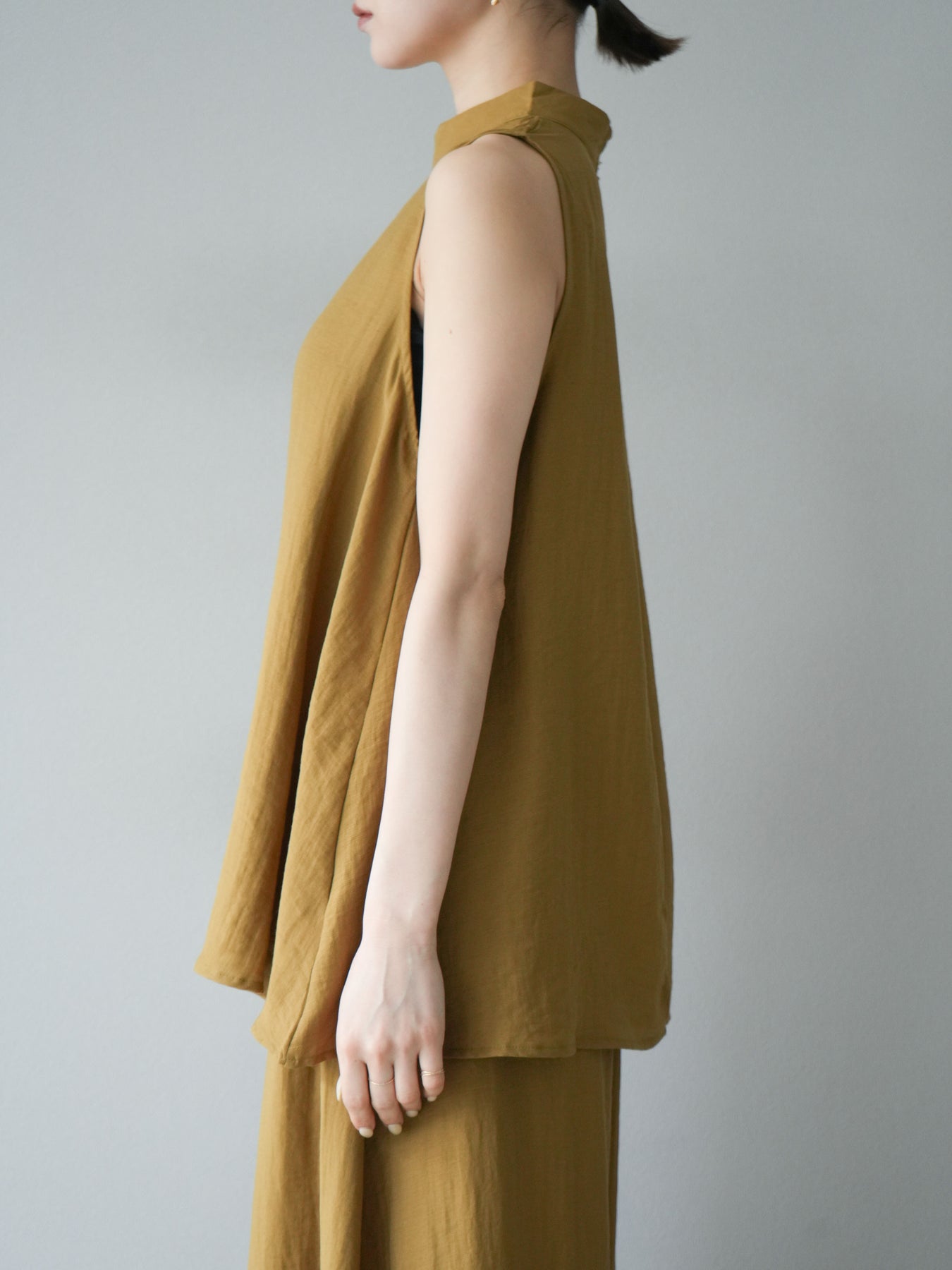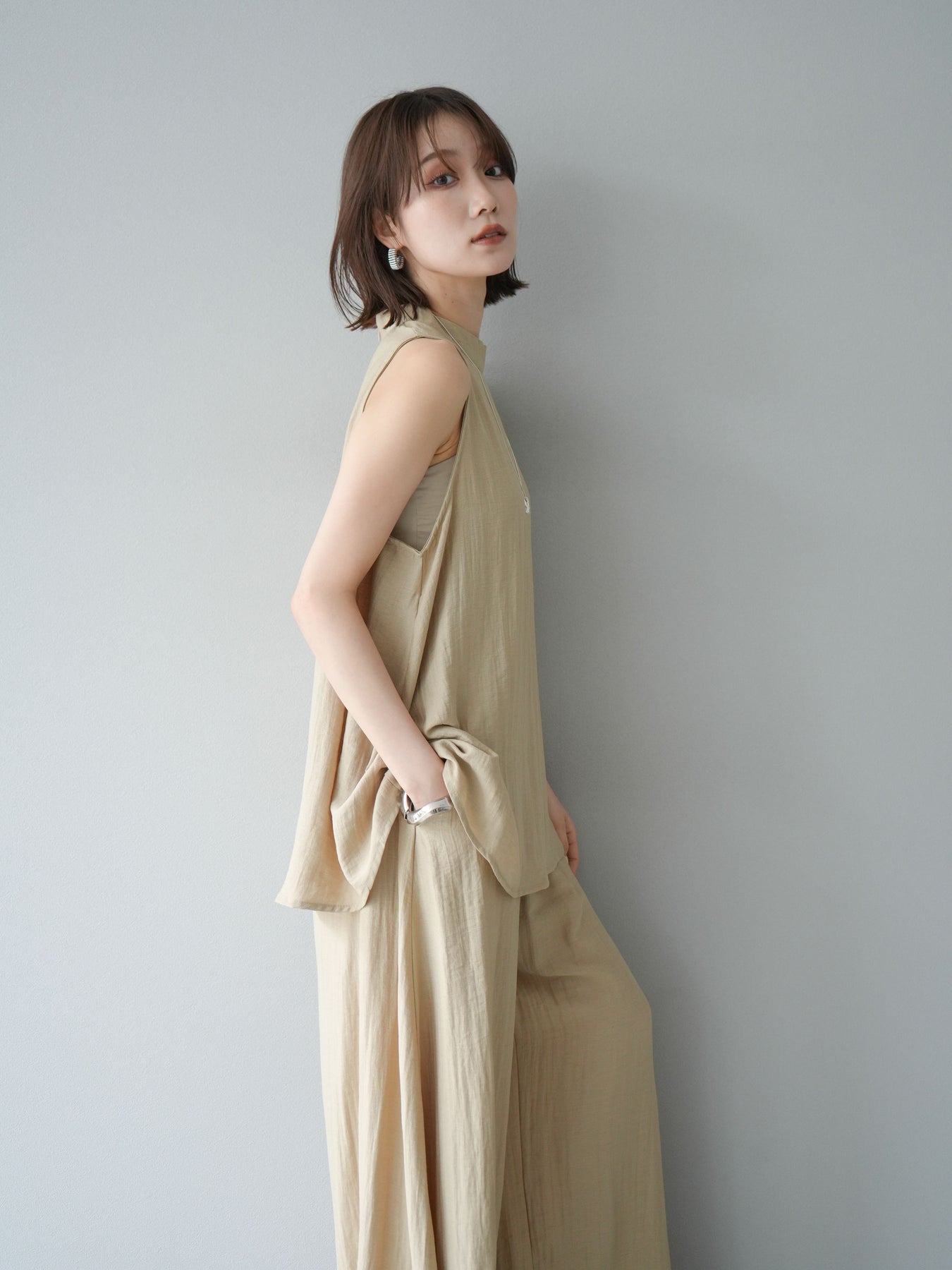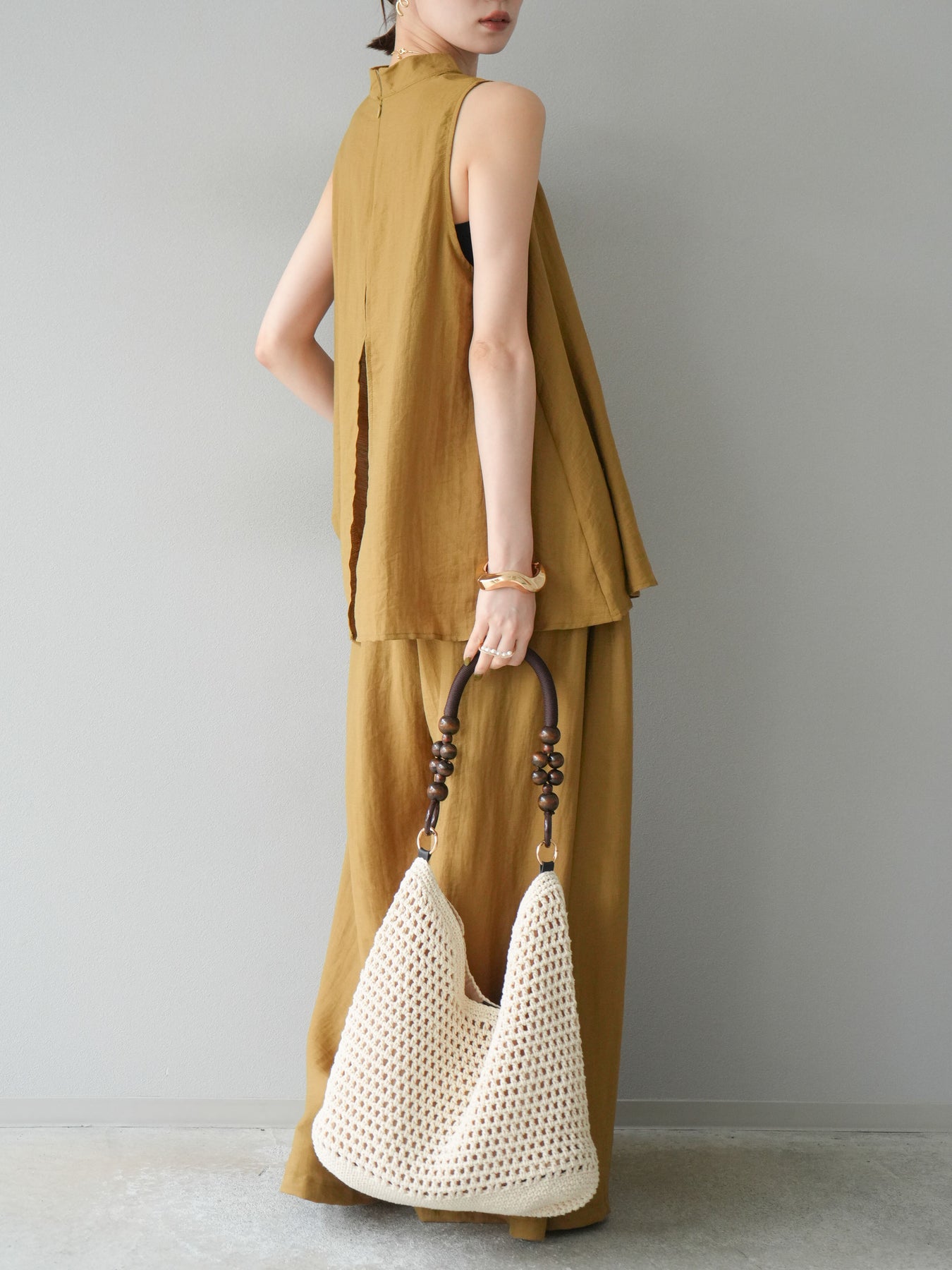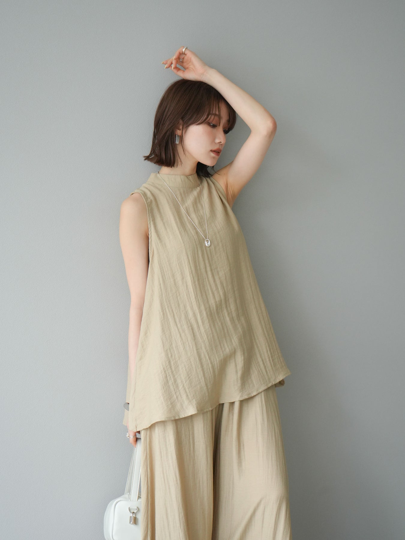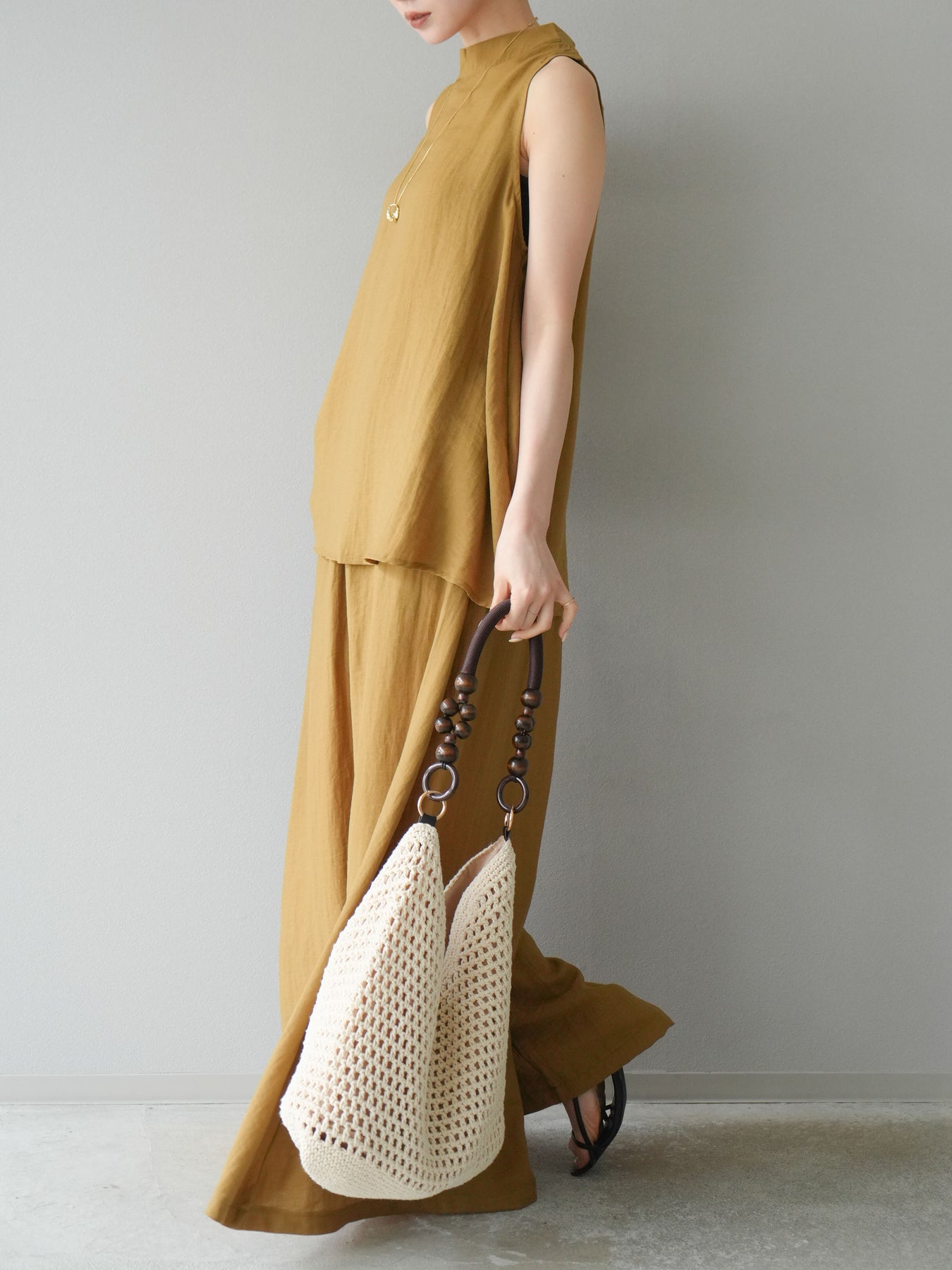ふんわりと広がるAラインシルエットが魅力のノースリーブブラウスと、リラクシーな着心地のスーパーワイドパンツのセットアップ。程よい落ち感のある生地で動くたびに柔らかな揺れ感を演出し、品のある印象に。ブラウスは首元をさりげなくカバーするスタンドカラーデザインで、上品さと抜け感のバランスが絶妙です。パンツはウエストゴム仕様でストレスフリーな着用感に仕上げています。セットではもちろん、単品使いでも幅広く活躍するアイテムです。 ※ボトムス、キャミソール(インナー)以外の商品は一律でインナーは付属していません。
